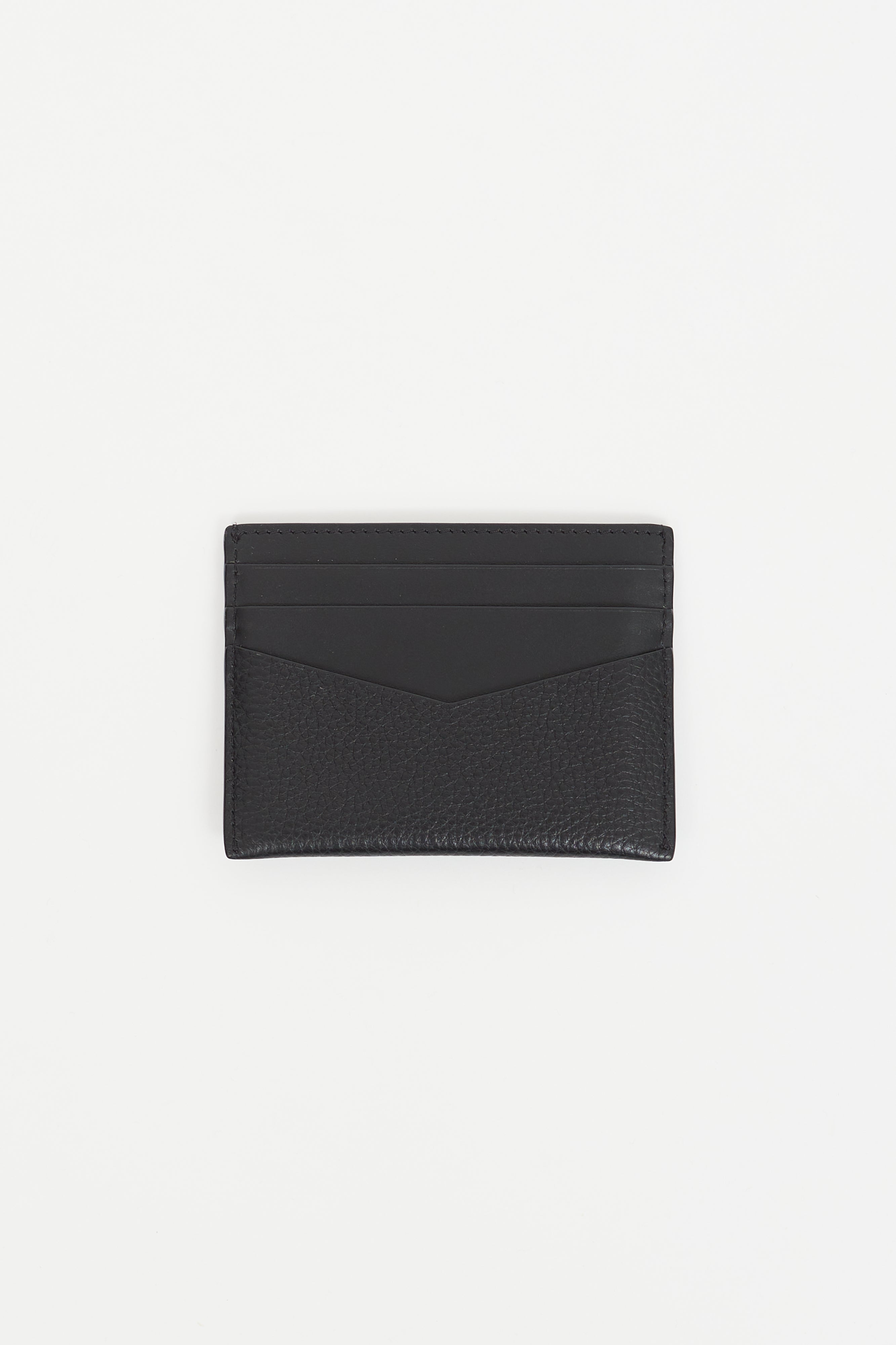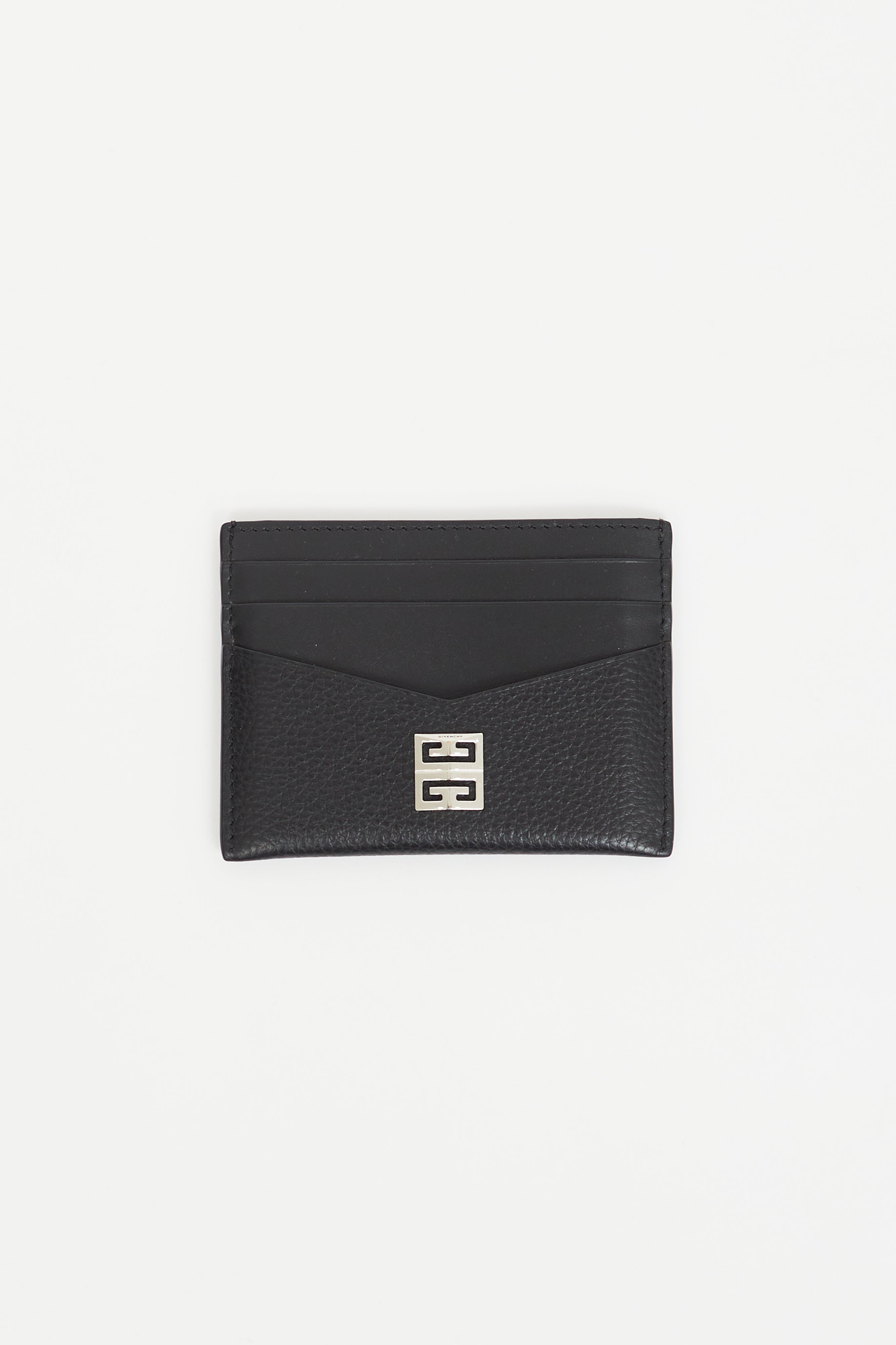 Pre-owned Givenchy black mixed leather cardholder featuring a pebbled leather base with V-cut shape on bottom cardholder slot, metal silver tone logo plaque at bottom, two card slots at top on the front and back and a slip pocket at top centre. Comes with original dust bag.