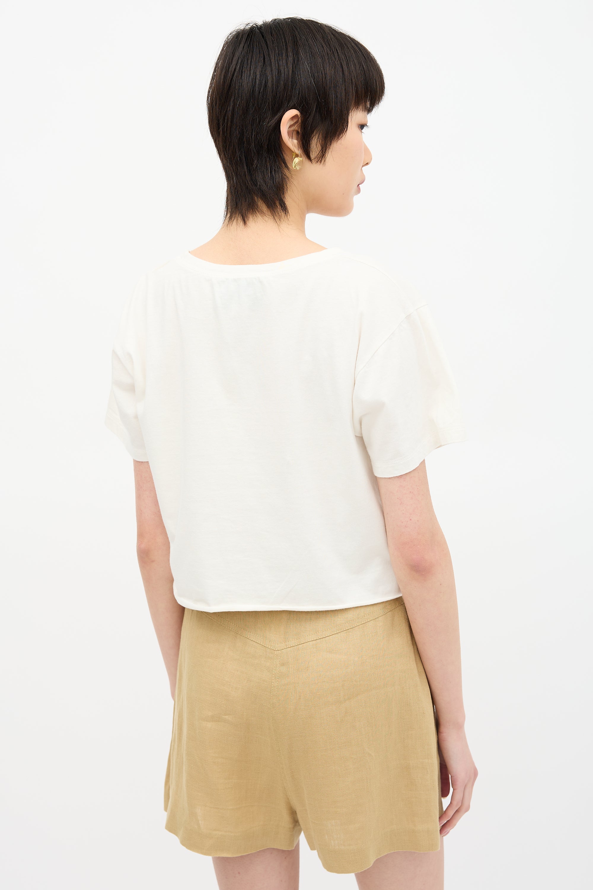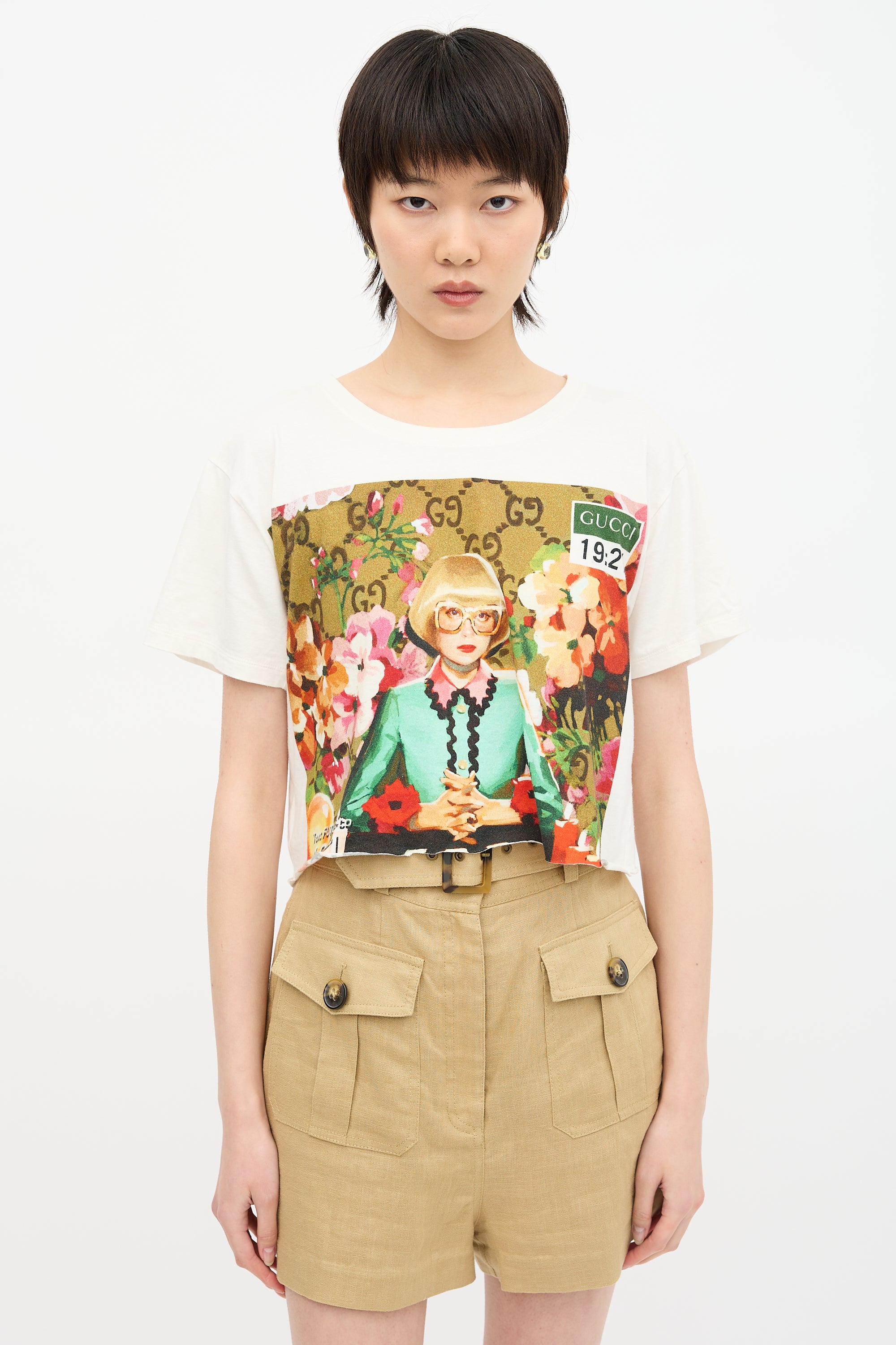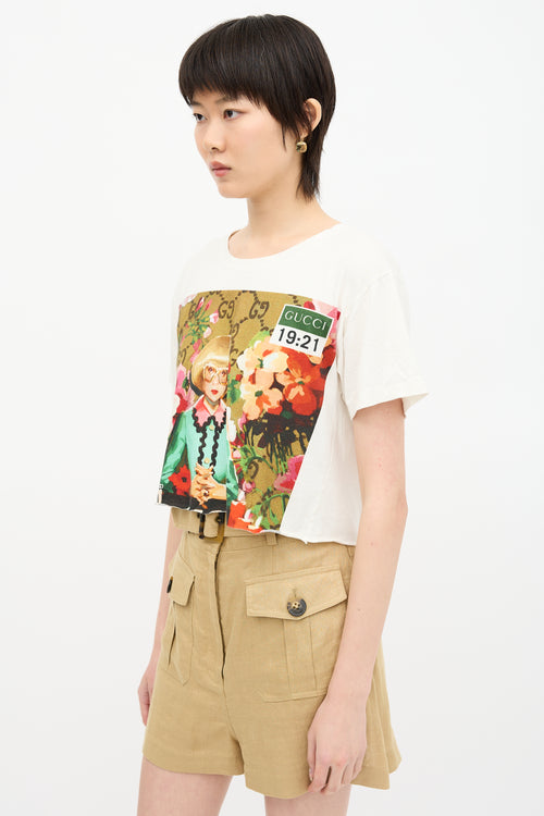 Pre-owned Gucci 2018 white and multicolour cropped T-shirt featuring round neckline, Ignasi Monreal graphic front, and raw hem.