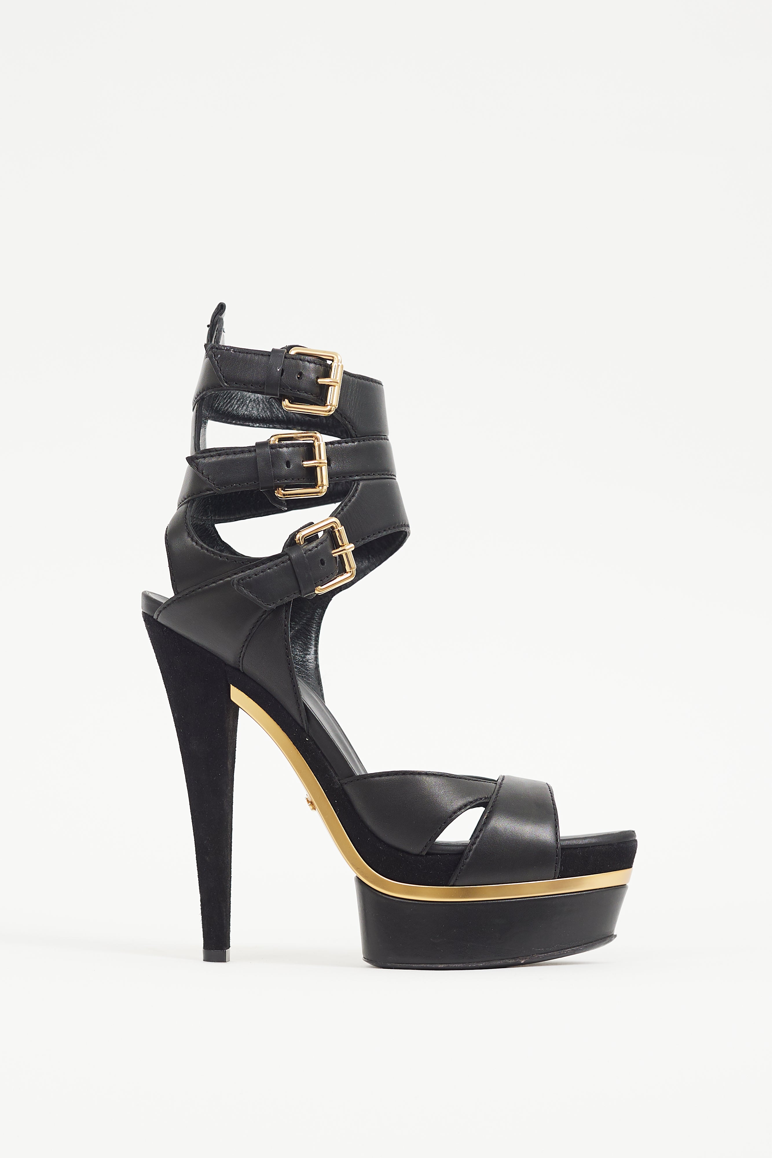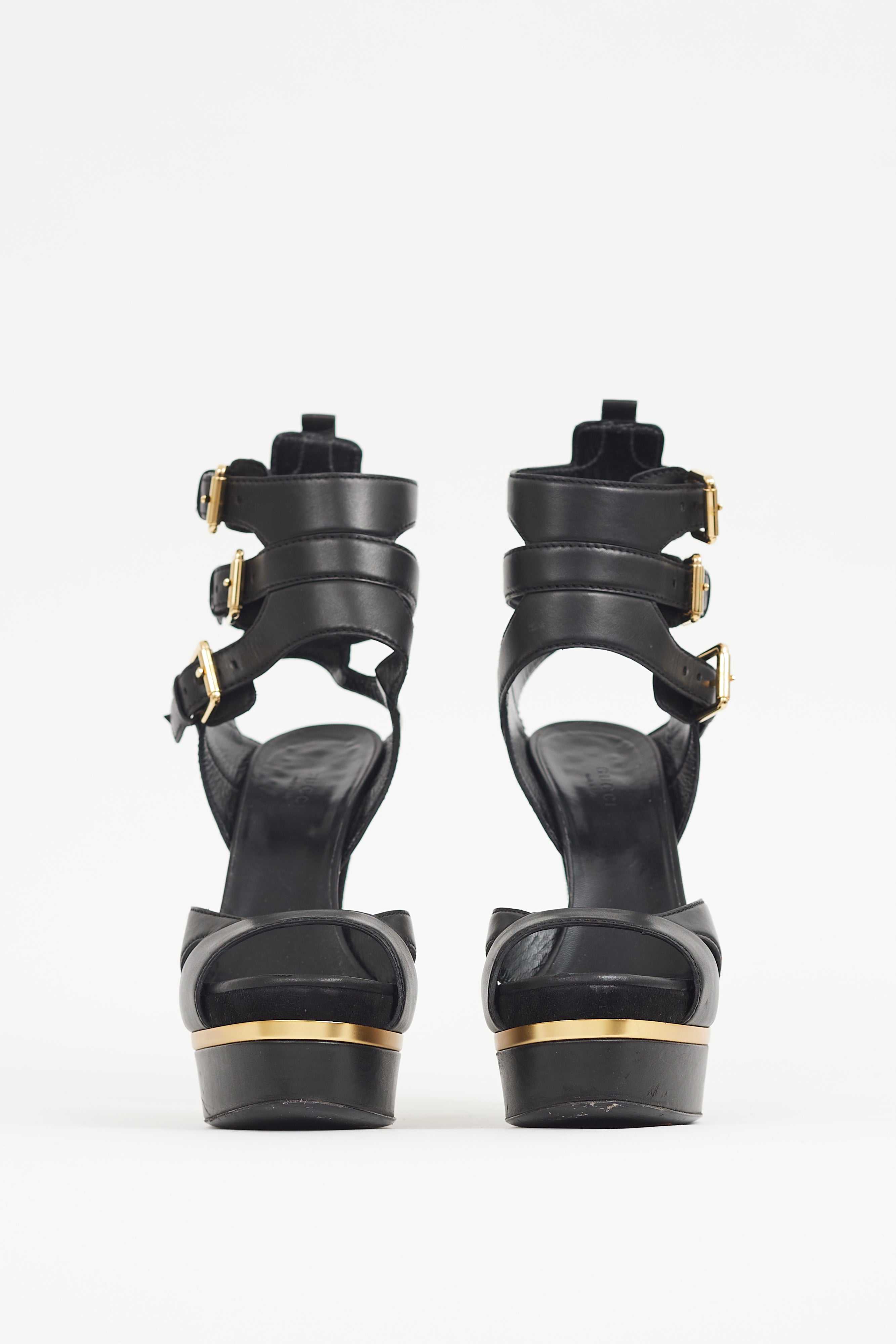 Pre-owned Gucci black leather sandals featuring an open round toe, platform midsole, wrapped stiletto heel, and multi strap closure at ankle with gold tone buckles. Comes with original box.