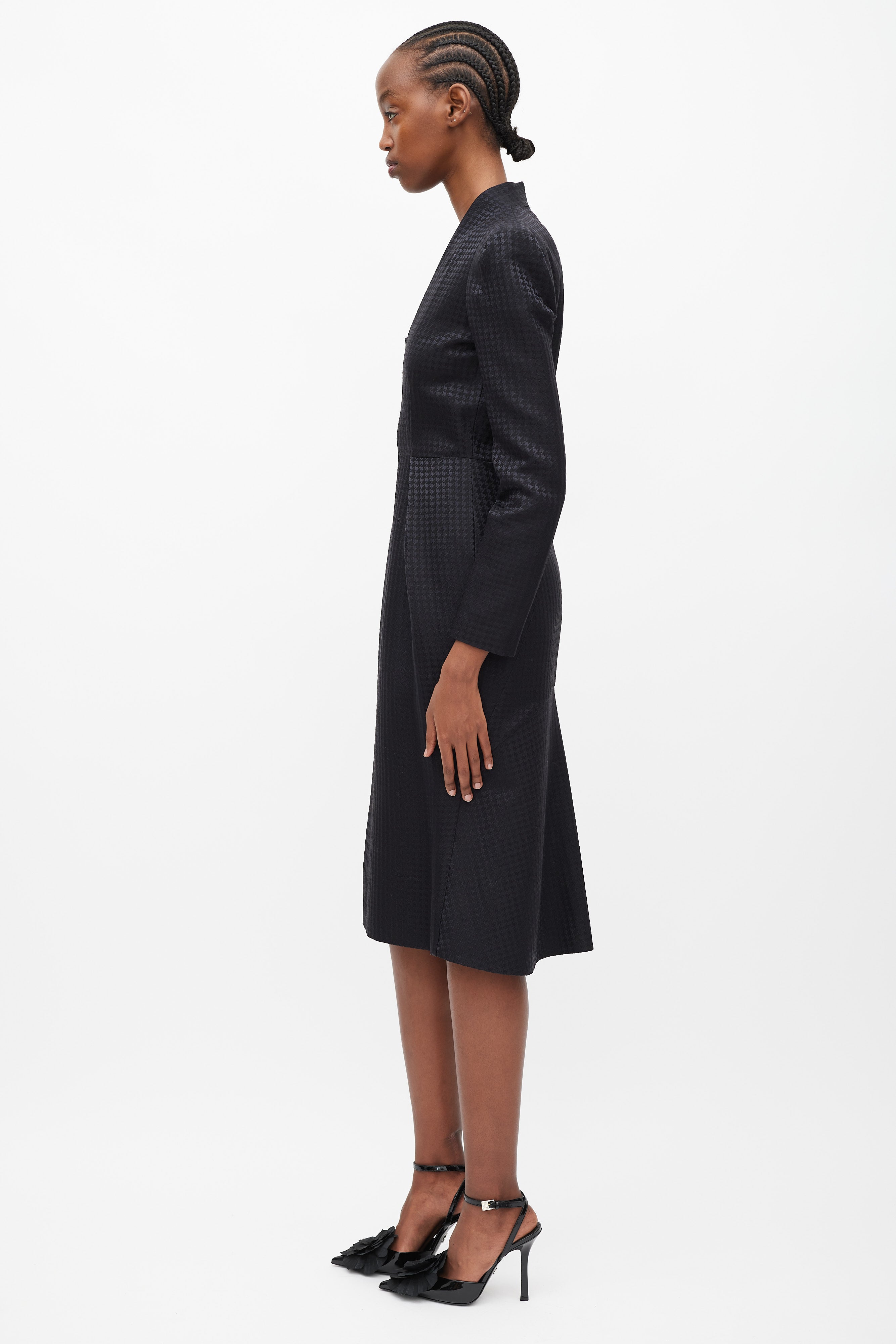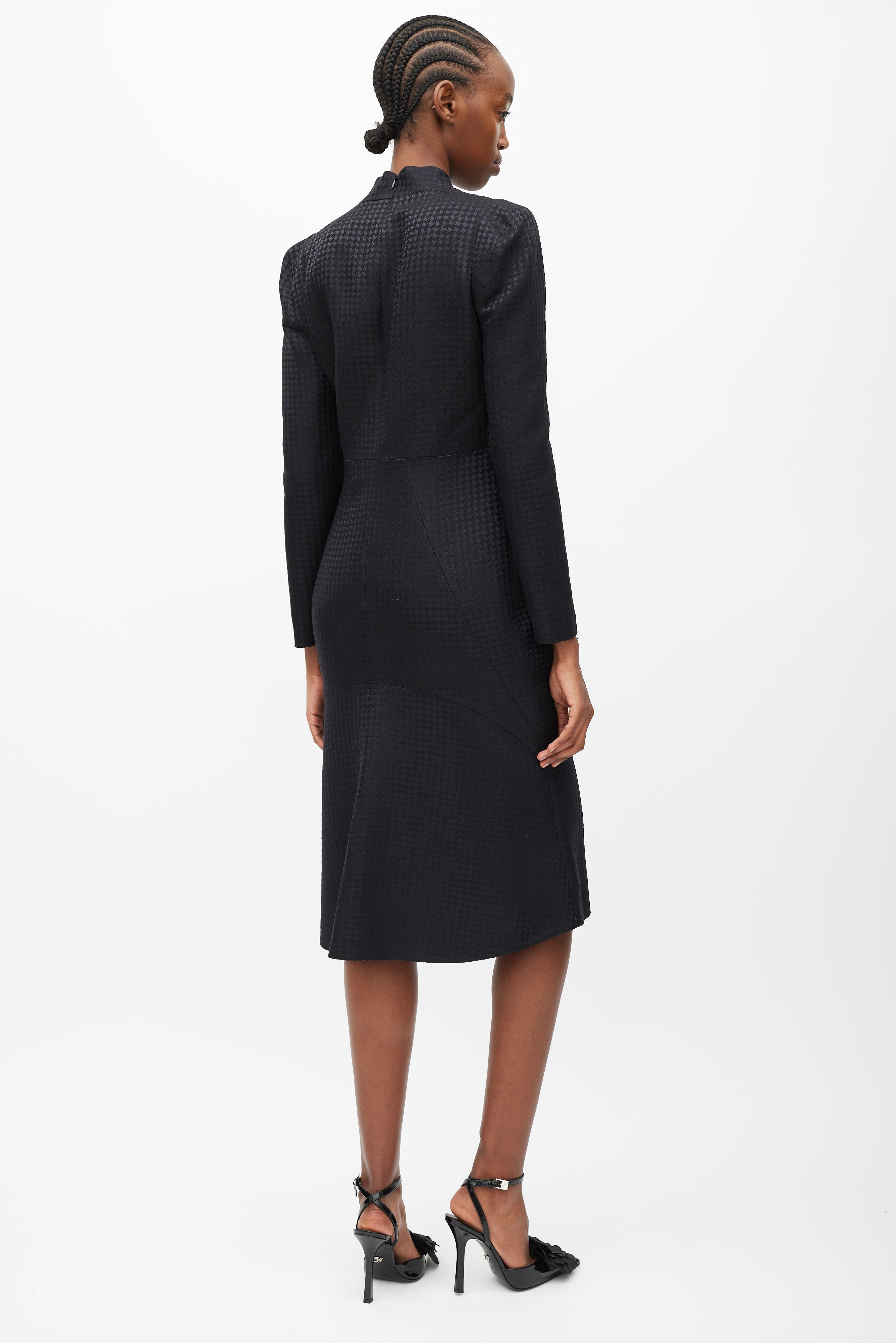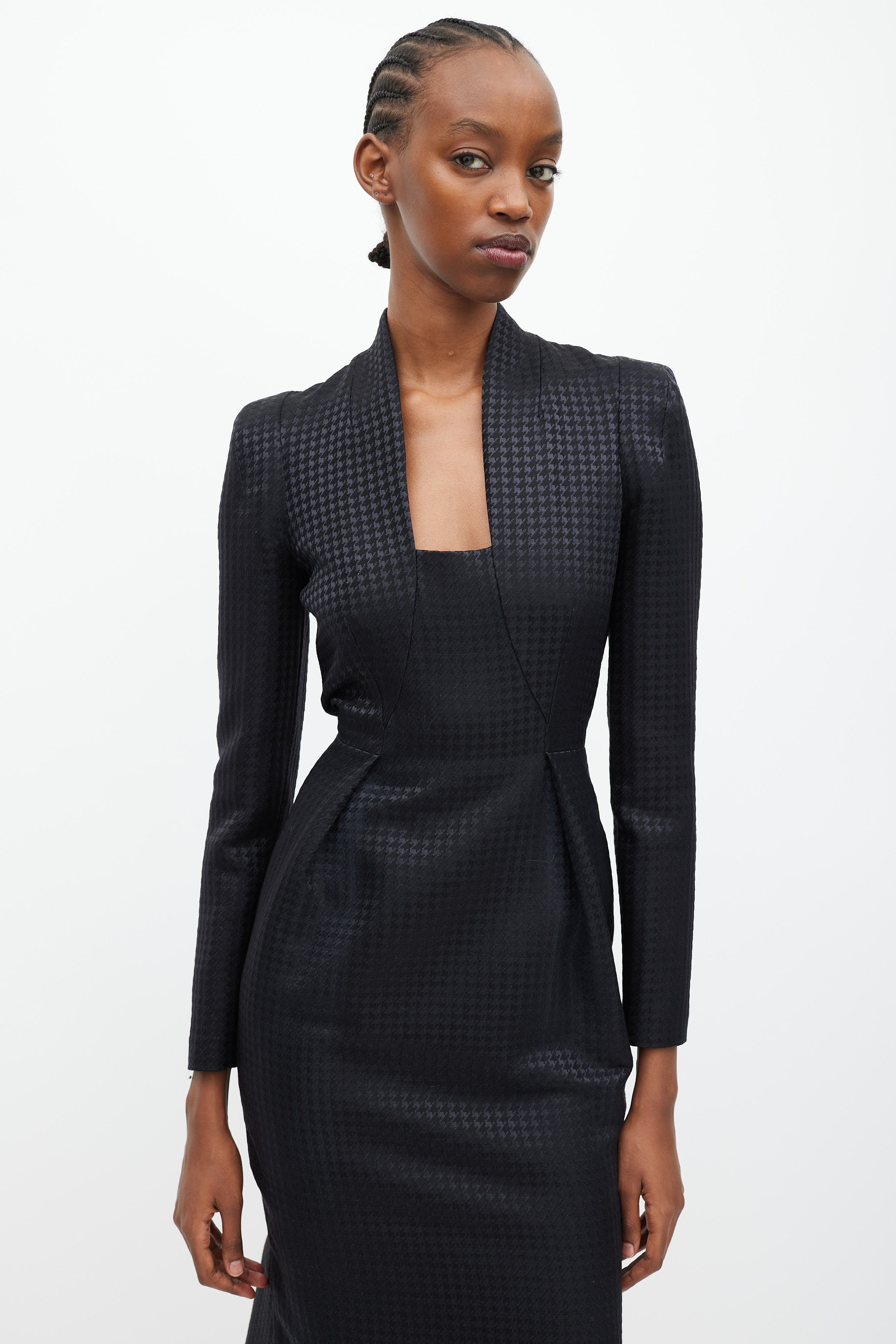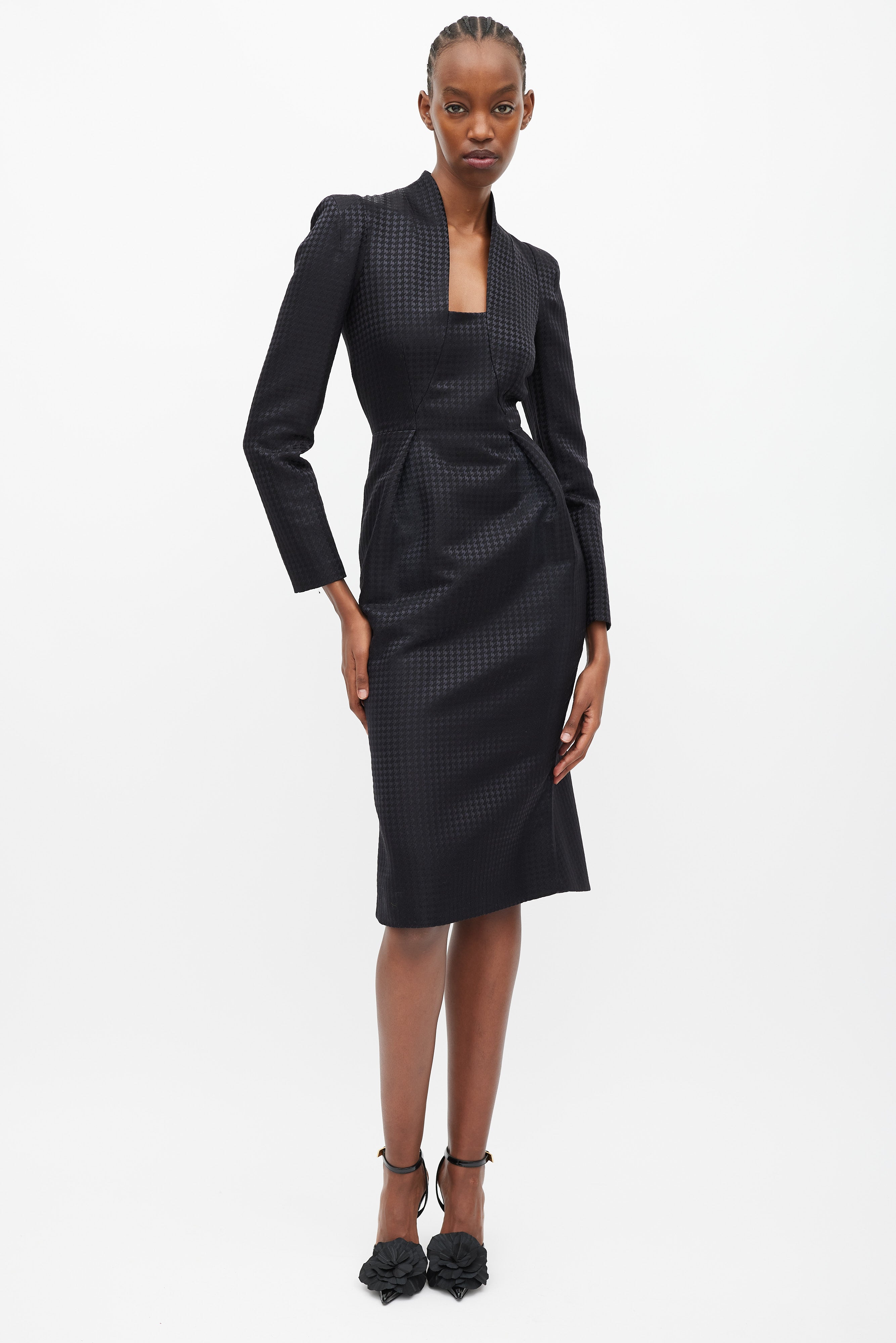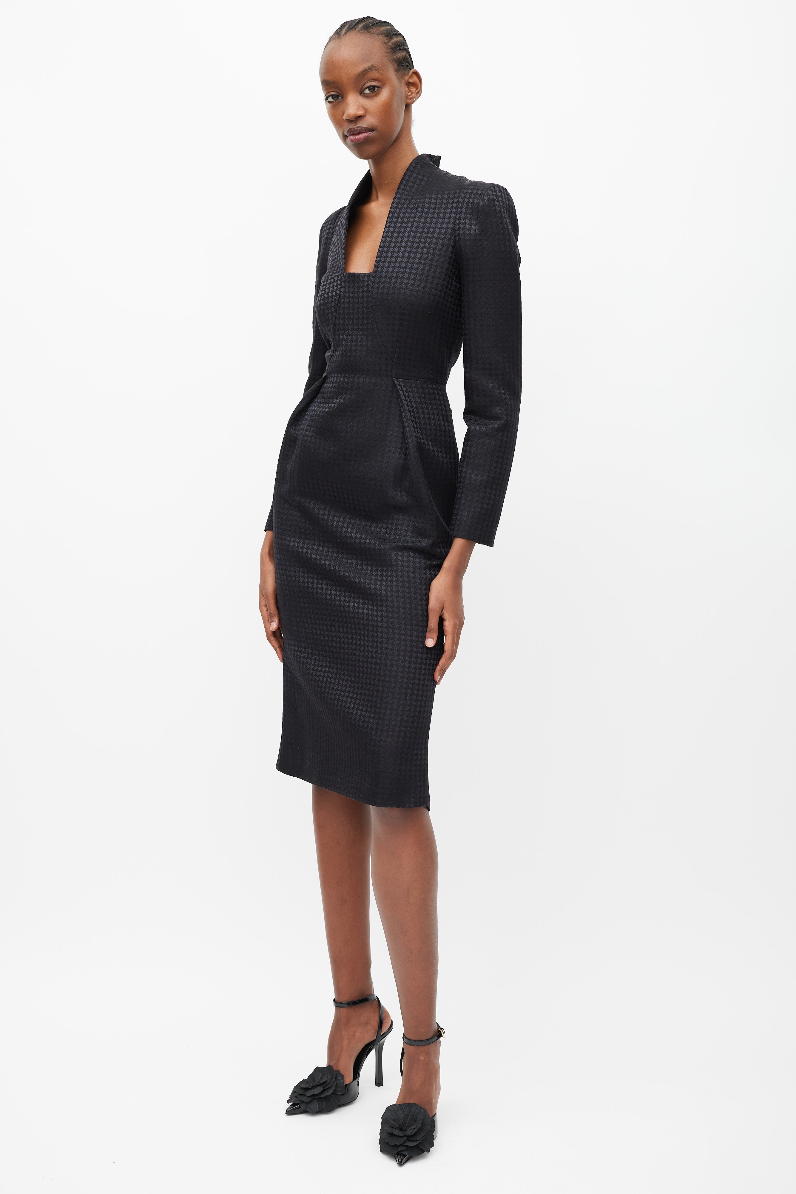 Pre-owned Gucci black houndstooth square neck maxi dress featuring long sleeves, pleating at hips, black tonal houndstooth pattern, back inseam zip and slim fit. Lined. Clipped to fit model.
