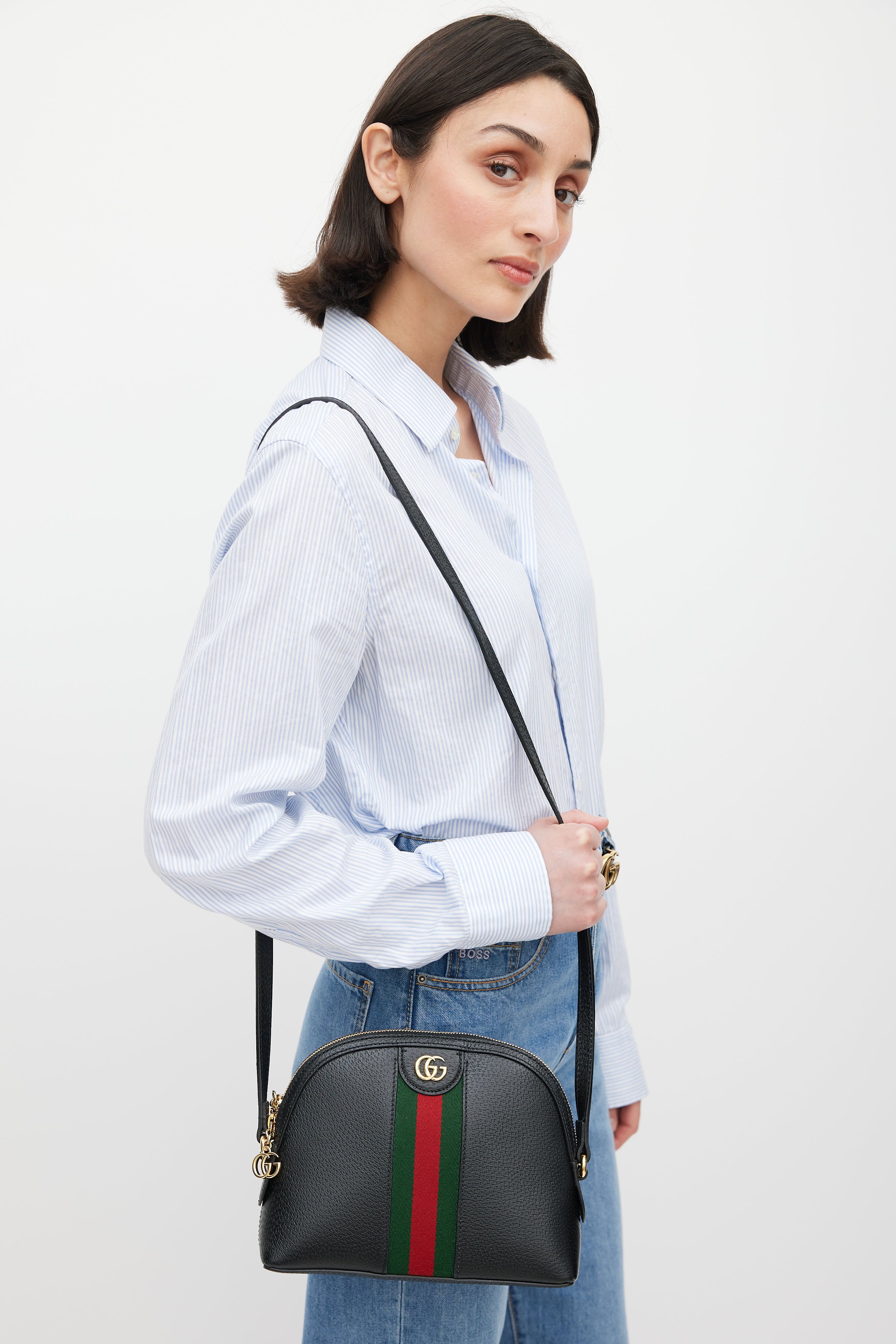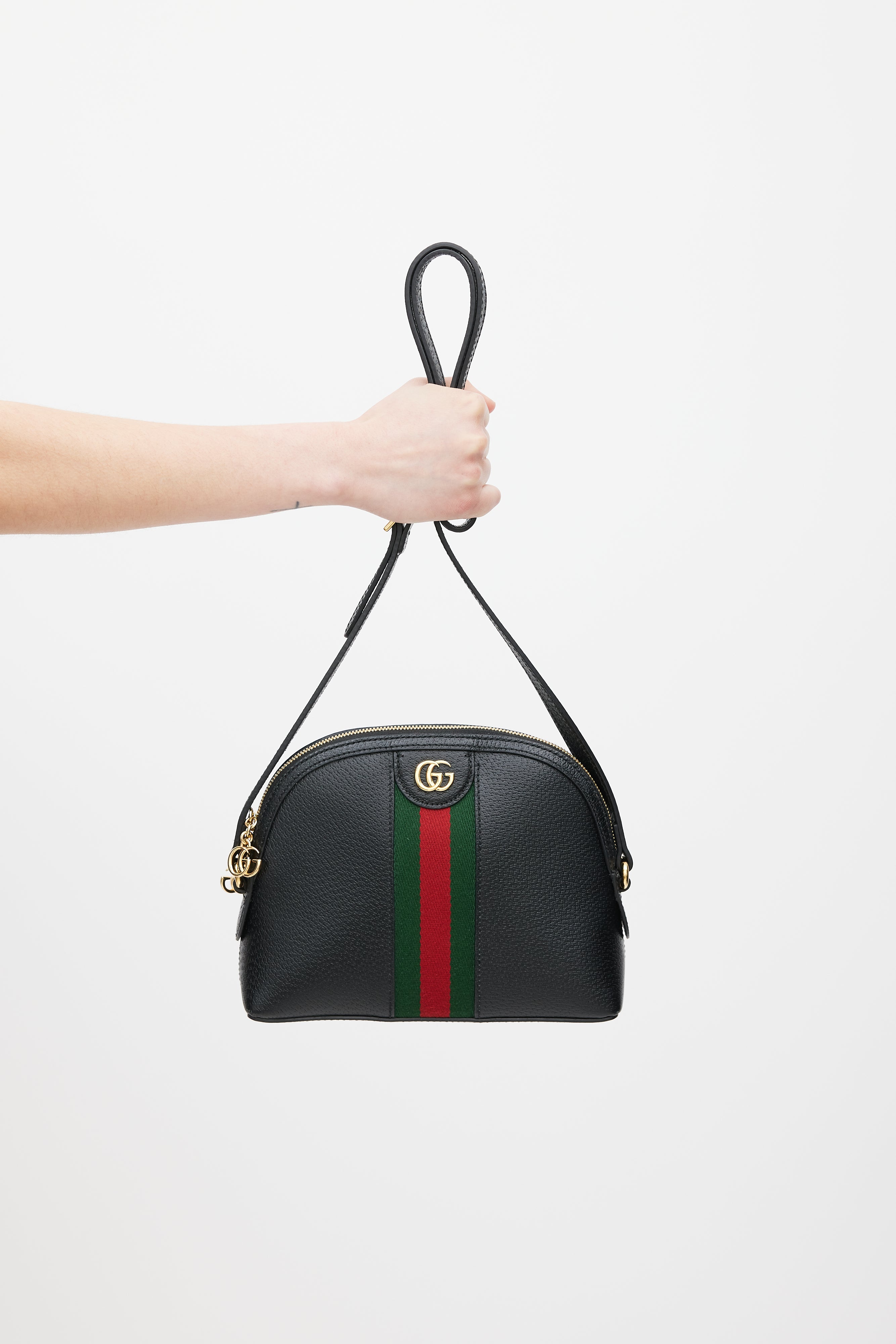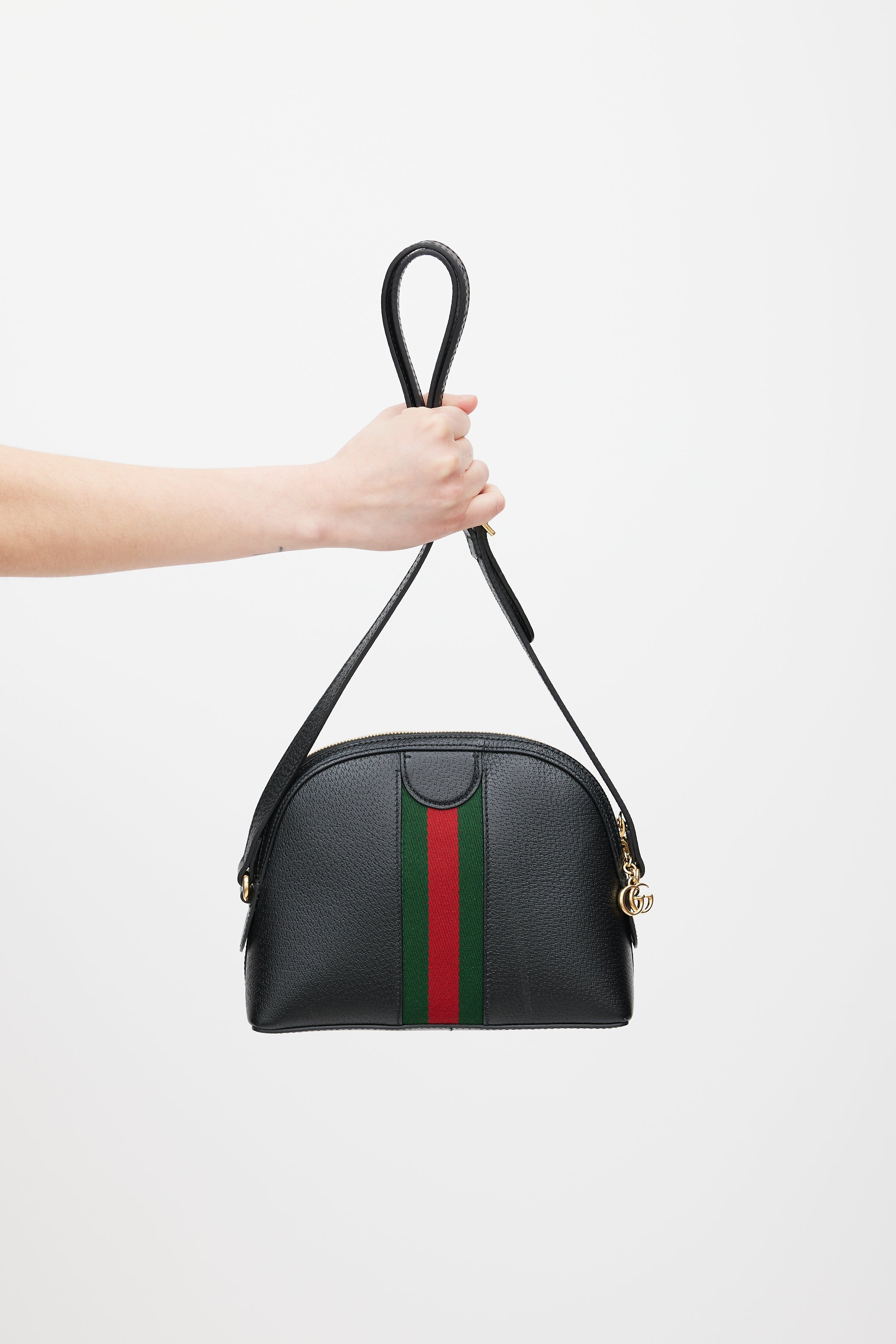 Pre-owned Gucci black Ophidia Dome leather bag featuring a multicolour webbed stripe at front and back, gold tone GG logo hardware at front, one main compartment with three slip pockets, adjustable shoulder strap, and top zip closure with GG logo pull tab.