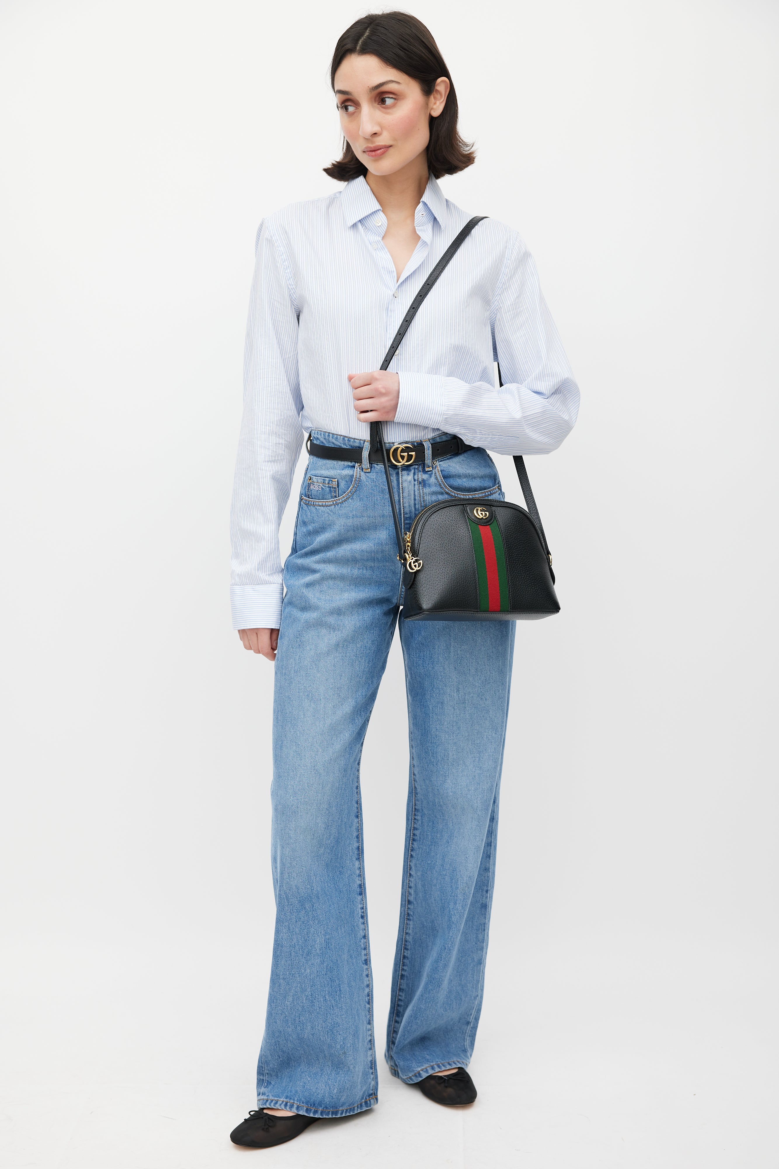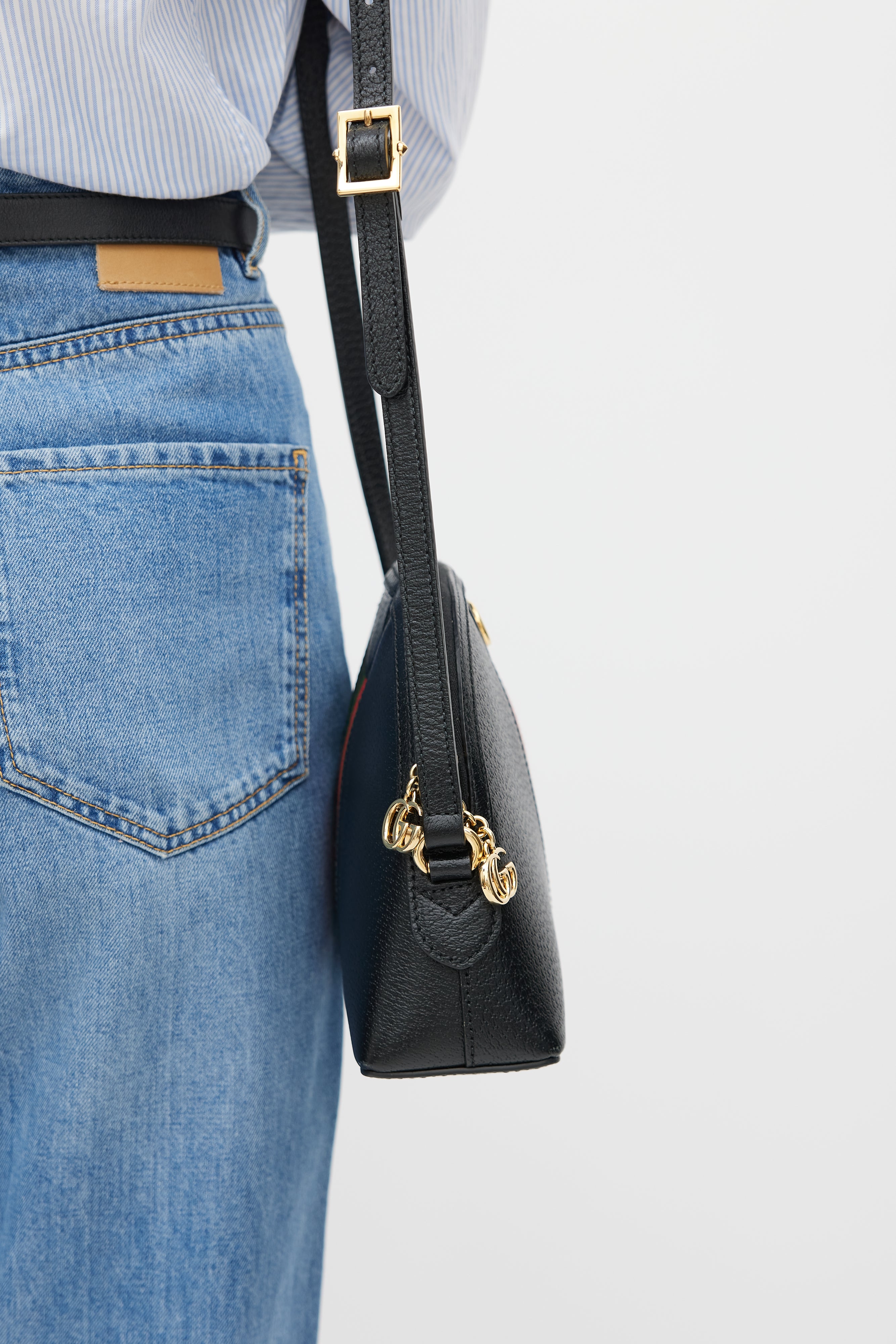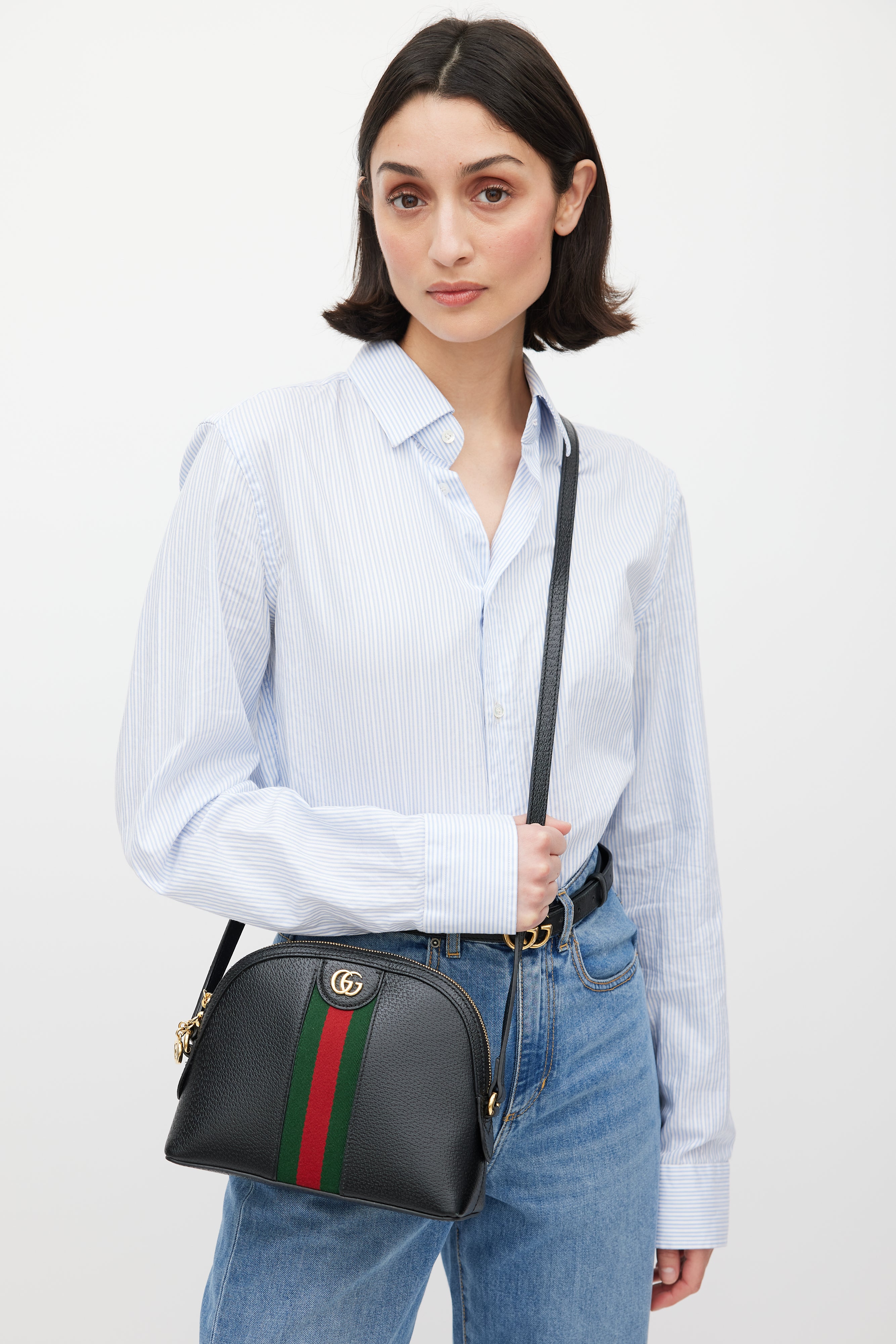 Pre-owned Gucci black Ophidia Dome leather bag featuring a multicolour webbed stripe at front and back, gold tone GG logo hardware at front, one main compartment with three slip pockets, adjustable shoulder strap, and top zip closure with GG logo pull tab.