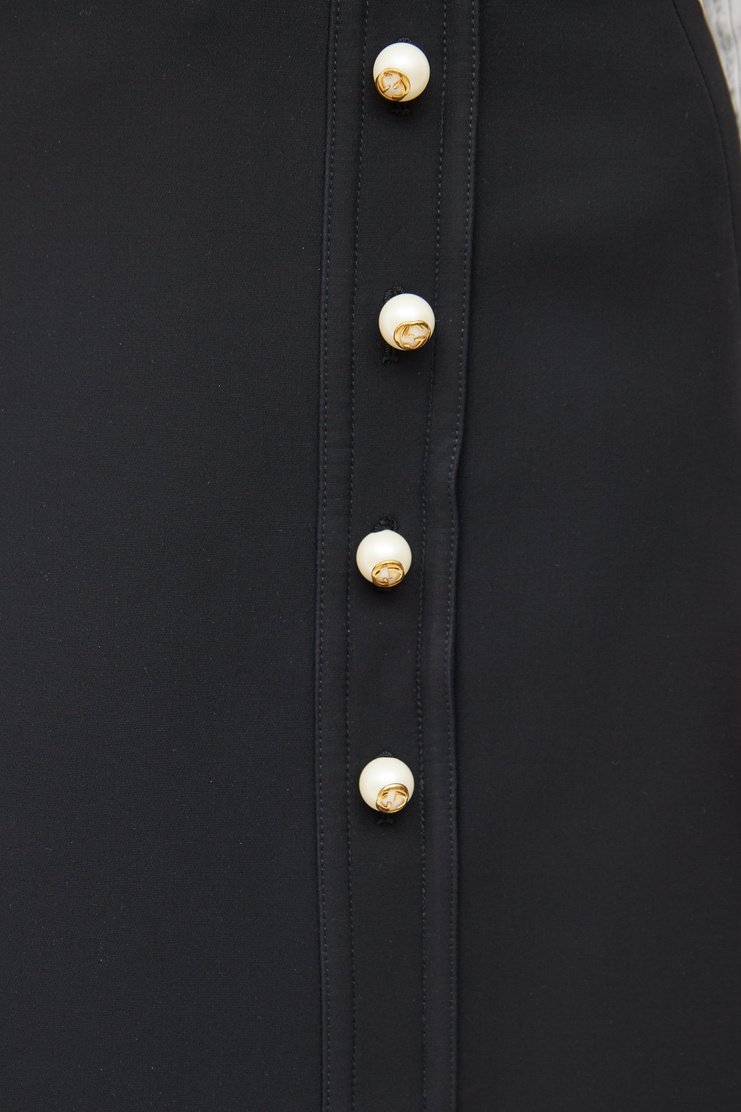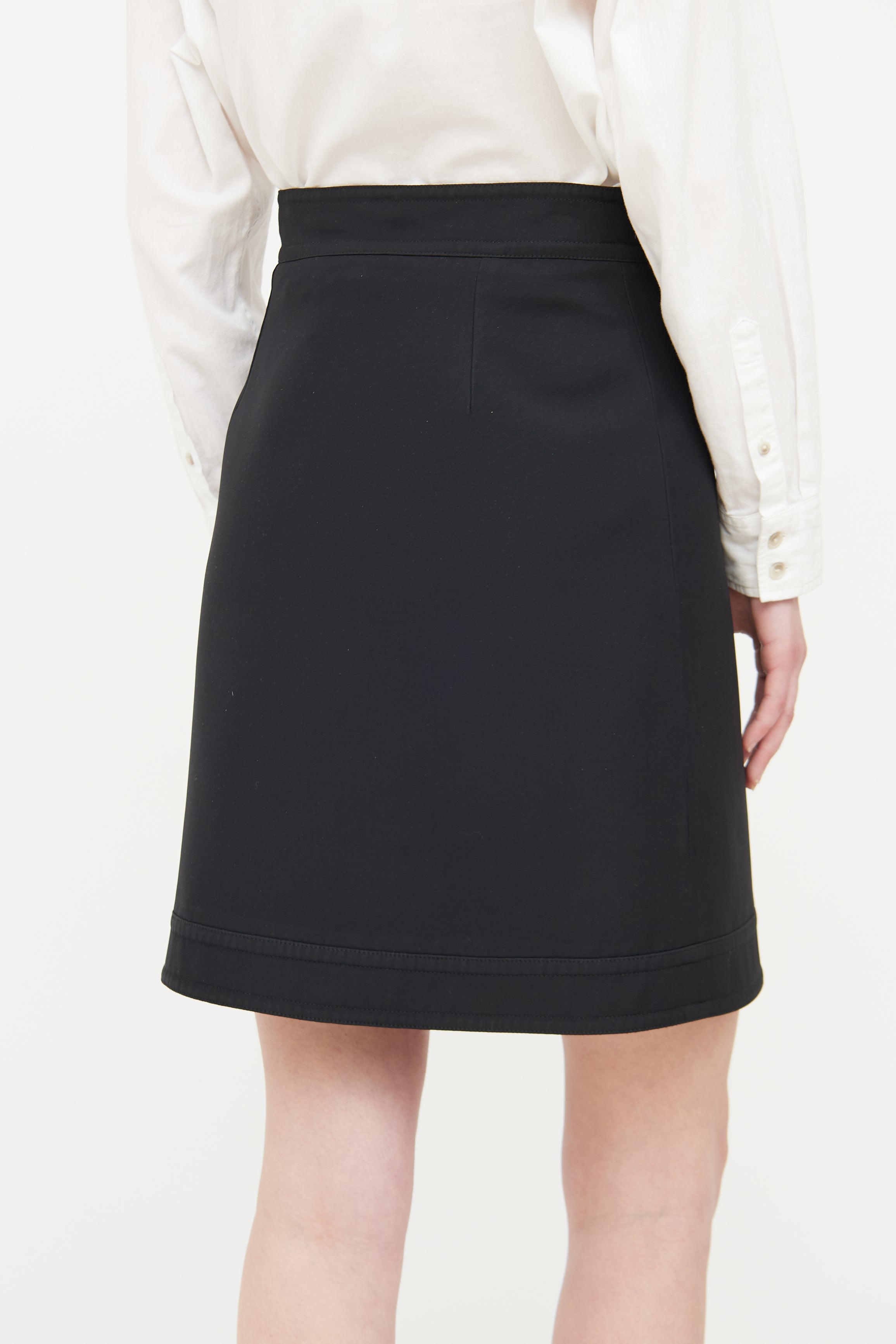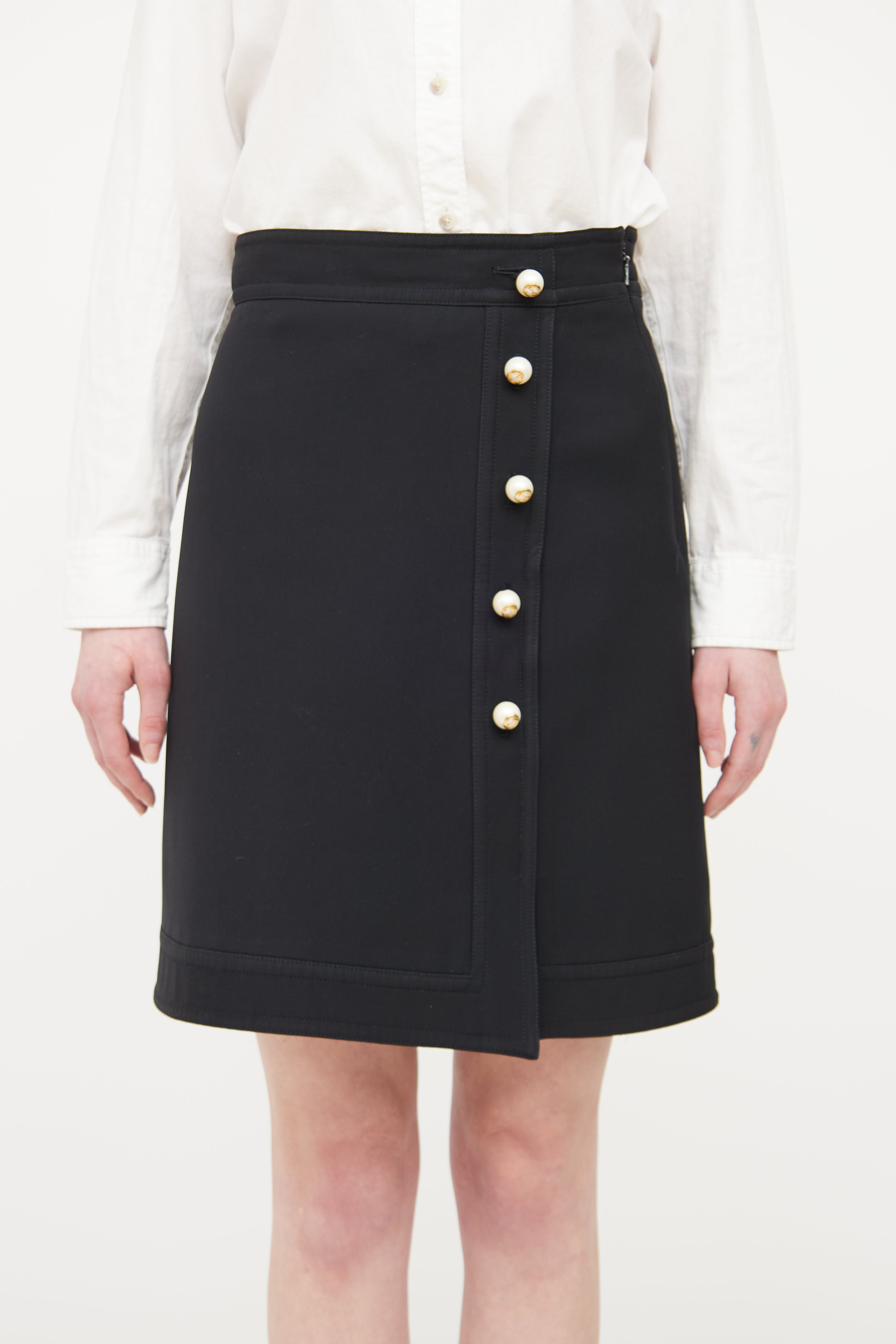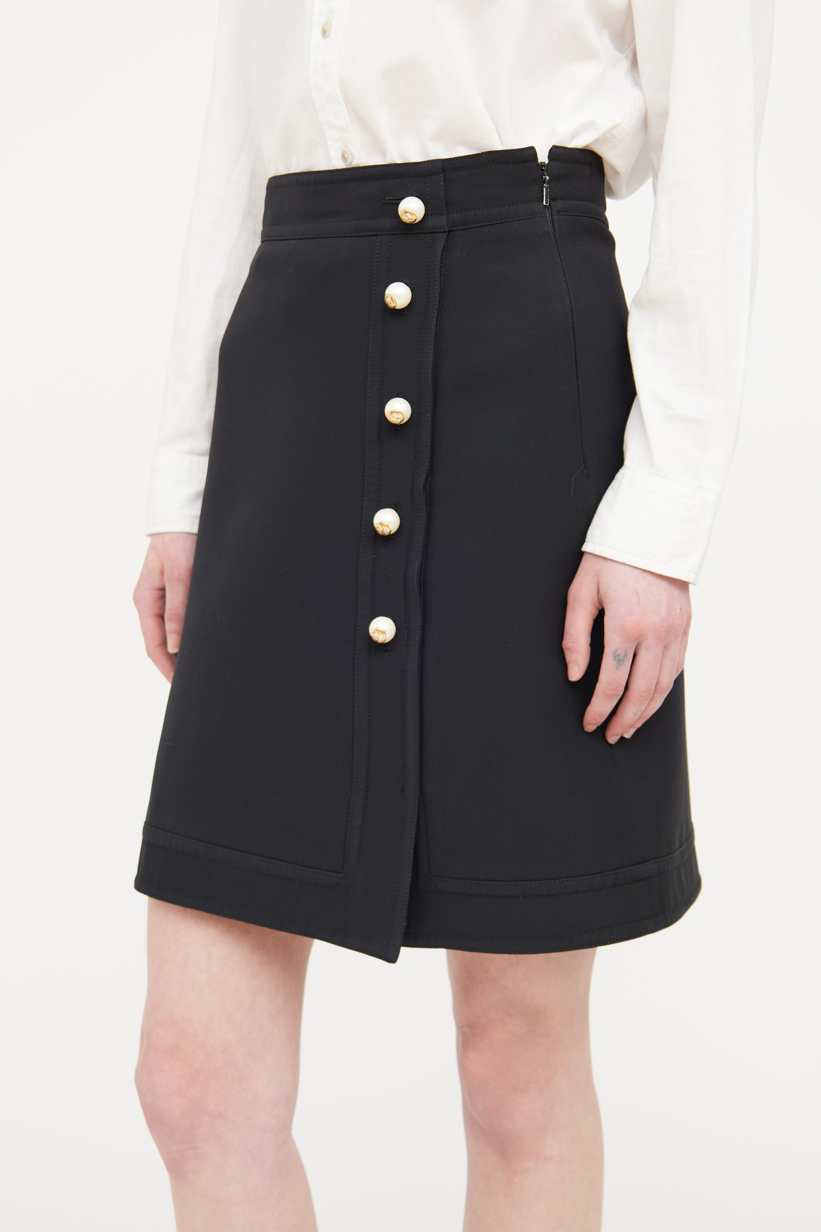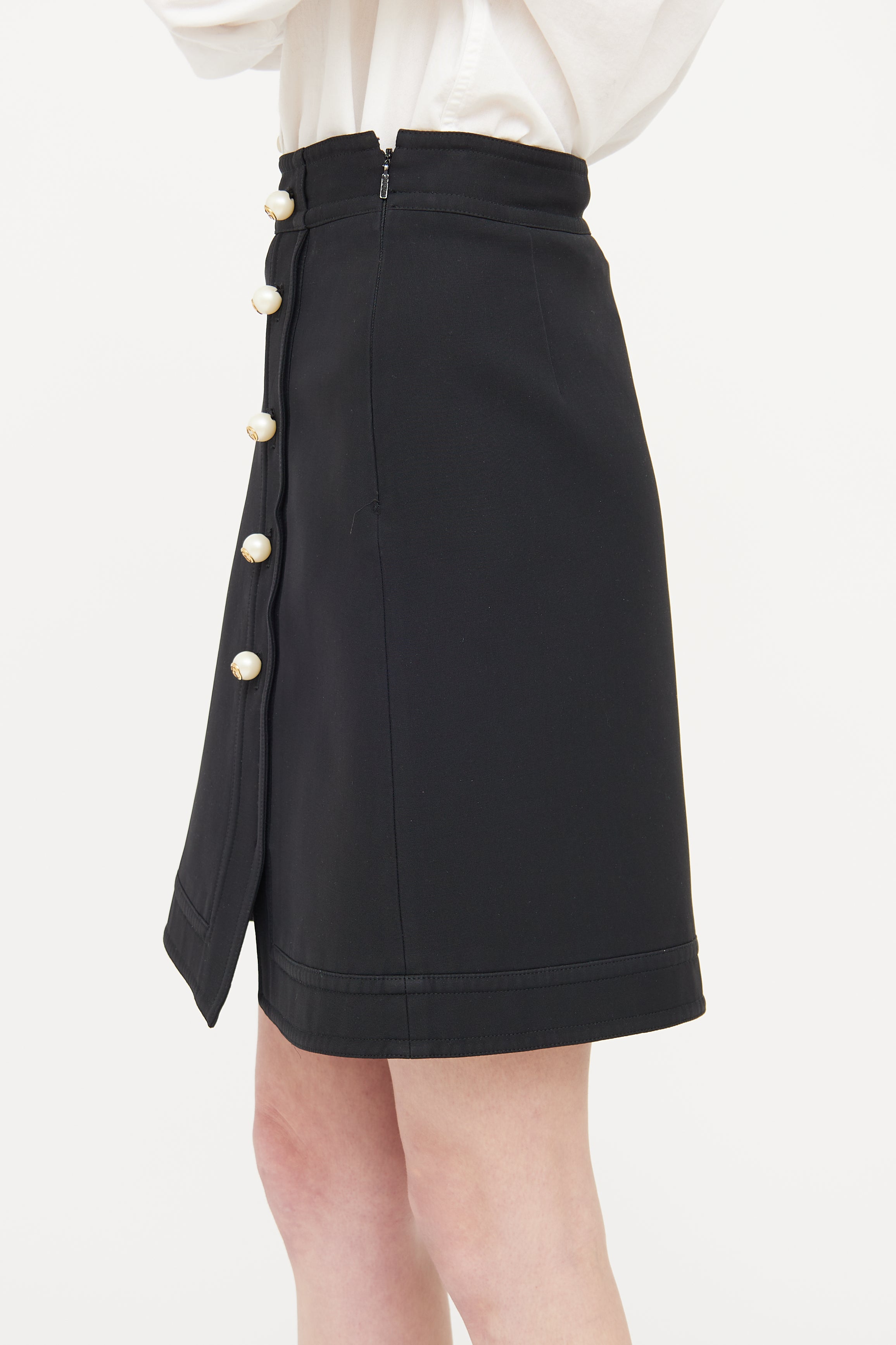 Pre-owned Gucci black wool blend skirt featuring A-line styling, side zip closure, flat waist band, non functional pearl button detailing down front. Fully lined.