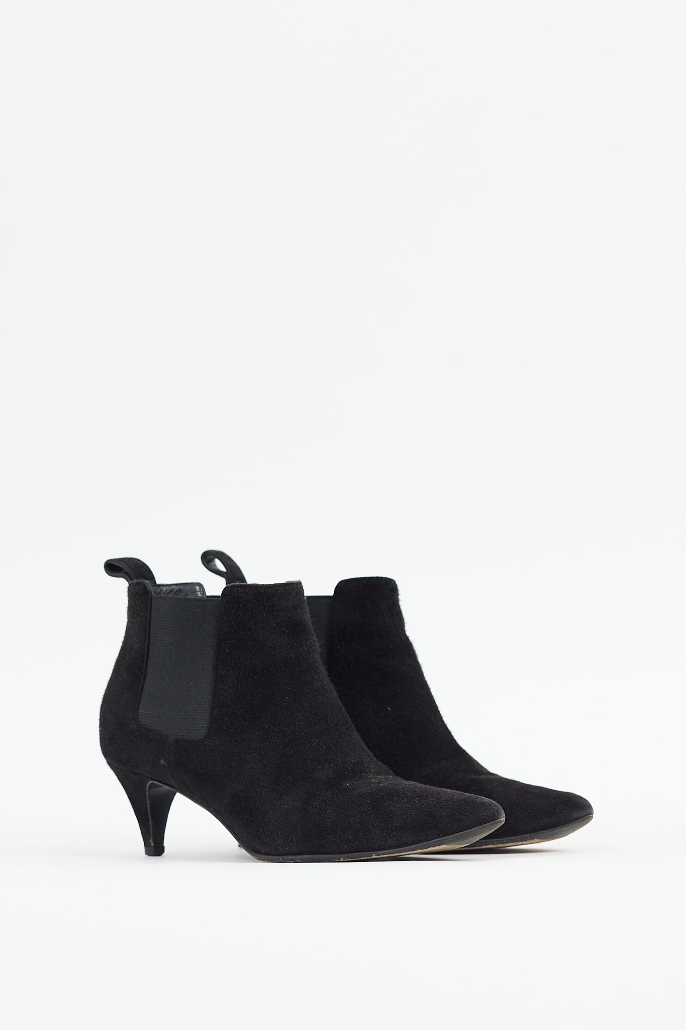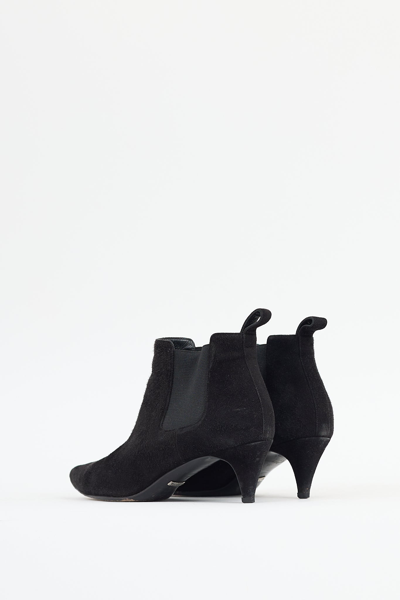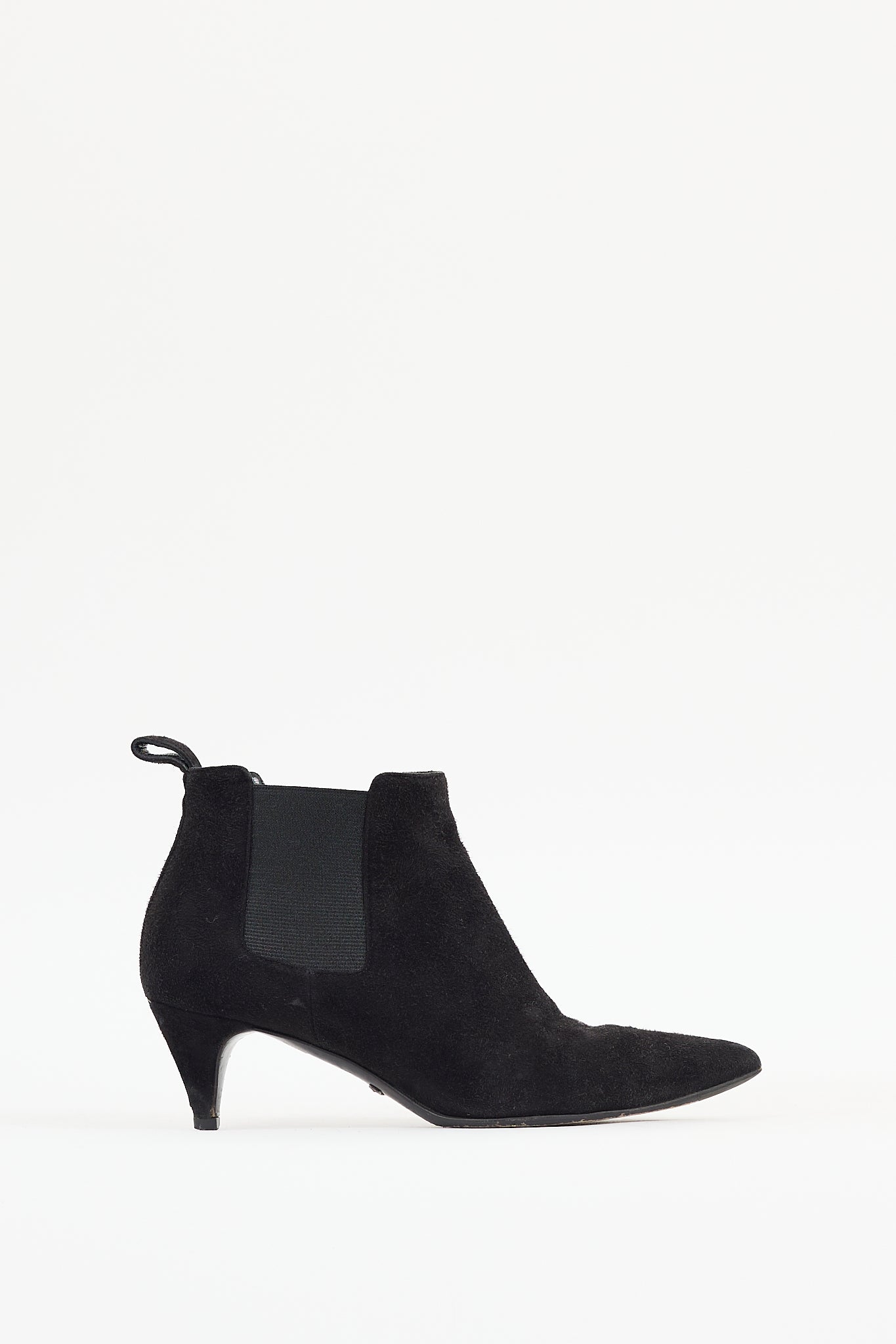 Pre-owned Gucci black suede chelsea boots featuring a pointed toe, gussets at sides, pull tab at heel, and wrapped kitten heel.