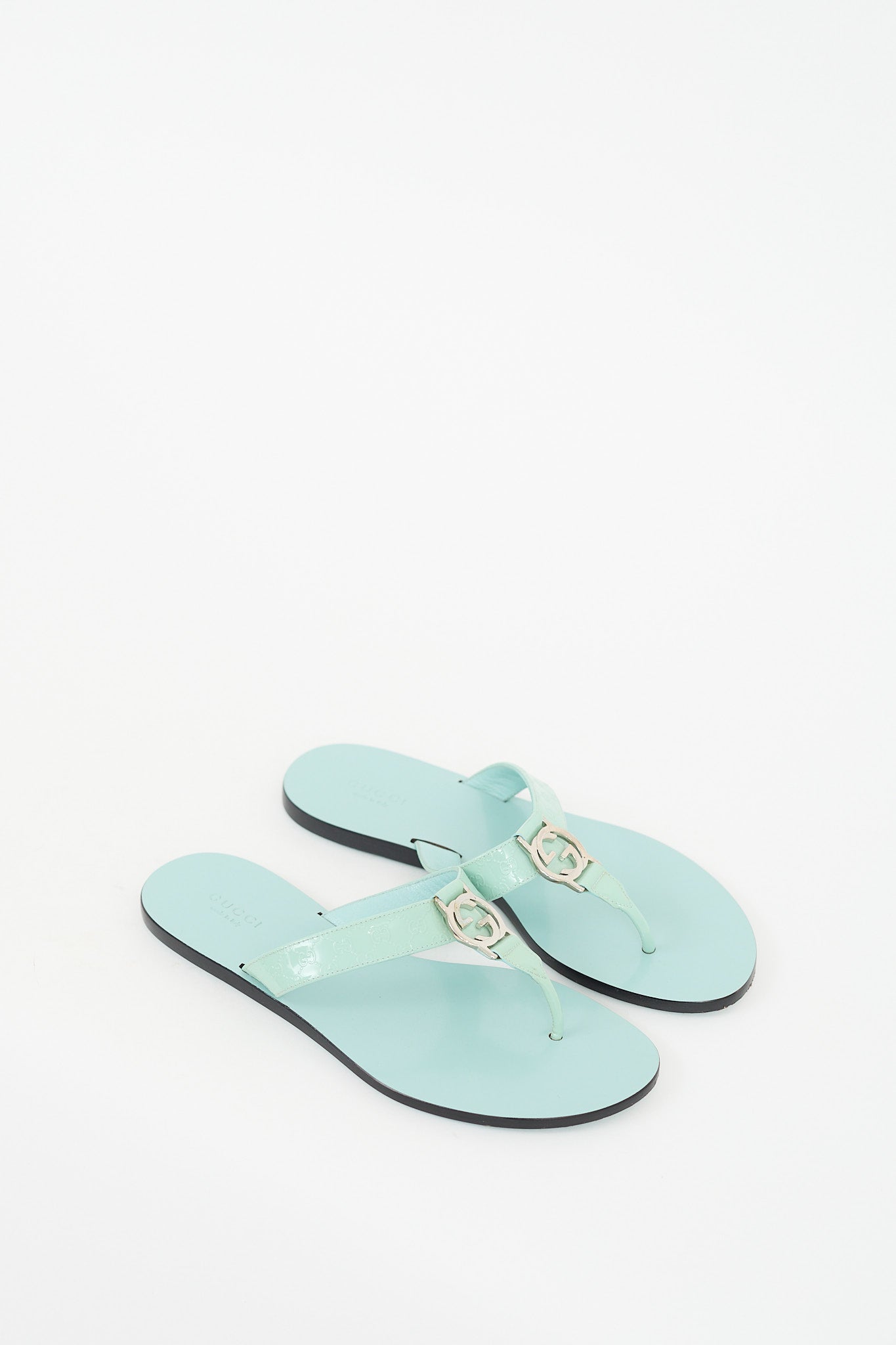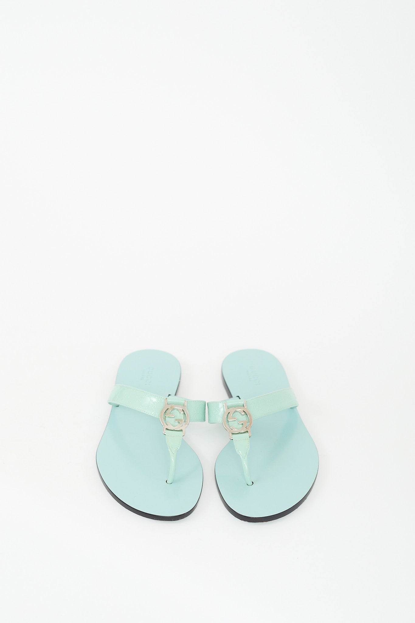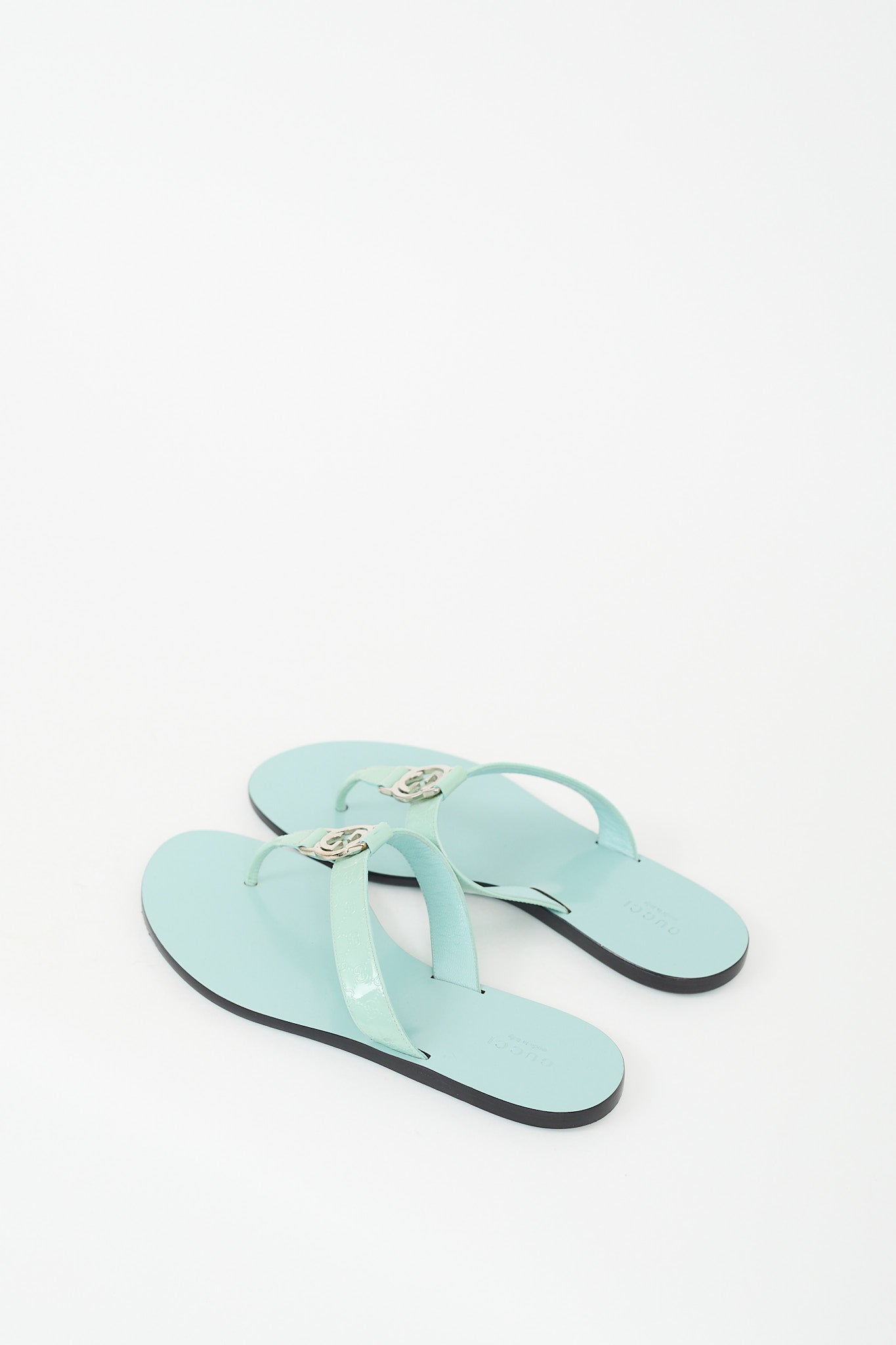 Pre-owned Gucci blue leather sandals featuring a round toe, monogram embossed patent thong strap, silver tone GG logo hardware at front, and slip on entry.