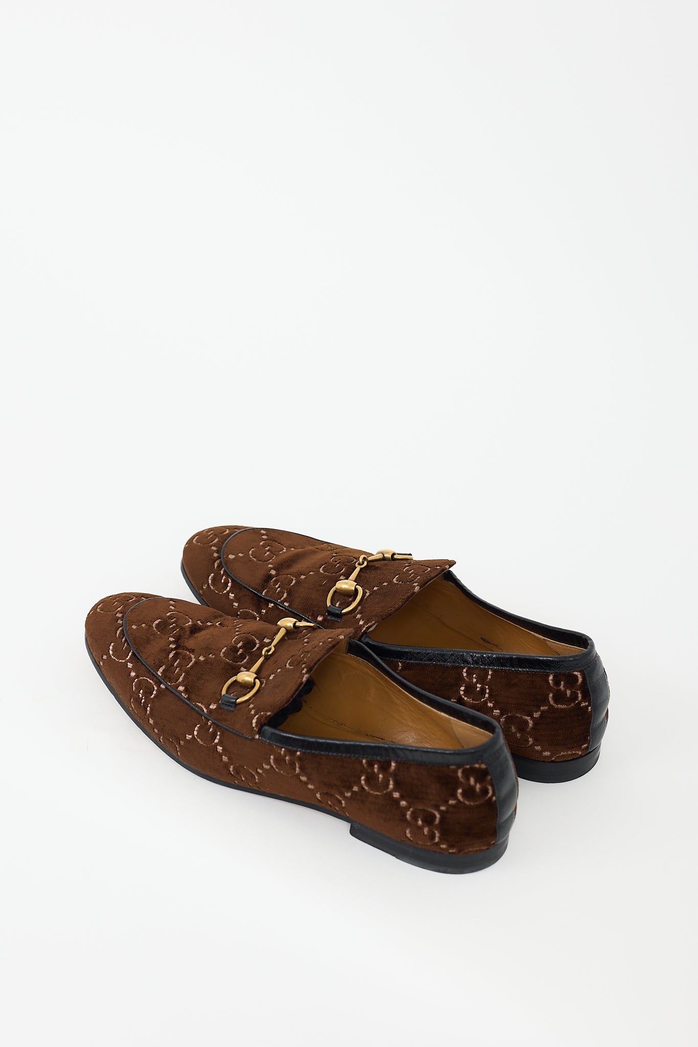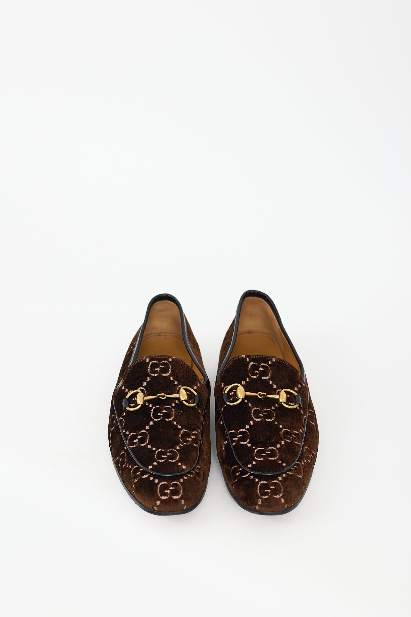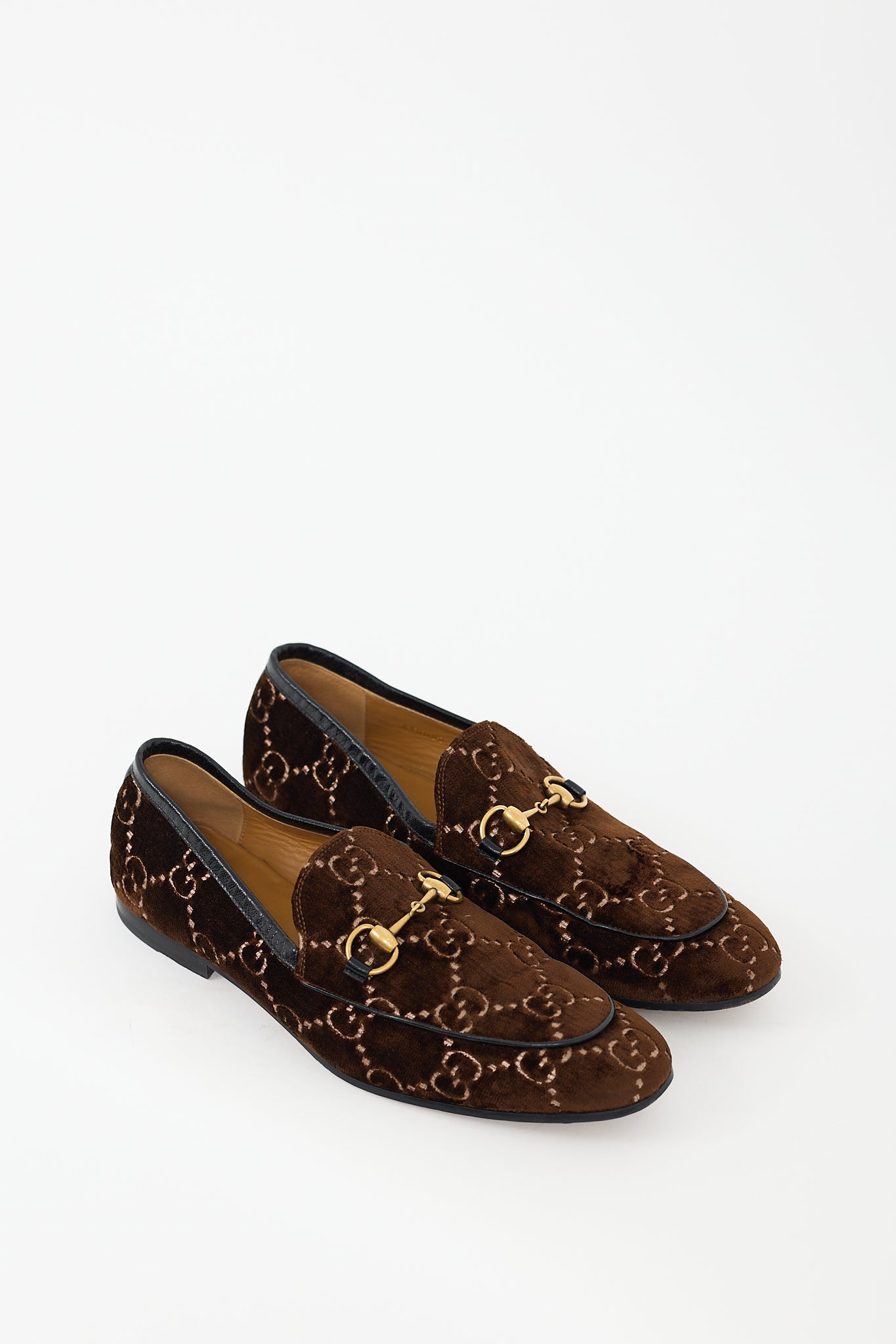 Pre-owned Gucci brown Jordaan velour loafers featuring a tonal monogram pattern throughout, round toe, leather trim, gold tone horsebit hardware at vamp, and stacked heel.