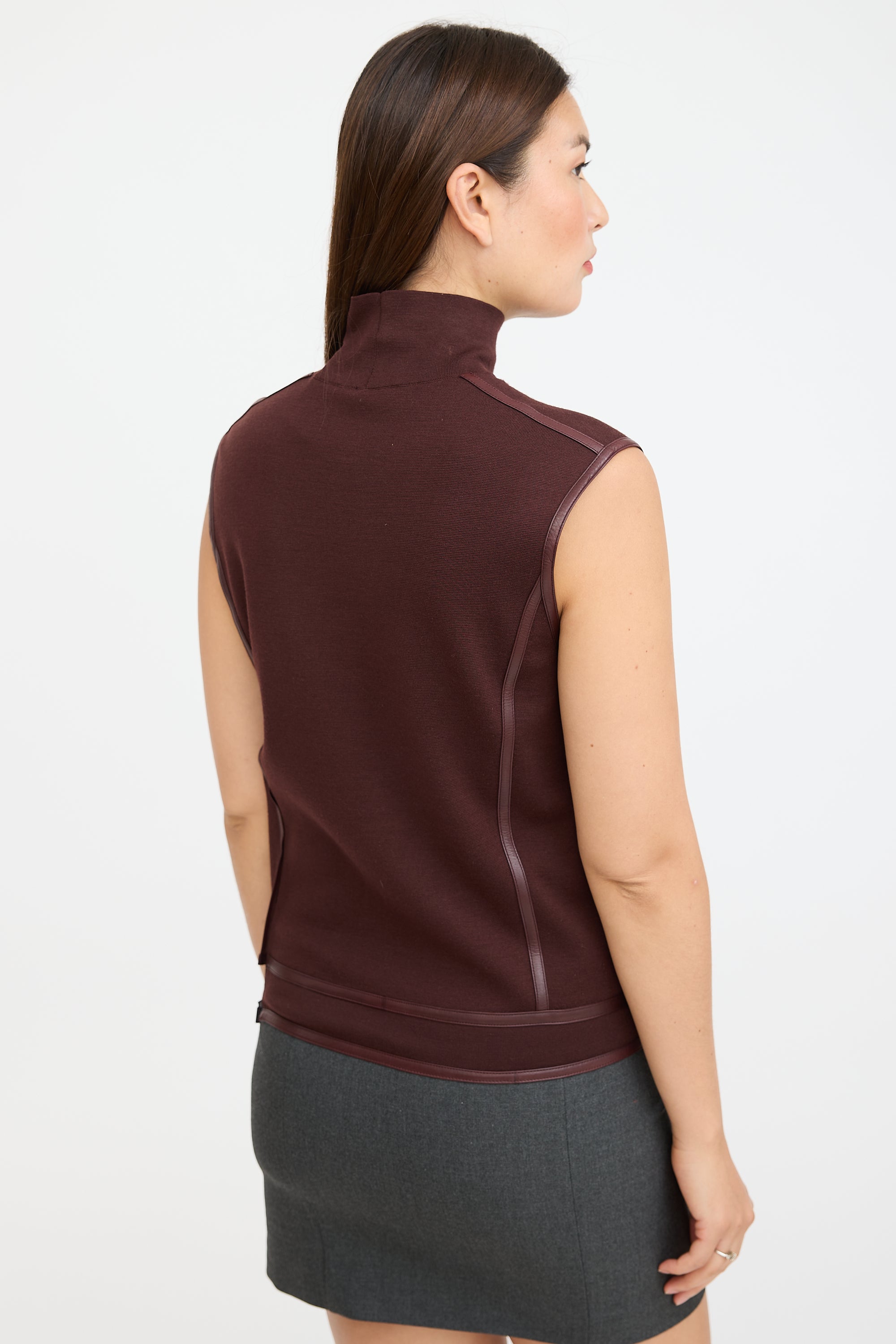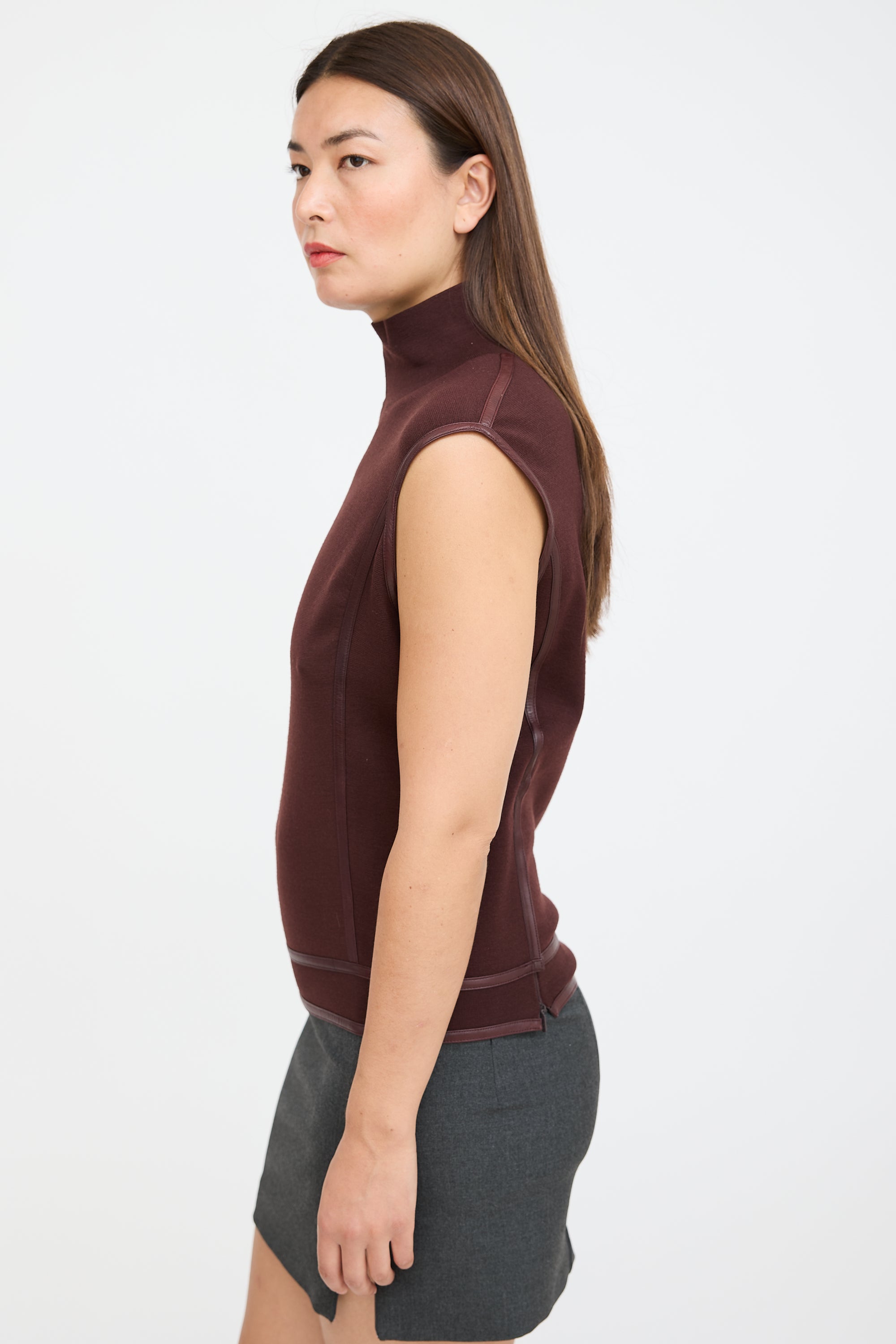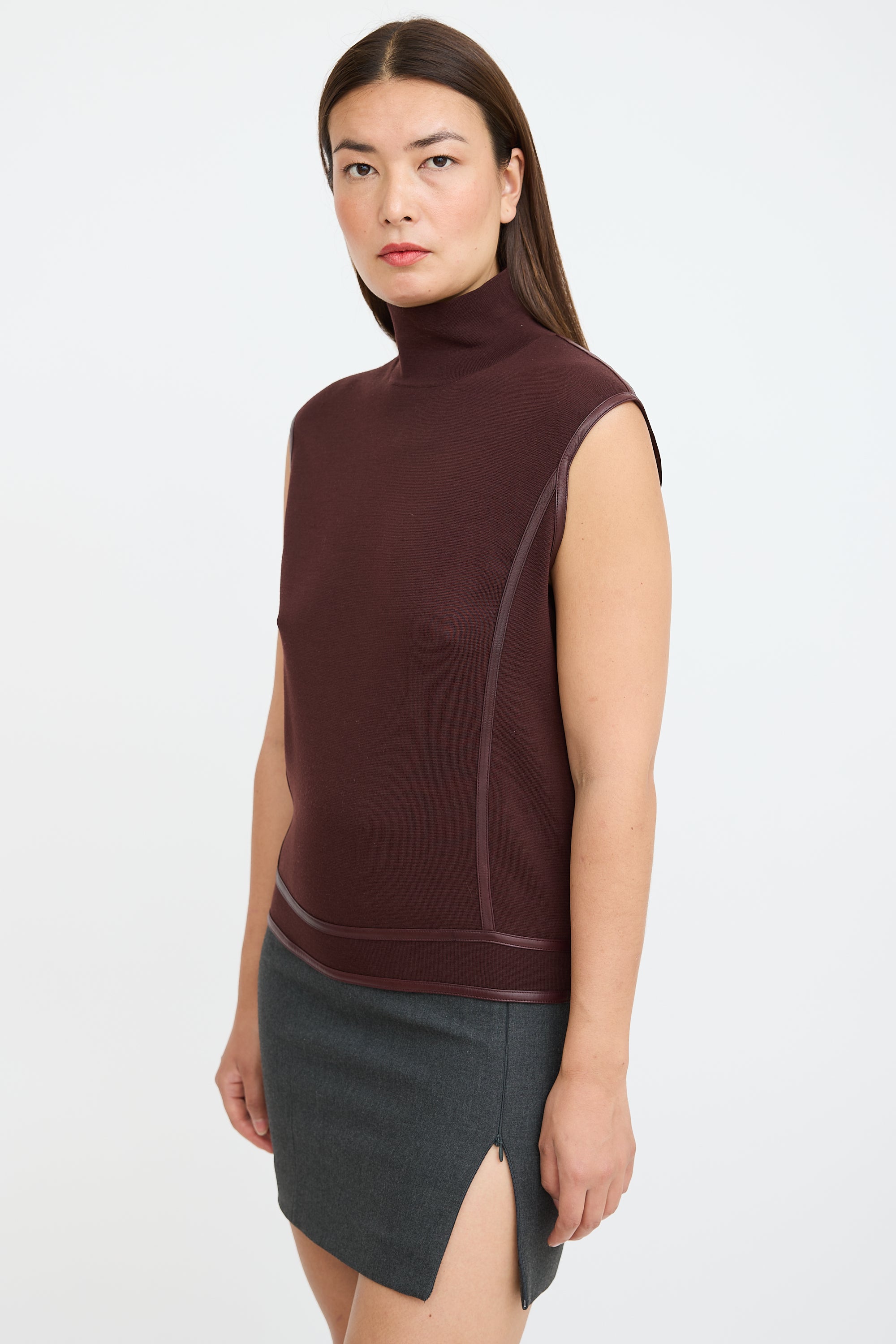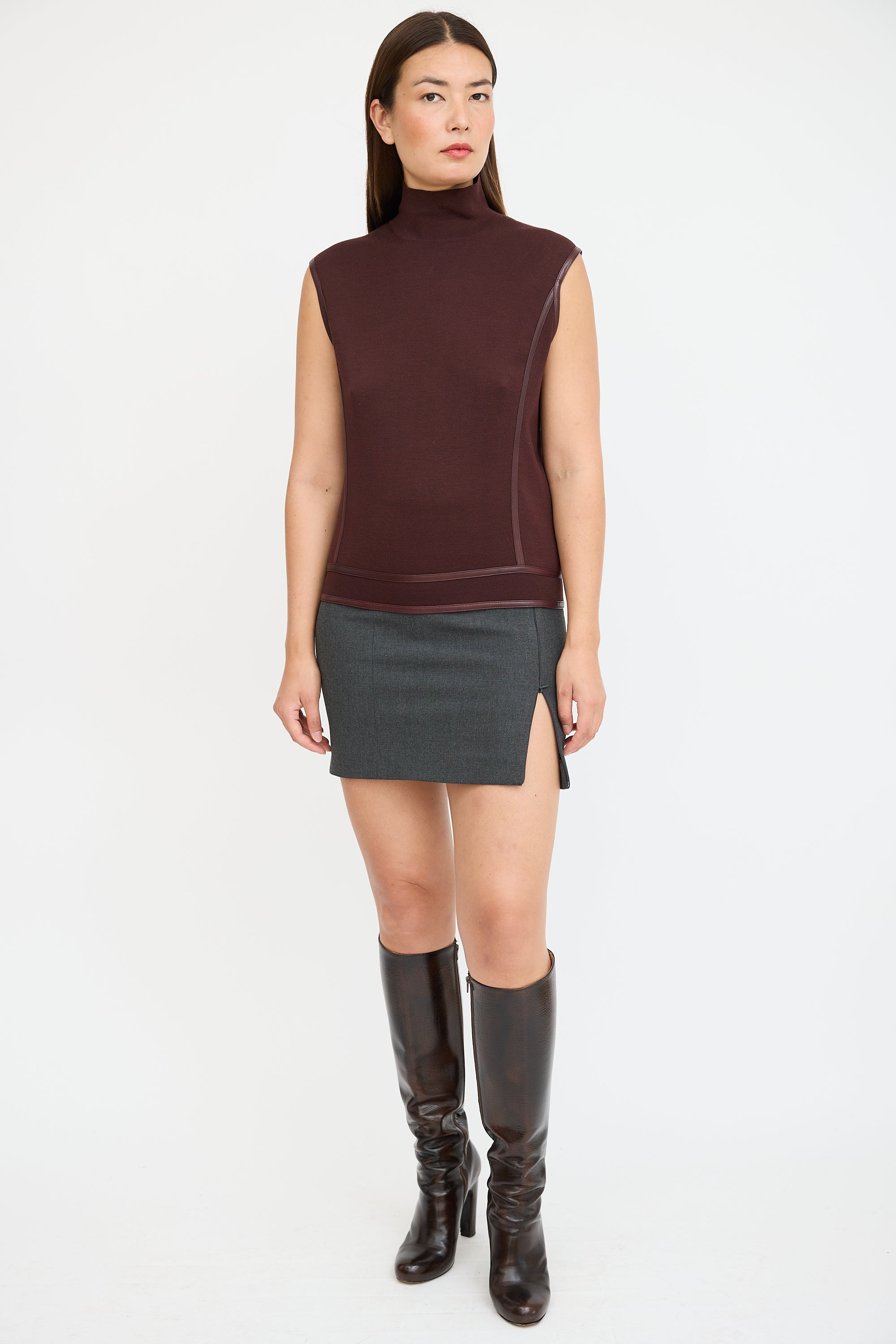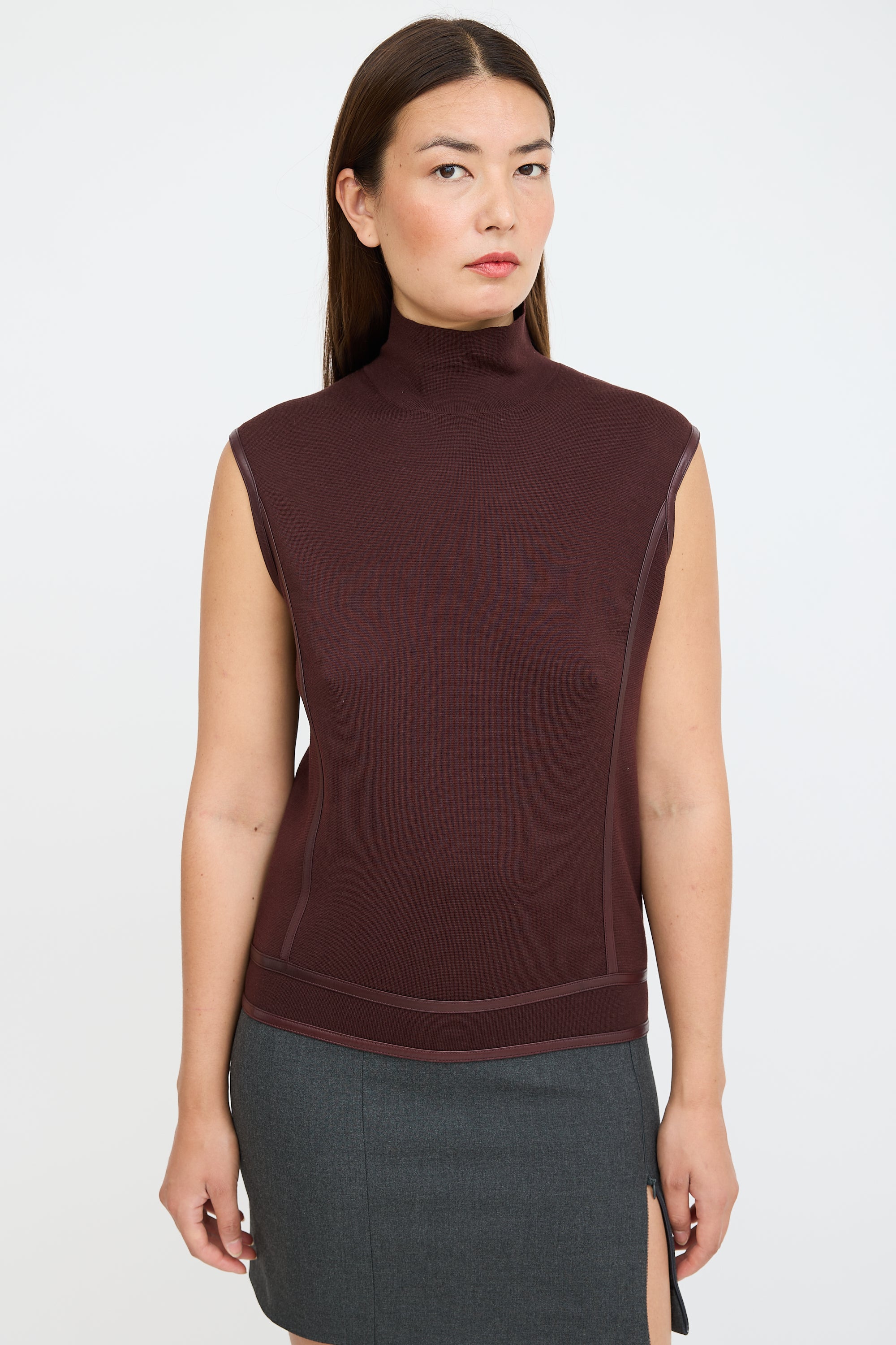 Pre-owned Gucci burgundy wool knit top featuring a mock neck collar, sleeveless styling, tonal leather trim, and zip closure at side.