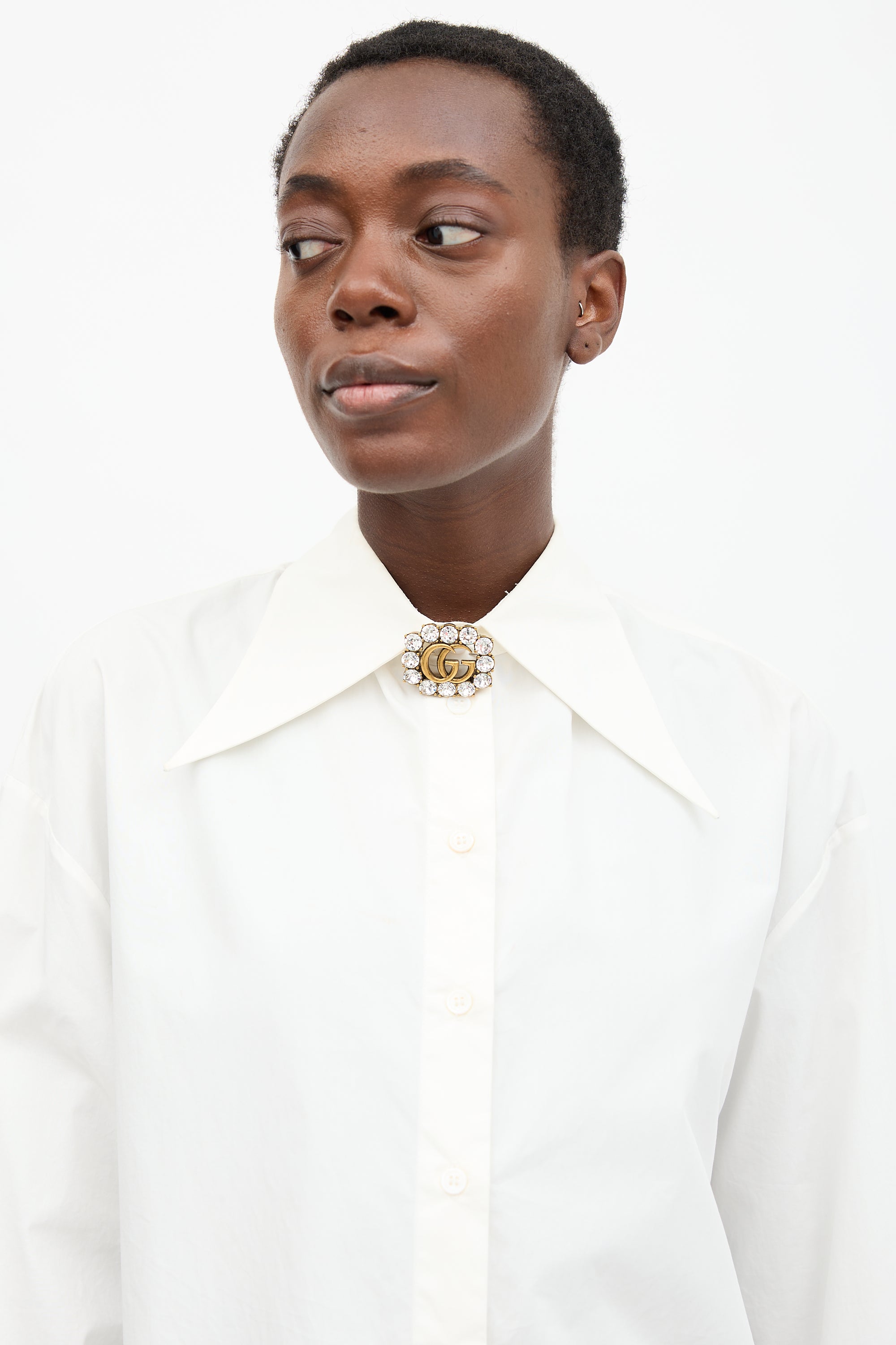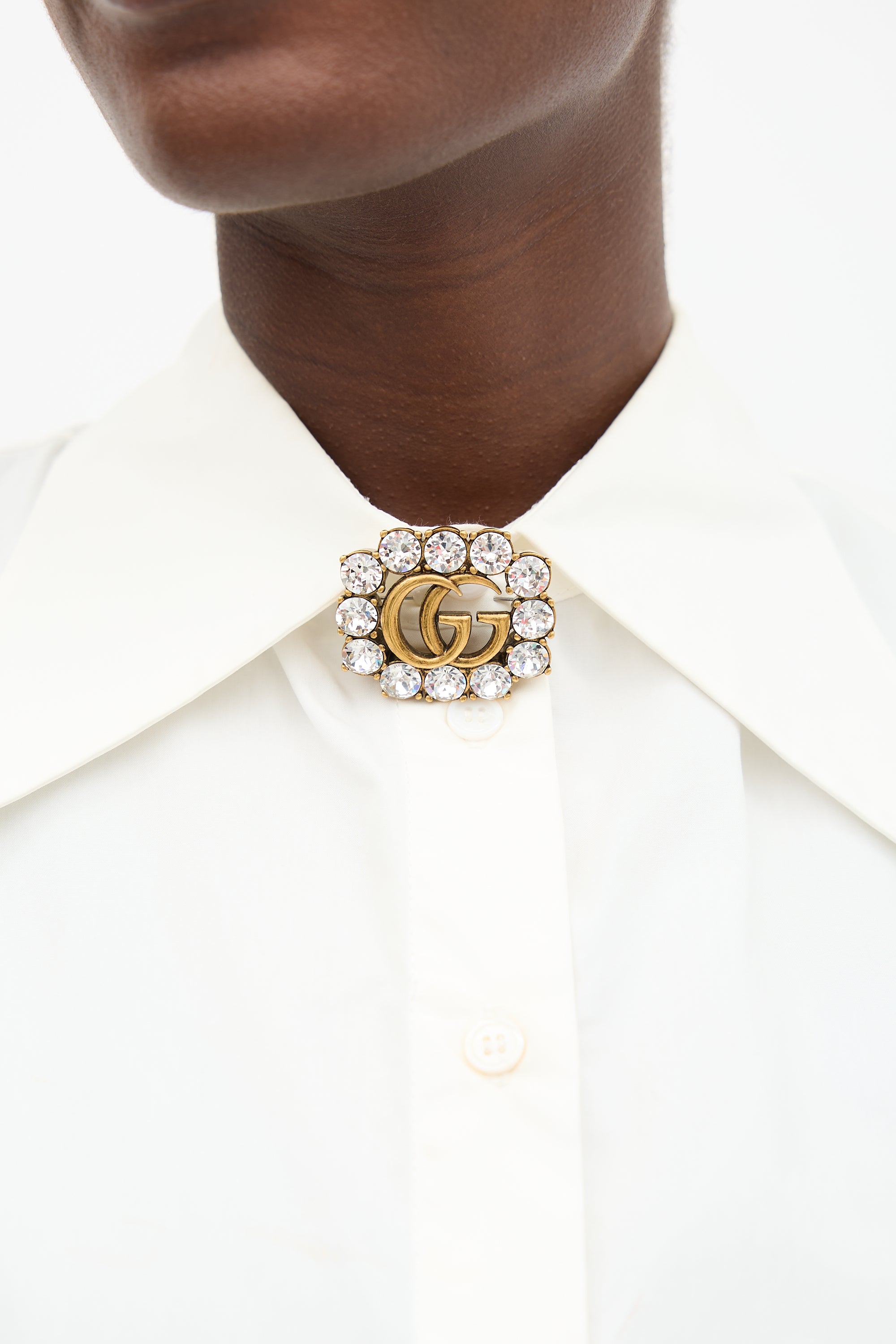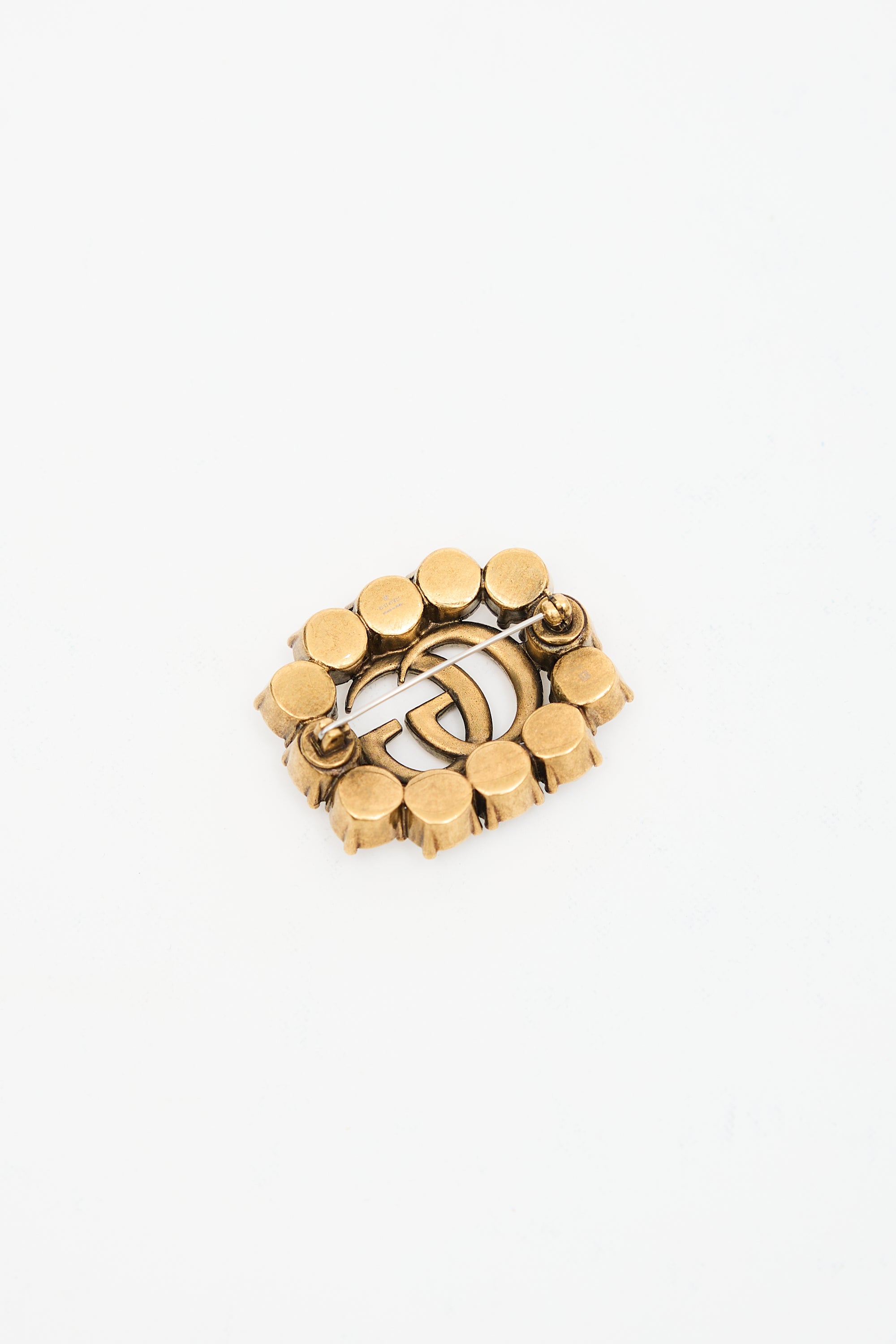 Pre-owned Gucci aged gold tone brooch featuring Marmont GG centre, twelve set crystals, printed logo at reverse, and pin fastening. Comes with original pouch.