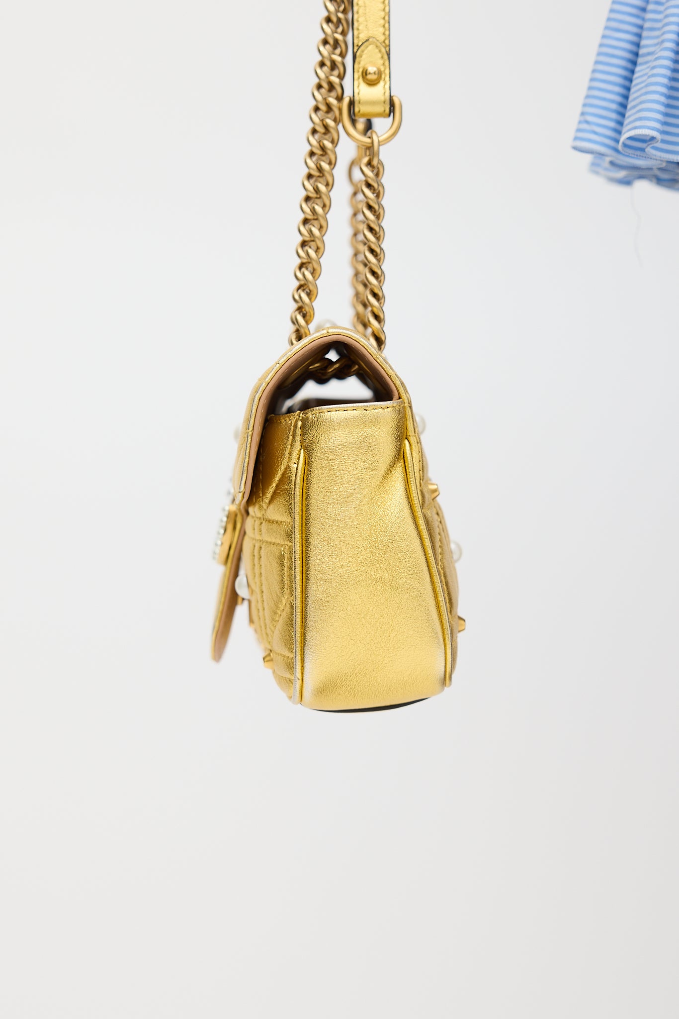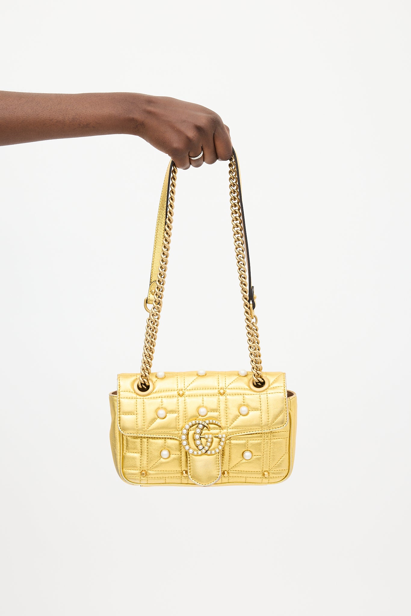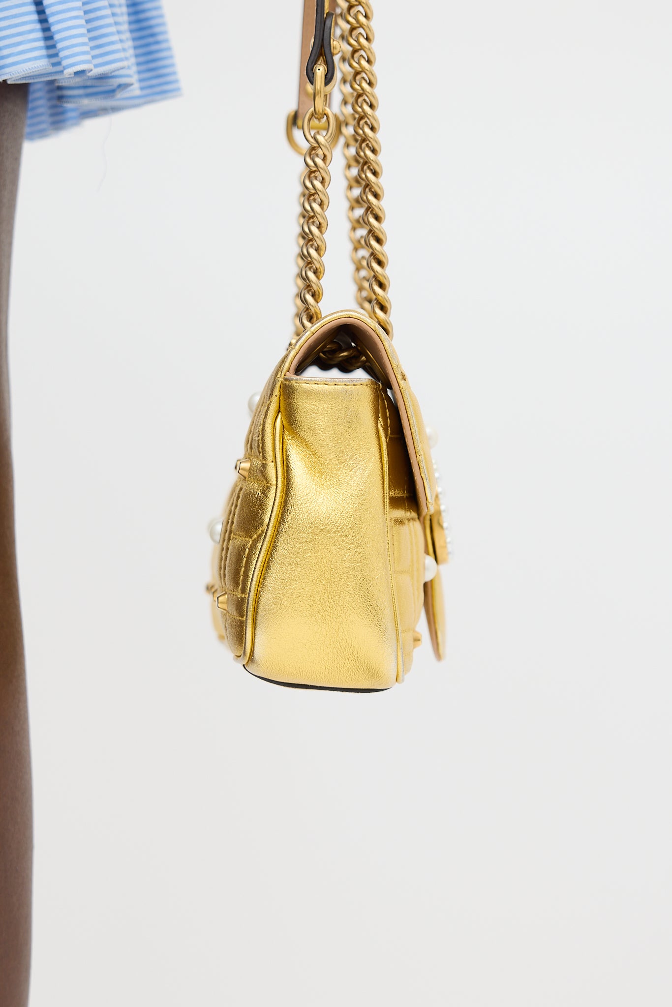 Pre-owned Gucci gold Marmont leather bag featuring a top flap, quilted stitching, faux pearl embellishment, one main compartment with one slip pocket, chain link shoulder strap, and gold tone GG push lock closure.