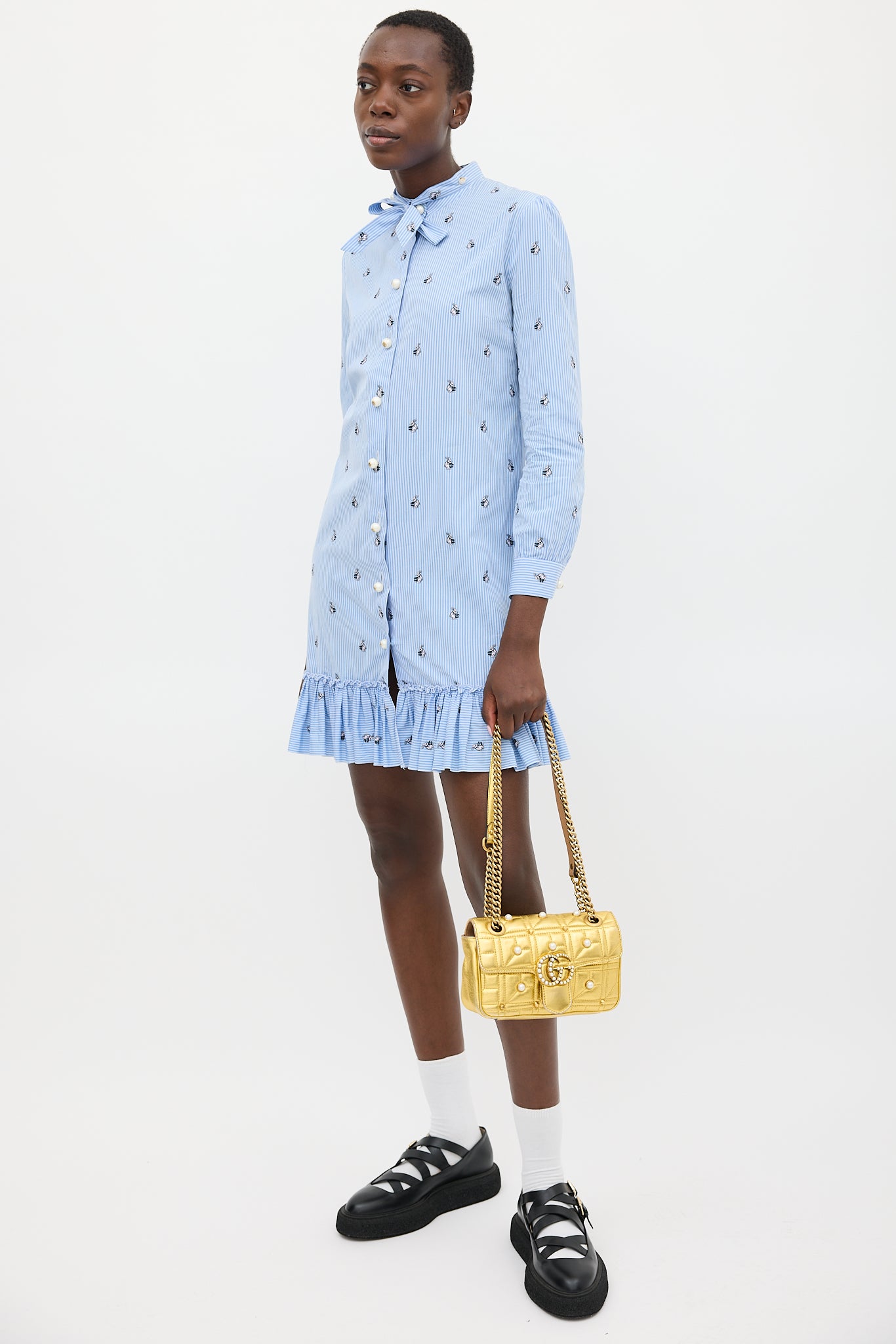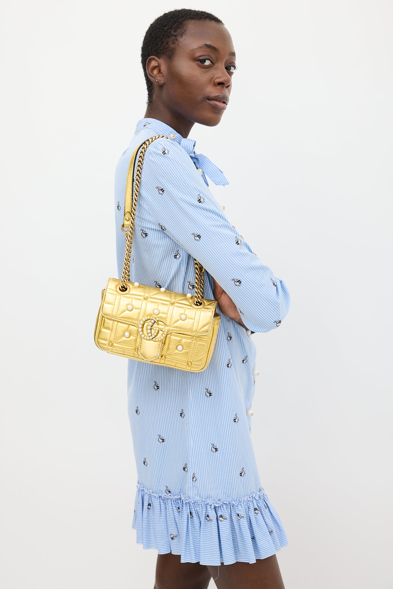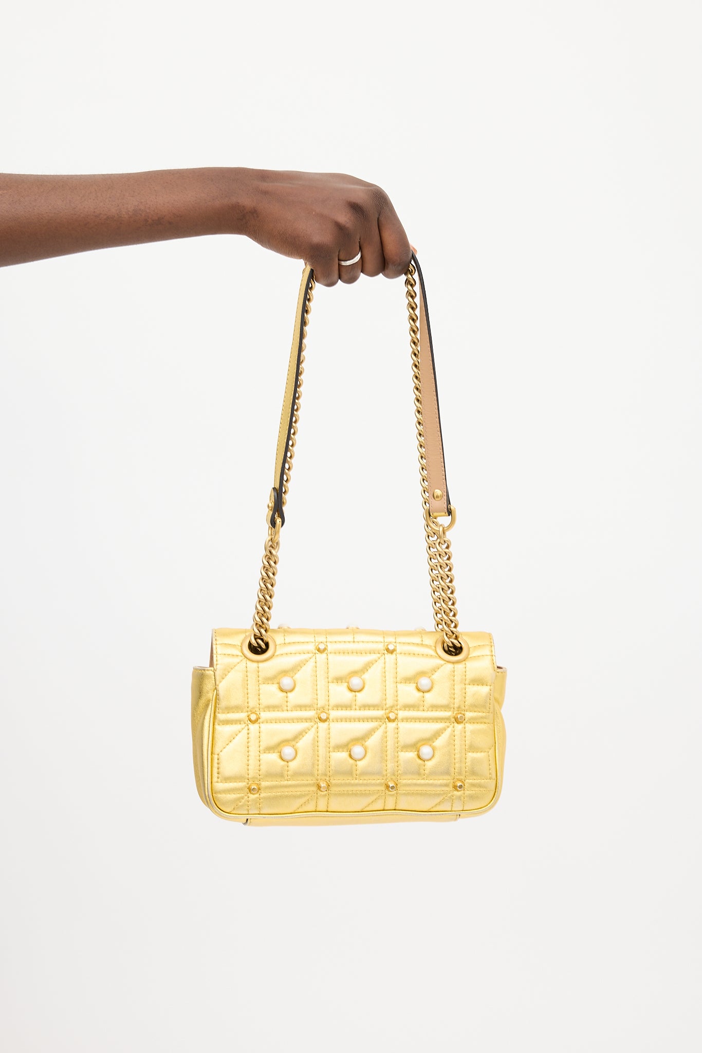 Pre-owned Gucci gold Marmont leather bag featuring a top flap, quilted stitching, faux pearl embellishment, one main compartment with one slip pocket, chain link shoulder strap, and gold tone GG push lock closure.