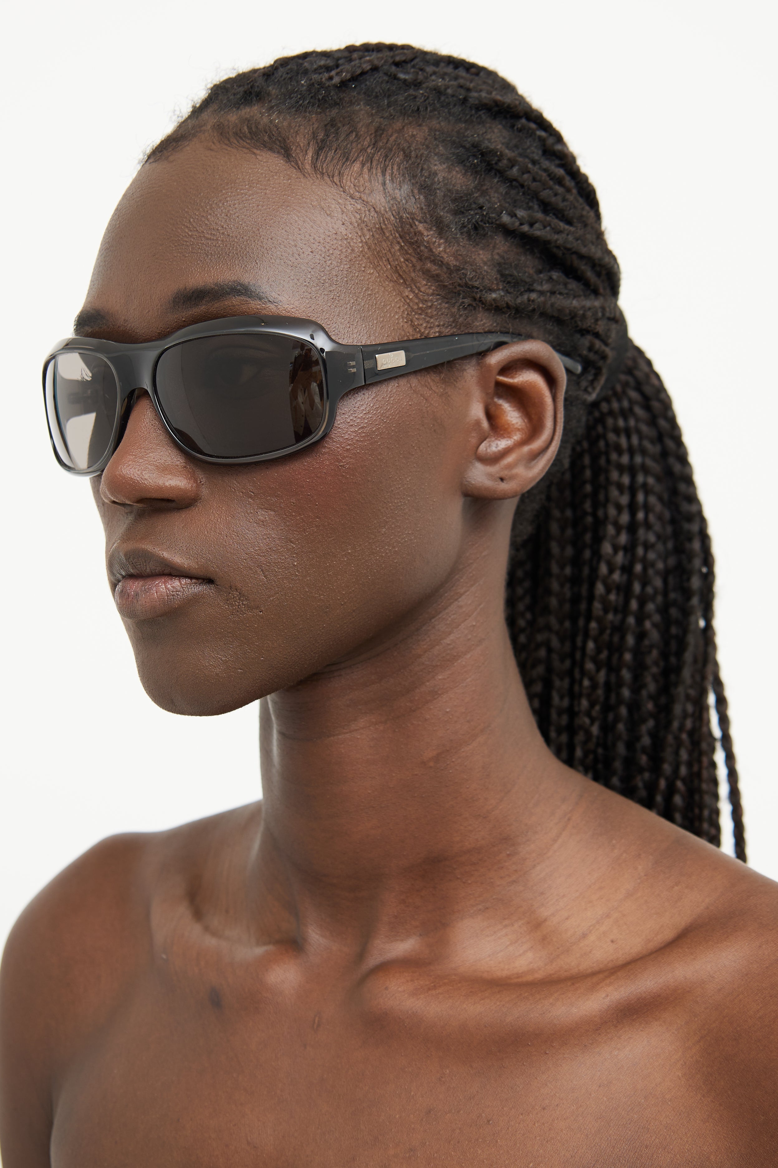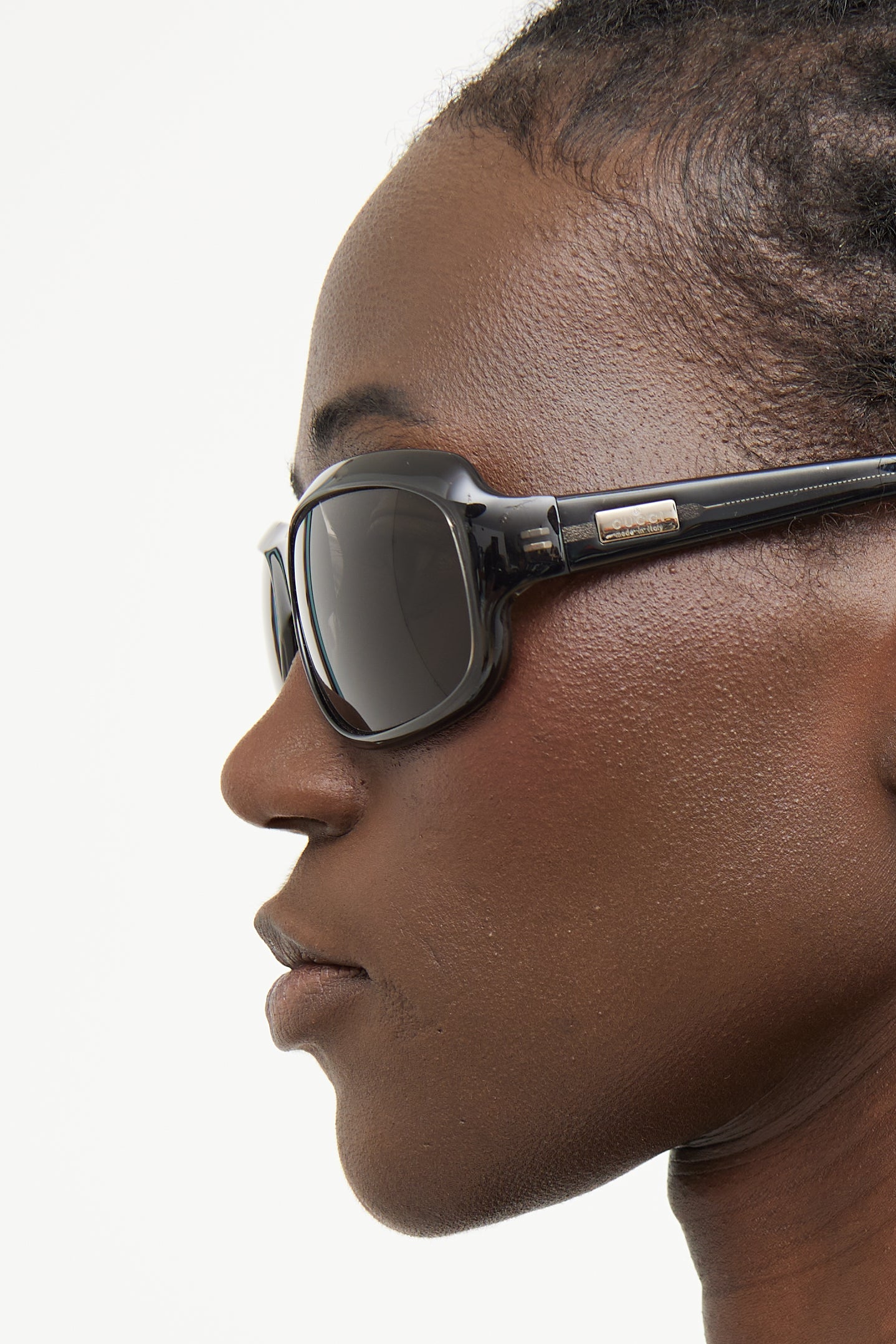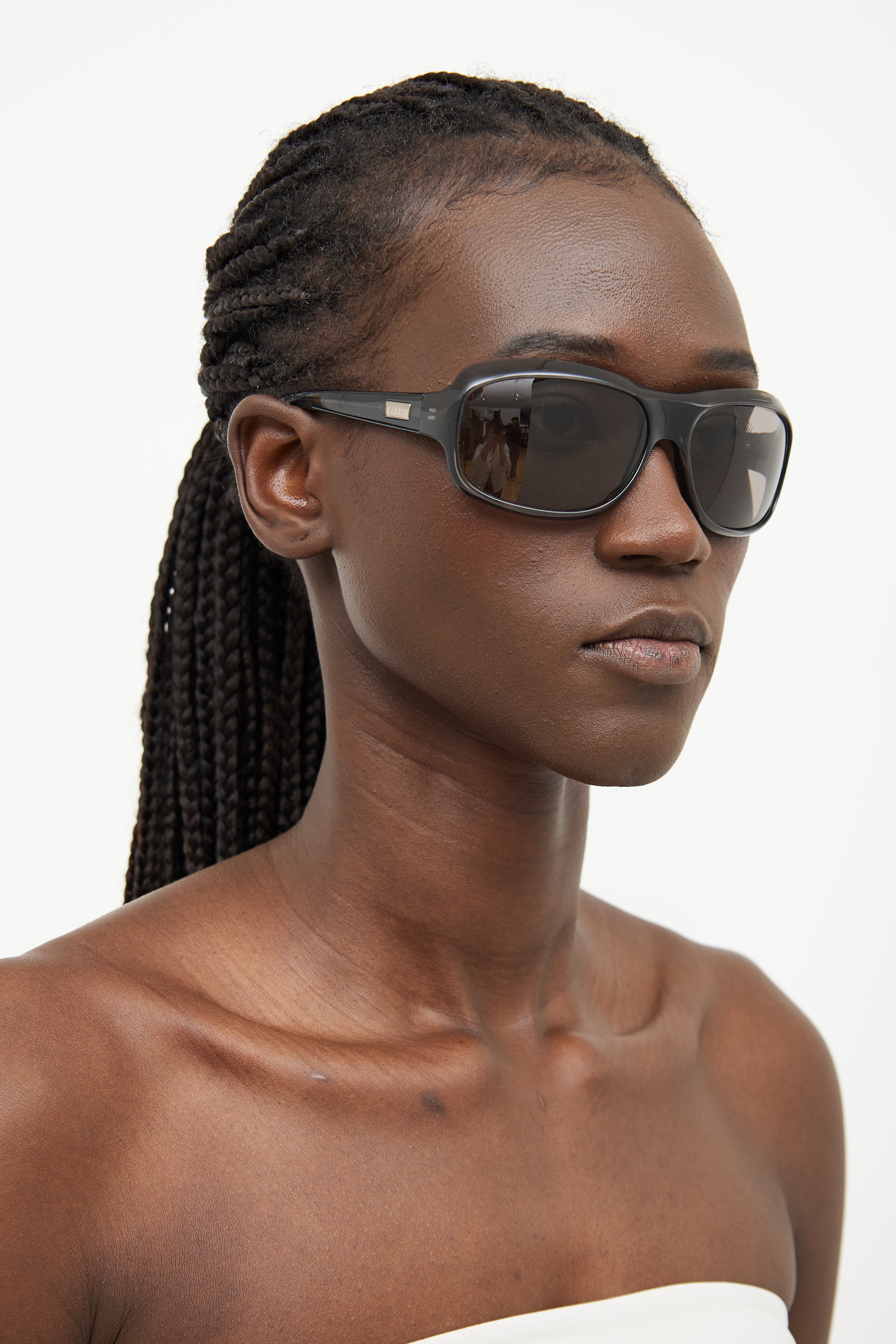 Pre-owned Gucci grey GG 1449/S sunglasses featuring rectangle grey tinted lenses, grey rims, silver tone hardware, and grey arms with logo stamped plaque on each side.