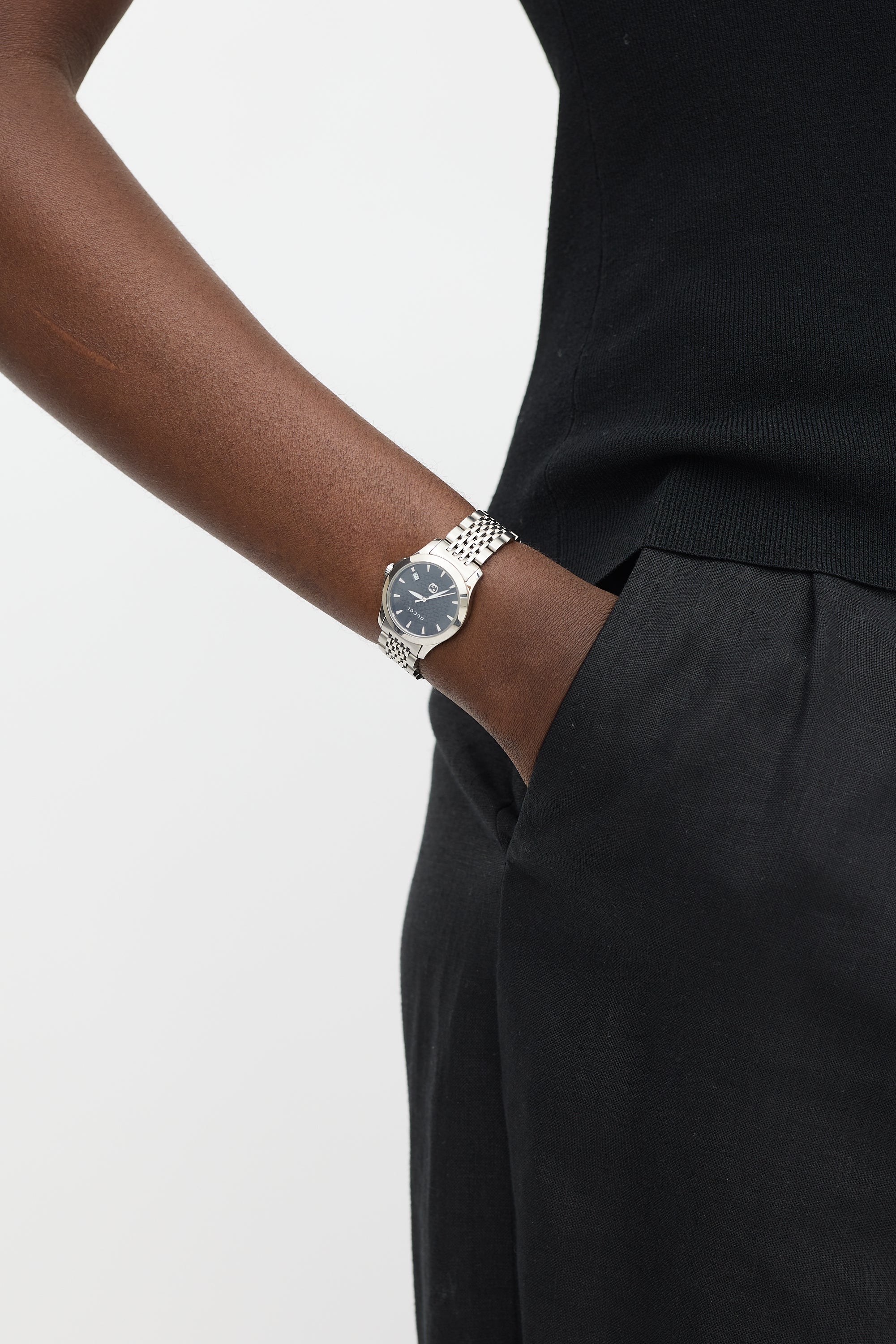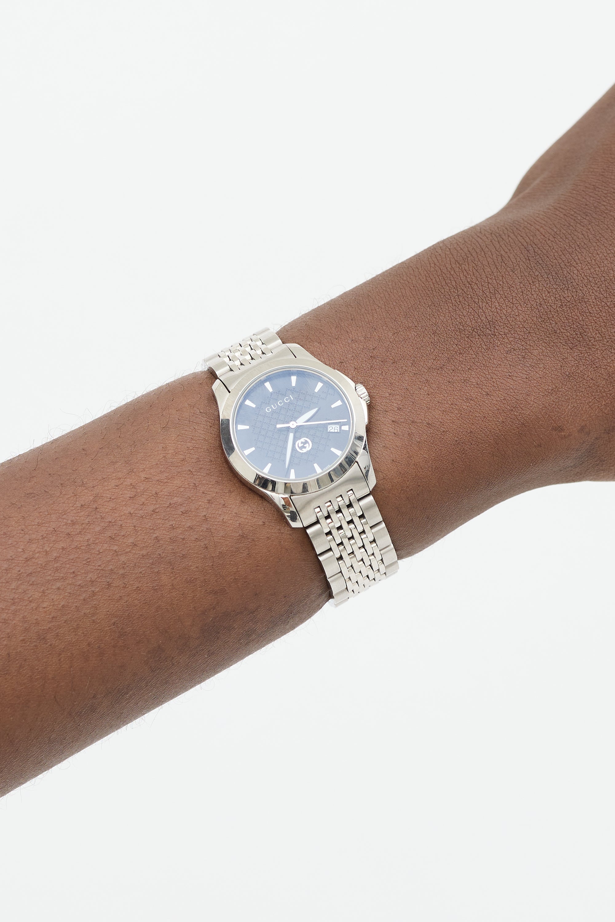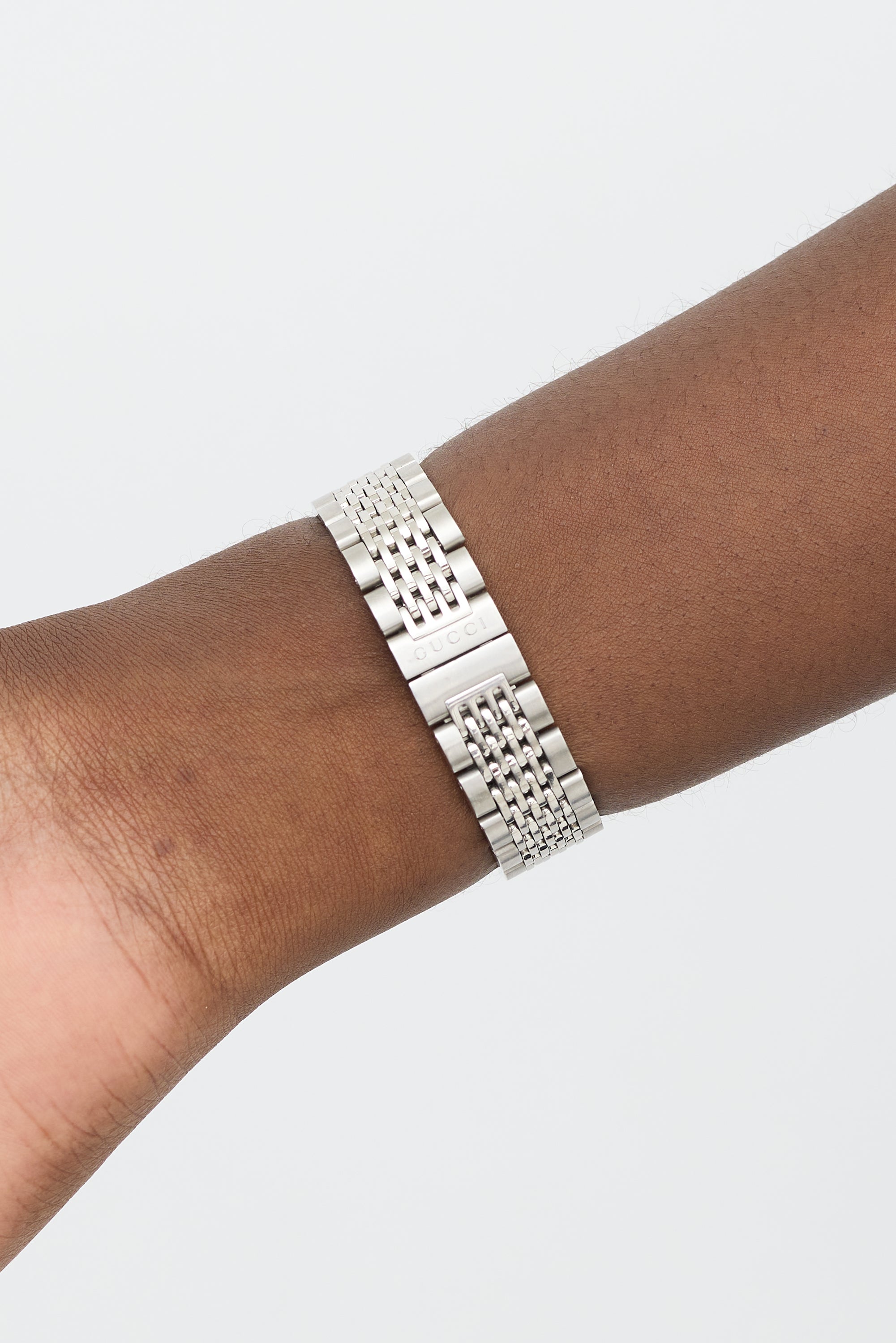 Pre-owned Gucci silver tone stainless steel G-Timeless watch featuring 9 link steel band, circular face, and dual fastening with etched logo. Comes with original box
