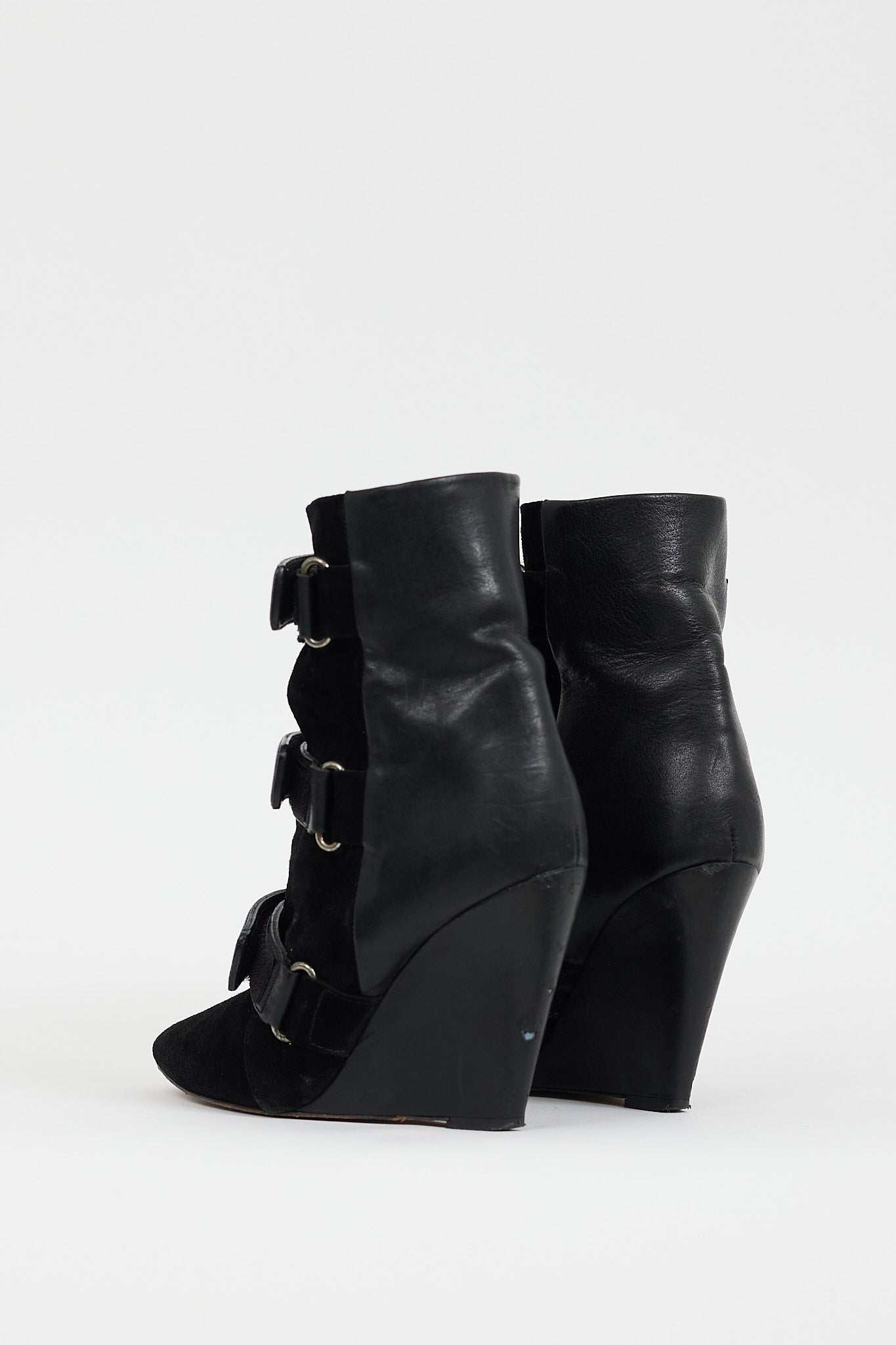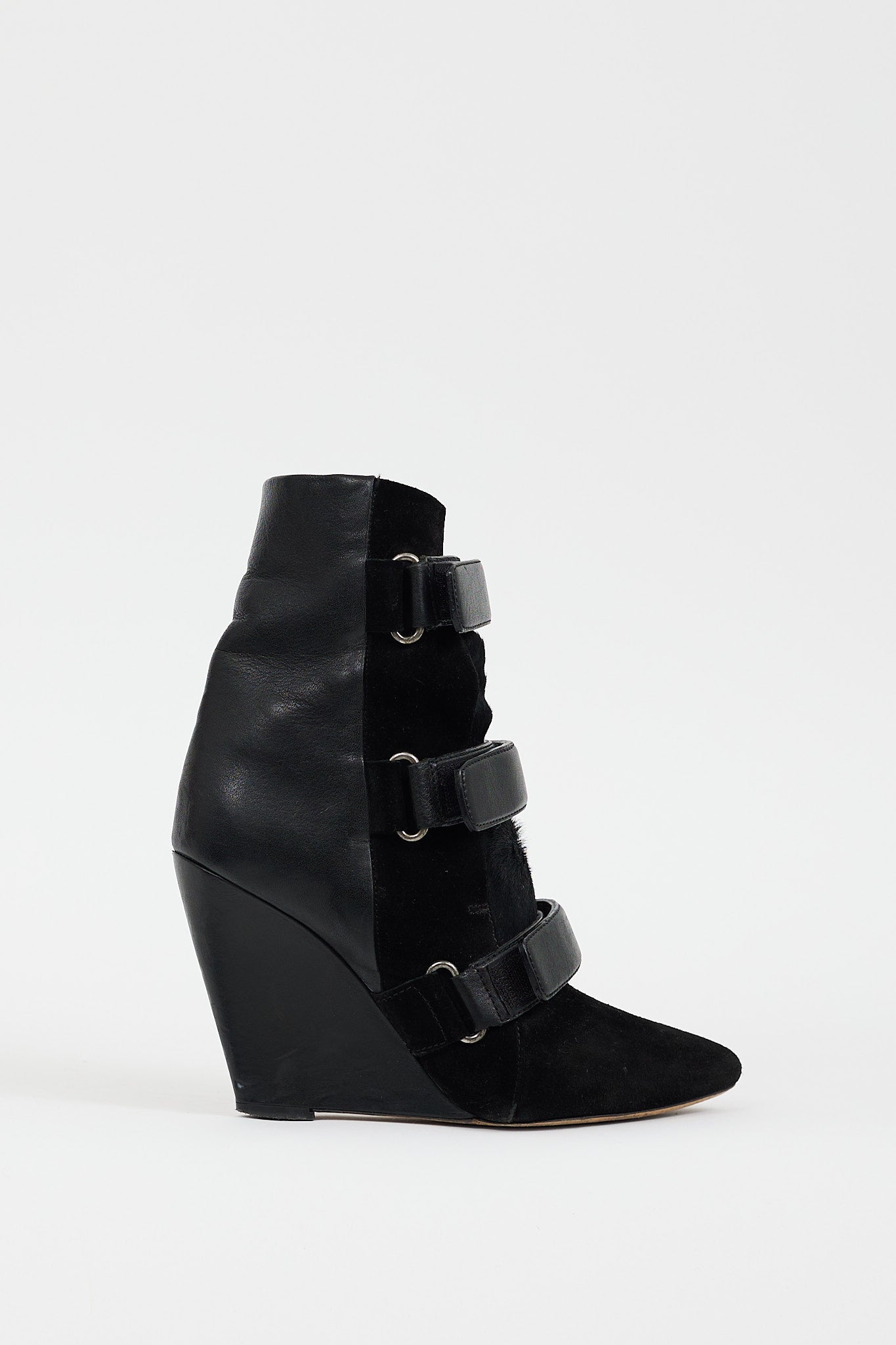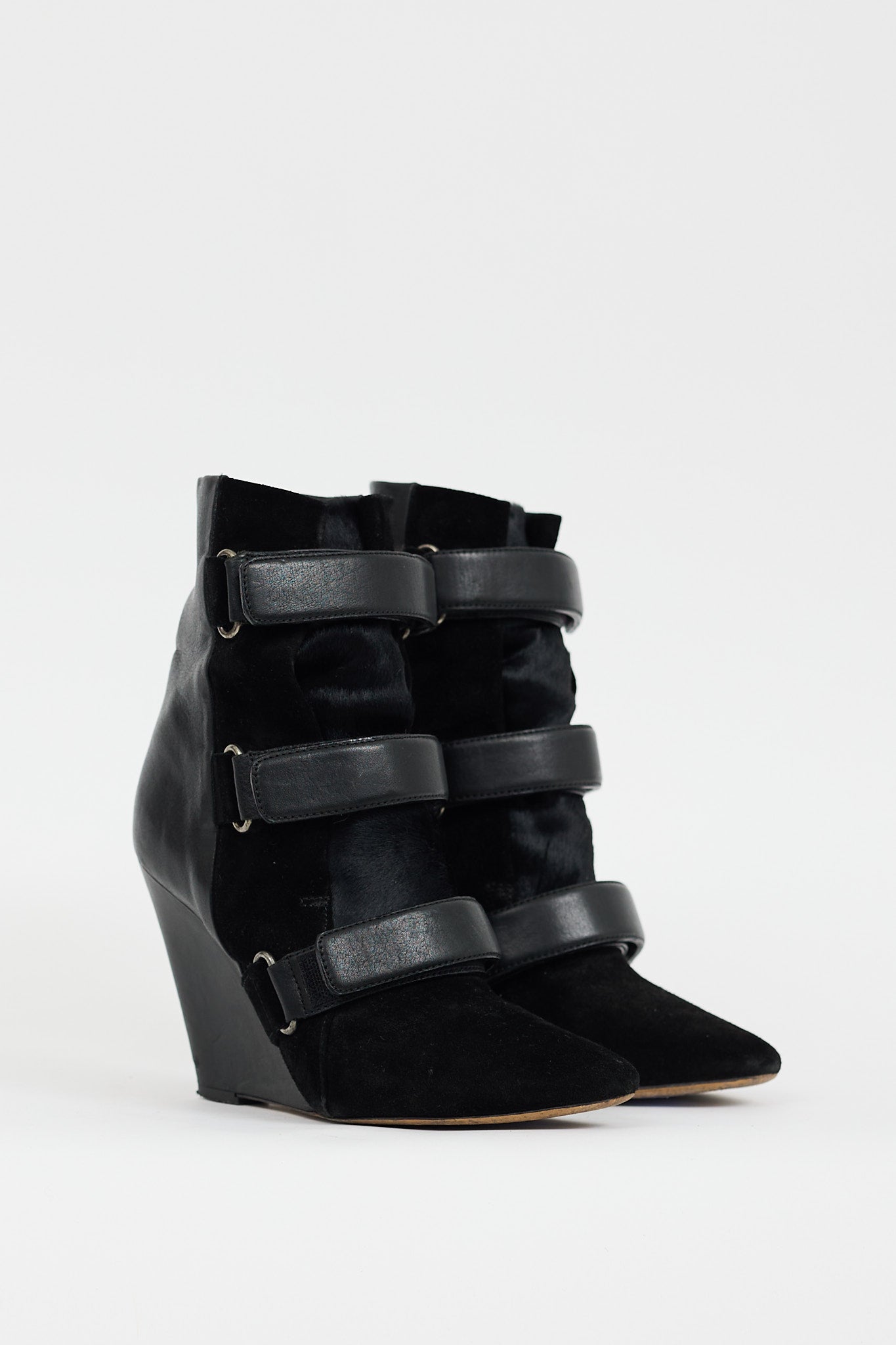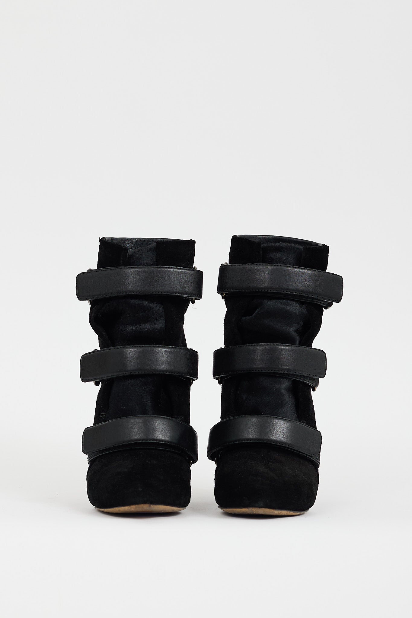 Pre-owned Isabel Marant black Scarlet boots featuring an almond toe, leather, suede, and hair upper, three Velcro straps along front shaft, and covered wedge heel.