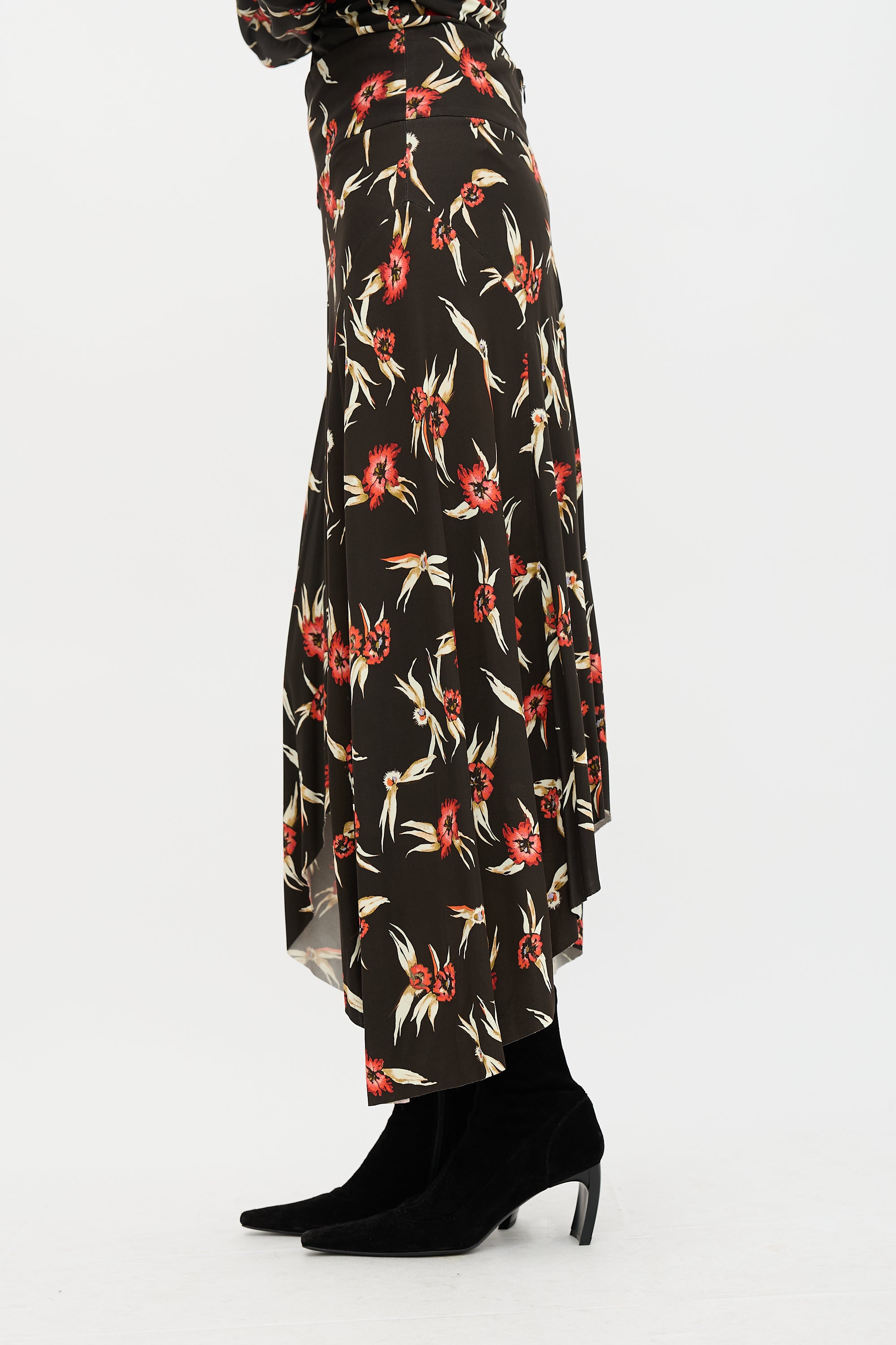 Pre-owned Isabel Marant black midi skirt featuring a multicolour floral print, concealed back zip, and raw asymmetrical hem.