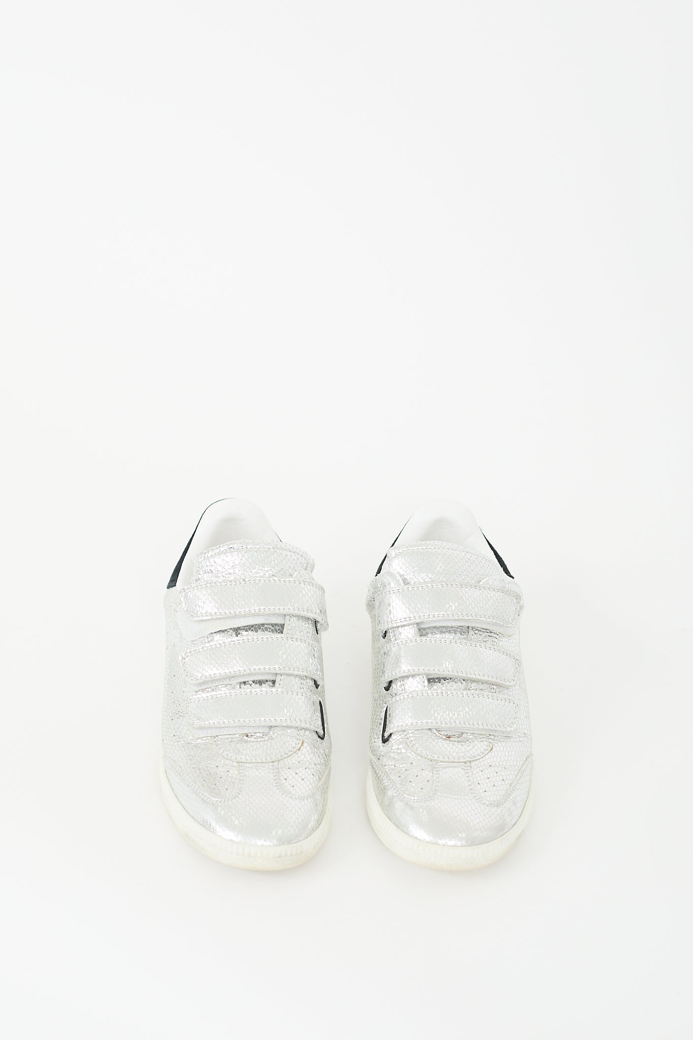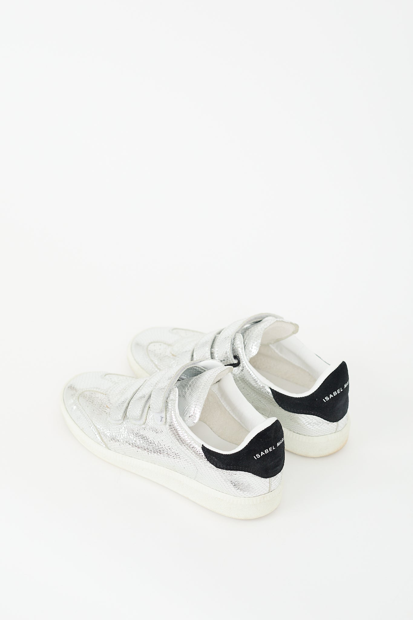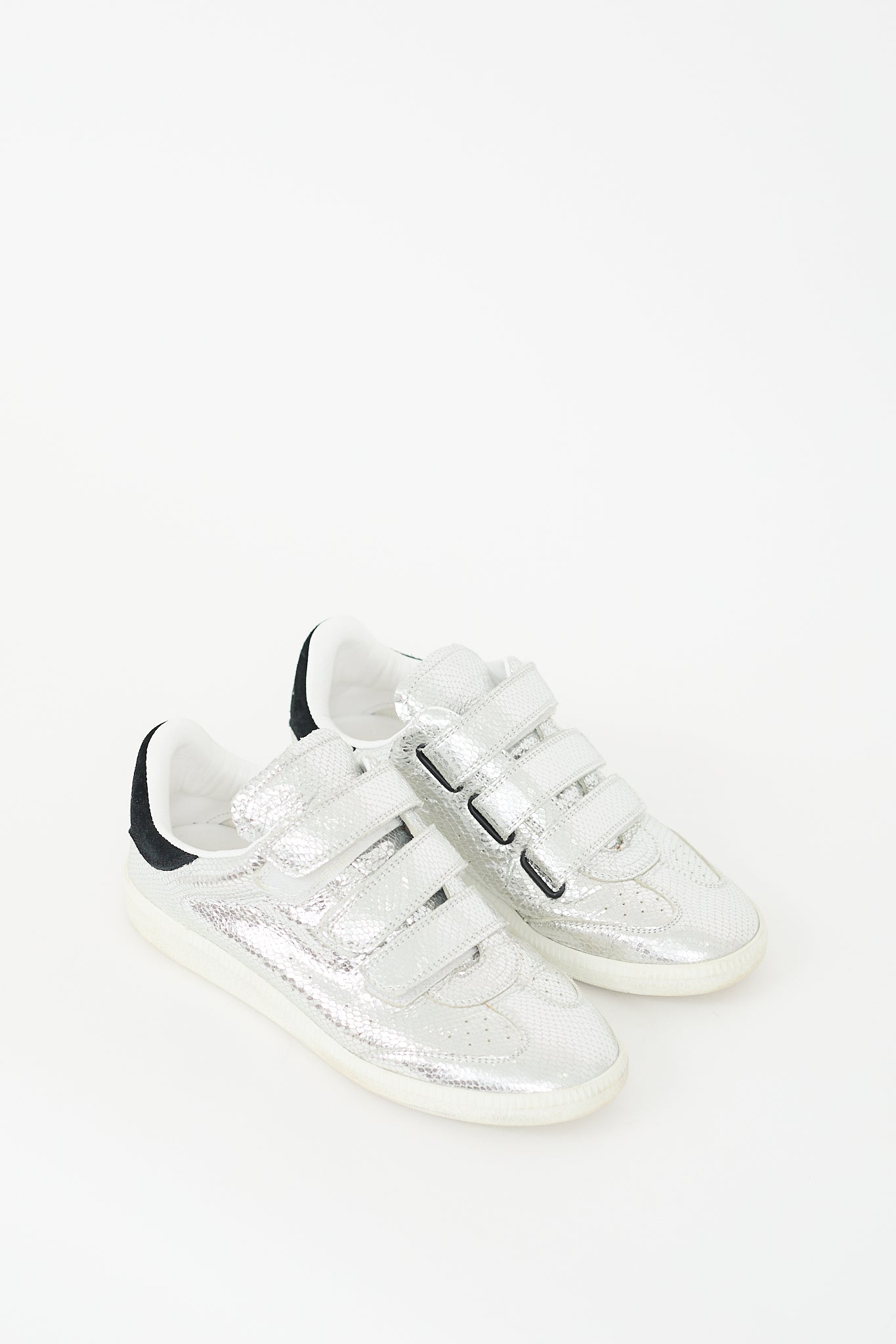 Pre-owned Isabel Marant silver leather Beth sneakers featuring rounded toe, snakeskin effect leather upper, three velcro straps at vamp, perforations throughout, black leather patch at counter with stamped logo, gum sole, and slip on entry.