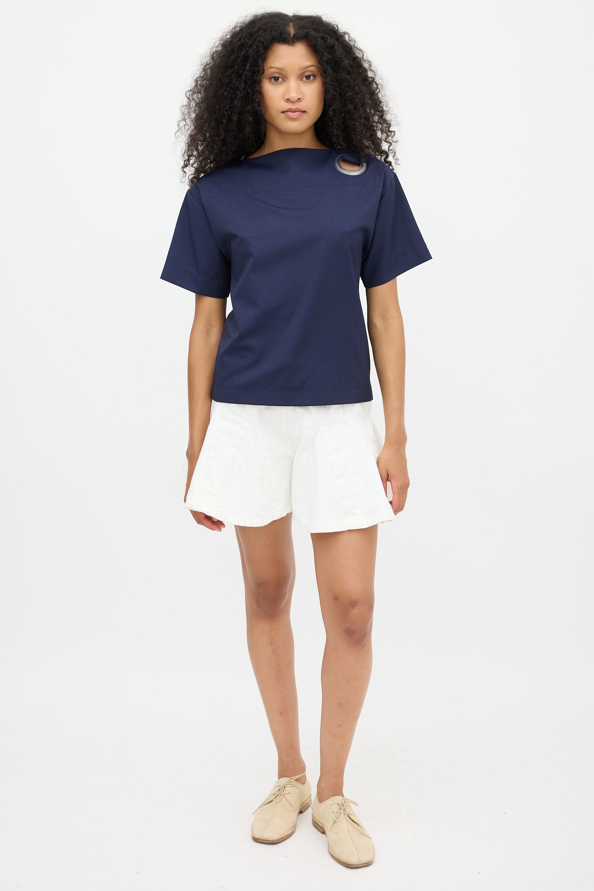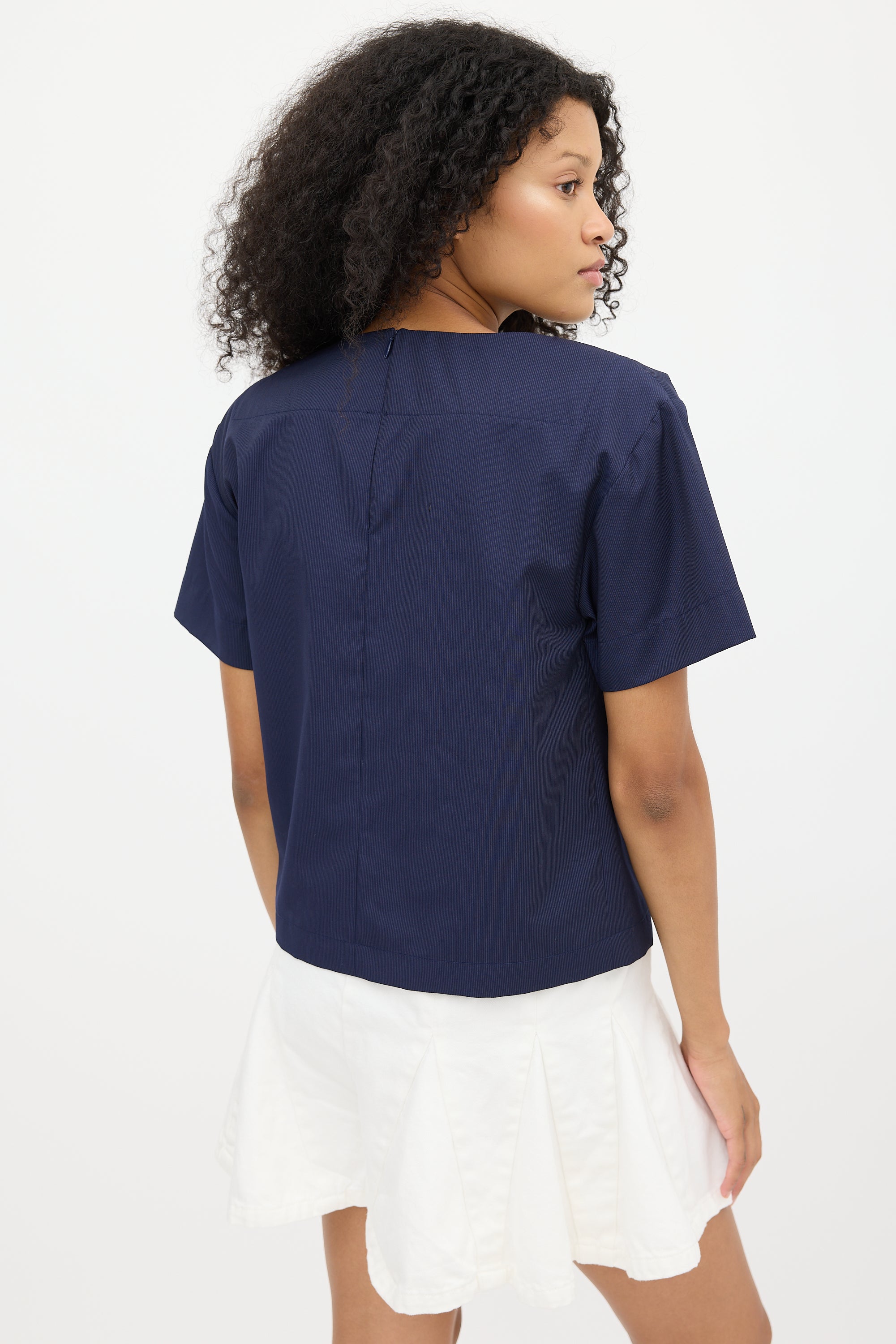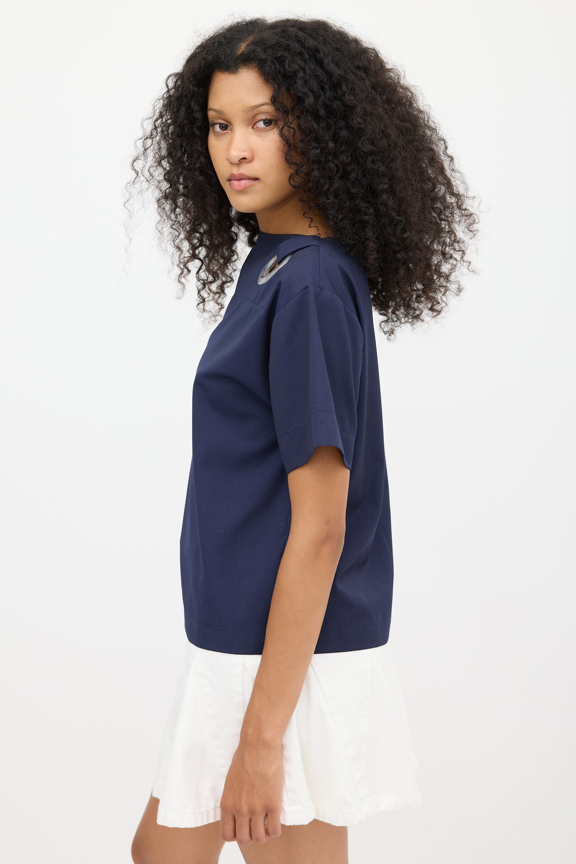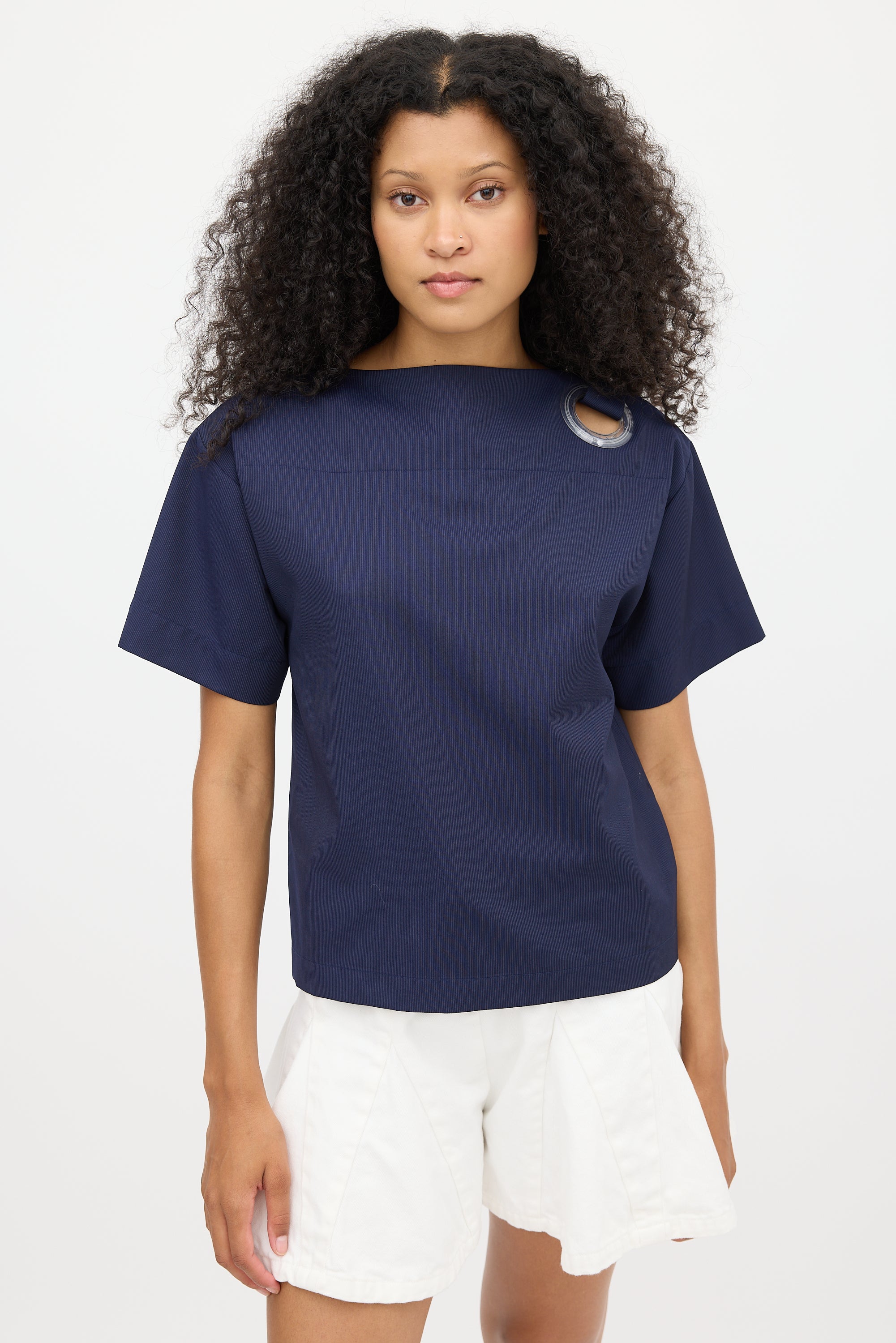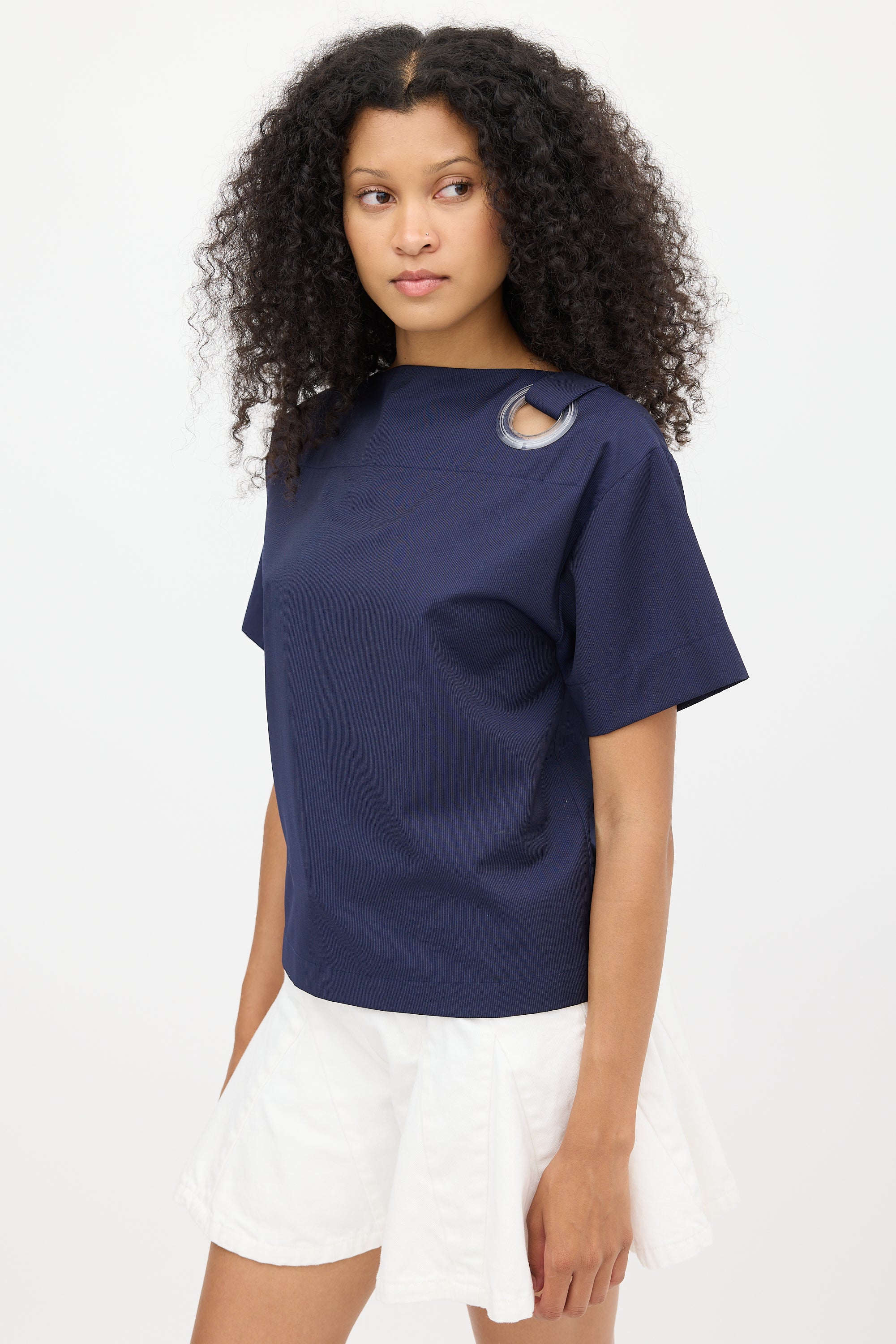Pre-owned Jacquemus blue top featuring a tonal striped pattern, bateau neckline, short sleeves, clear eyelet cut out at shoulder, and zip closure at back.