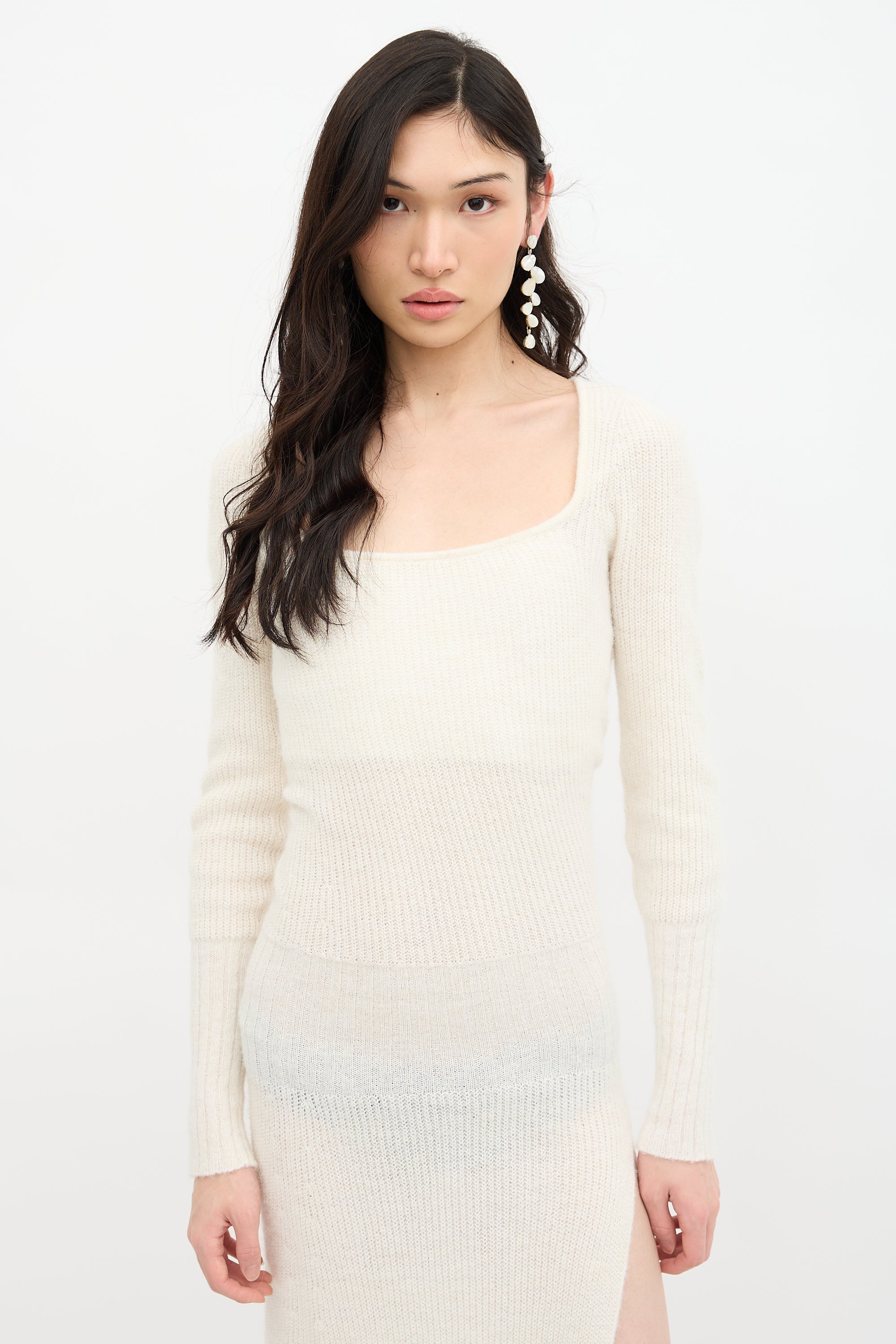 Pre-owned Jacquemus cream La Robe Dao maxi sweater dress featuring scoop neckline, high leg slit, and ribbed waist, hem, and cuffs.