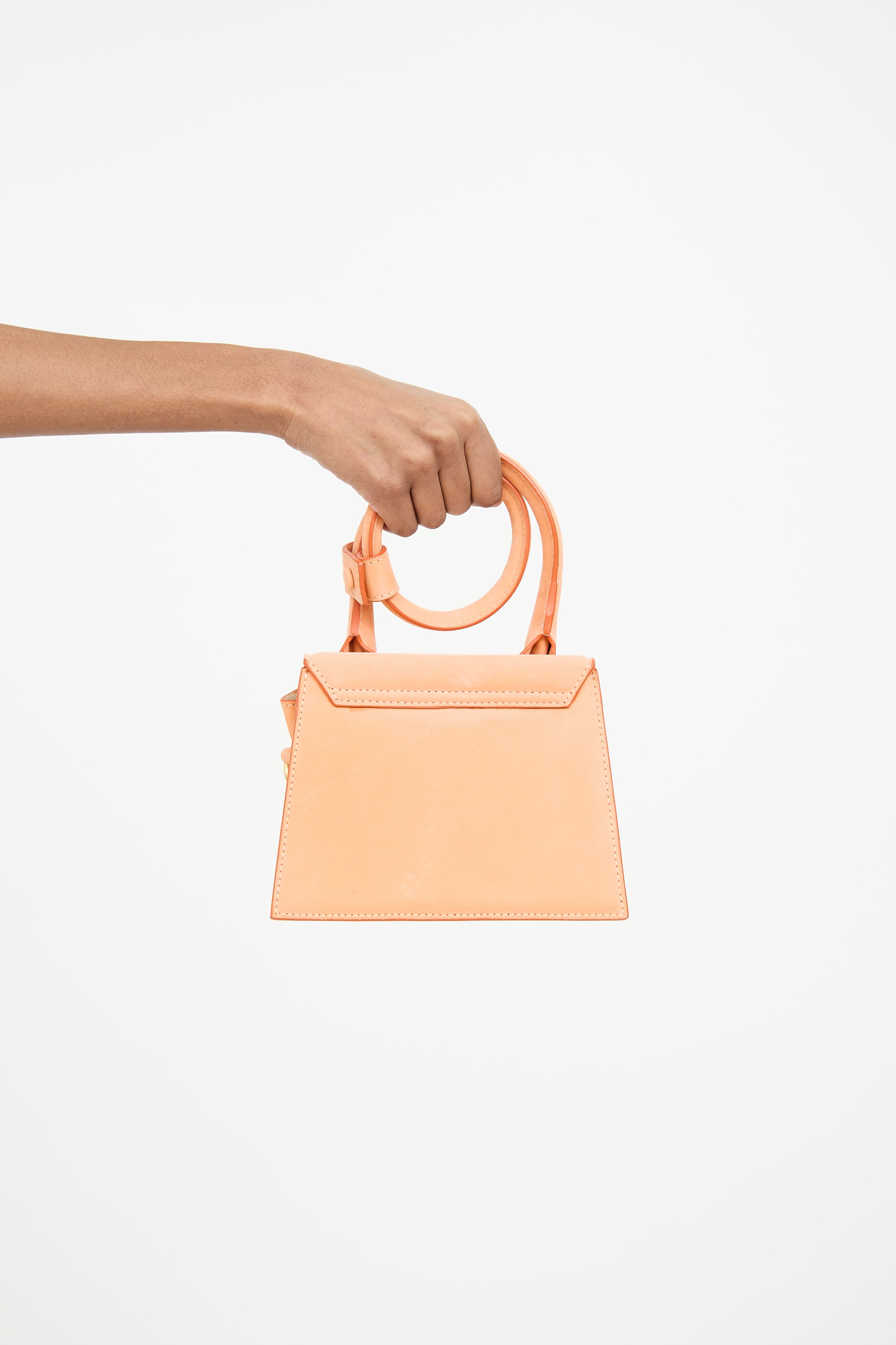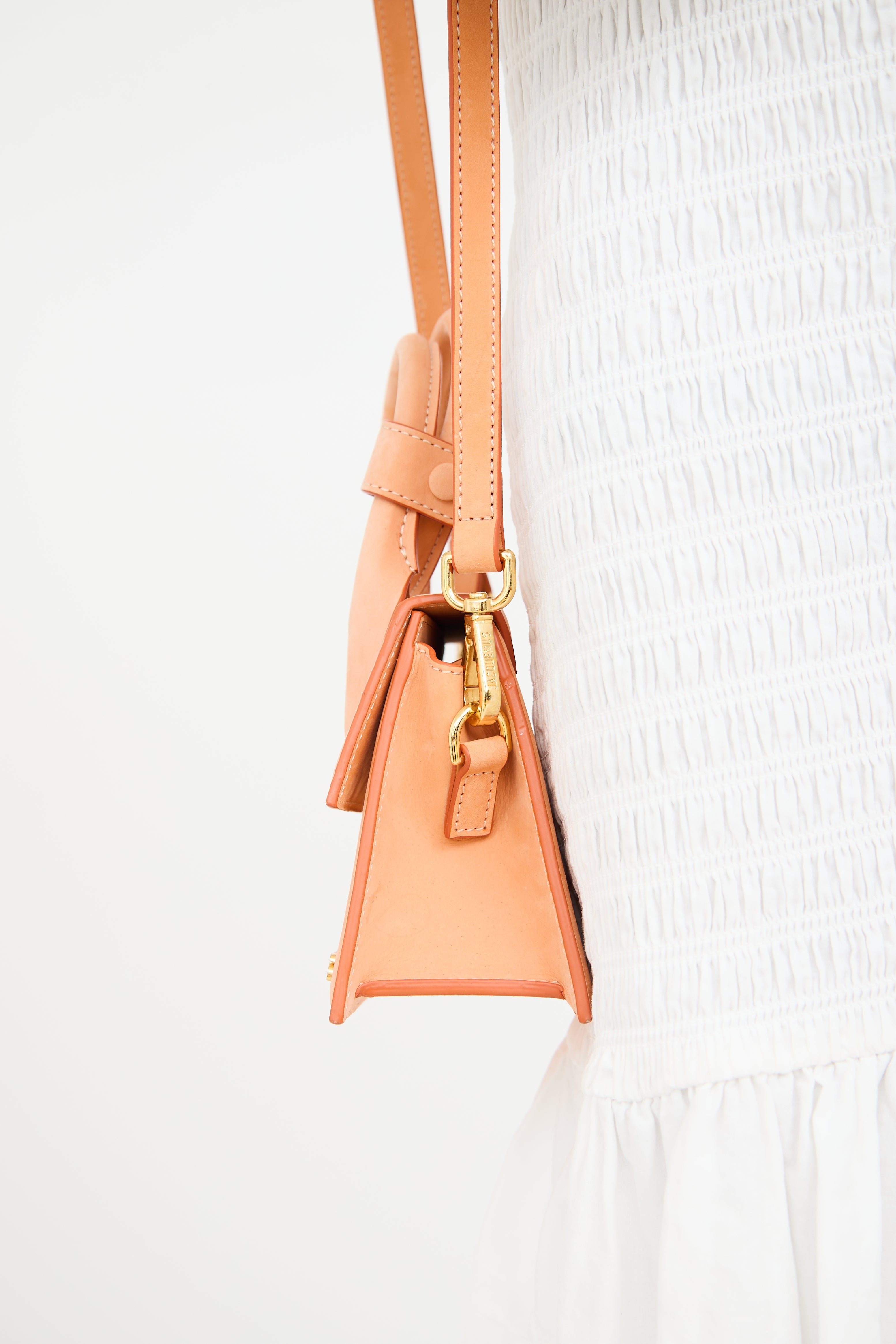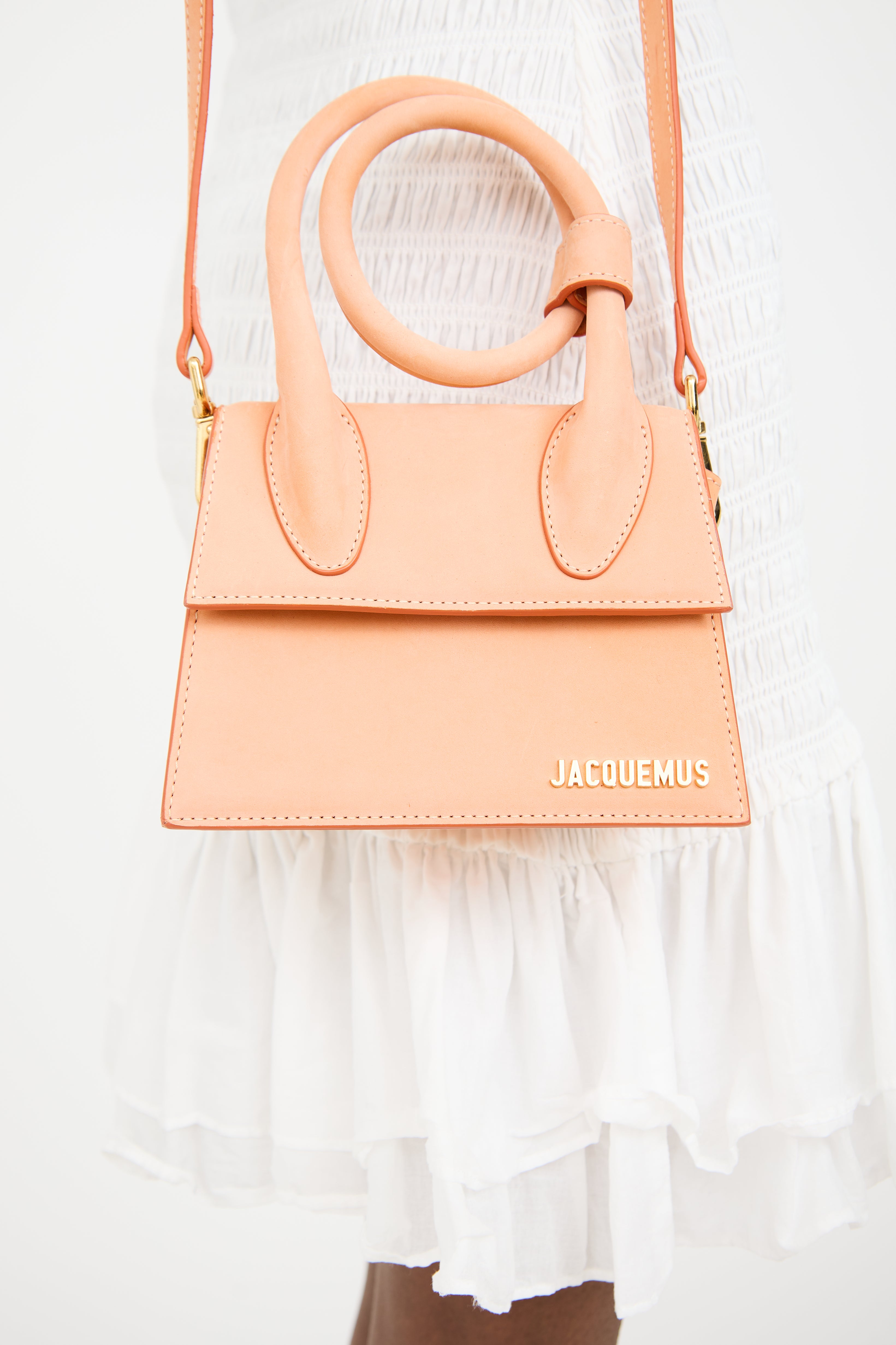 Pre-owned Jacquemus orange Chiquito Noeud bag featuring a top flap, single rolled extendable handle, one main compartment with one slip pocket, detachable shoulder strap, gold tone logo hardware at front, and magnetic snap closure.
