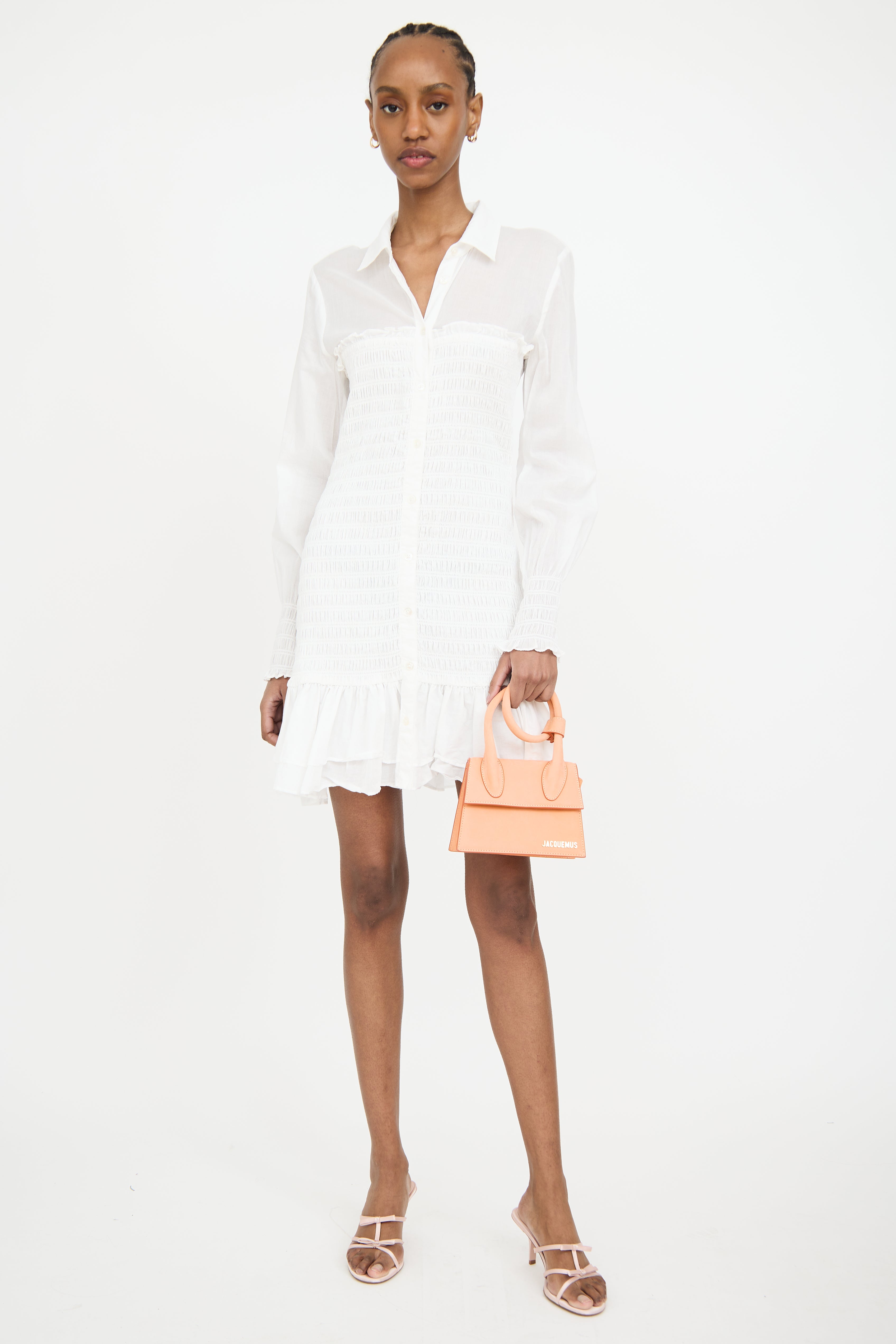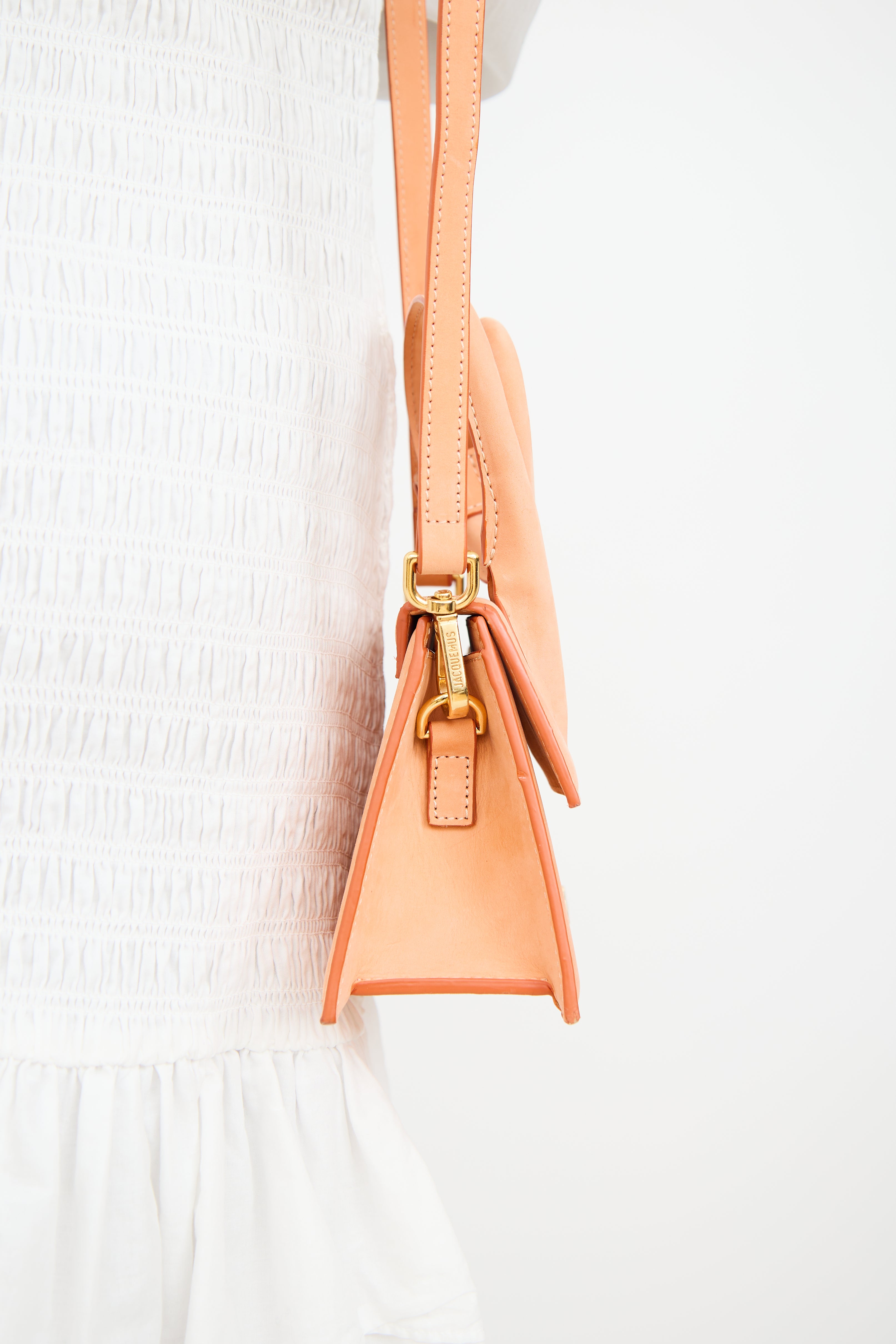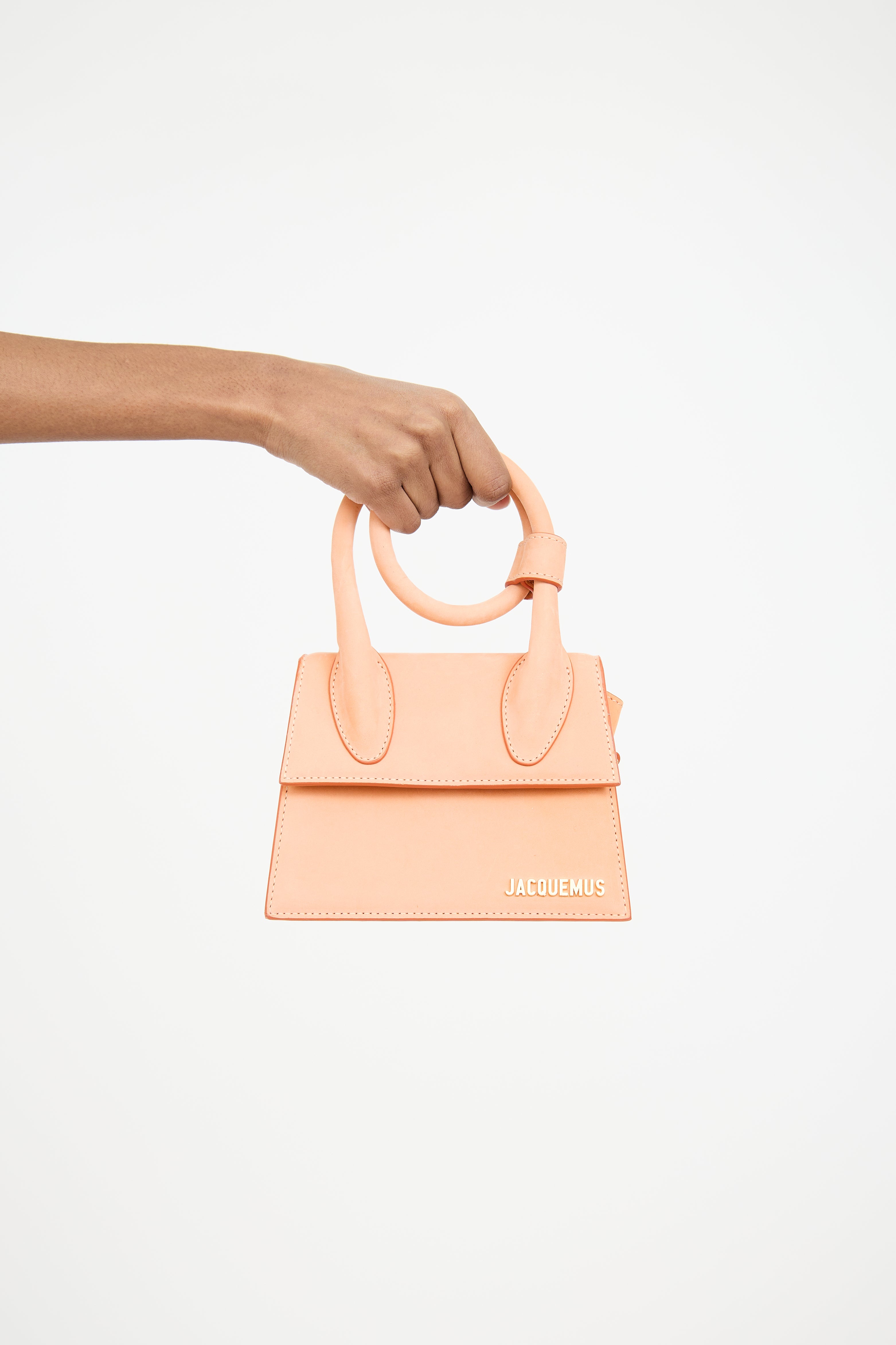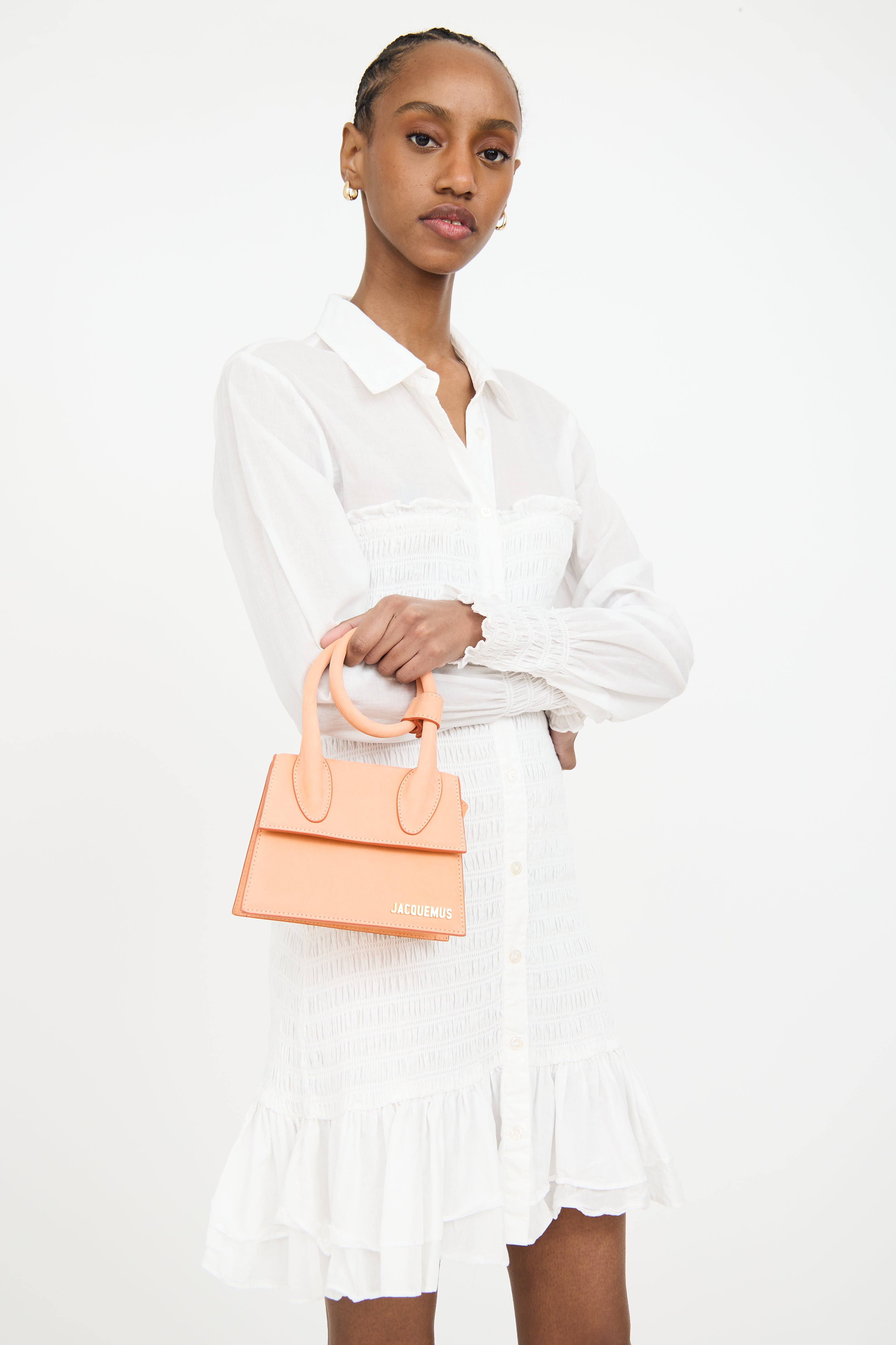 Pre-owned Jacquemus orange Chiquito Noeud bag featuring a top flap, single rolled extendable handle, one main compartment with one slip pocket, detachable shoulder strap, gold tone logo hardware at front, and magnetic snap closure.