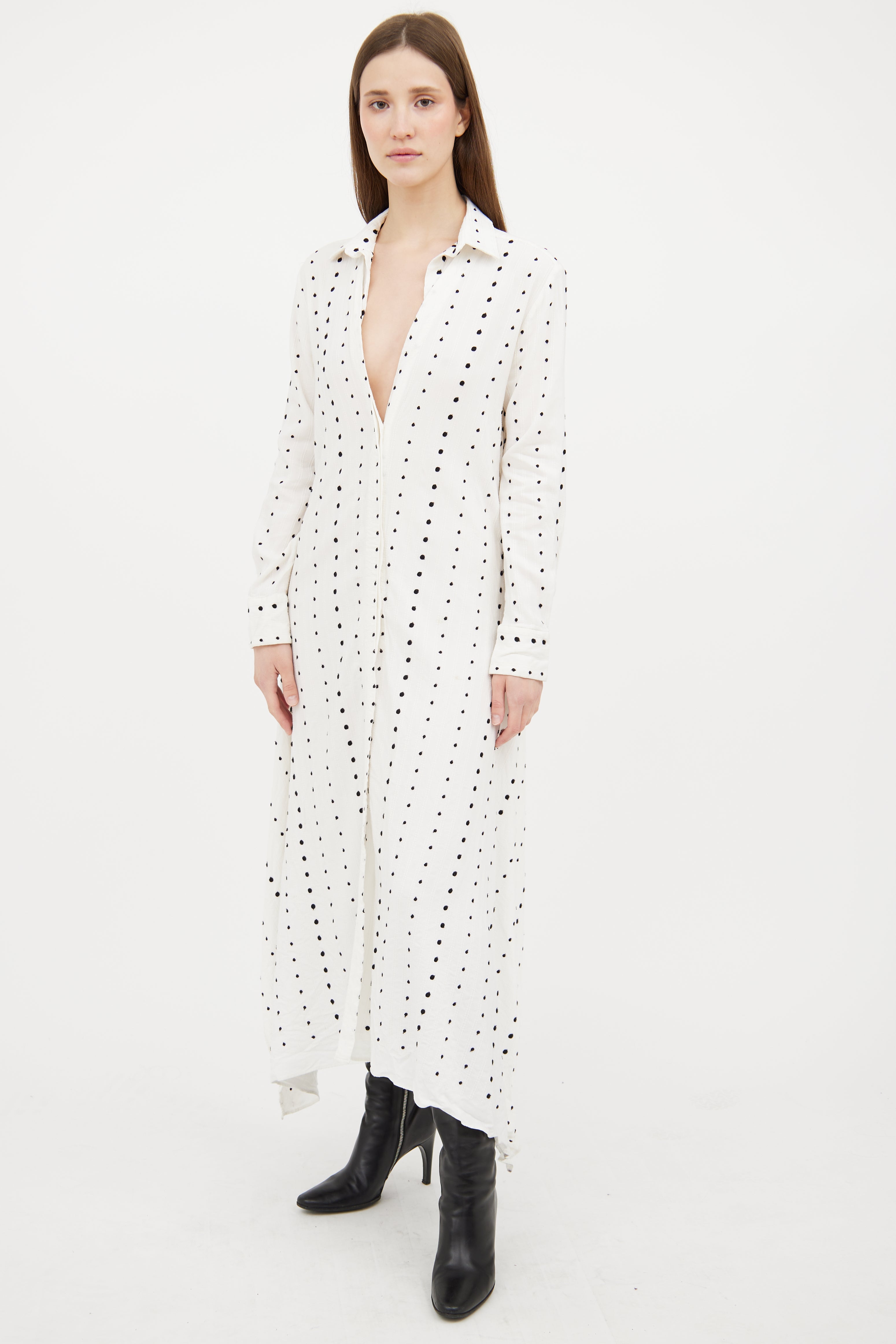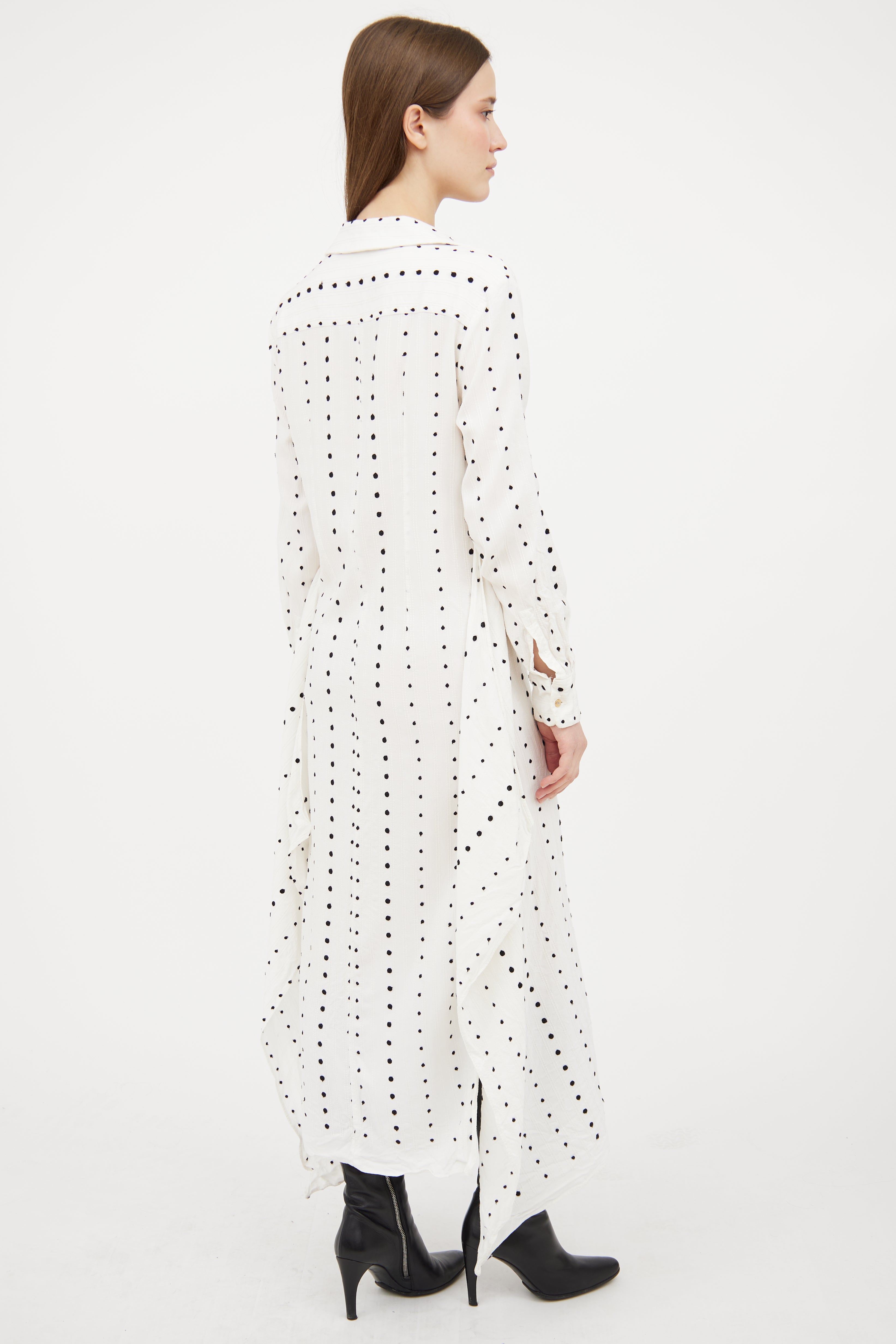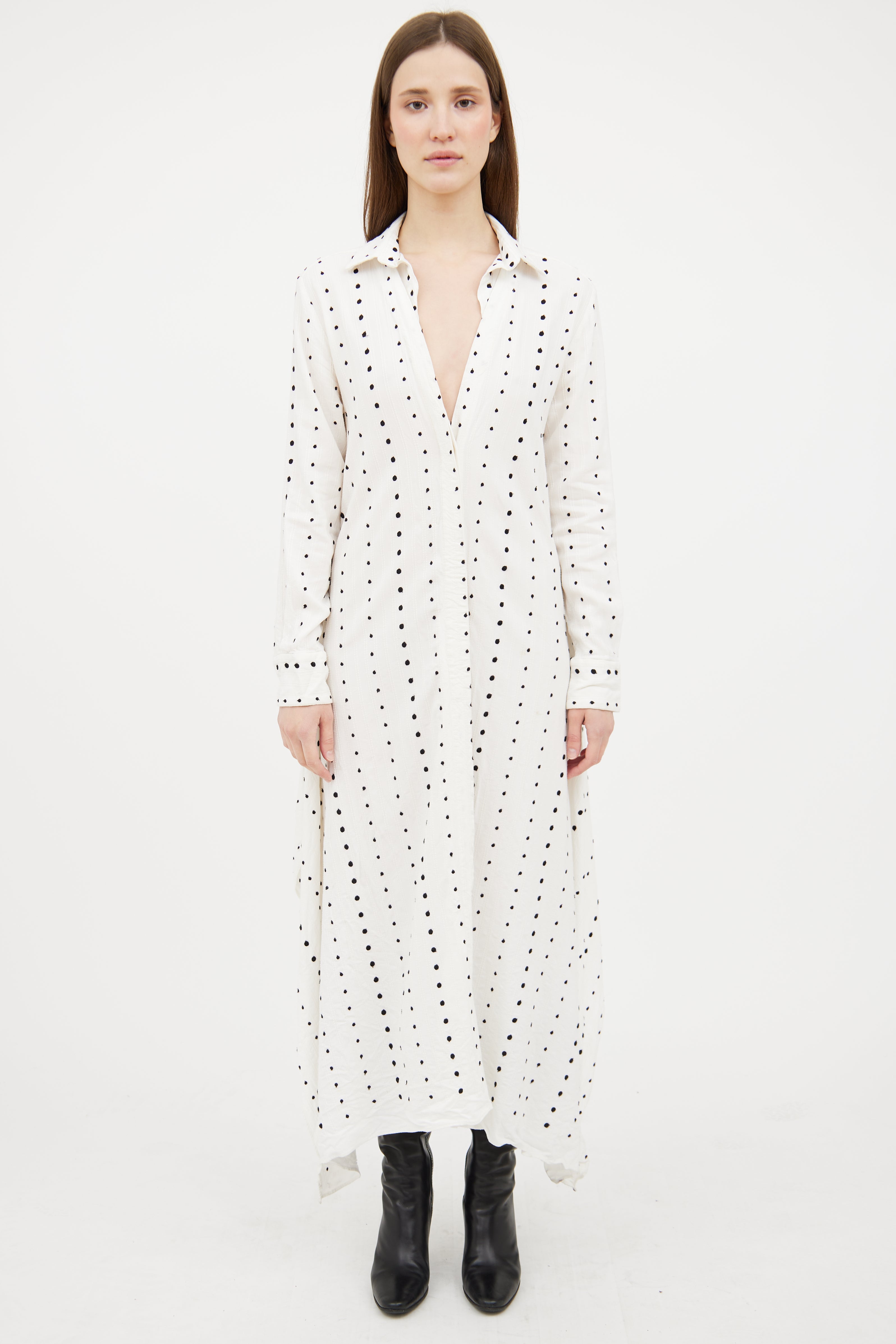 Pre-owned Jacquemus white Le Souk dress featuring a black embroidered polka dot pattern throughout, pointed collar, long sleeves with buttoned cuffs, overlaid slits at hem, and button up closure.