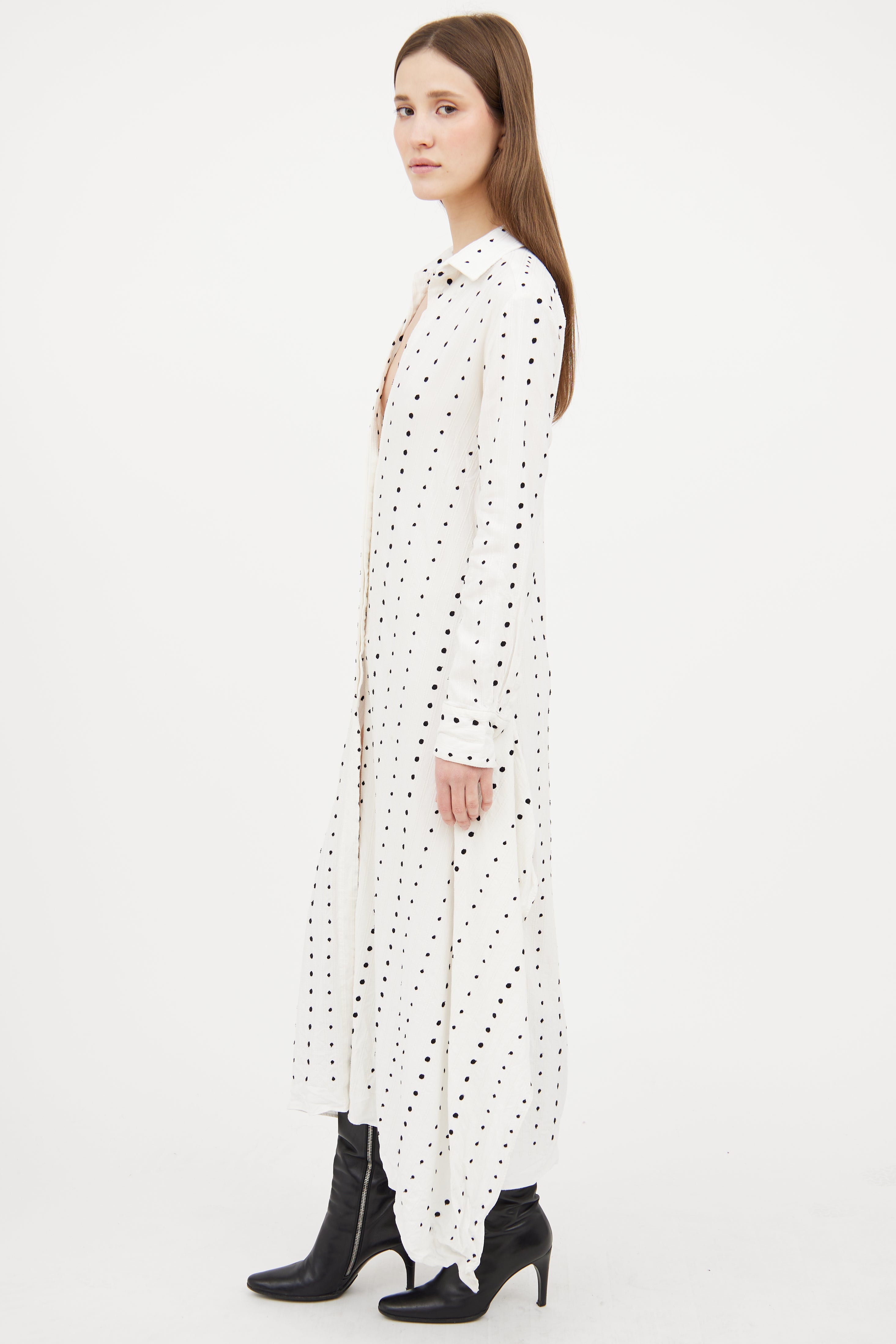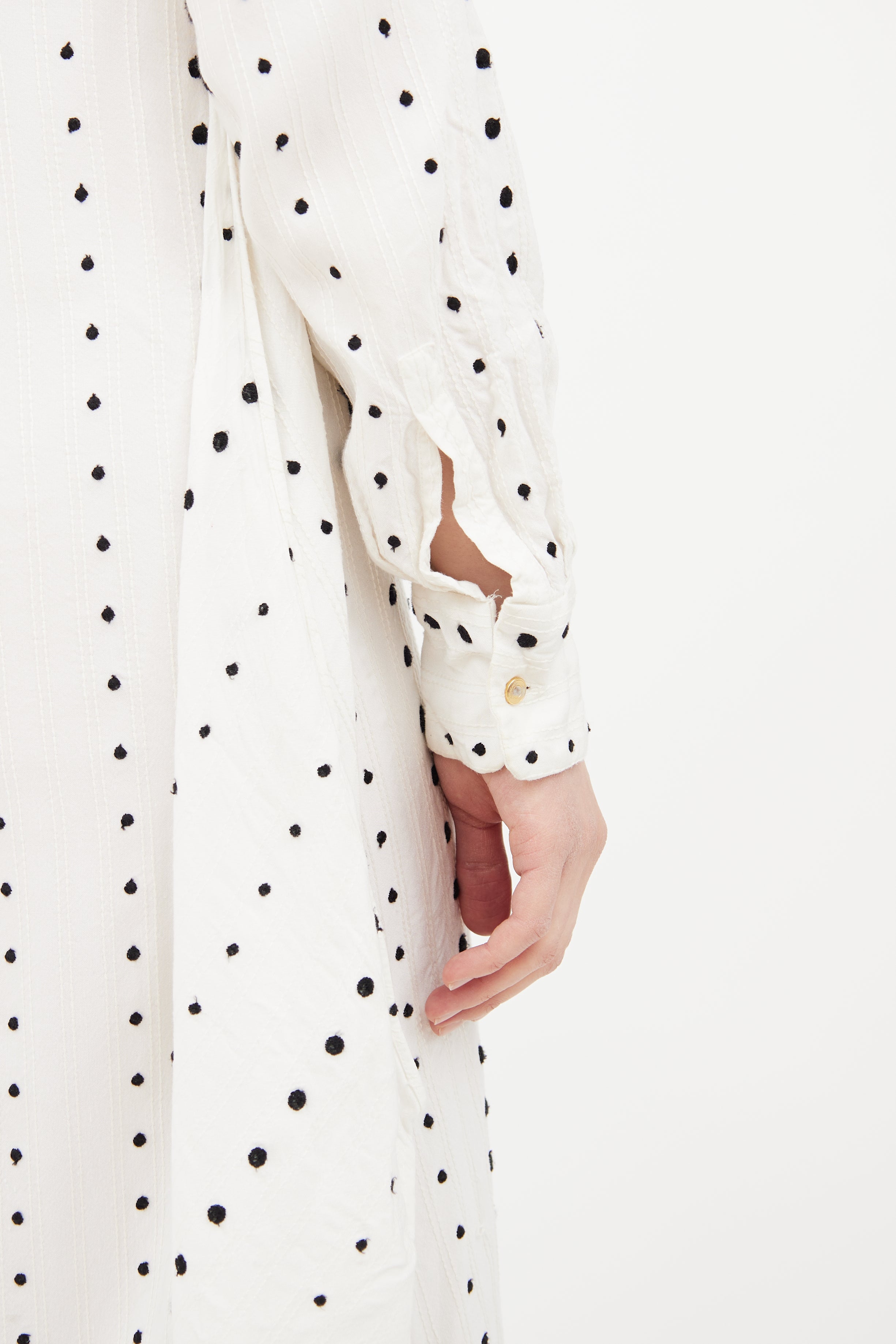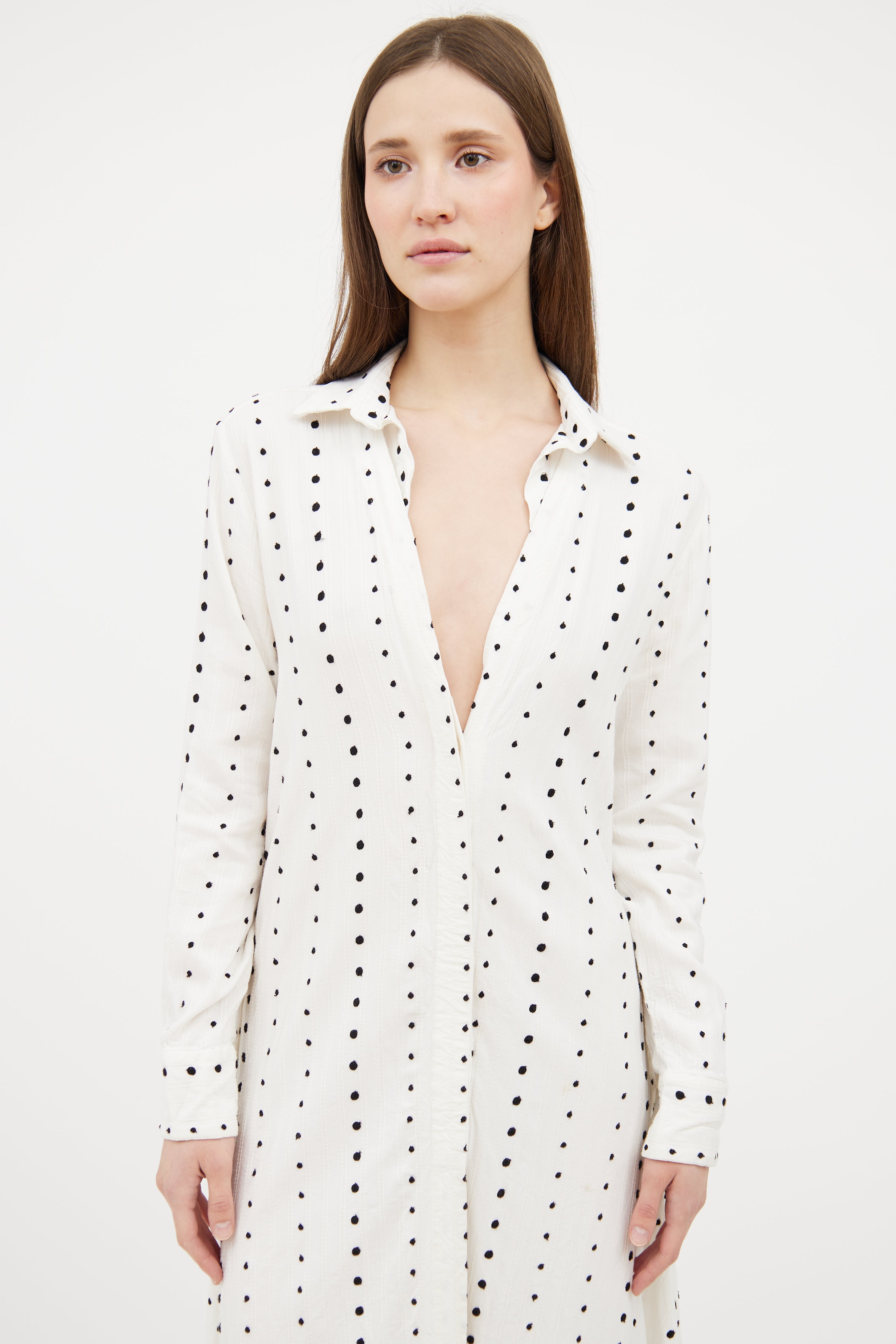 Pre-owned Jacquemus white Le Souk dress featuring a black embroidered polka dot pattern throughout, pointed collar, long sleeves with buttoned cuffs, overlaid slits at hem, and button up closure.