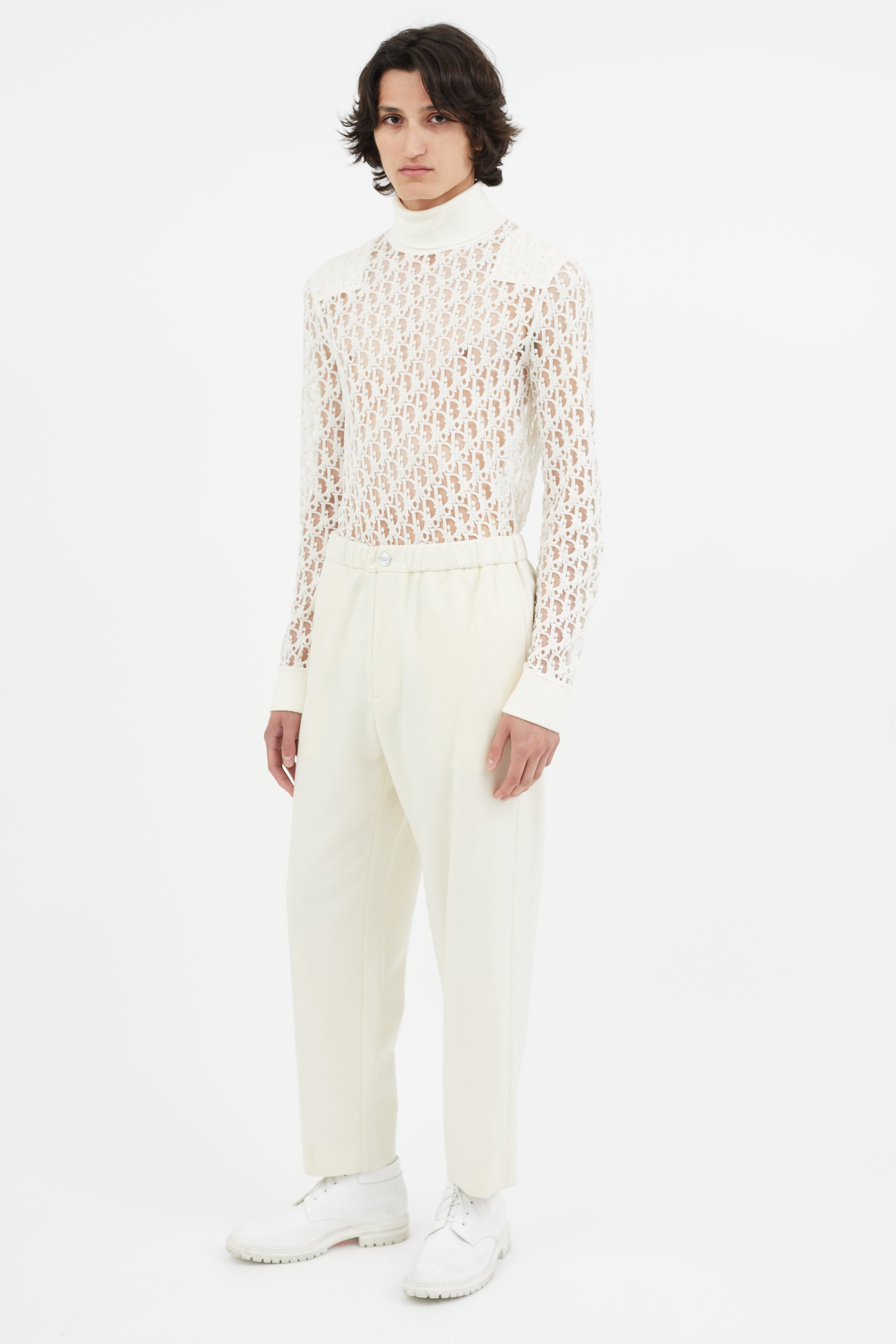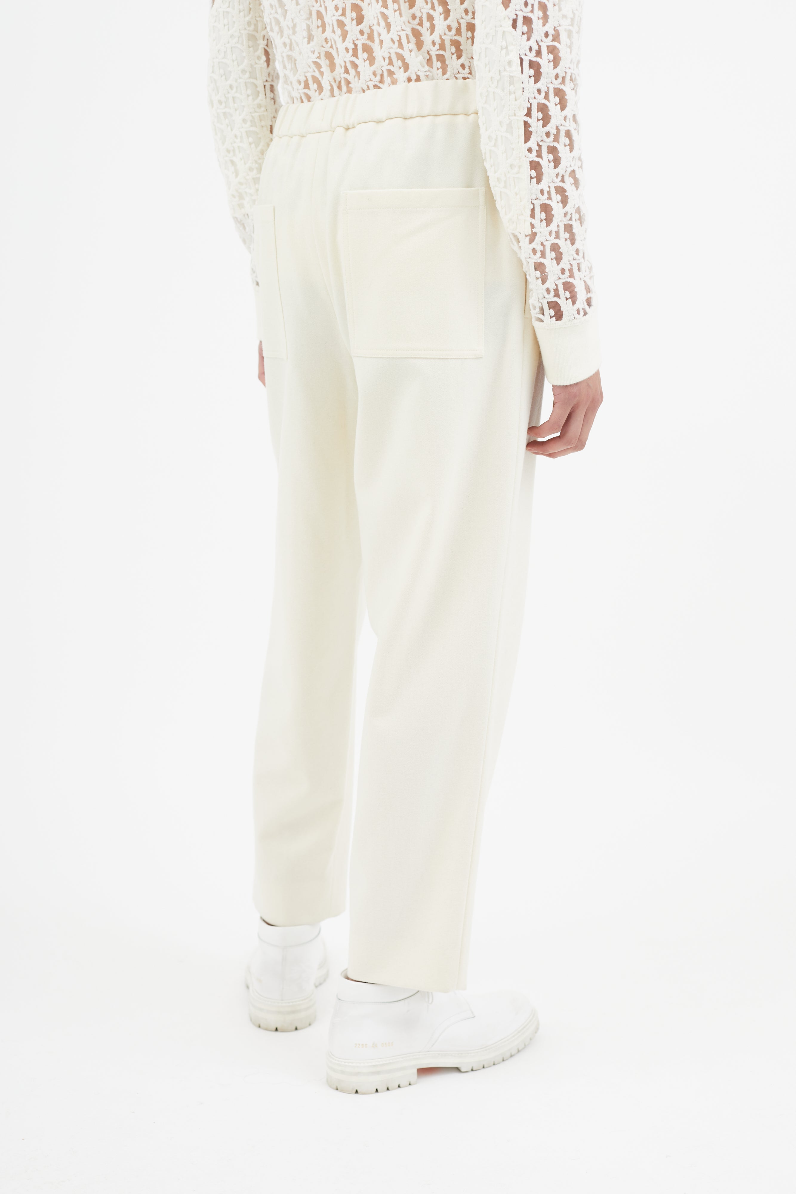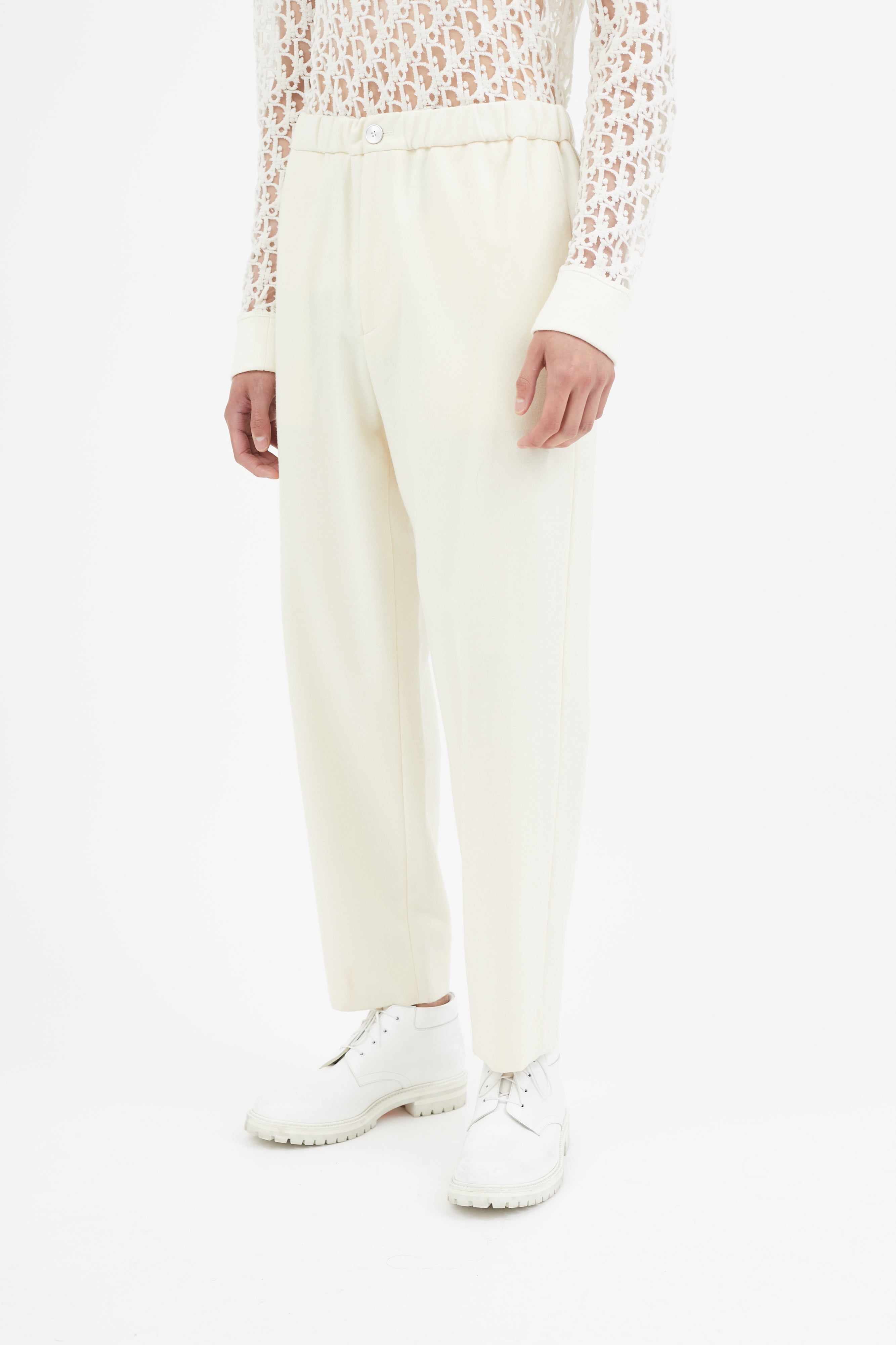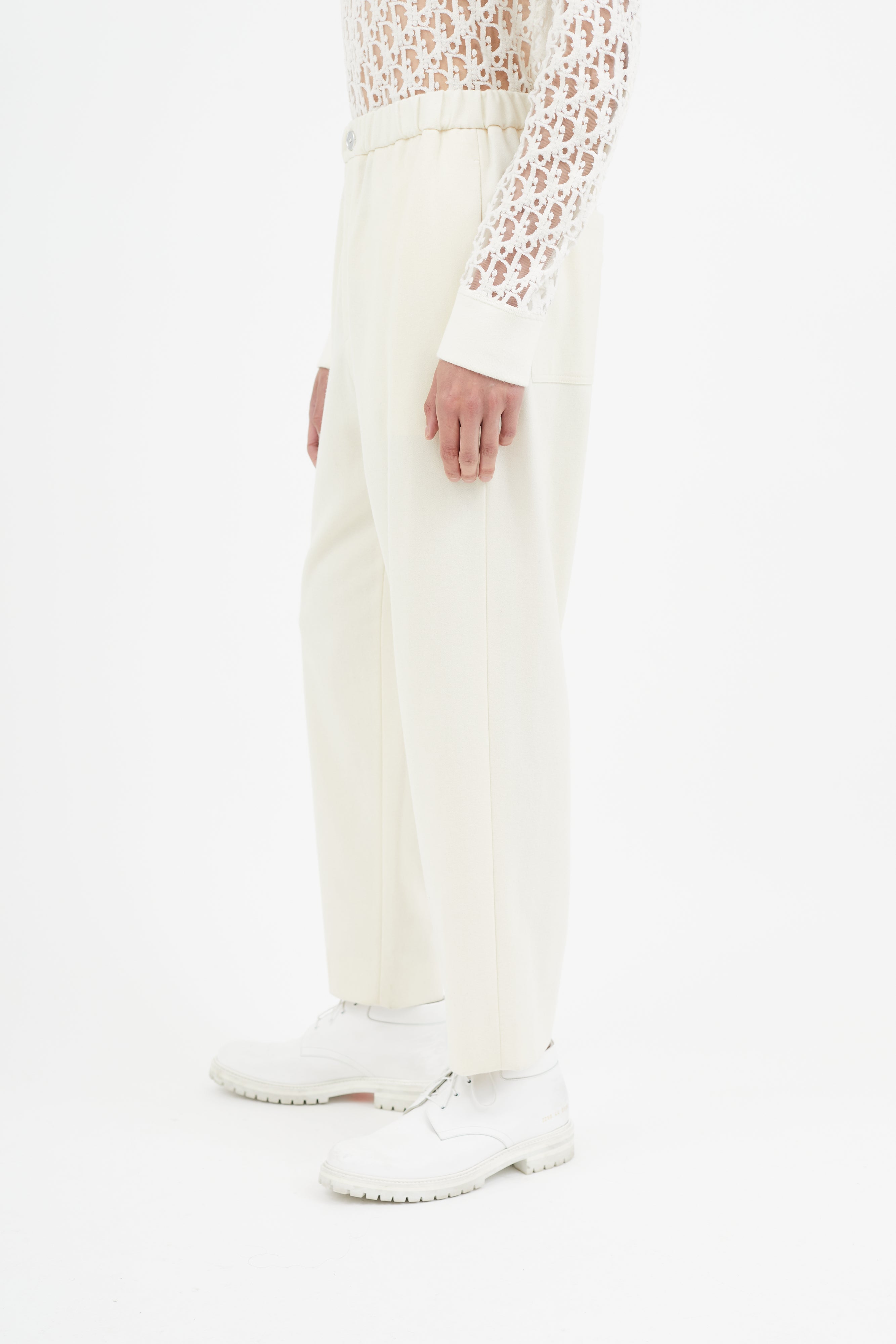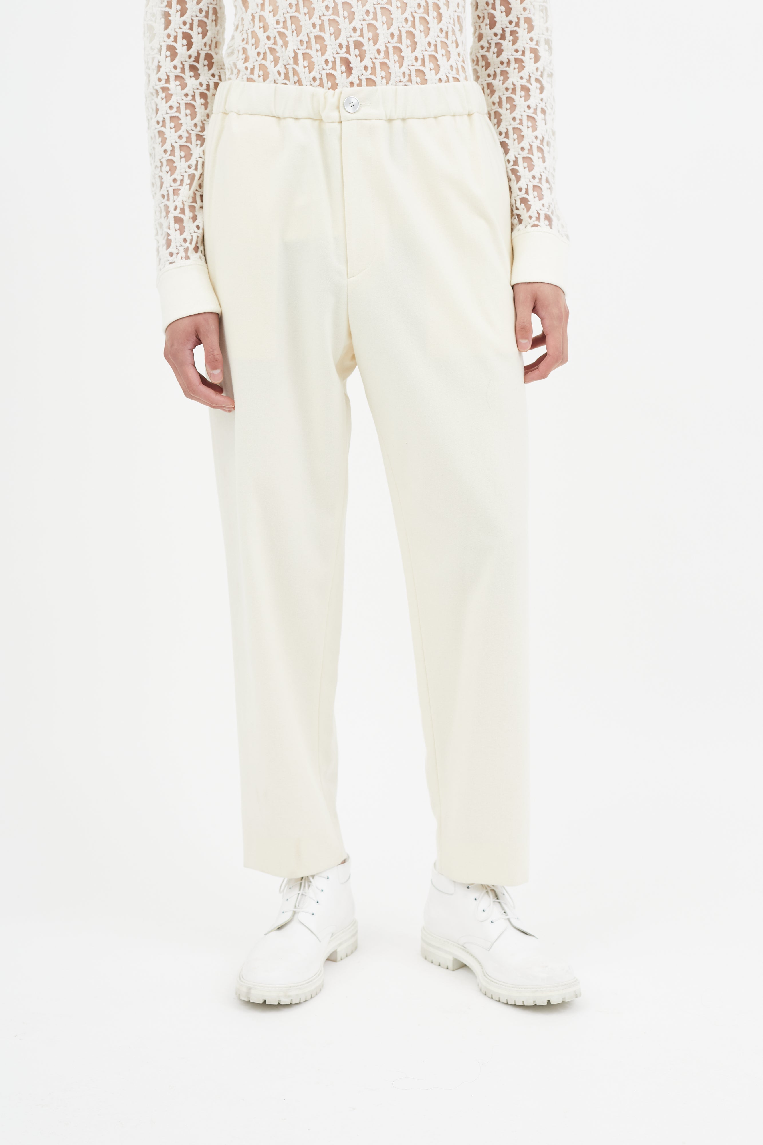 Pre-owned Jil Sander cream wool trousers featuring an elasticized waist, two slash pockets at hip, tapered leg, and a zip fly with button closure. Comes with original tags.