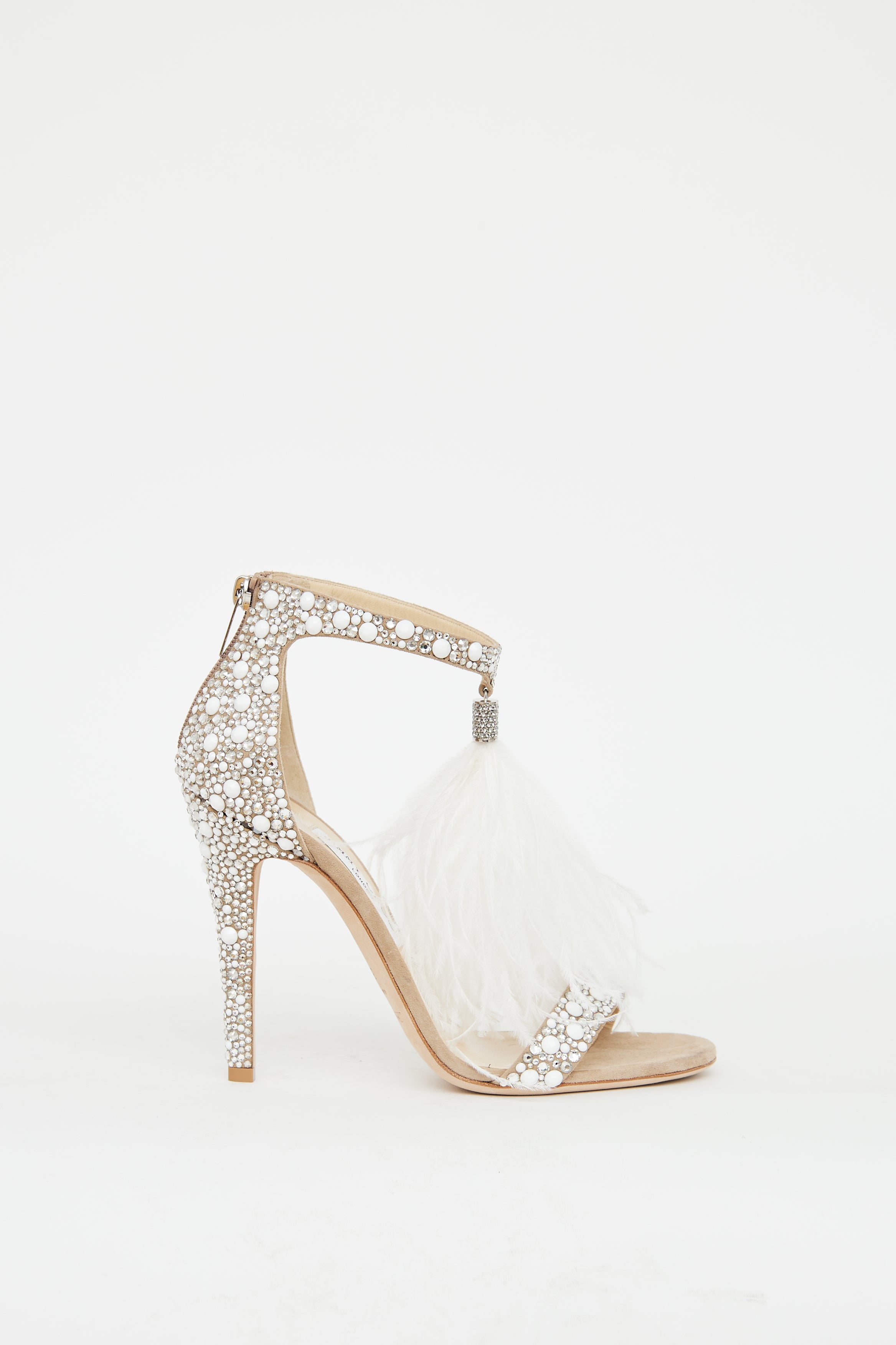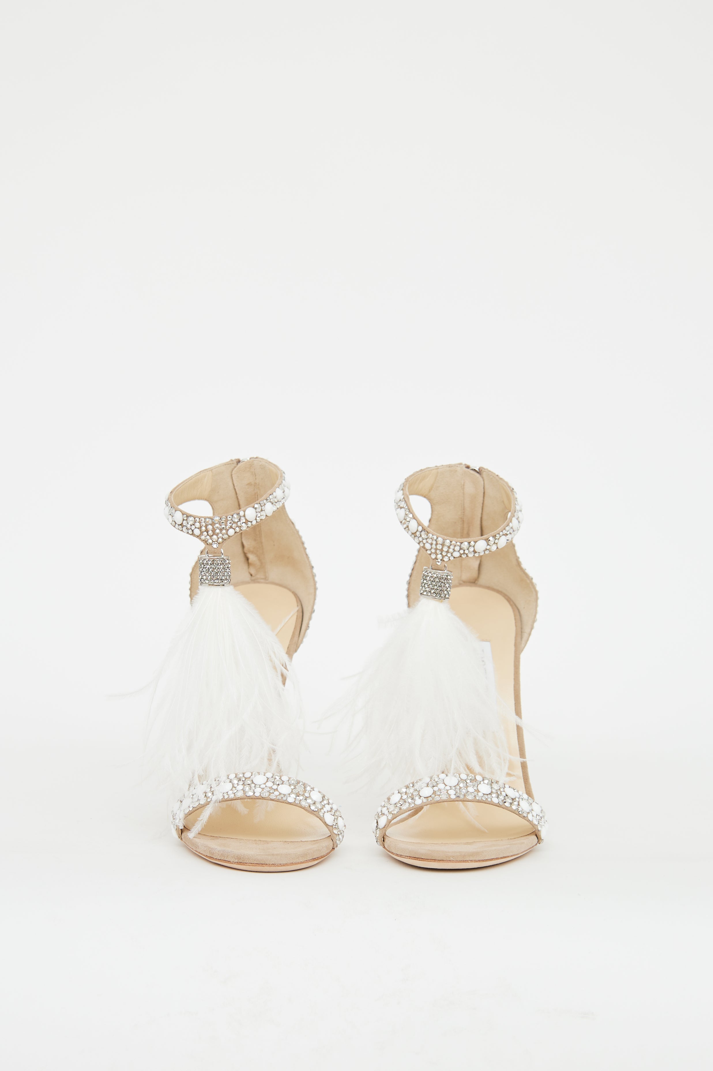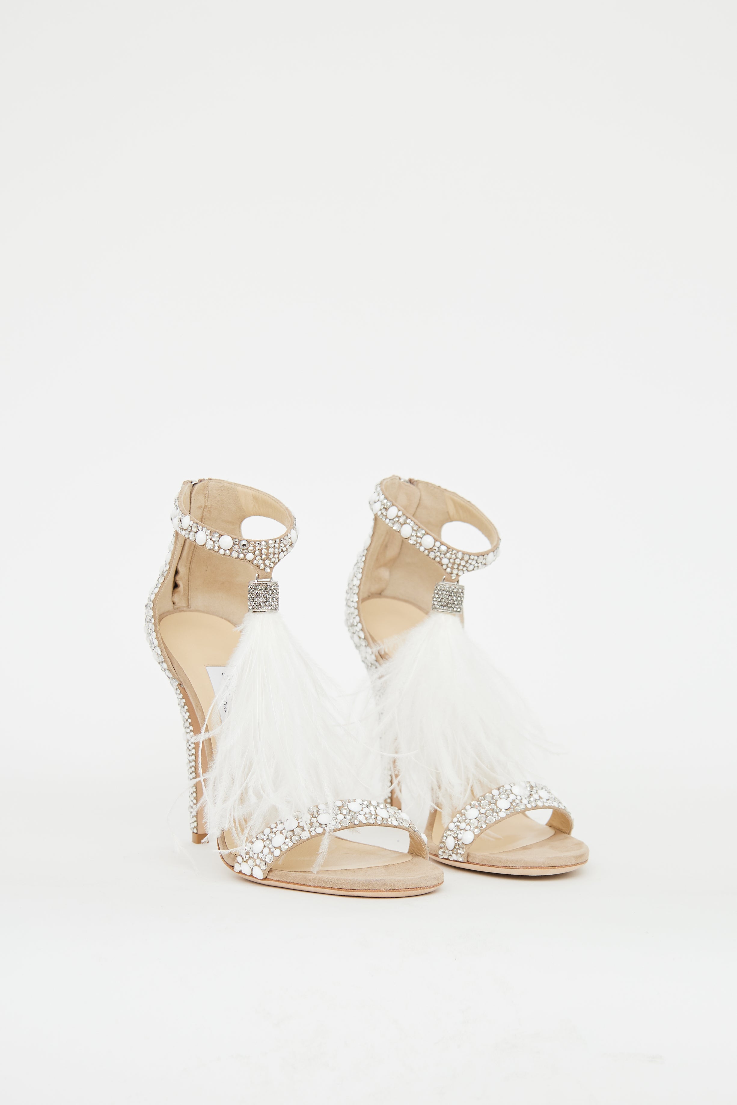 Pre-owned Jimmy Choo beige pumps featuring a rounded open toe, strap over vamp, silver tone and white embellishments throughout, ankle strap with feather extension, zip closure at counter and covered stiletto heel.