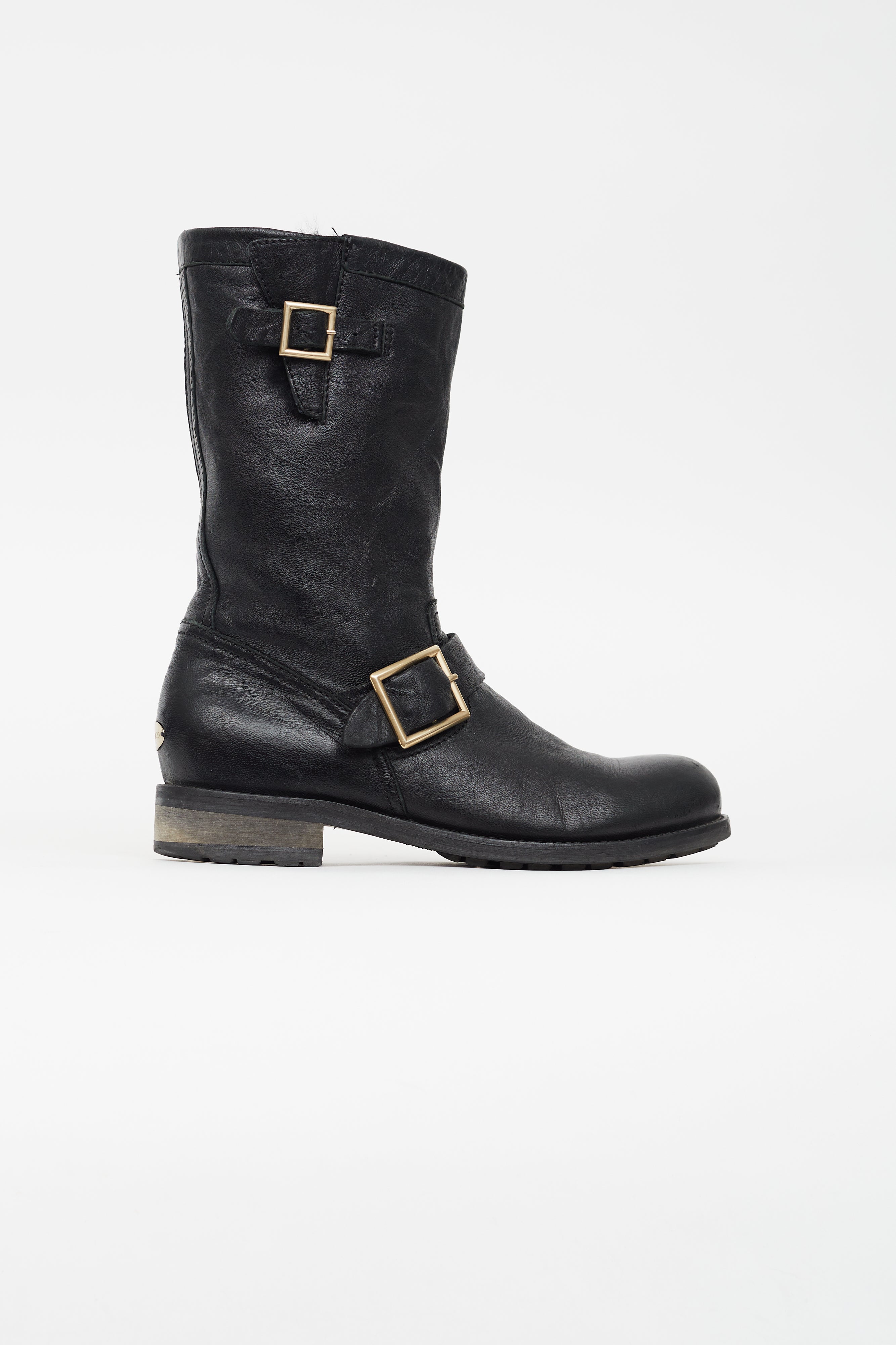 Pre-owned Jimmy Choo Biker II boot in black distressed leather featuring rounded toe, two adjustable silver tone buckles, black fur lining at calf with leather insole, slip on entry and rubber tread soles.