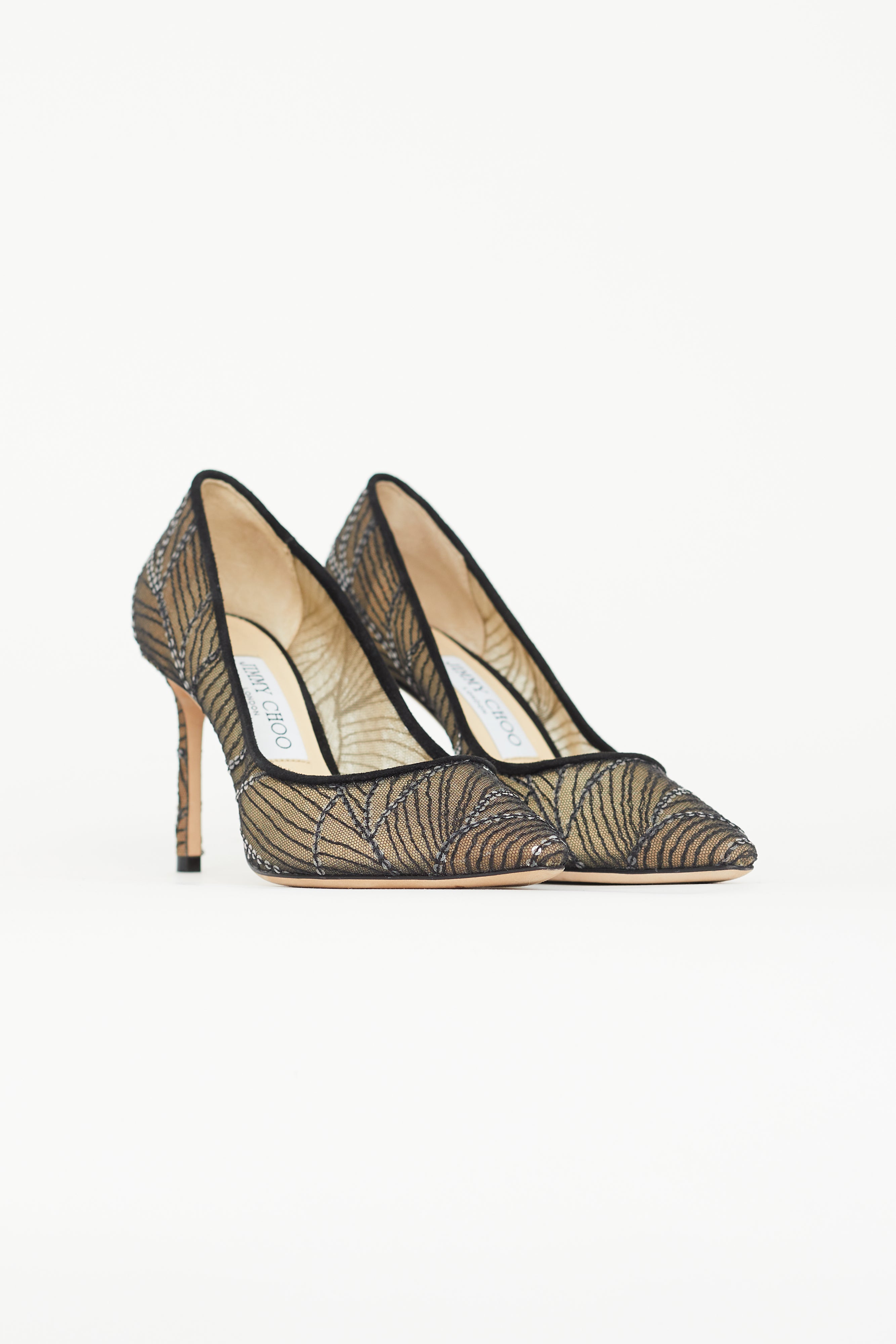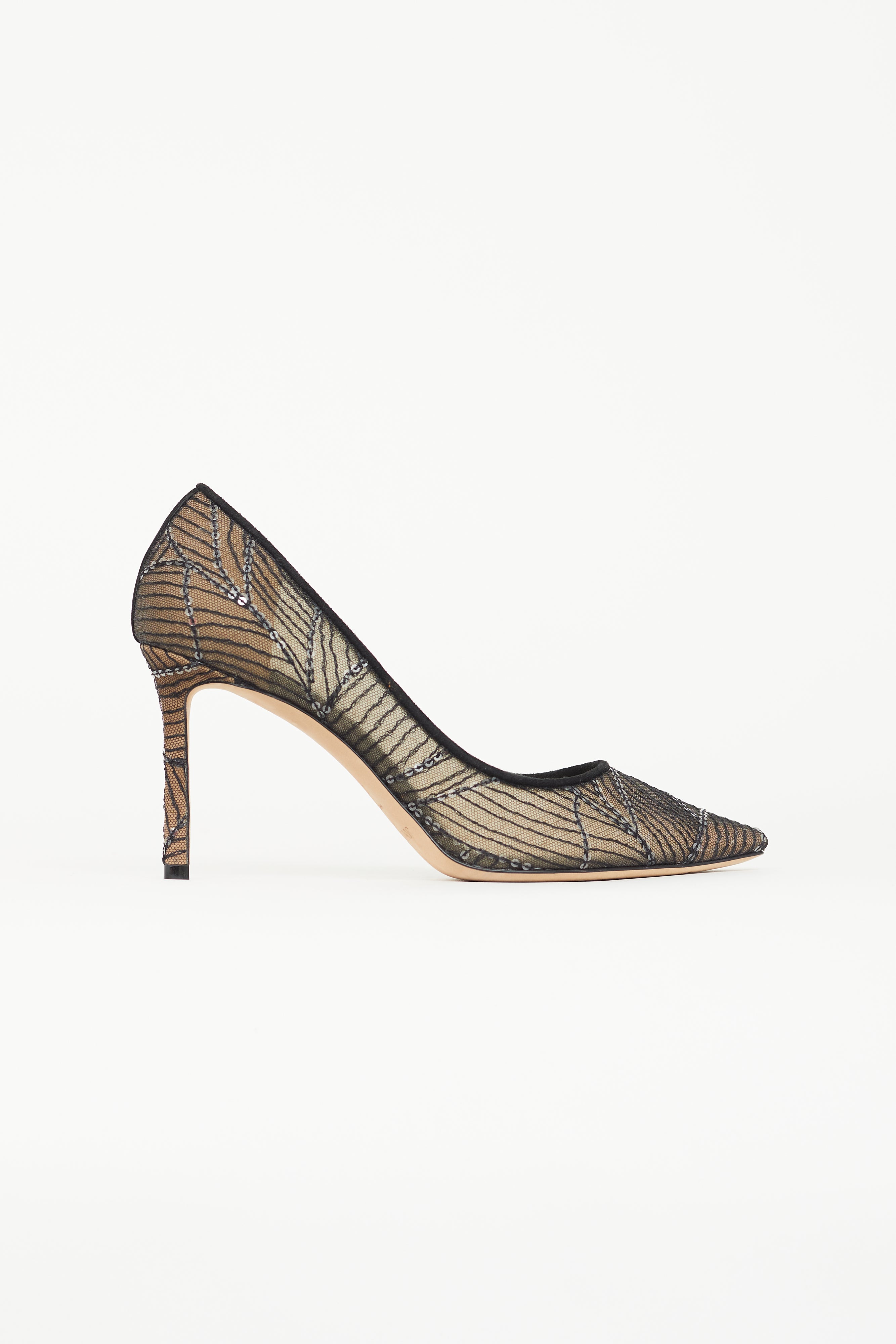 Pre-owned Jimmy Choo black Romy pumps featuring pointed toe, sequin embellishment throughout, suede collar, and covered stiletto heel. Comes with original dust bag.
