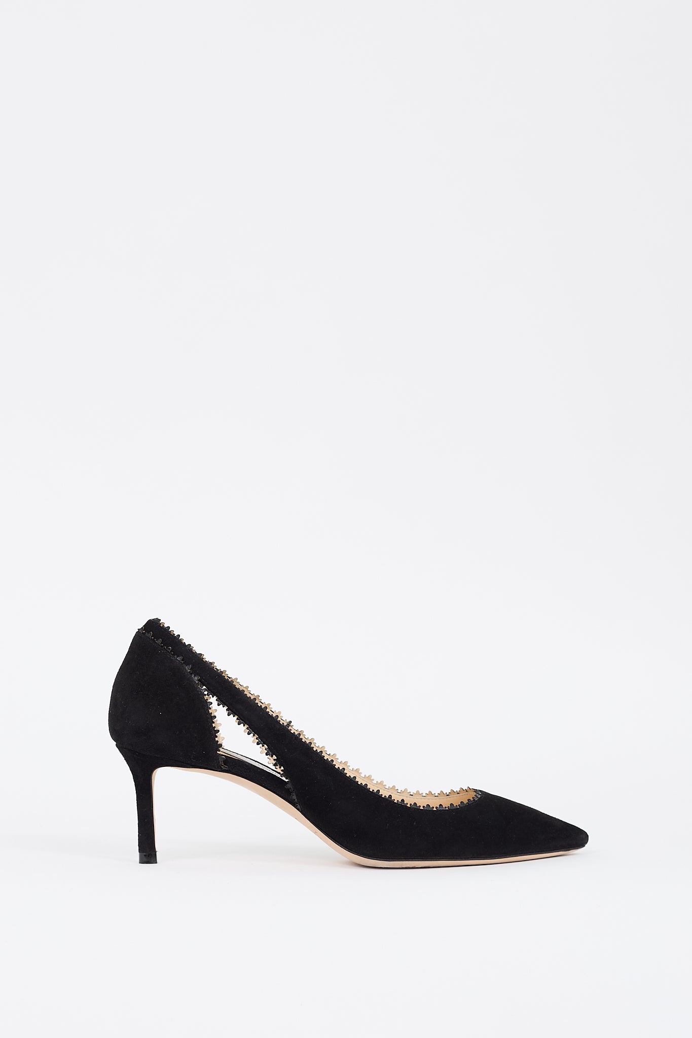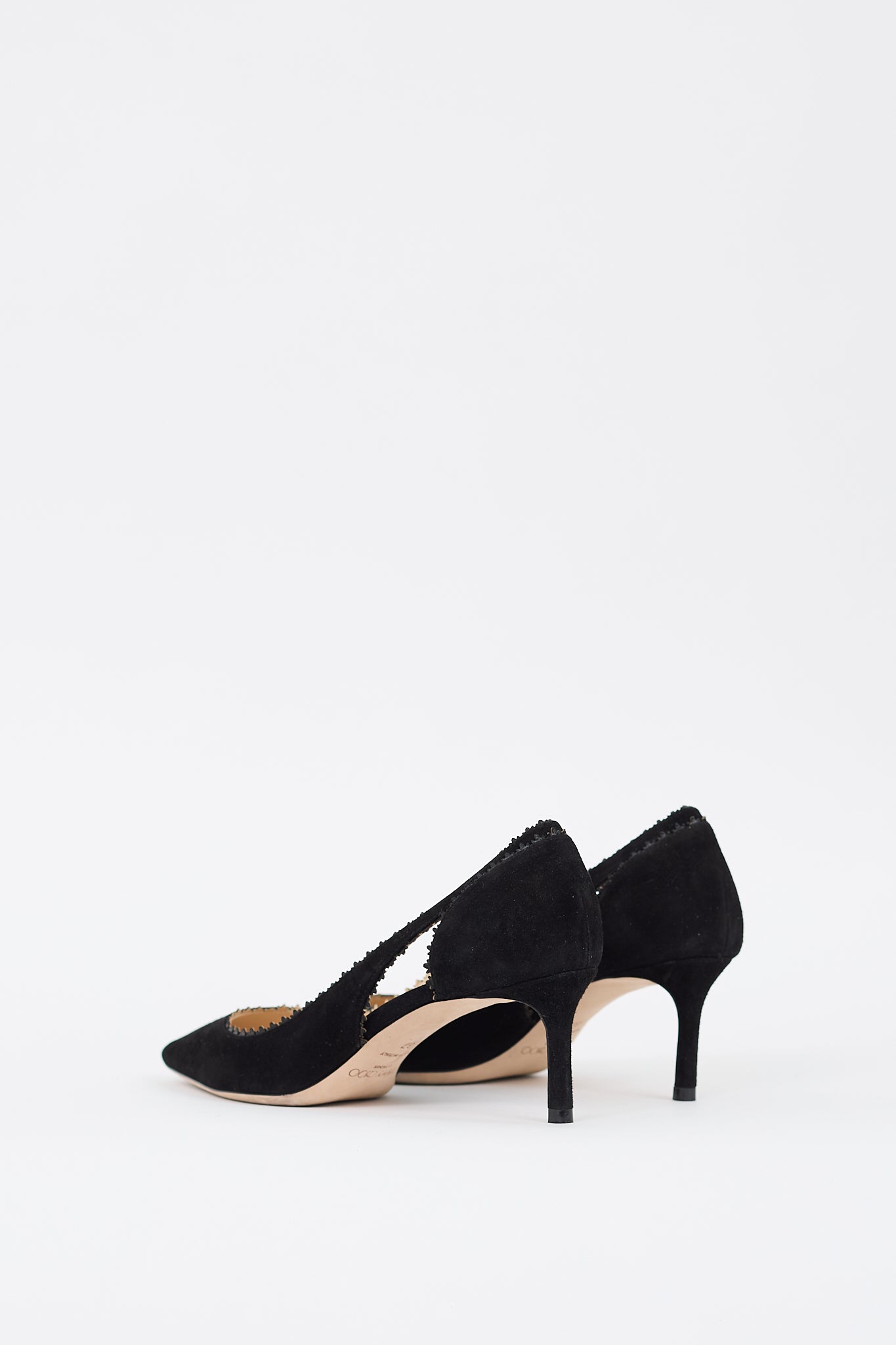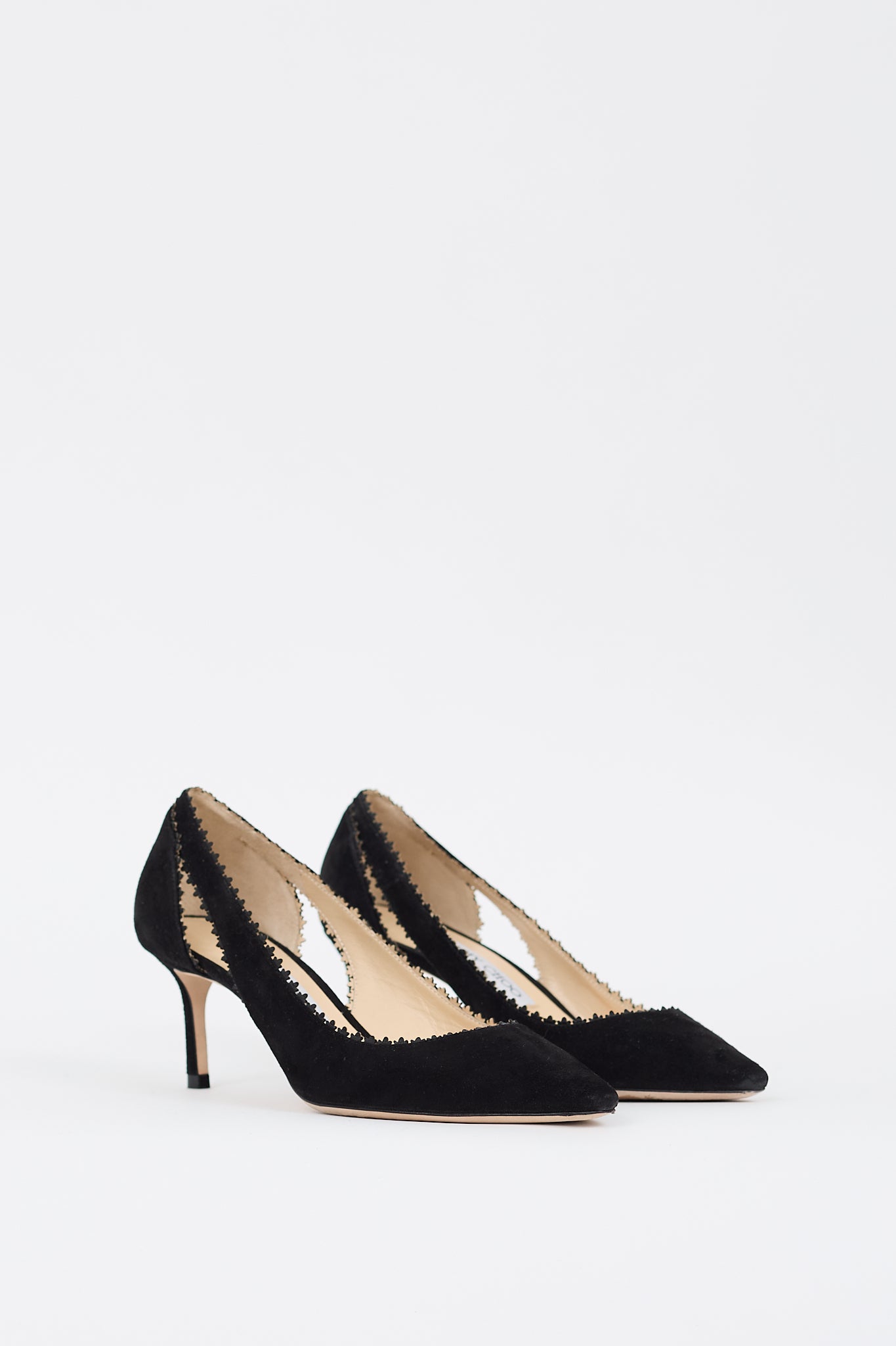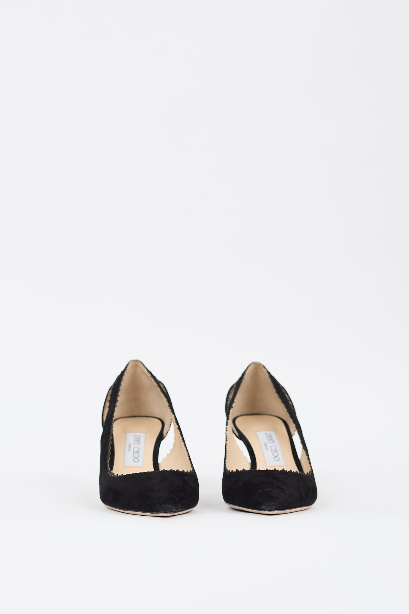 Pre-owned Jimmy Choo black suede pumps featuring pointed toe, scalloped trim topline, cutout sides, short covered stiletto heel, and slip on entry.