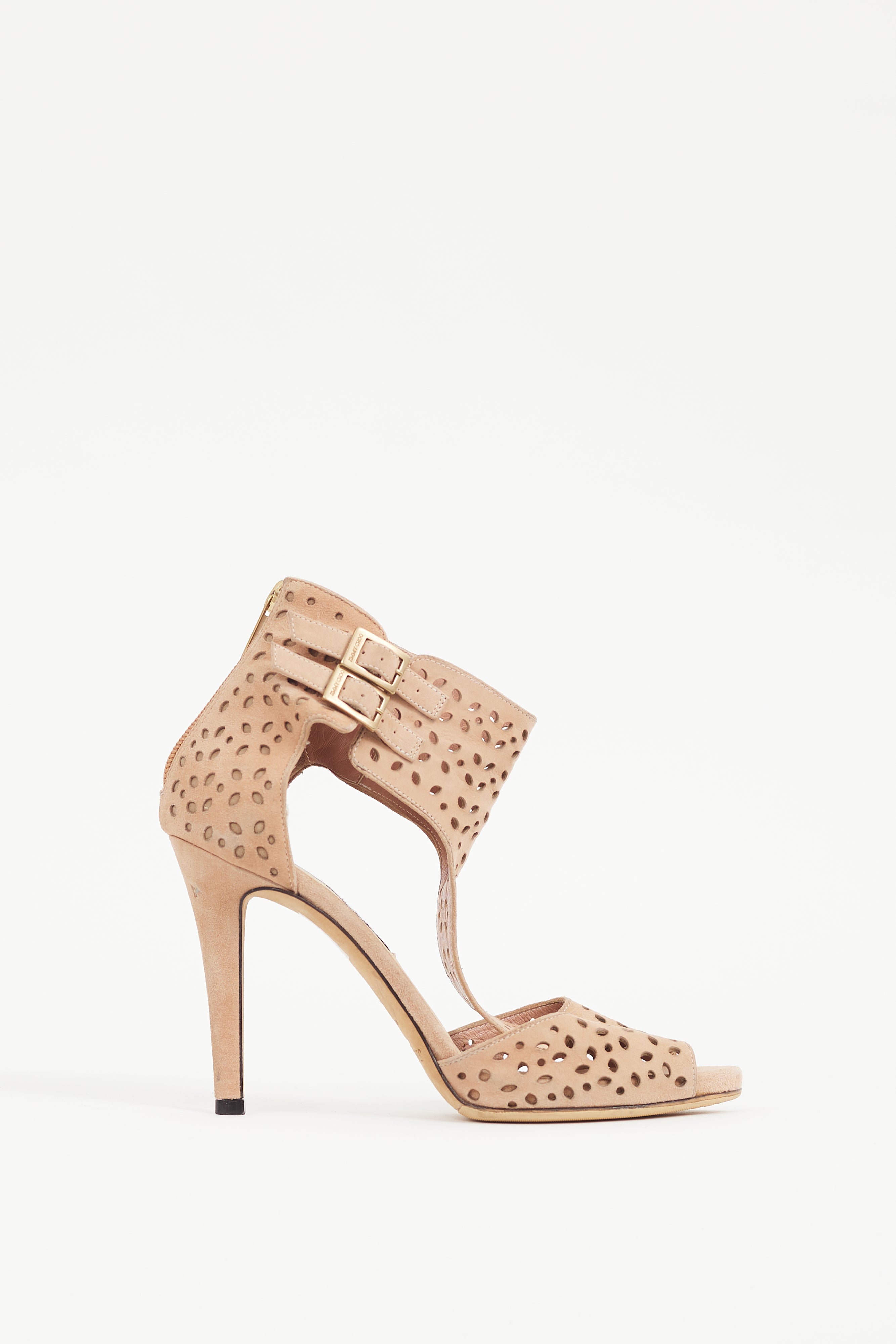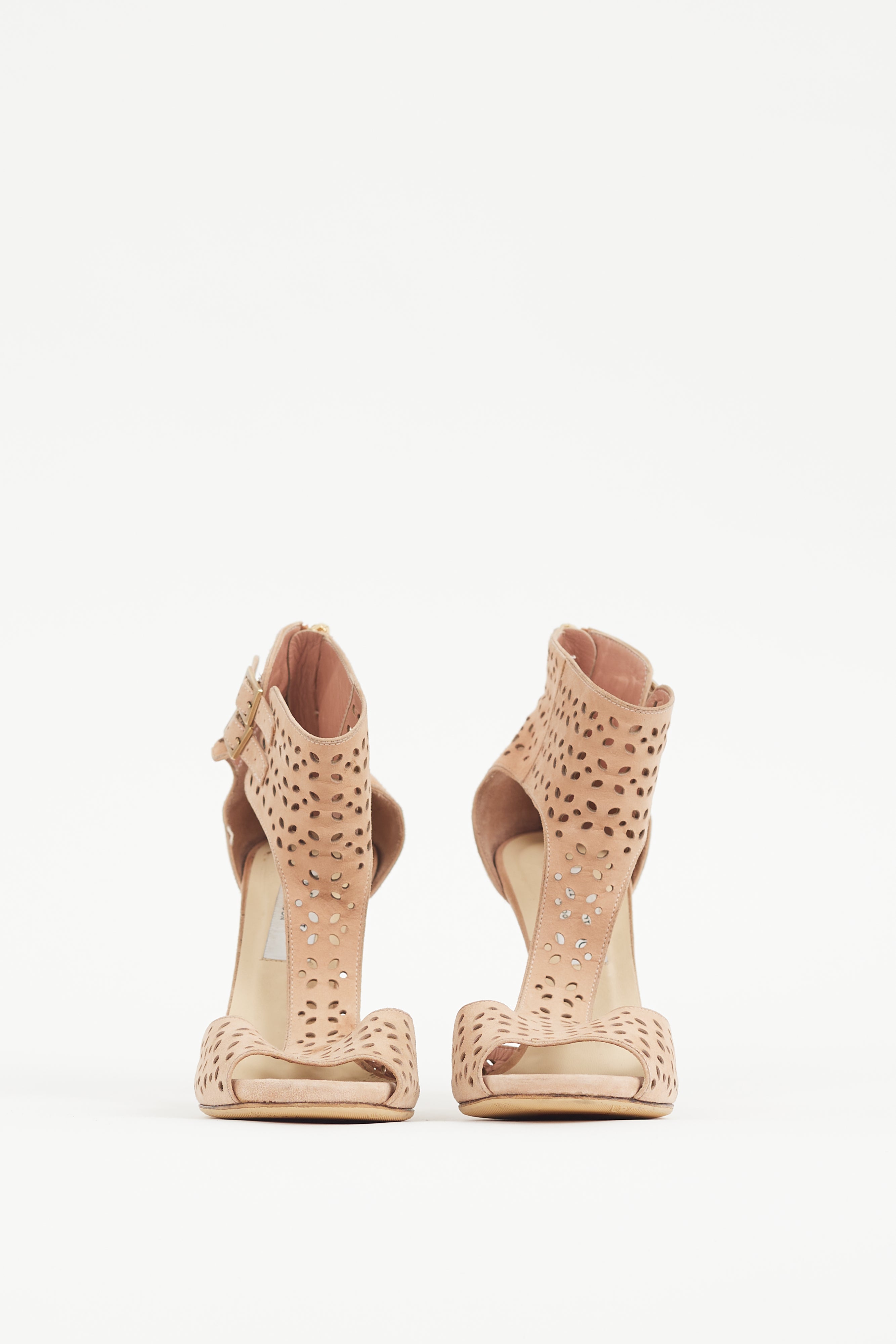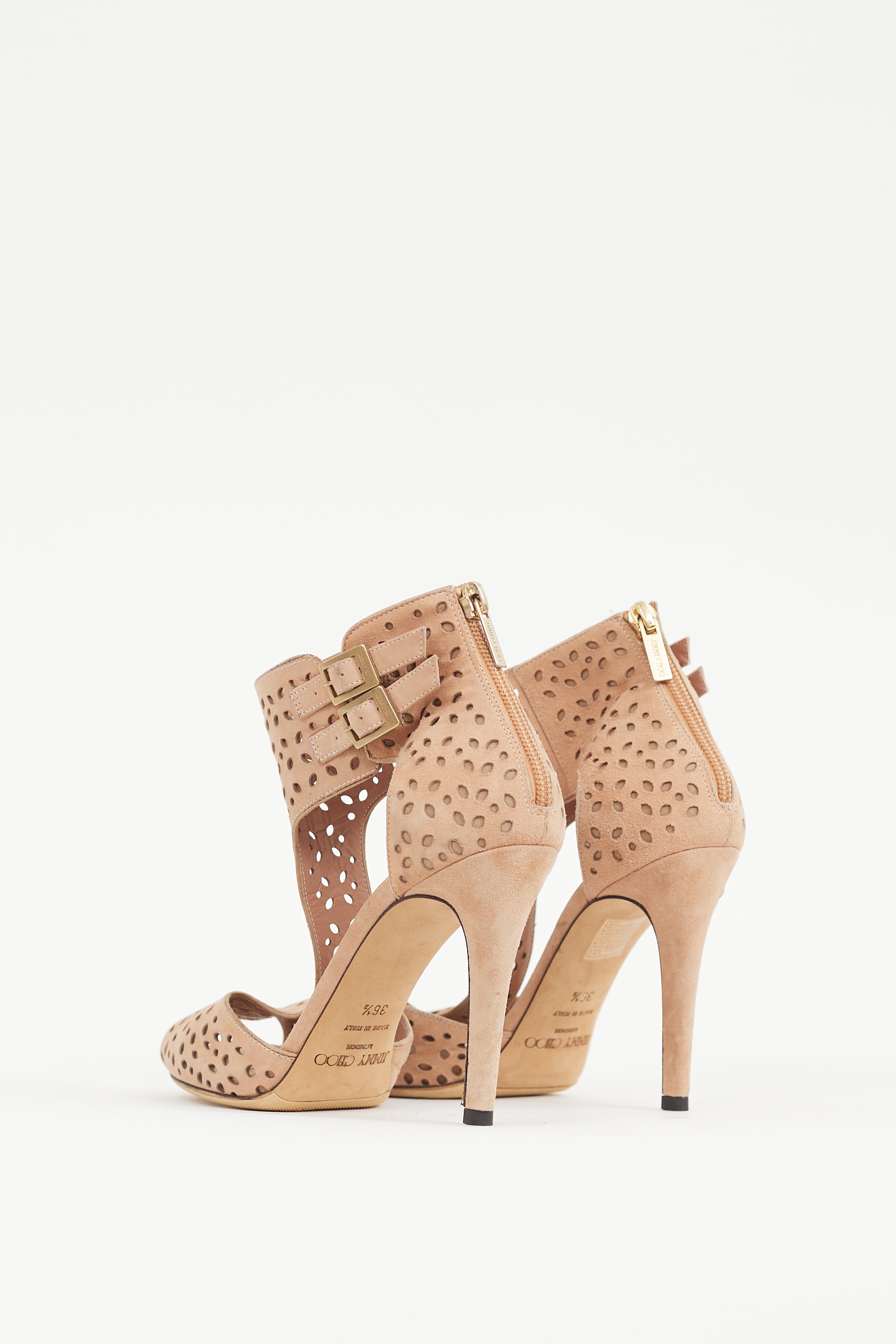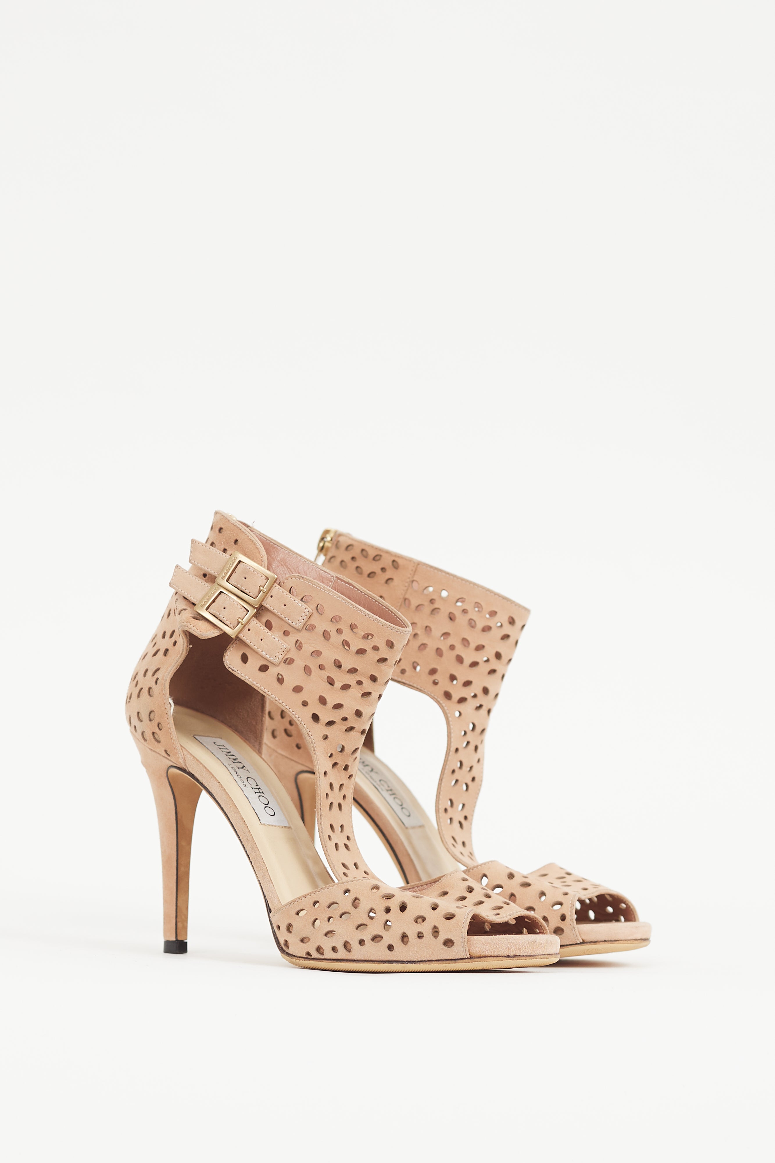 Pre-owned Jimmy Choo pink Tahi suede heels featuring a round peep toe, cut out detailing, wrapped stiletto heel, and adjustable buckle closure at ankle.