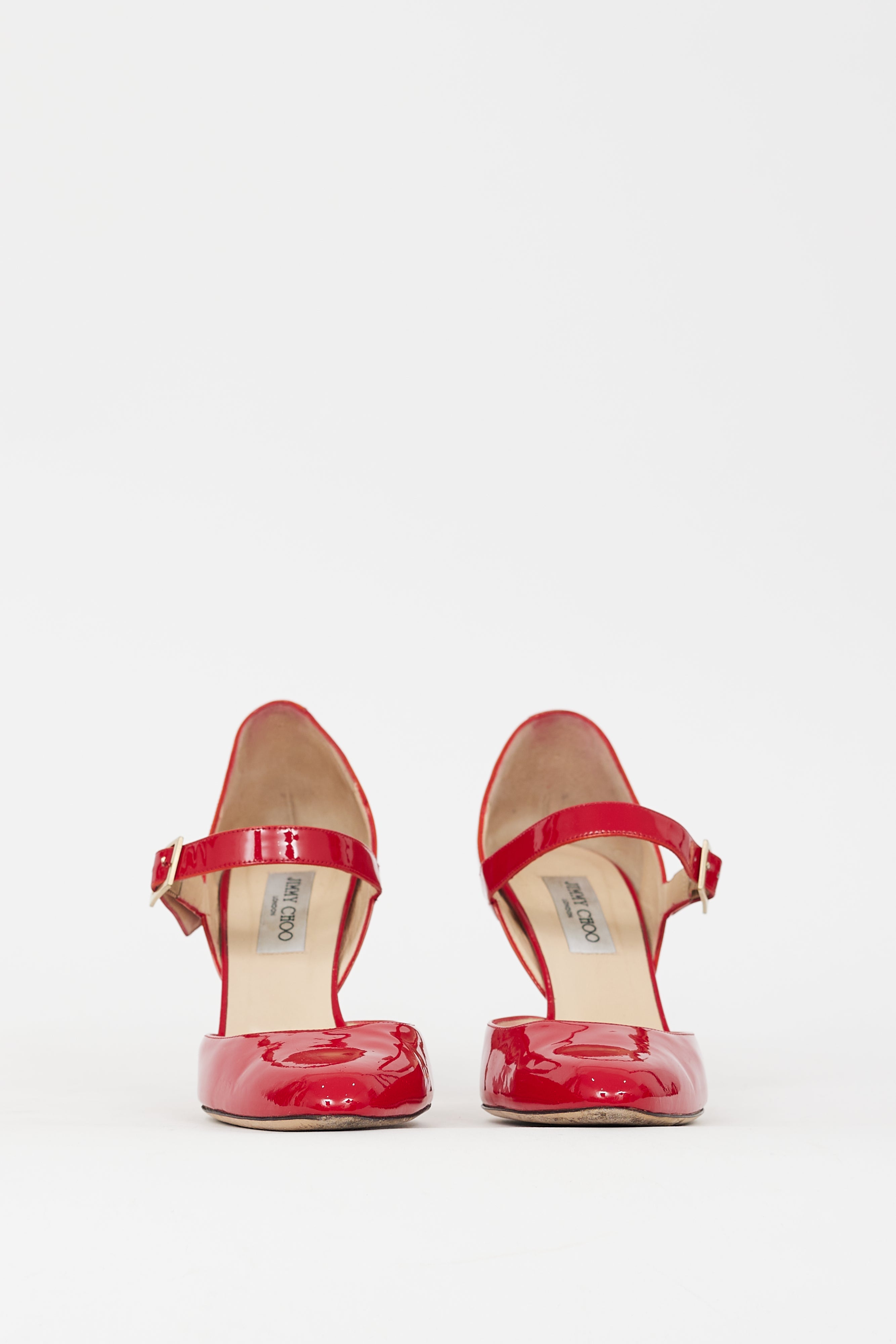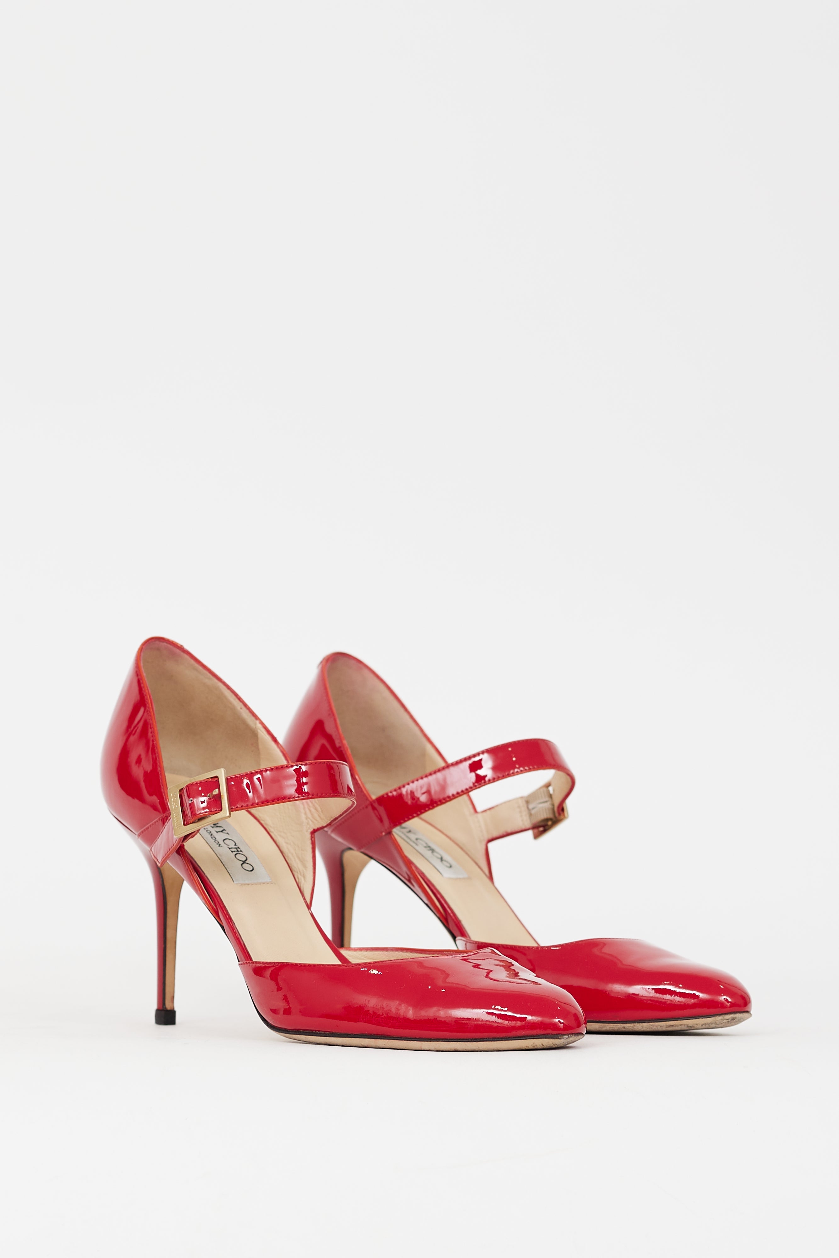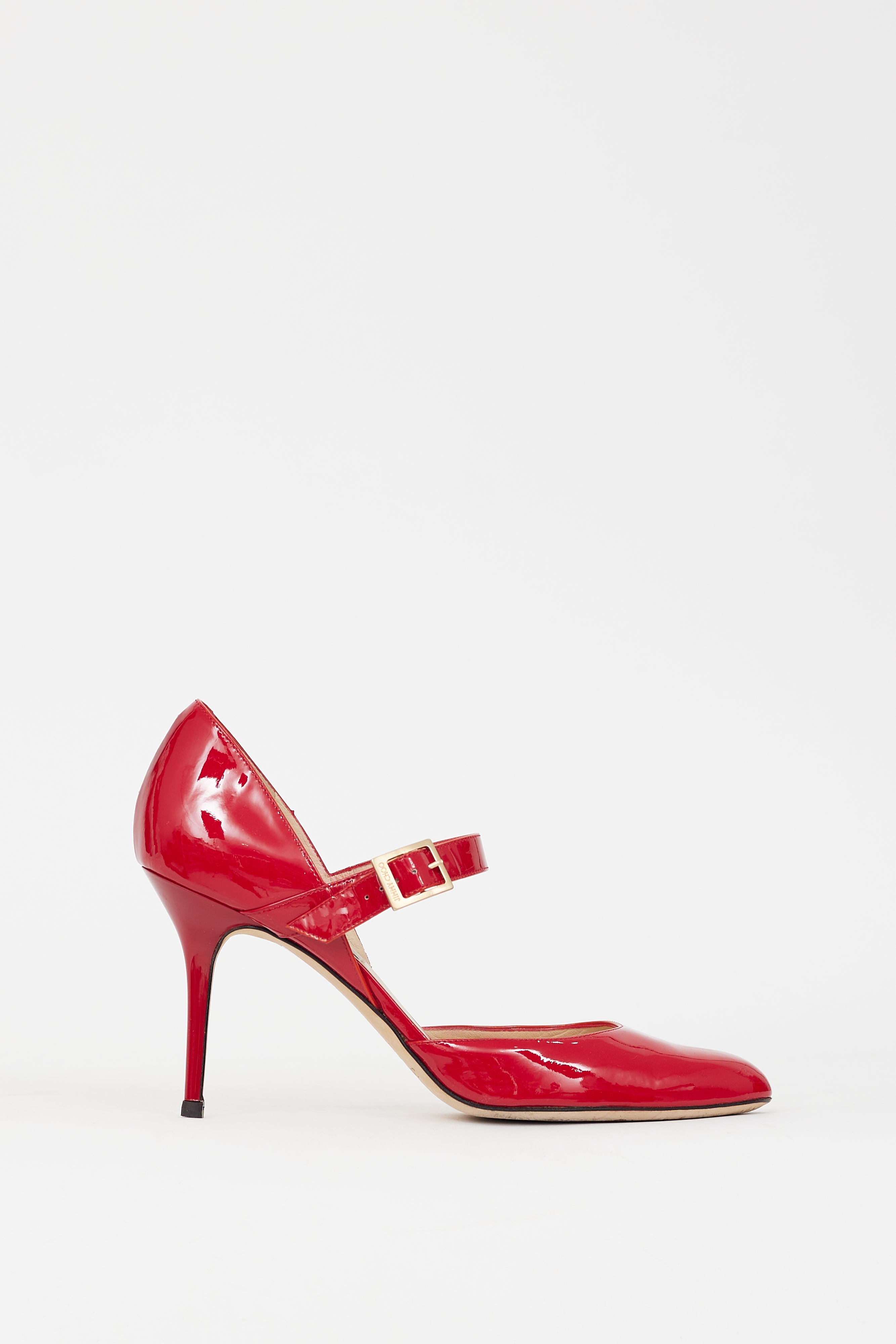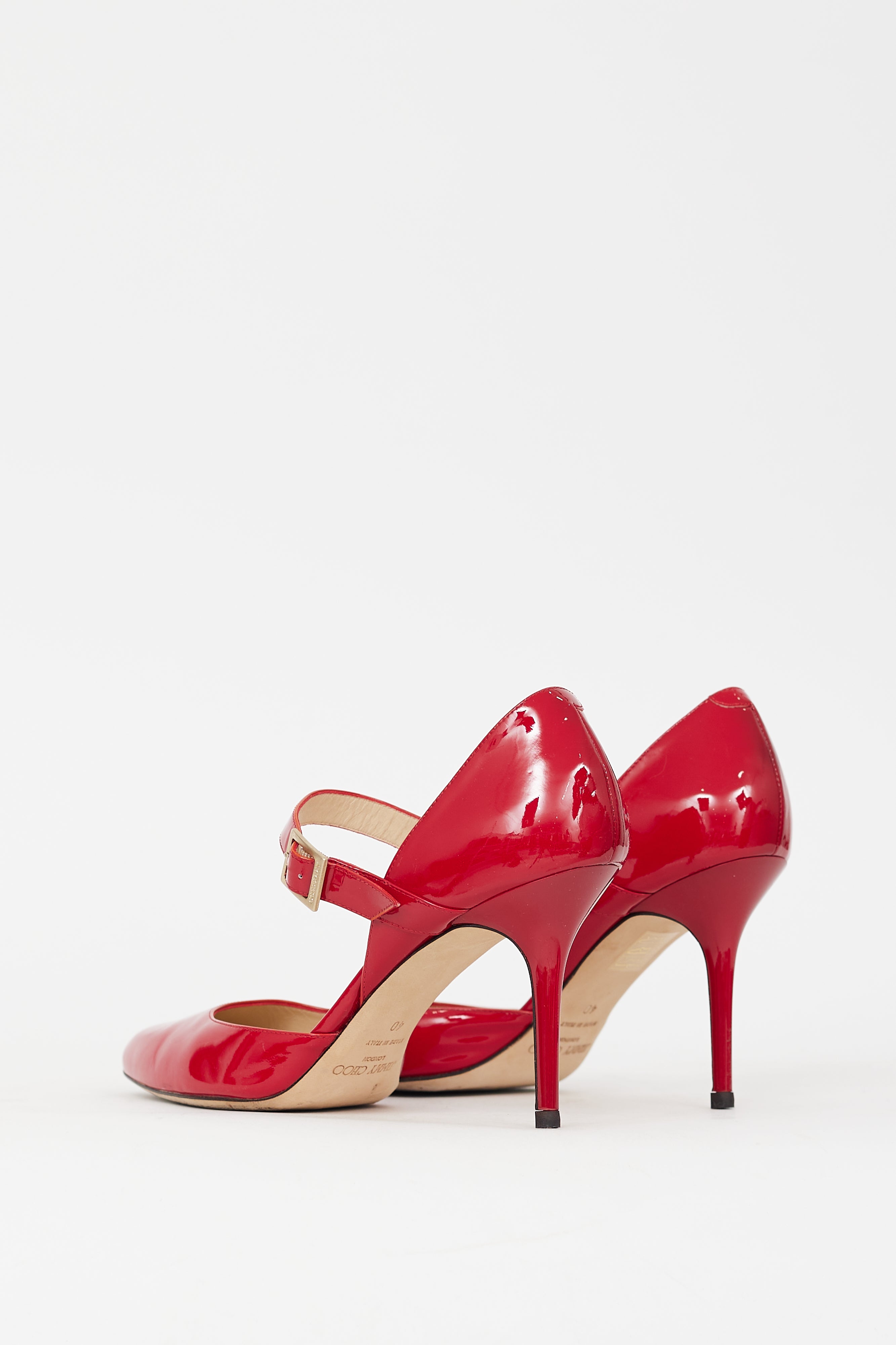 Pre-owned Jimmy Choo red patent leather Leila pumps featuring rounded toe, adjustable strap with buckle fastening at instep, covered stiletto heel, and slip on entry. Comes with original dust bag.