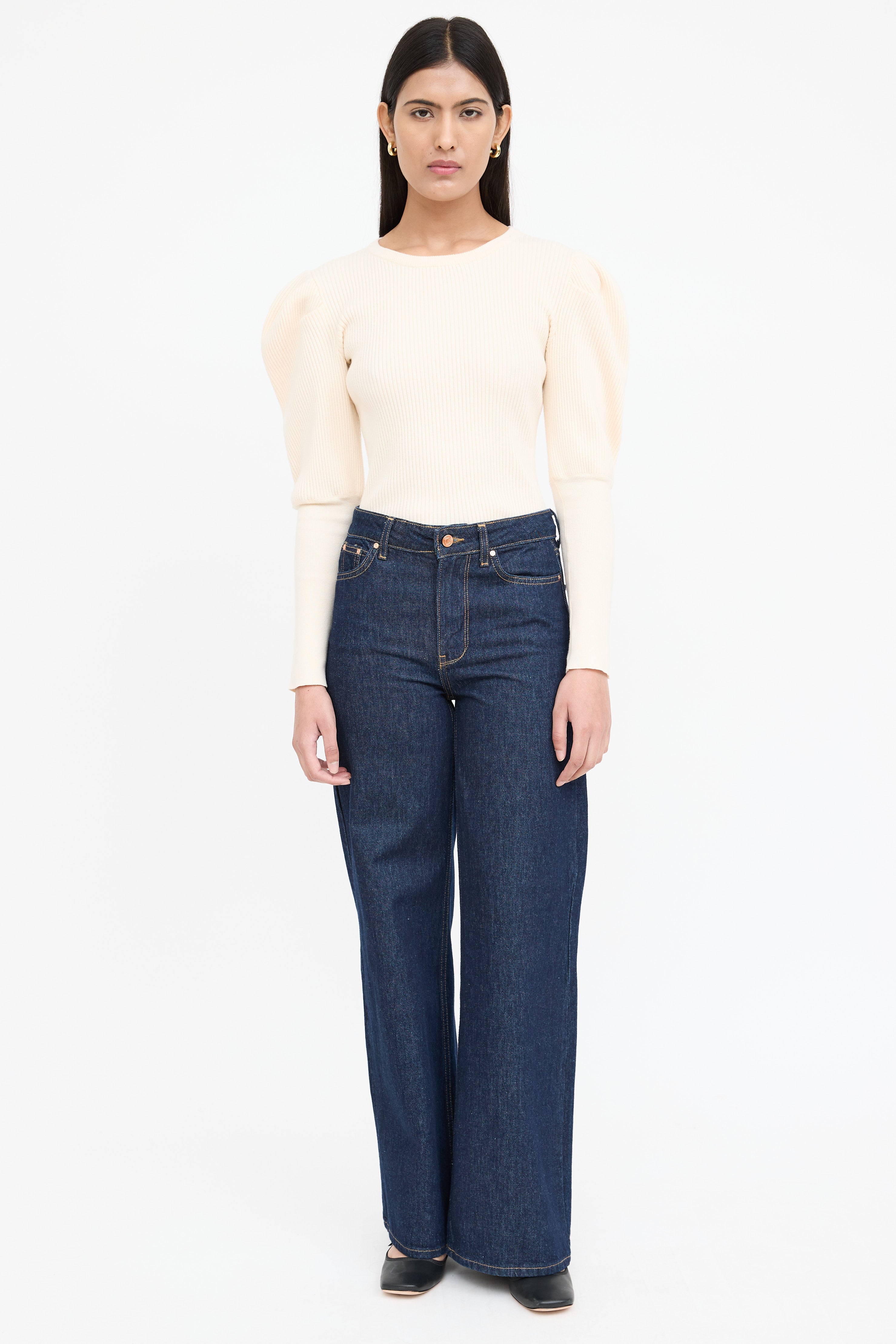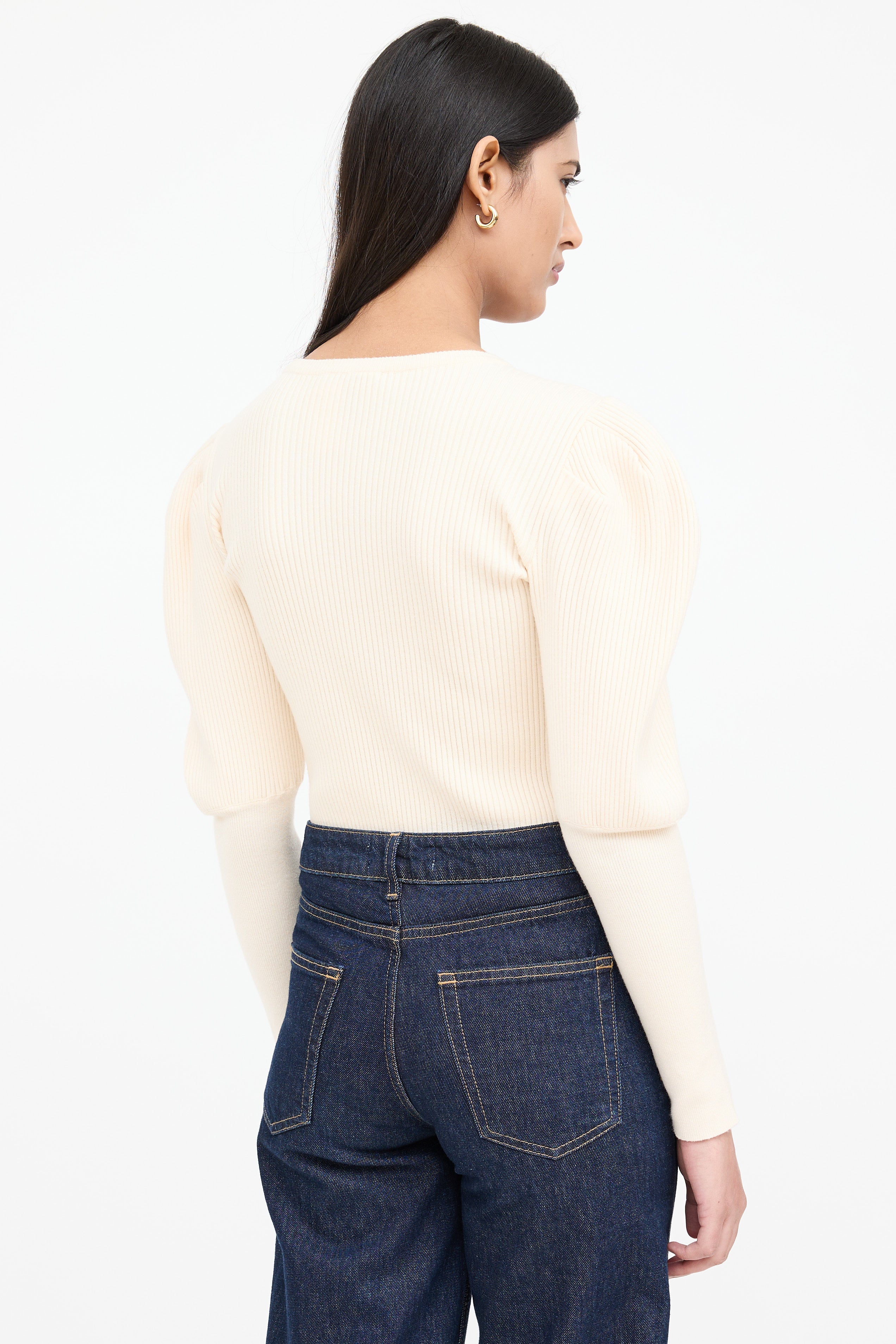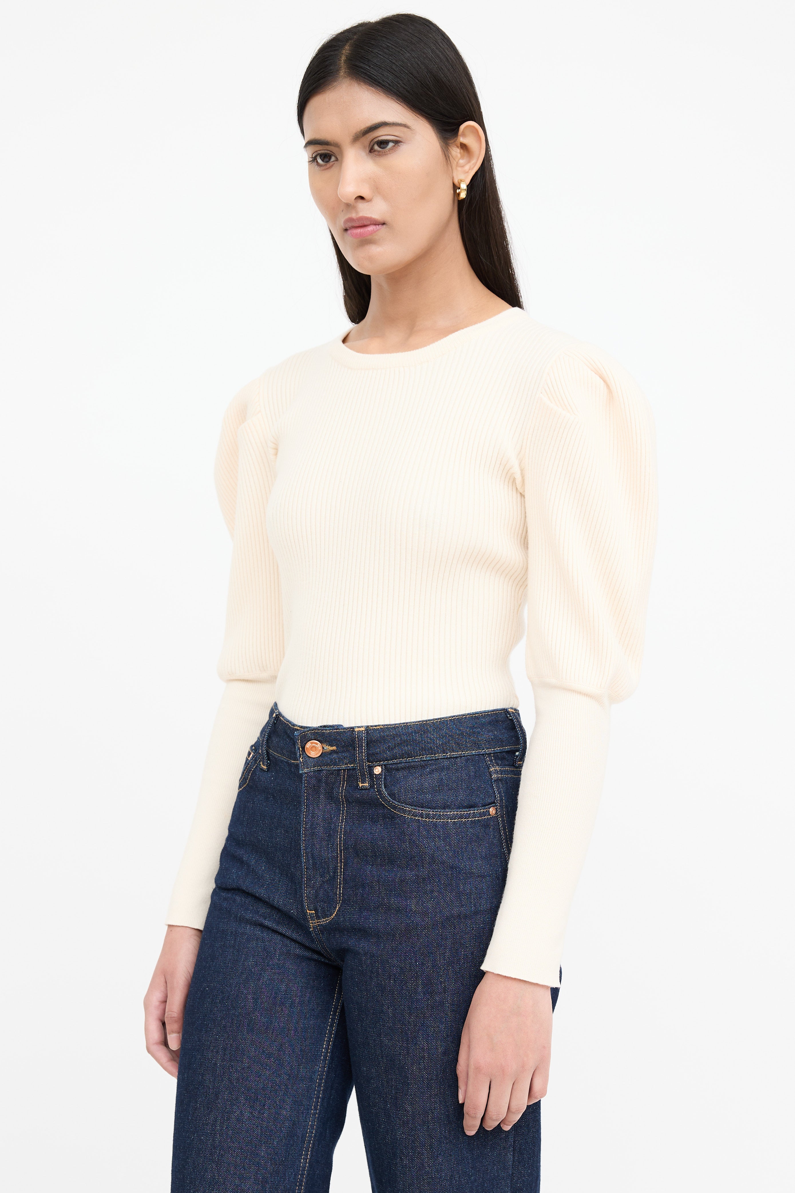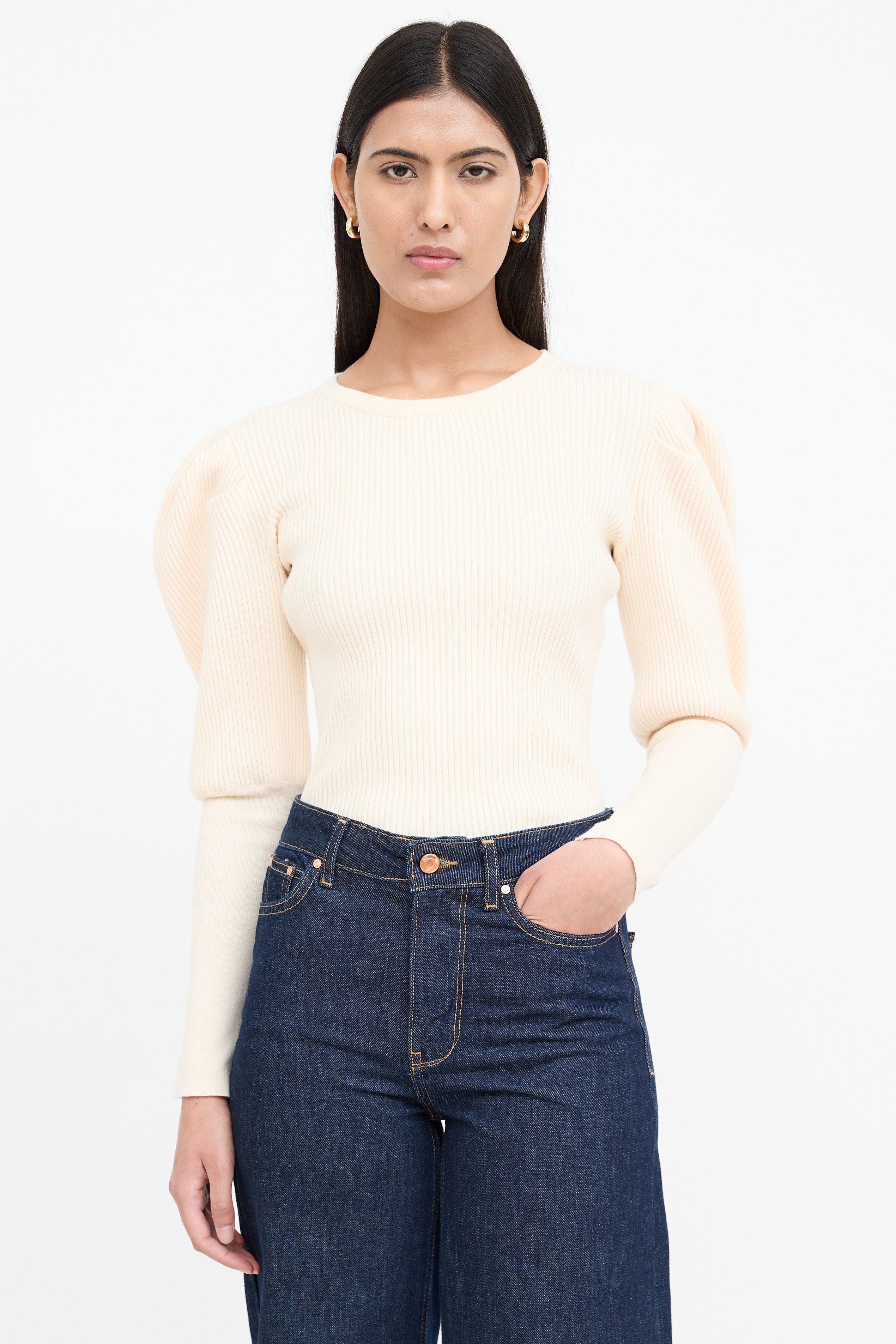 Pre-owned Jonathan Simkhai Standard cream long sleeve ribbed top featuring round neckline, leg of mutton sleeves and ribbing throughout.