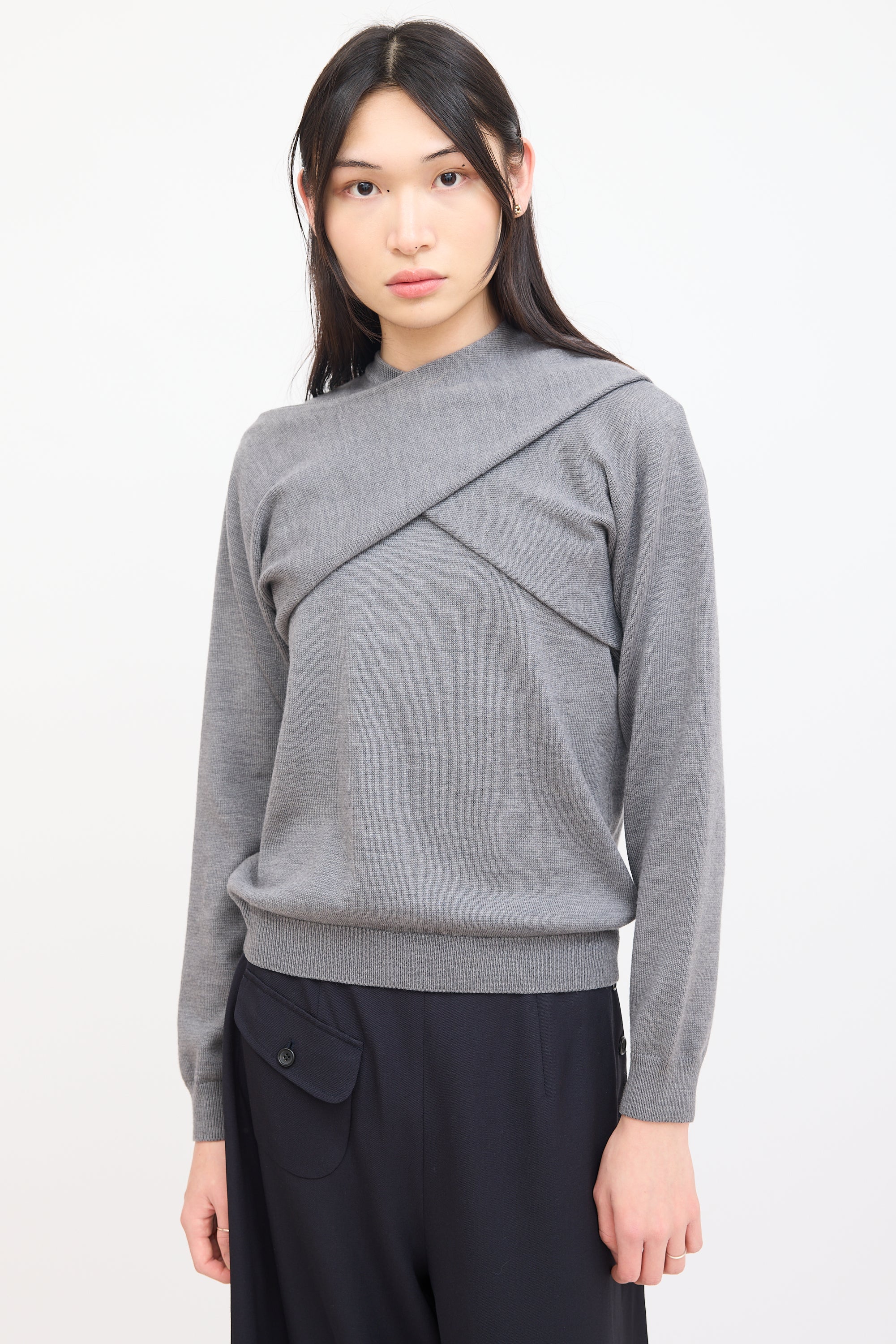 Pre-owned JW Anderson grey wool sweater featuring round neckline, criss cross overlay front, long sleeves, and ribbed hem.