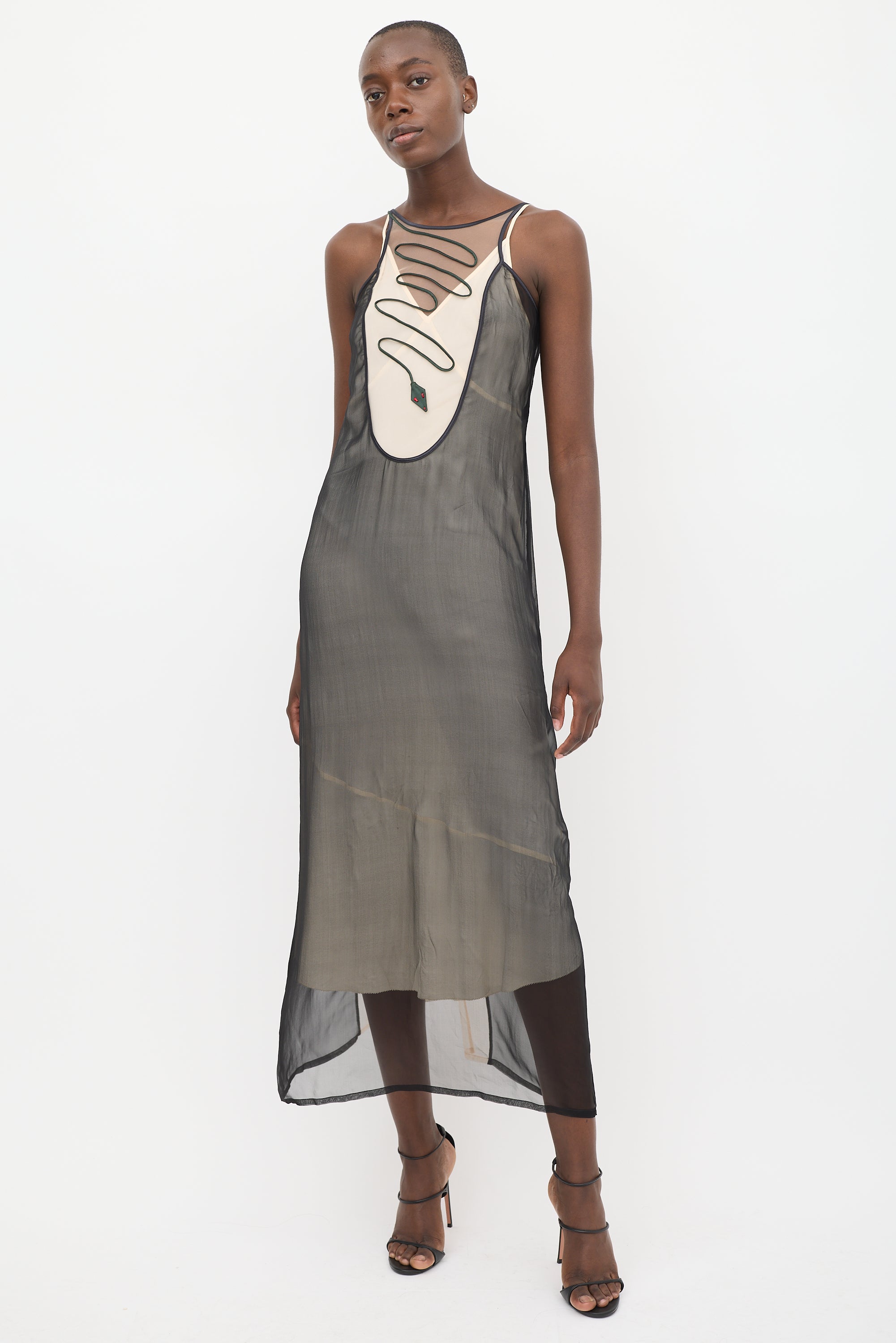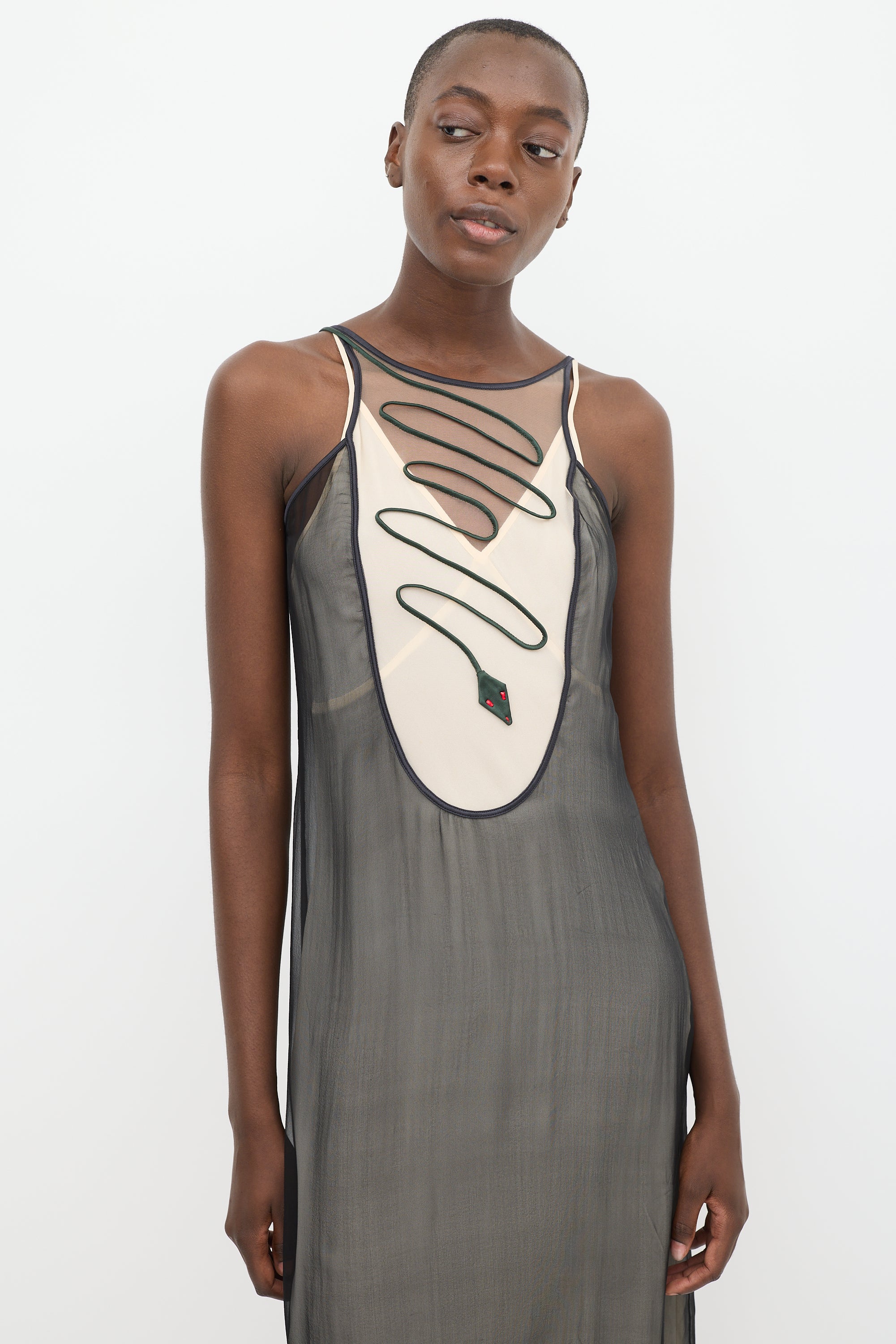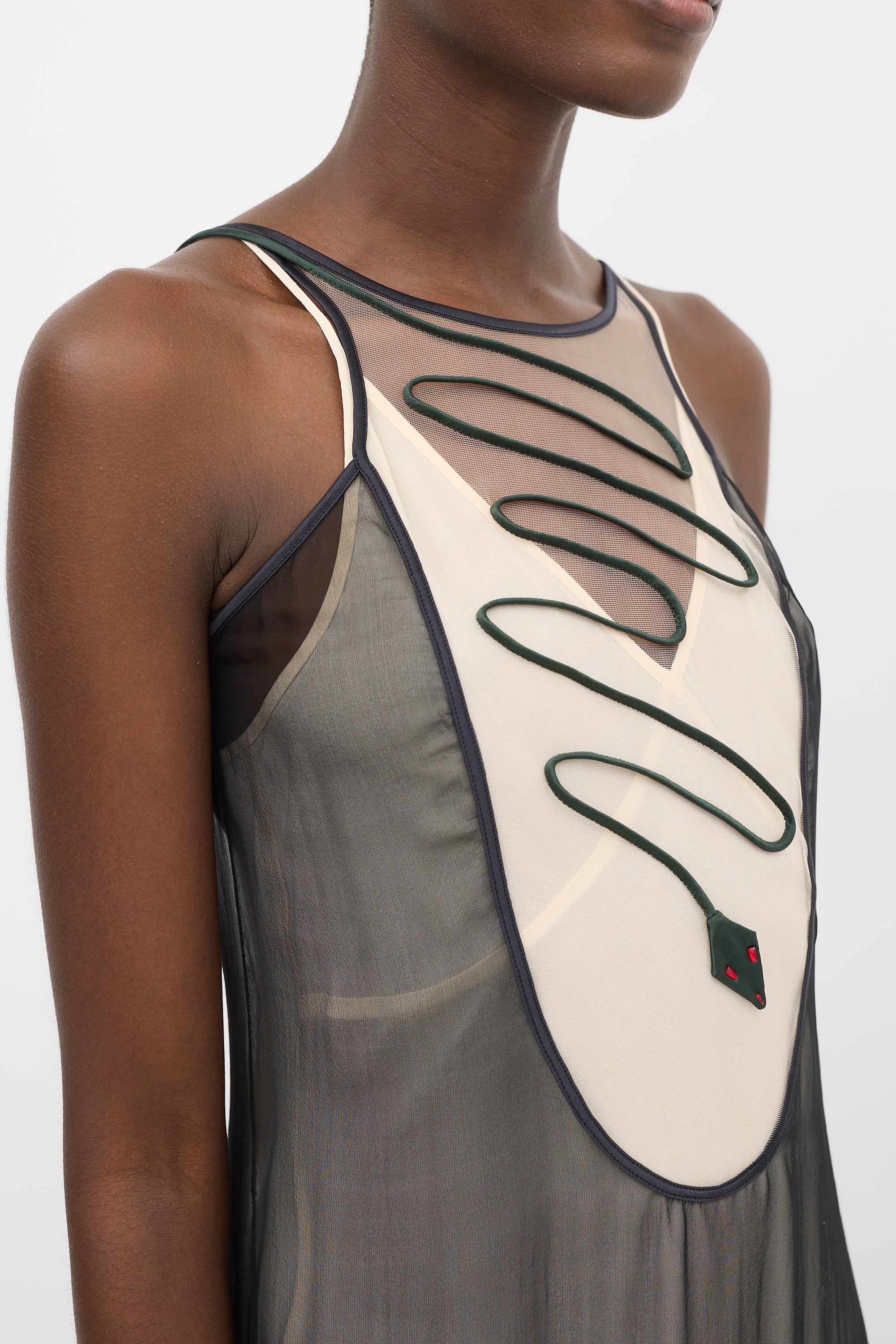 Pre-owned La Perla black silk sheer dress featuring a green embroidered snake motif at bust with jewel detail, round neckline, sleeveless styling, and red wrapped button closure at back. Styled with a white slip underneath.
