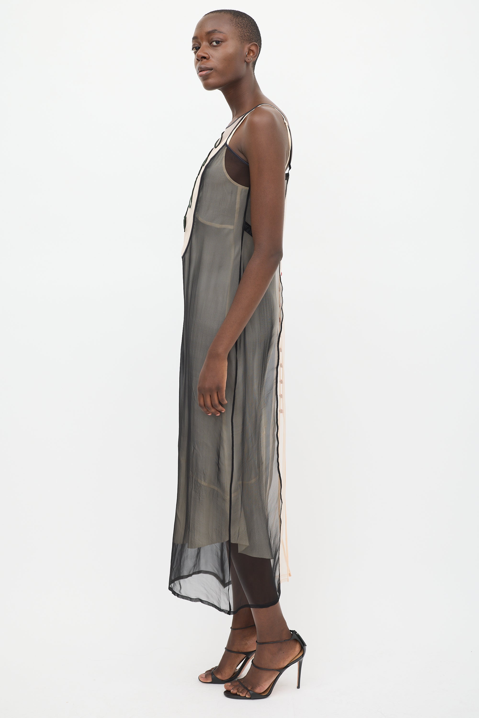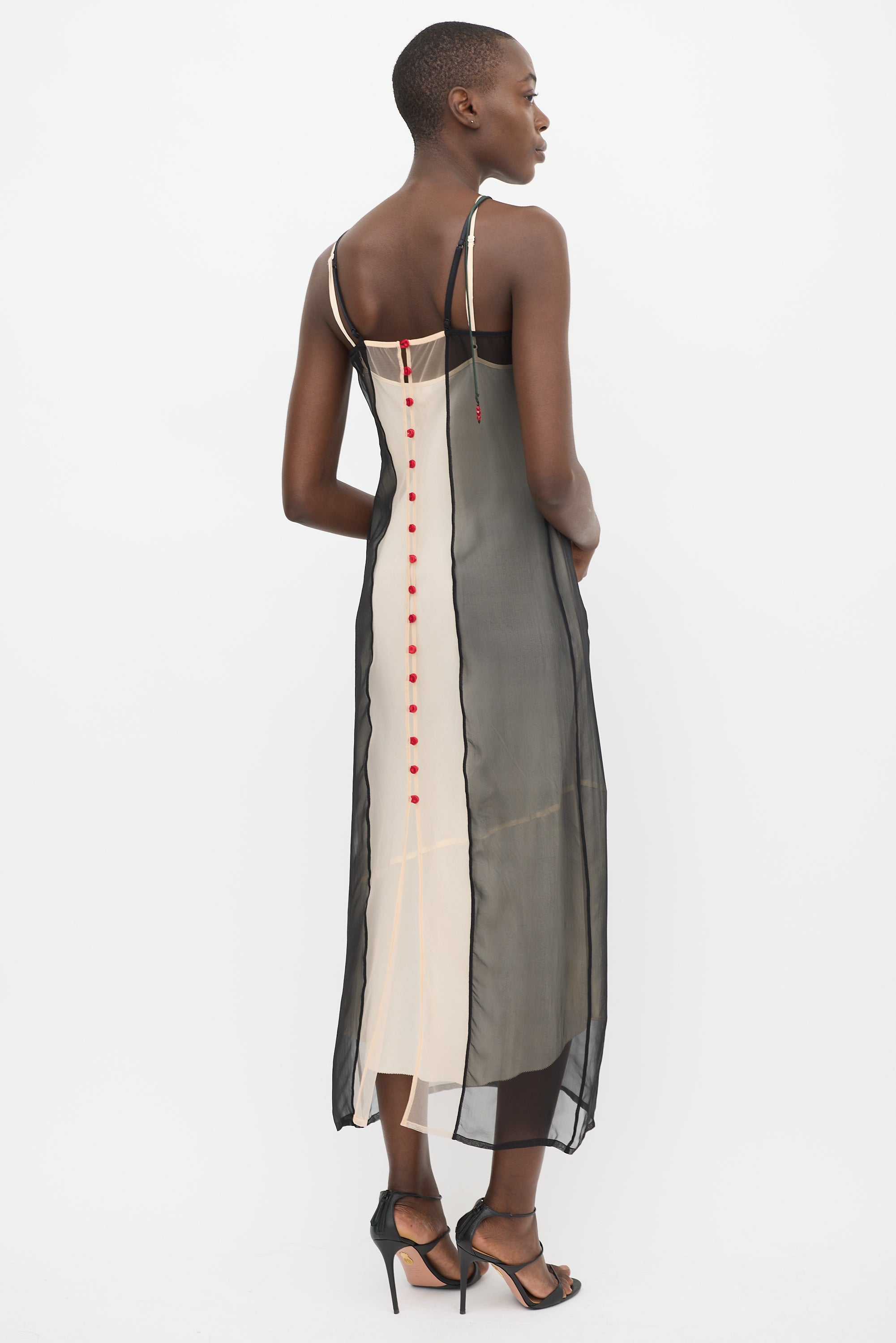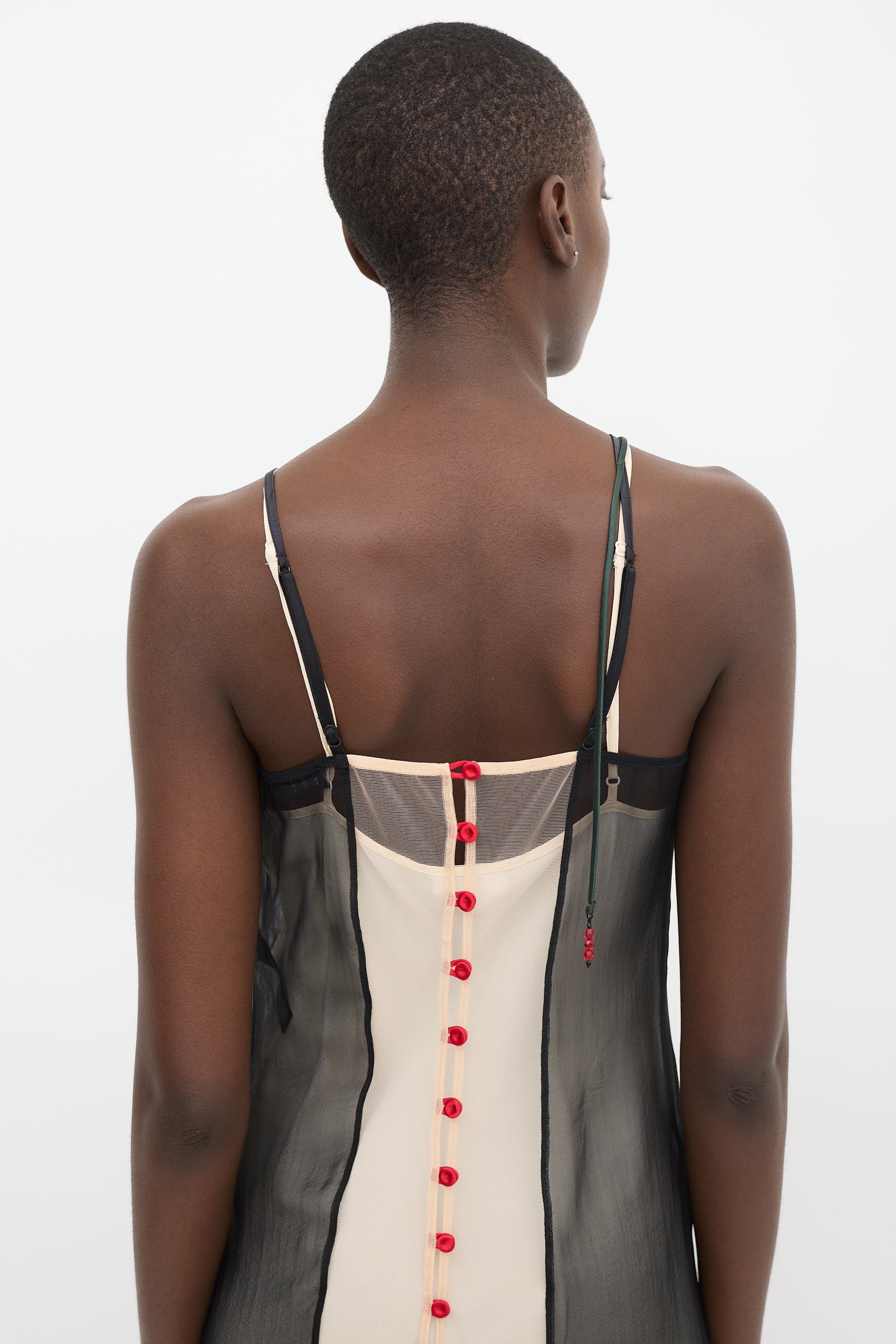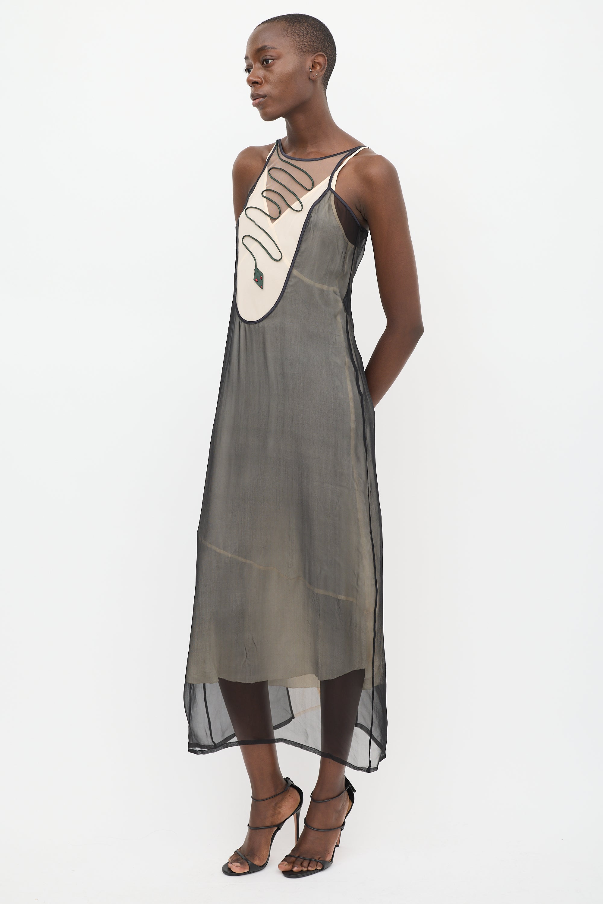 Pre-owned La Perla black silk sheer dress featuring a green embroidered snake motif at bust with jewel detail, round neckline, sleeveless styling, and red wrapped button closure at back. Styled with a white slip underneath.