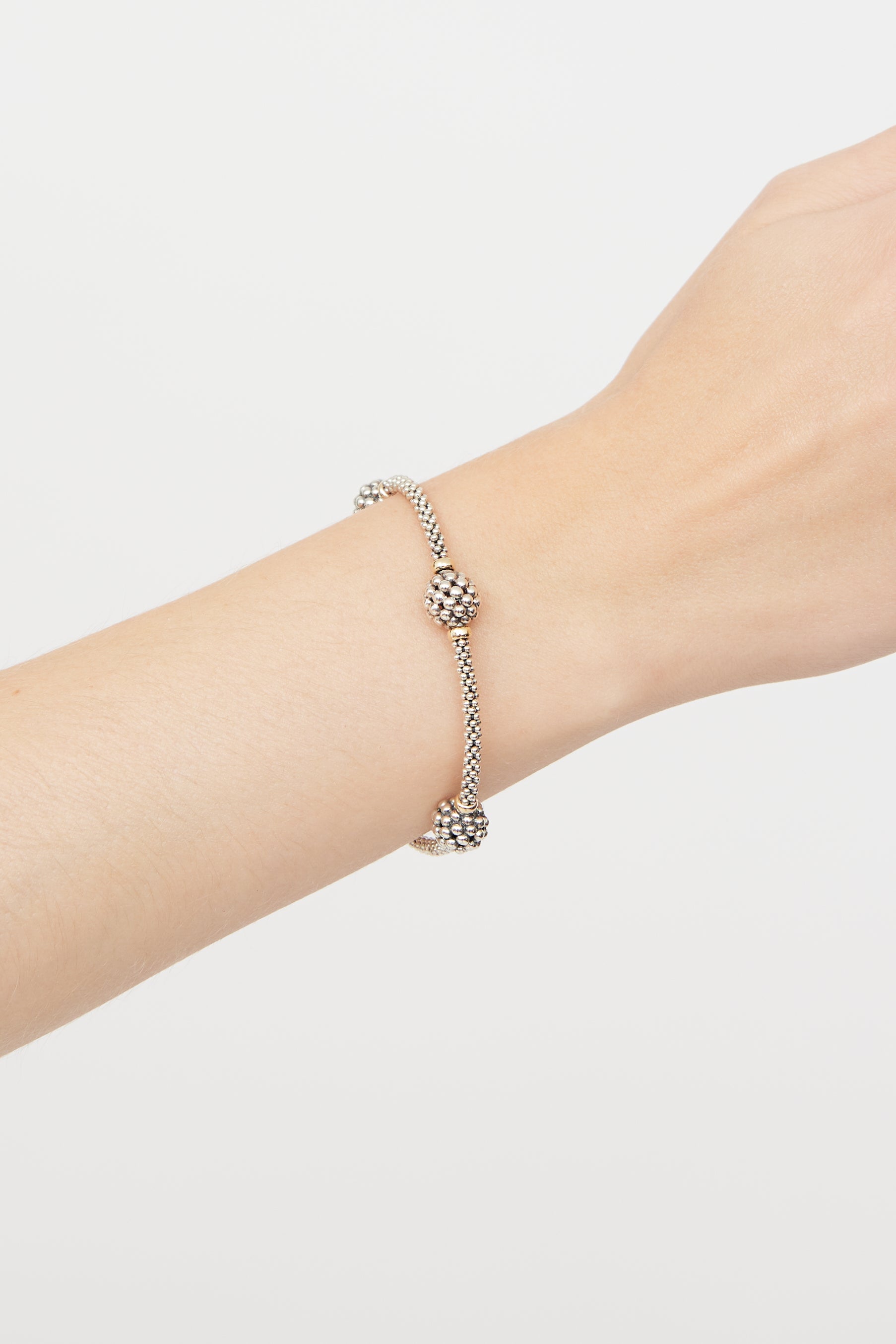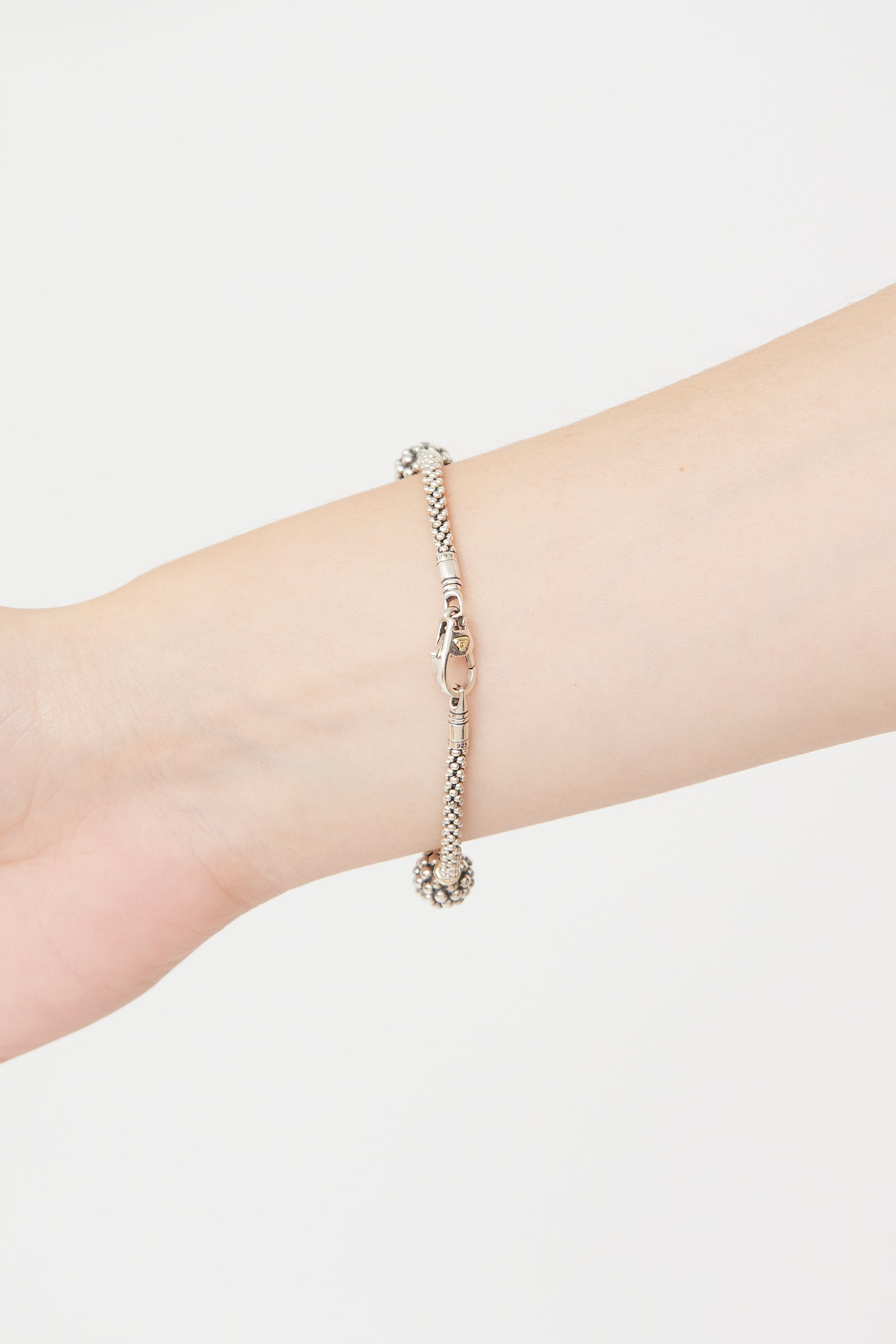 Pre-owned Lagos sterling silver Caviar Forever bracelet featuring silver beaded chain, gold tone beads and three larger beads and claw clasp closure. Stamped "920" and "750".