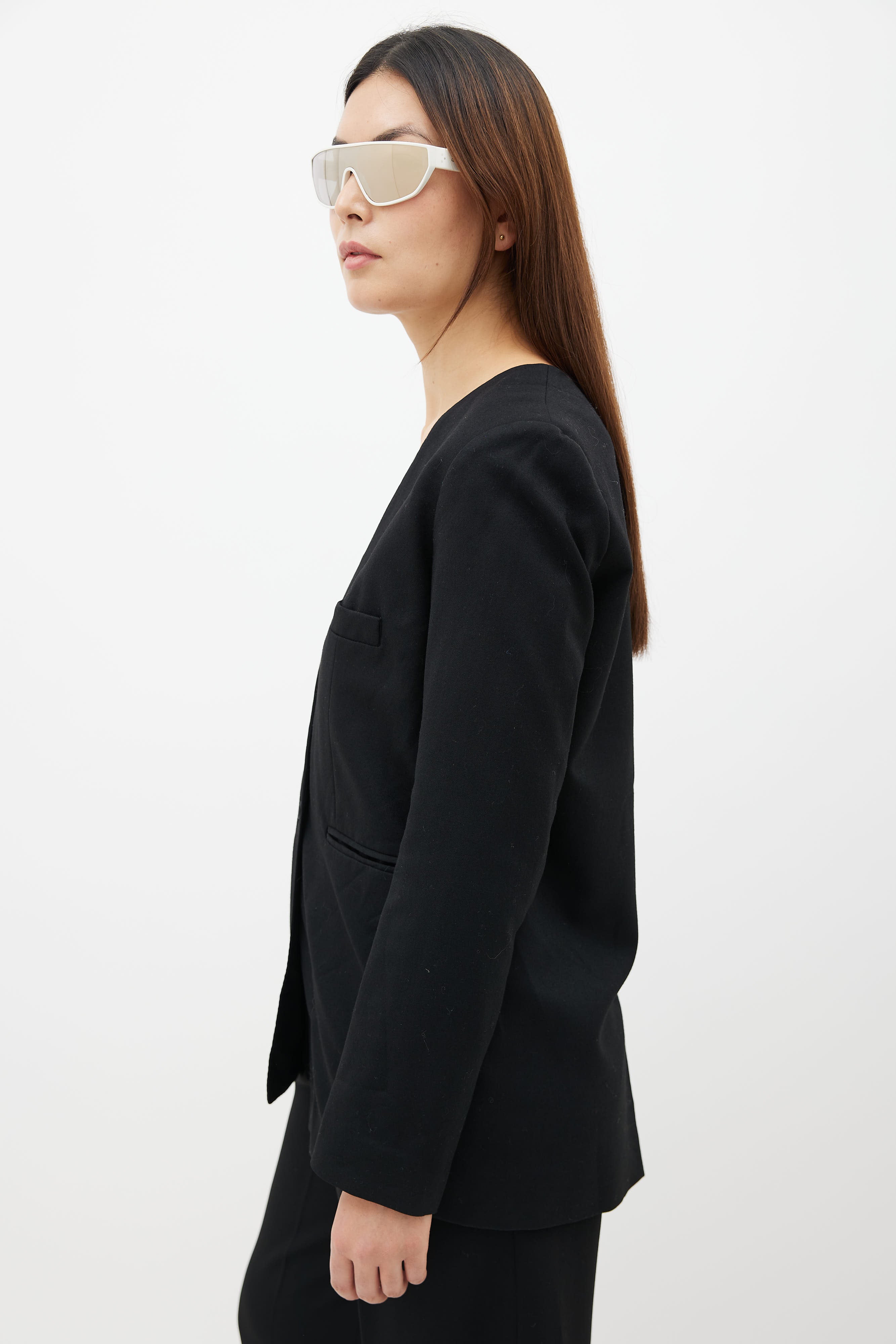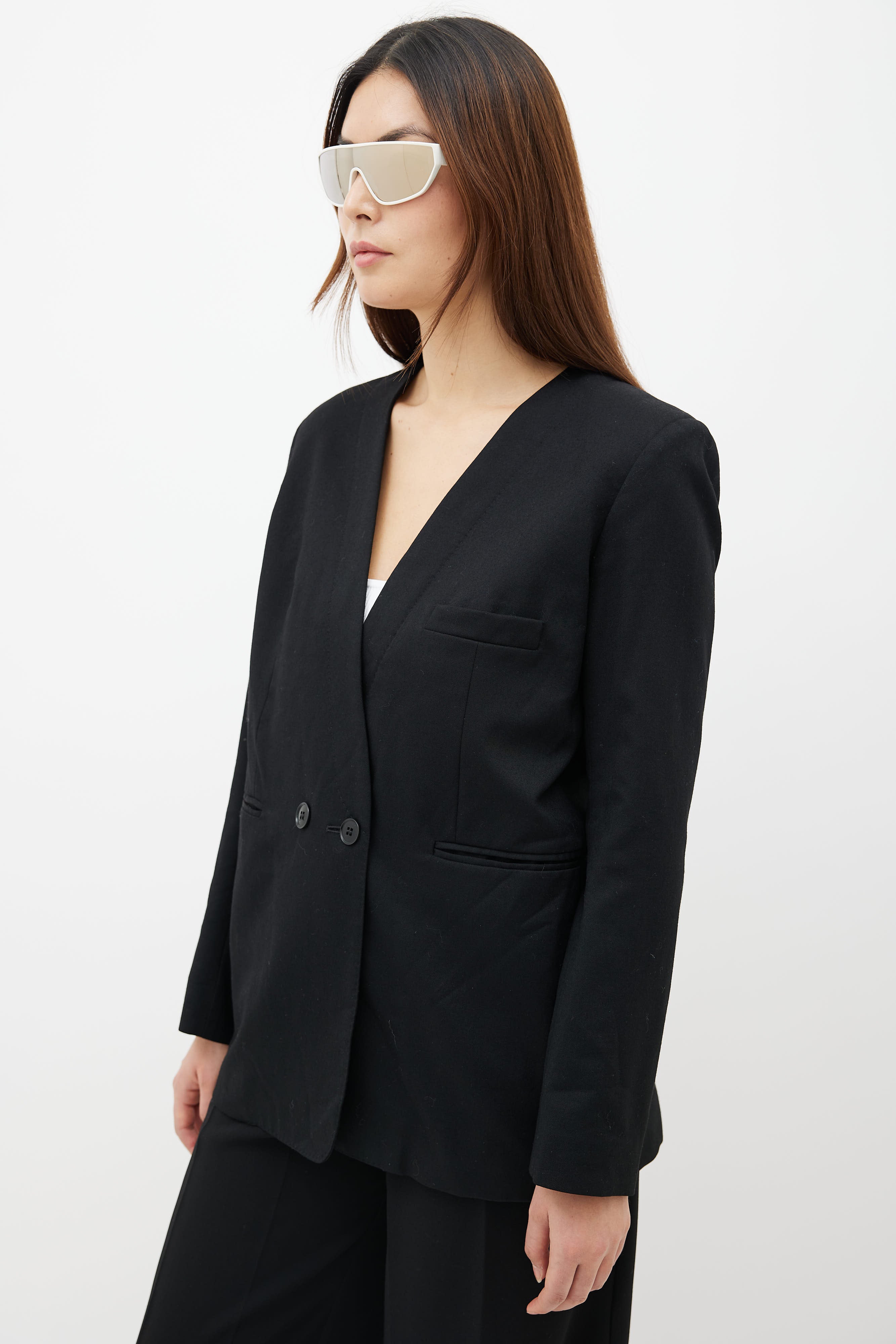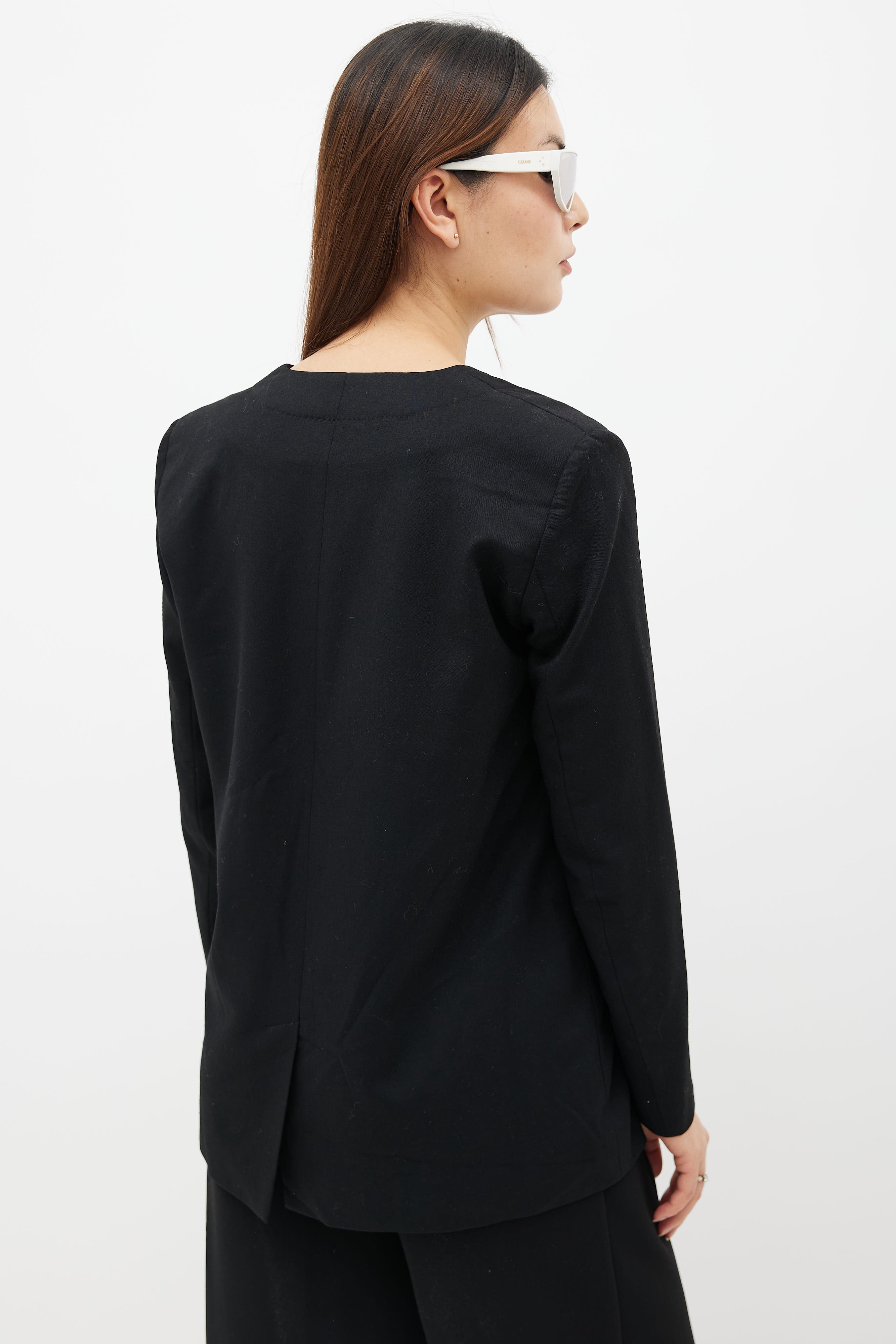 Pre-owned Lemaire black wool collarless blazer featuring v-neckline, long sleeves, three pocket styling at front, two front button closure and fully lined interior.