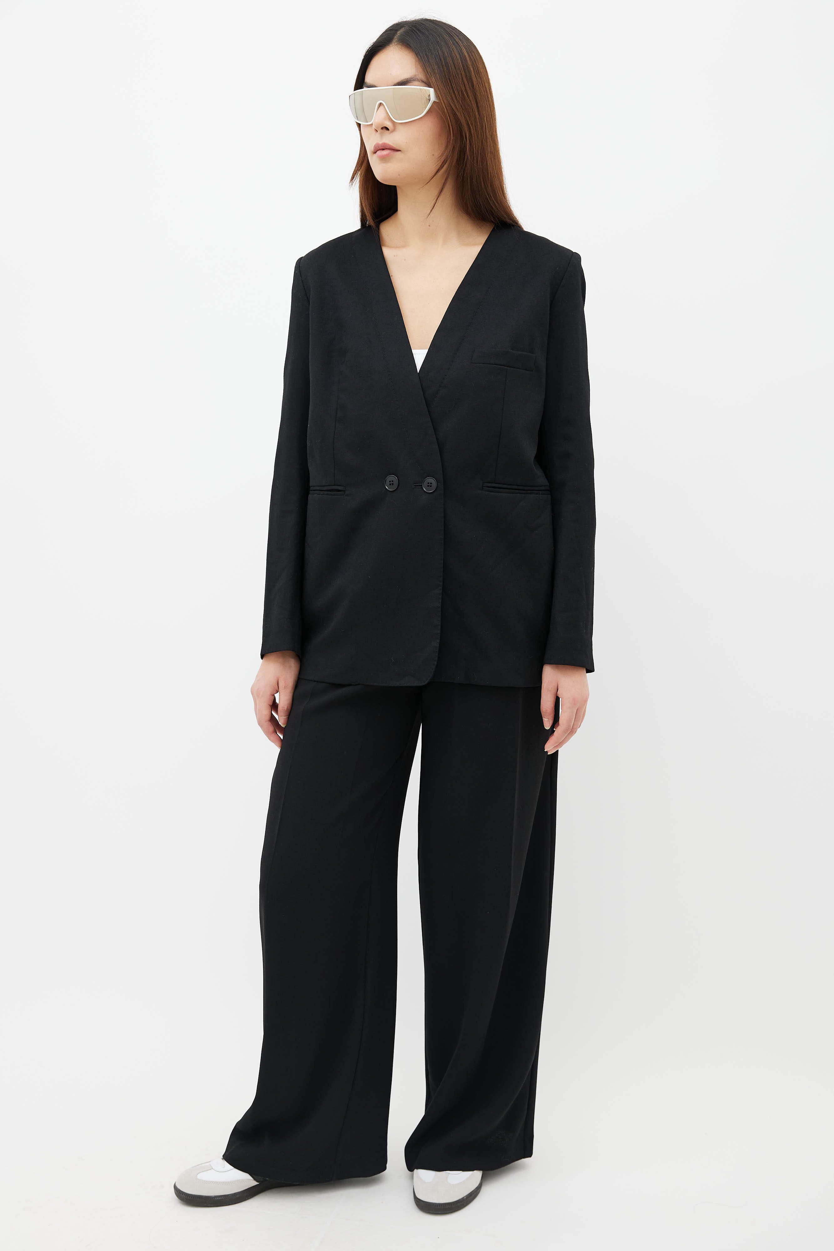 Black Wool Collarless Two-Button Blazer Large Size Guide