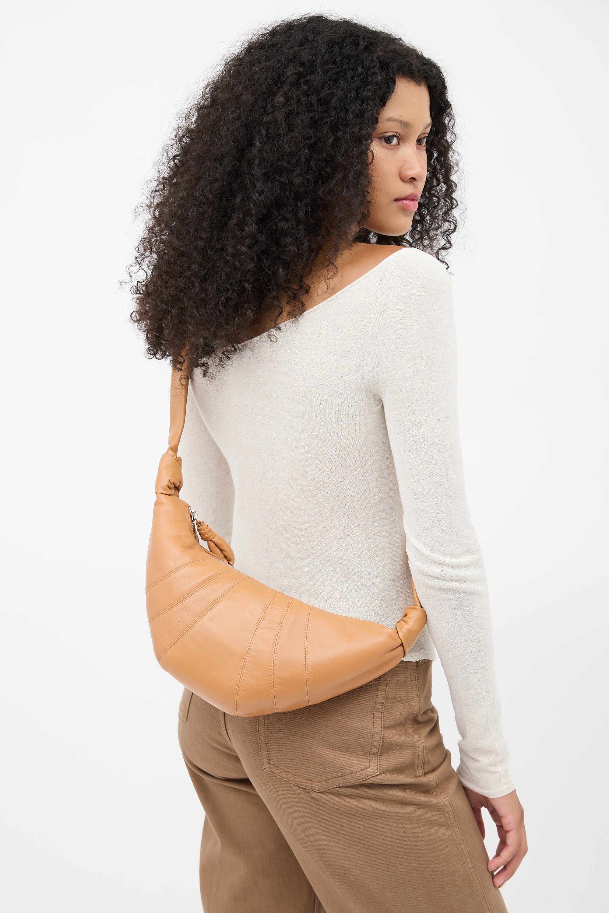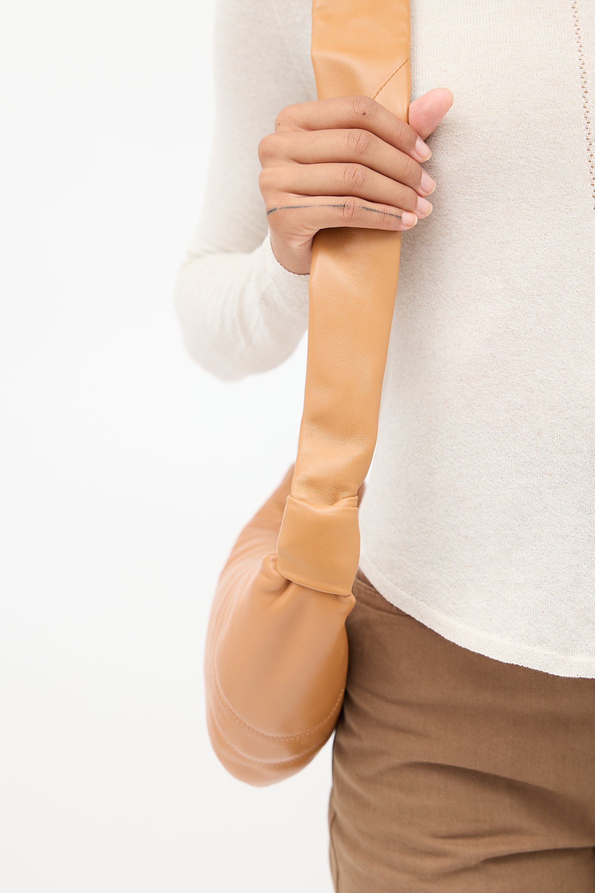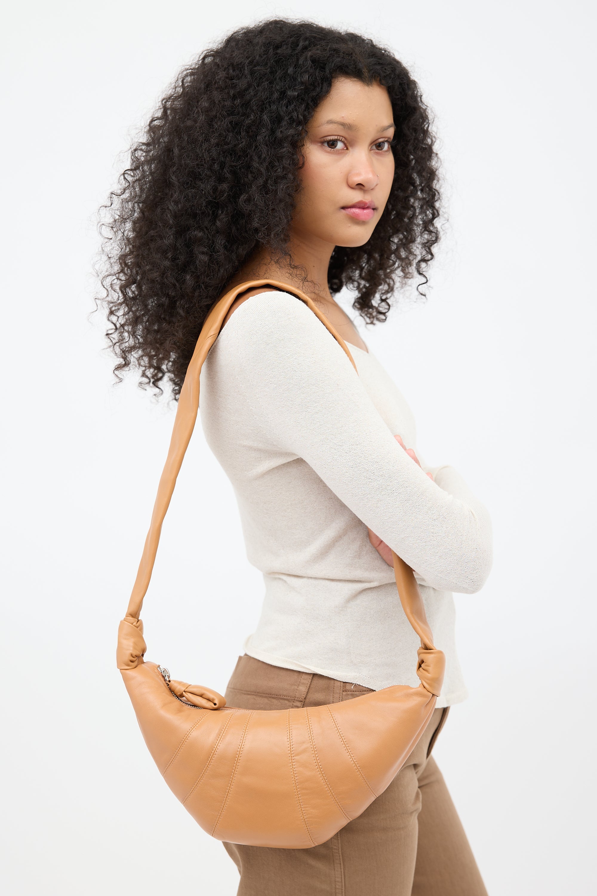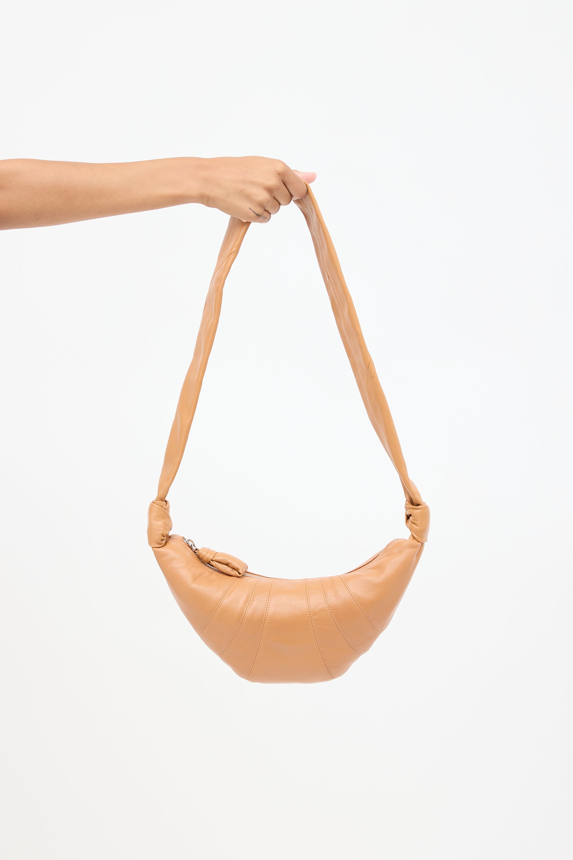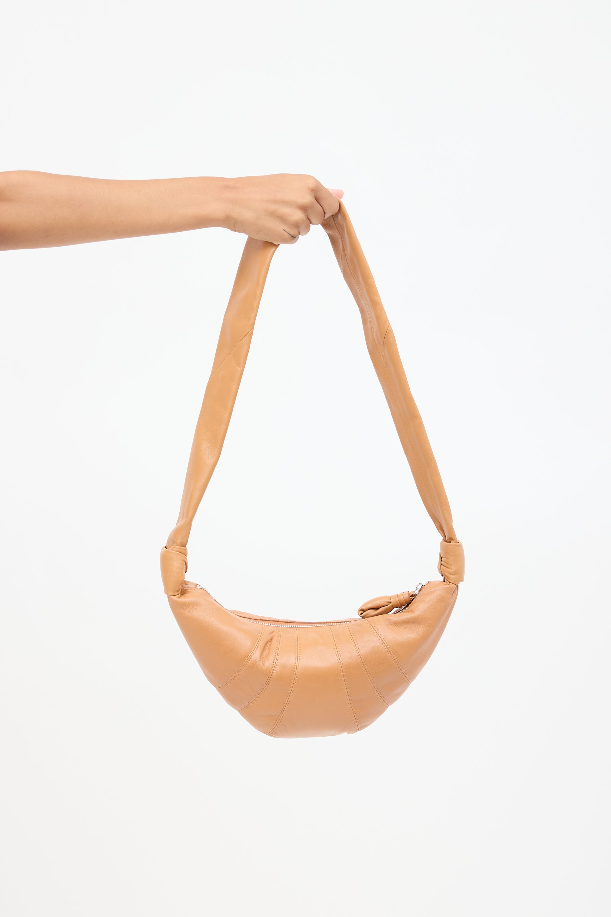 Pre-owned Lemaire brown leather small Croissant bag featuring one flat shoulder strap with knotted details at side, tonal stitching, zip closure at top with knotted leather charm, and one main compartment with canvas lining. Comes with original dust bag.