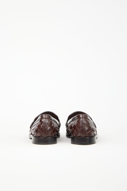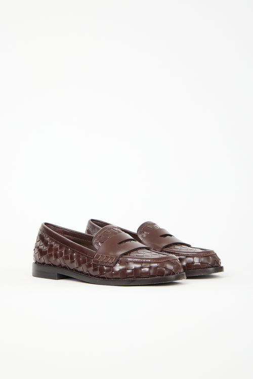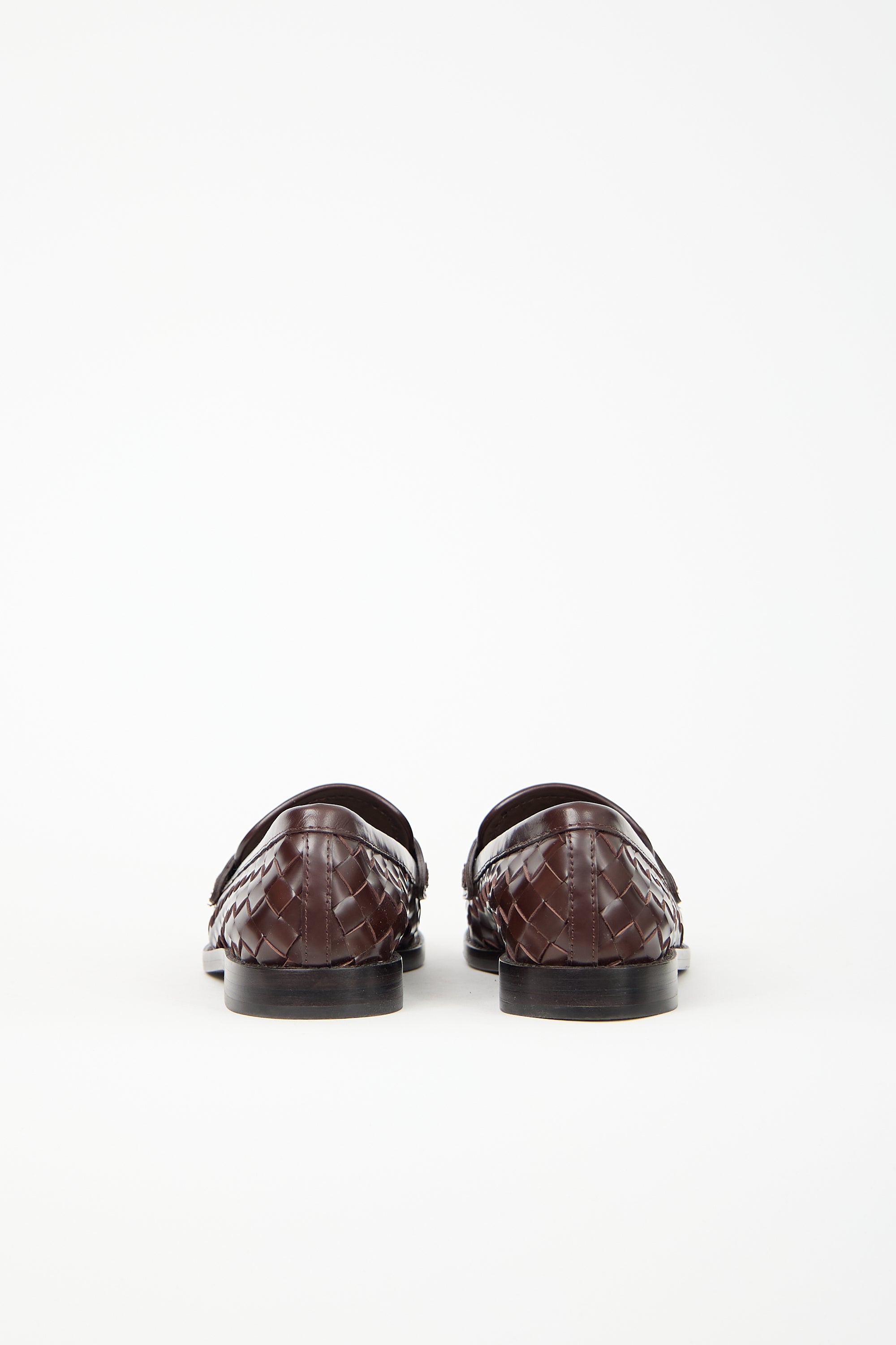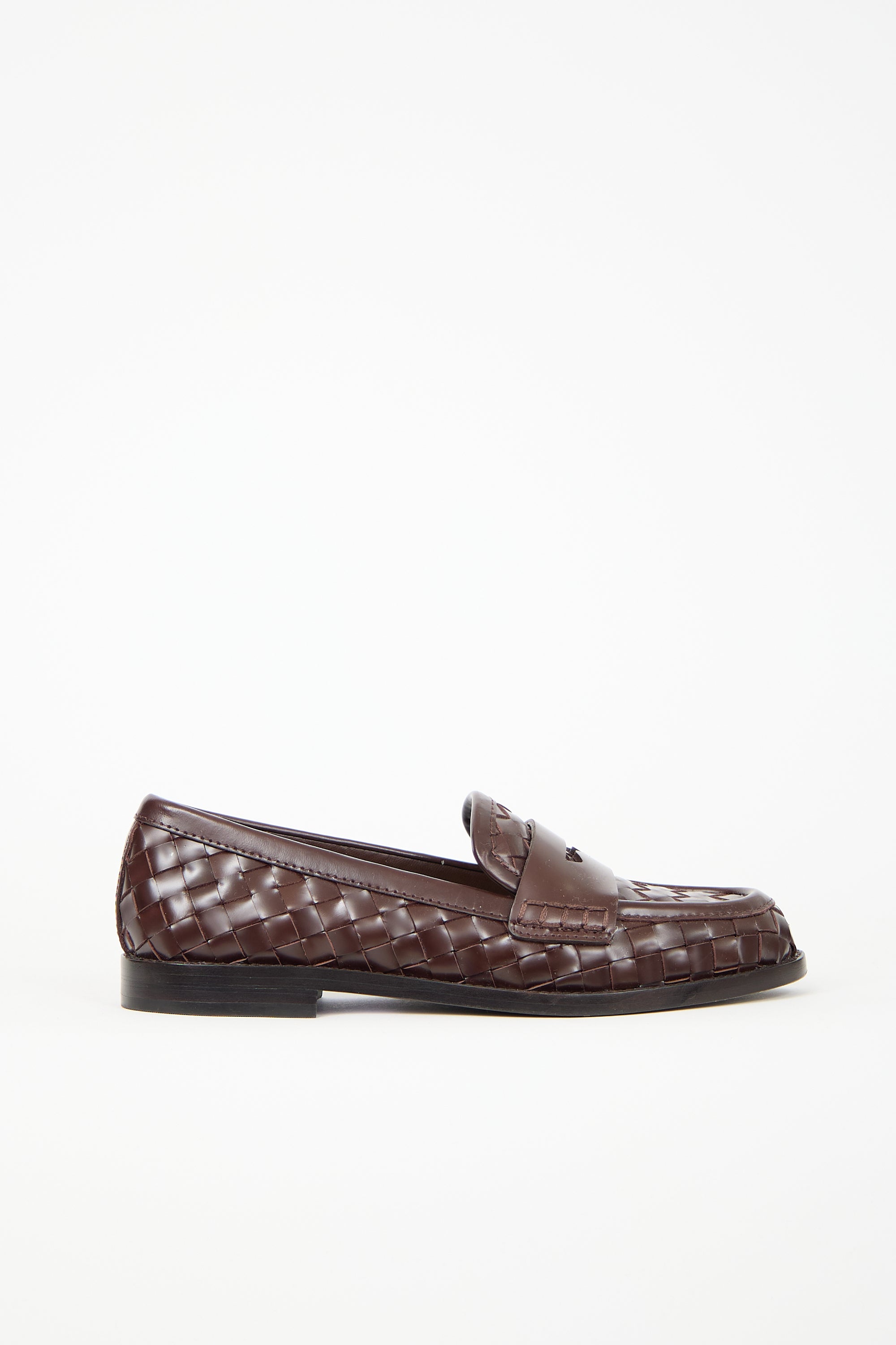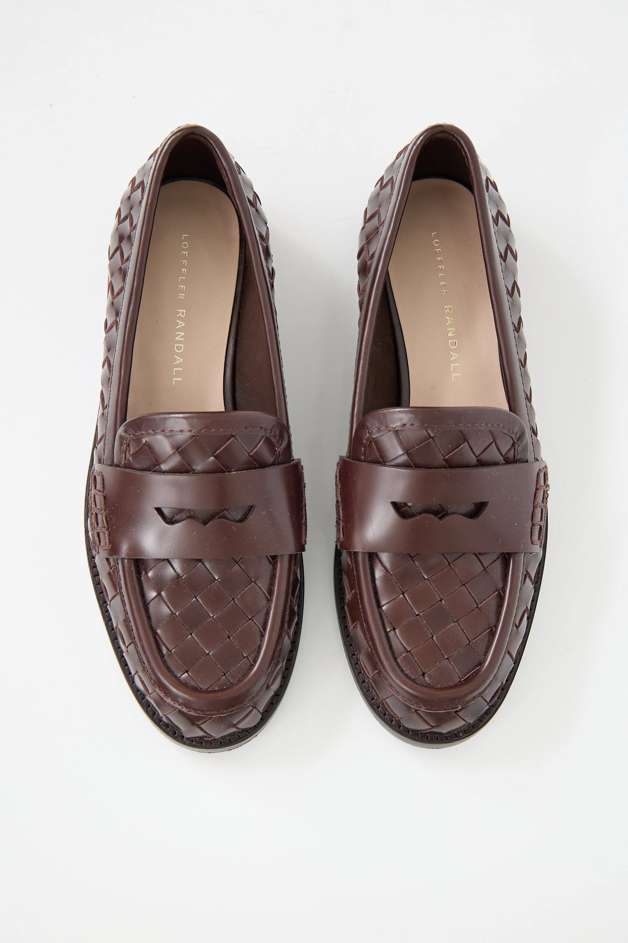 Pre-owned Loeffler Randall brown leather Rachel loafers featuring rounded toe, woven upper, and notched topline.