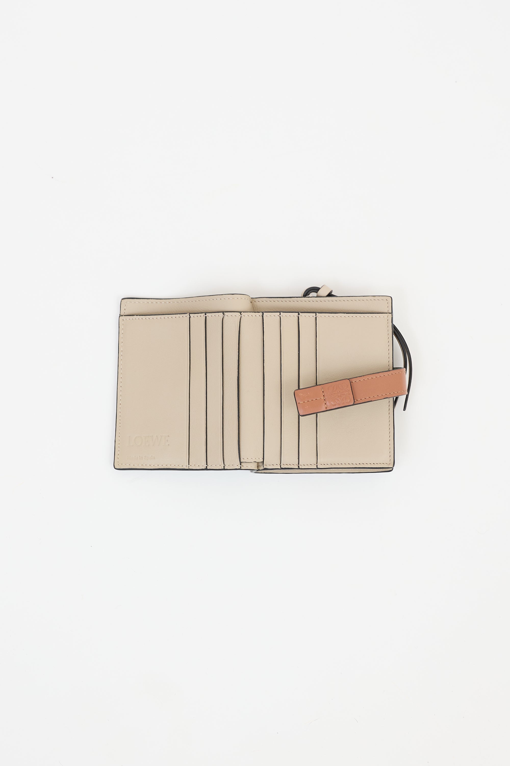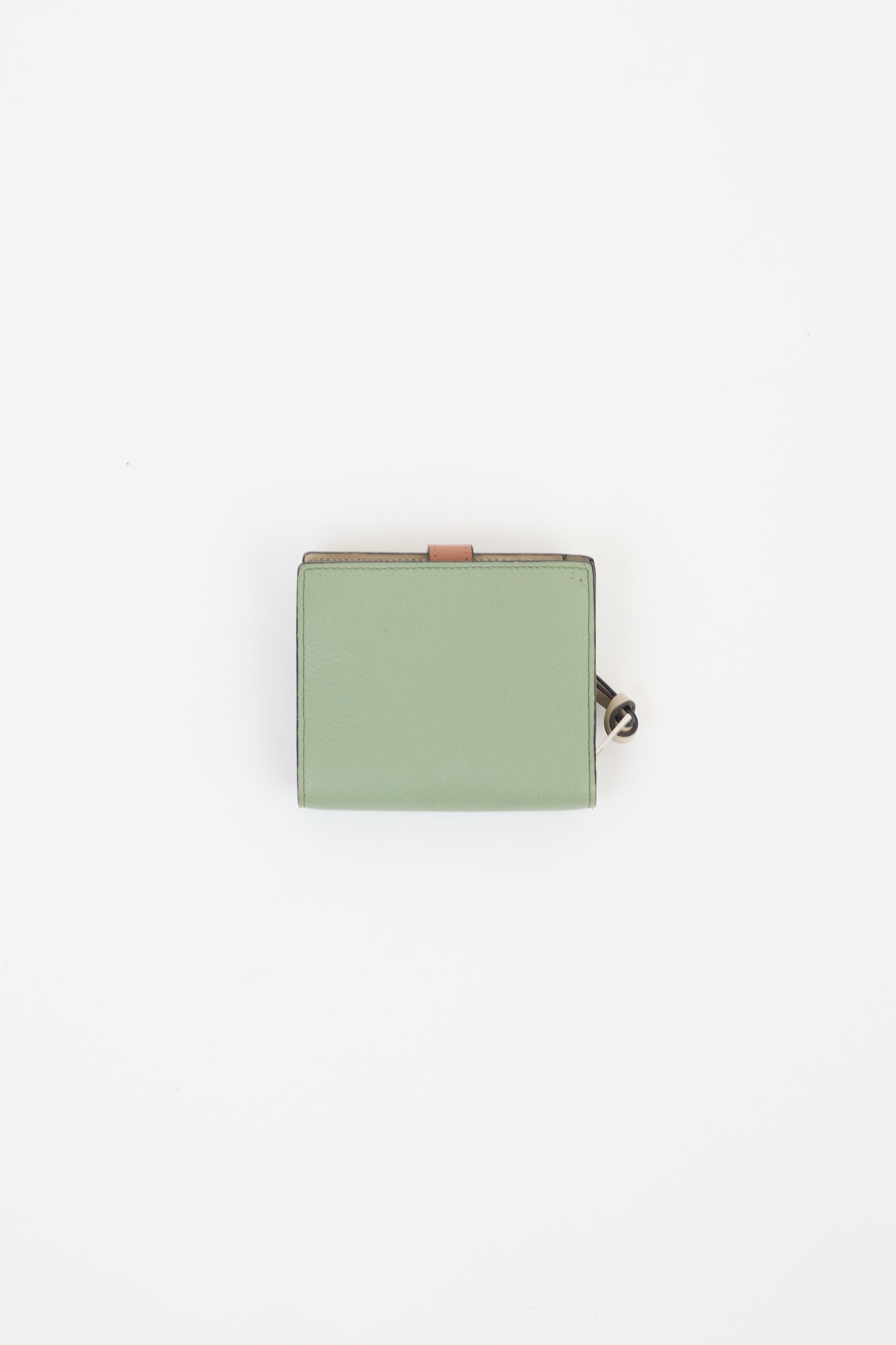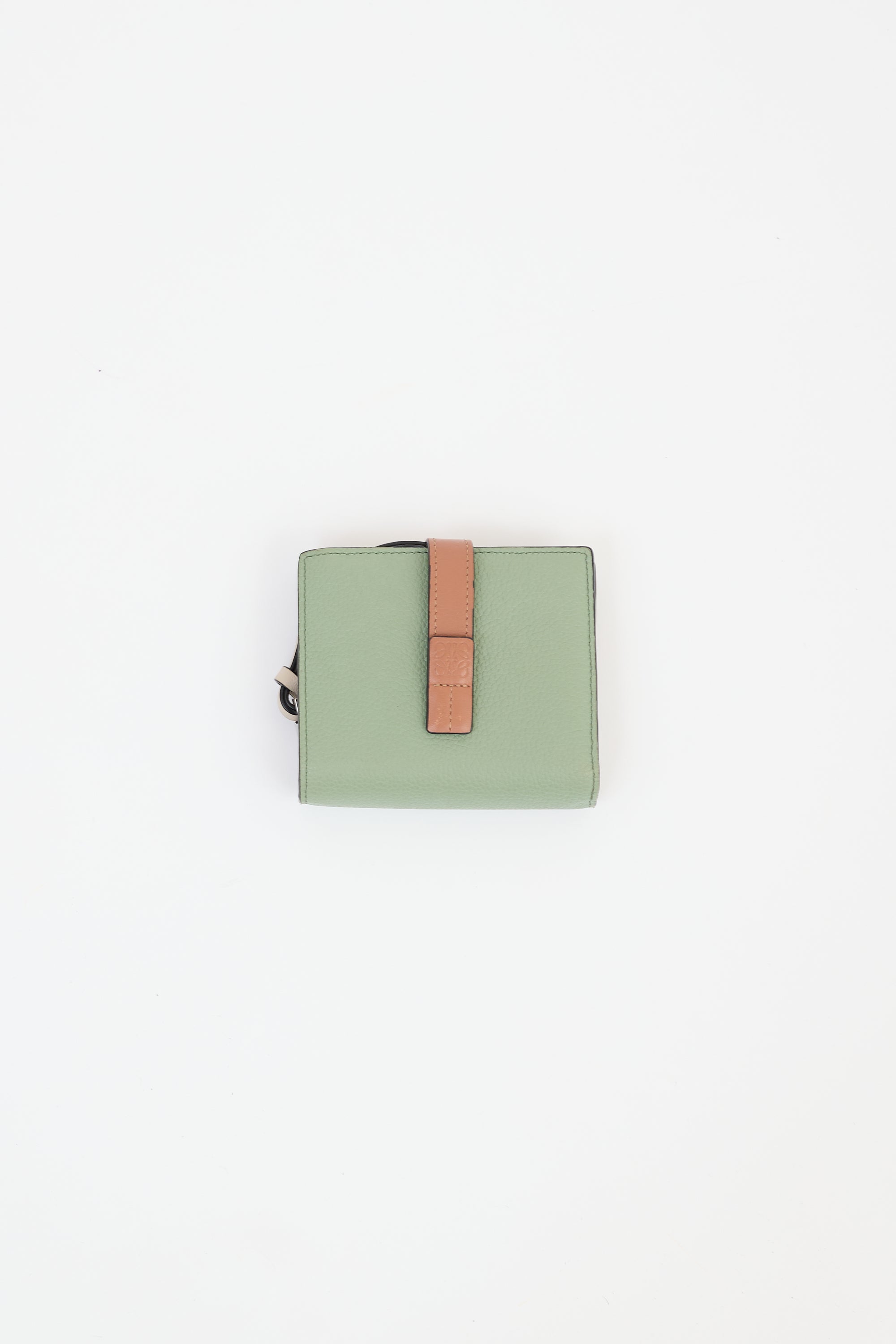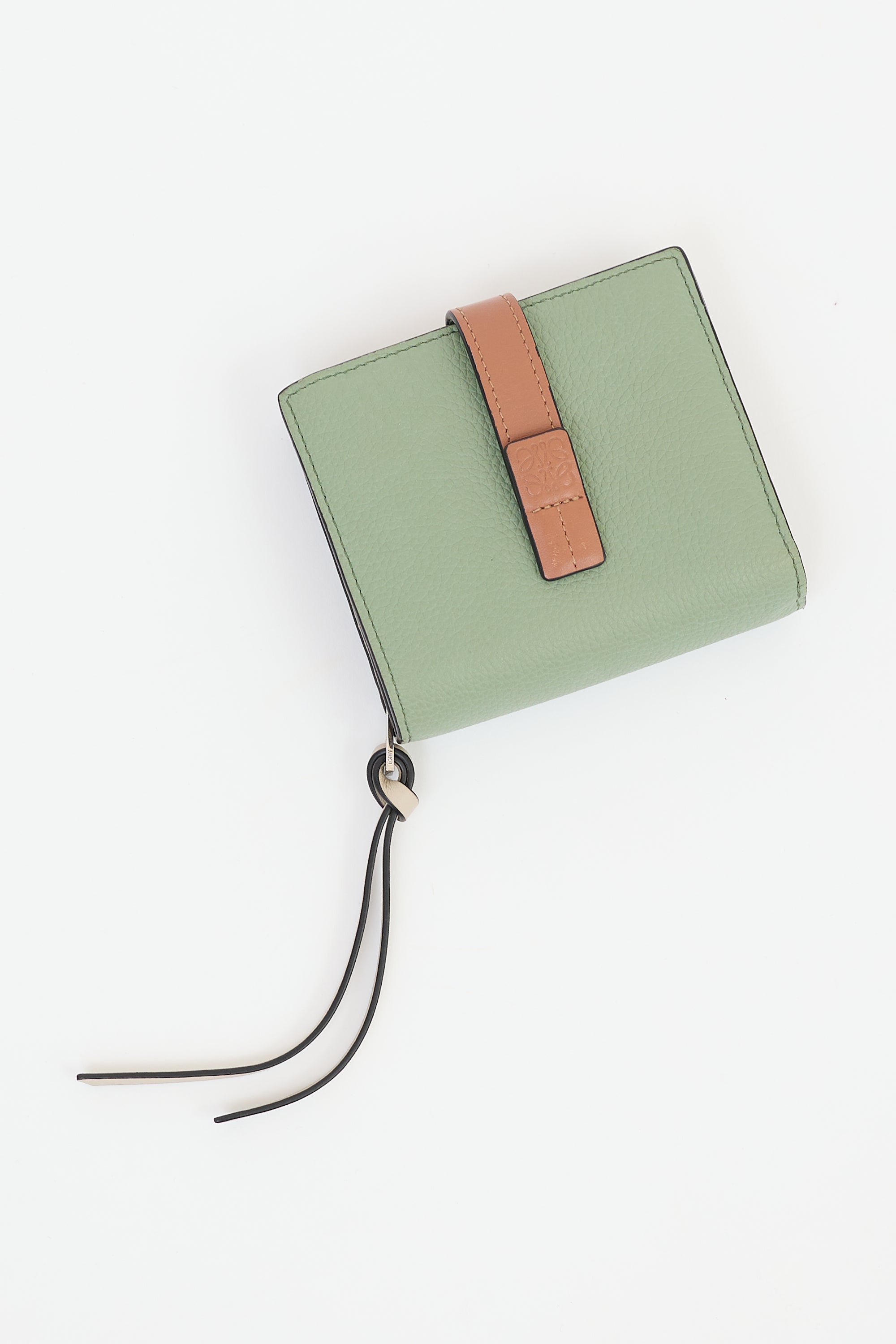 Pre-owned Loewe green compact wallet in soft grained calfskin featuring brown leather strap with debossed Anagram, snap button closure, one main compartment, eight card slots, one bill compartment, zipped coin compartment, leather zip pull, and leather lining. Comes with original dust bag.