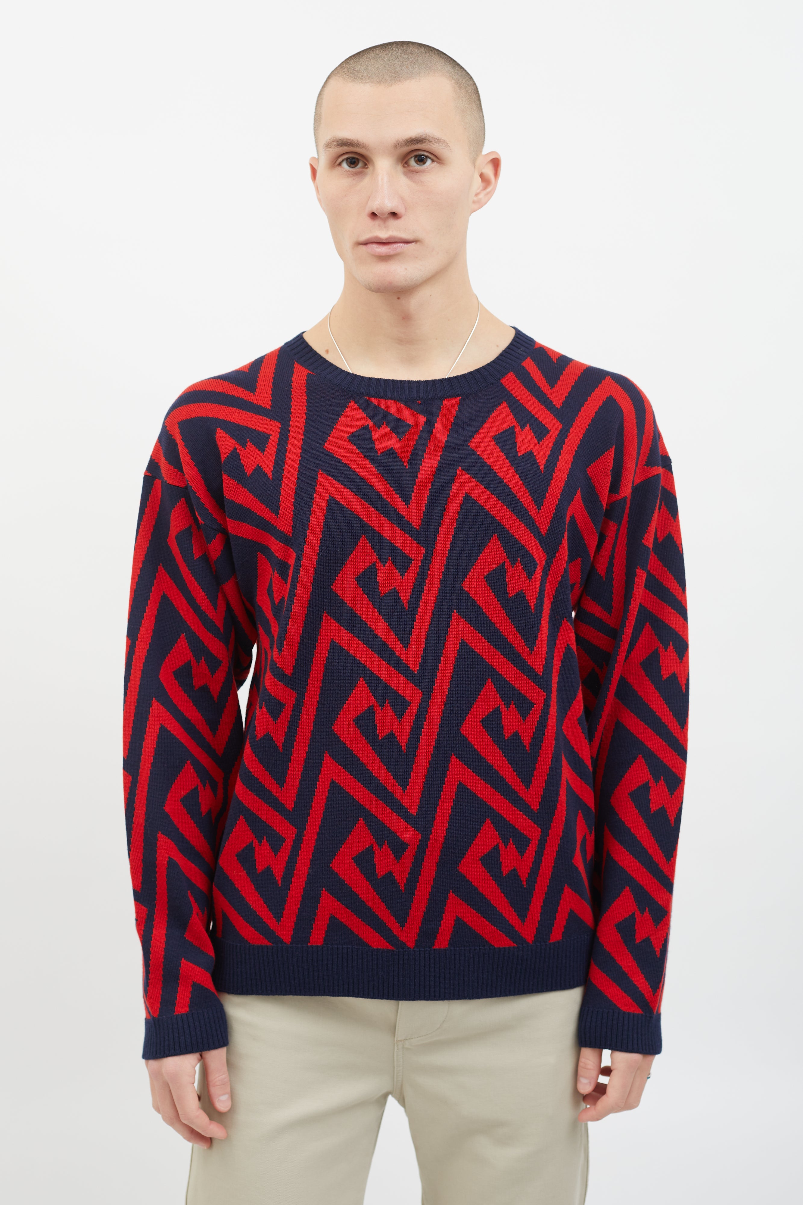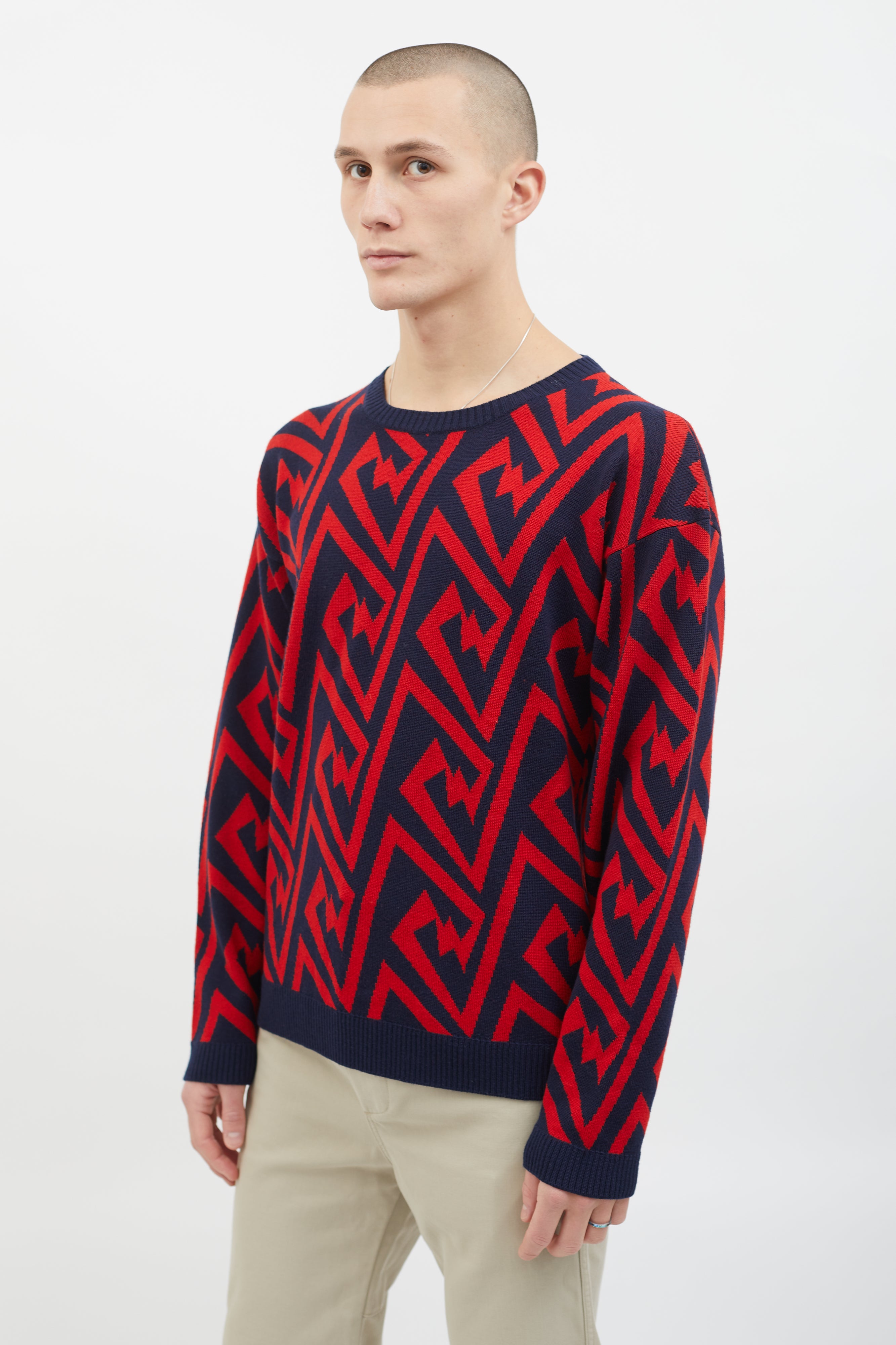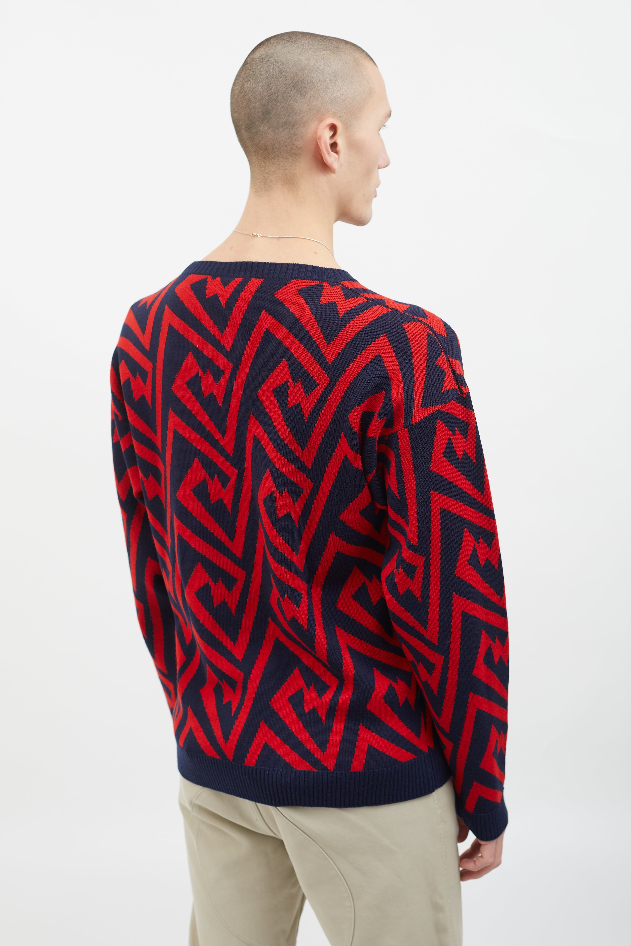 Pre-owned Loewe red and navy wool geometric pattern design sweater featuring rib knit crewneck, drop shoulder, red and navy geometric pattern throughout, rib knit at cuff and hem.