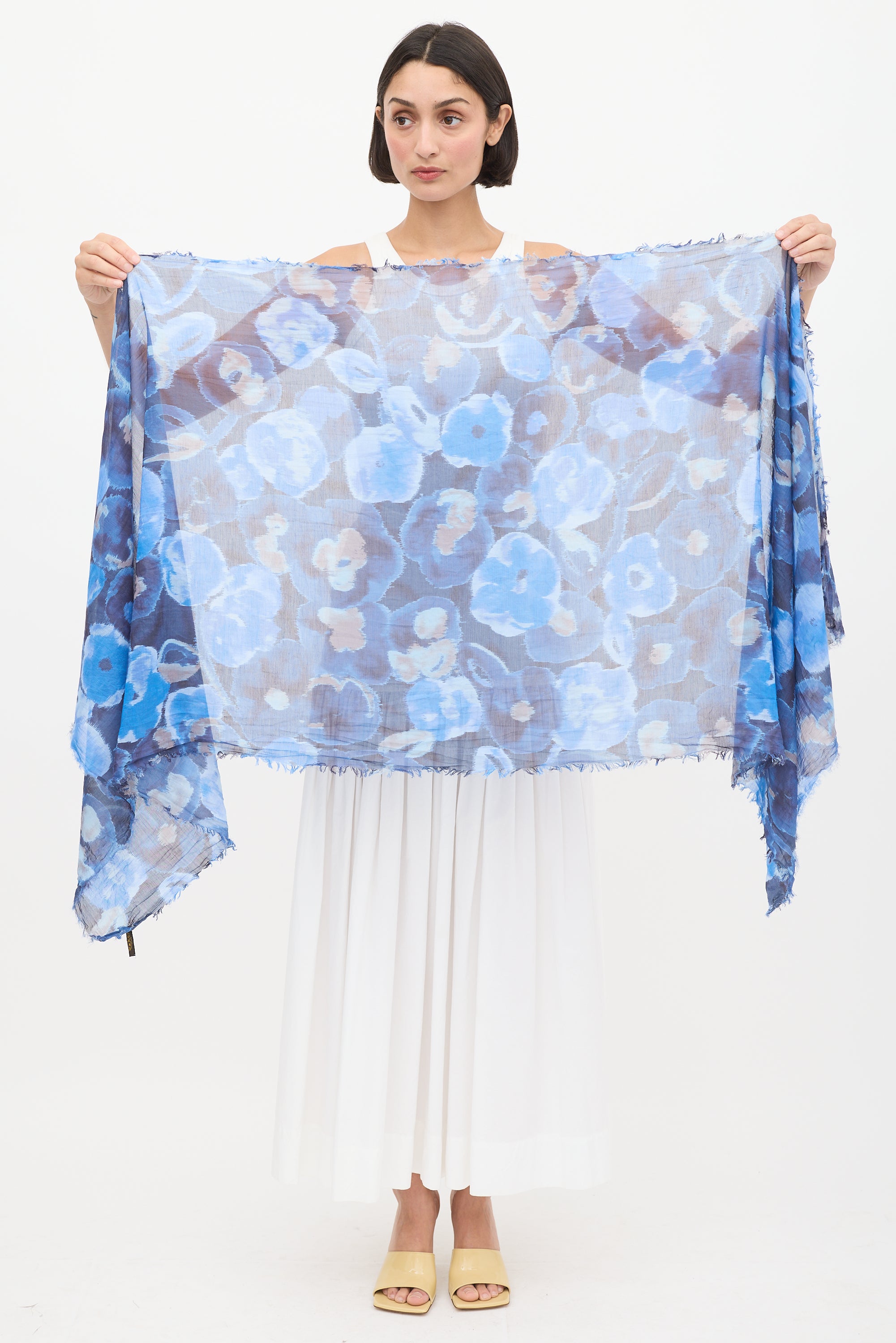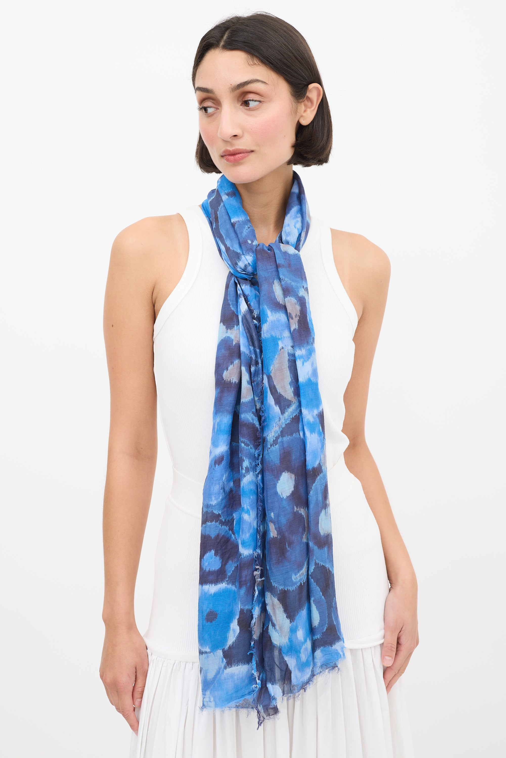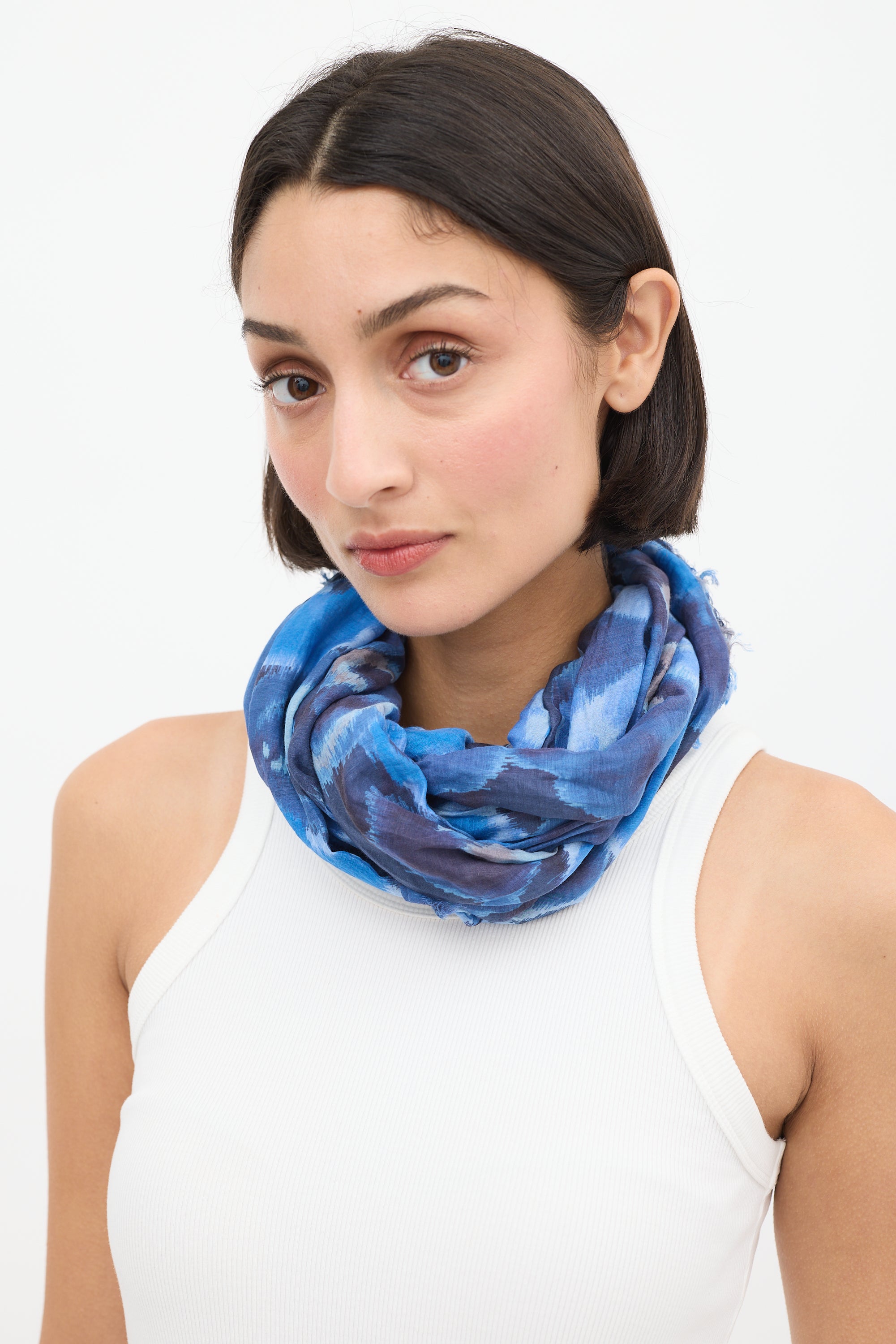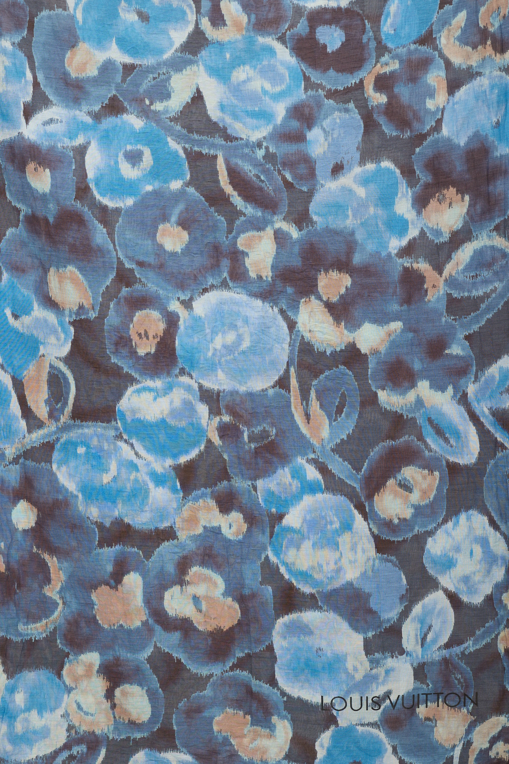 Pre-owned Louis Vuitton blue scarf featuring a tonal circular pattern throughout, logo print at corner, and fringe hem.