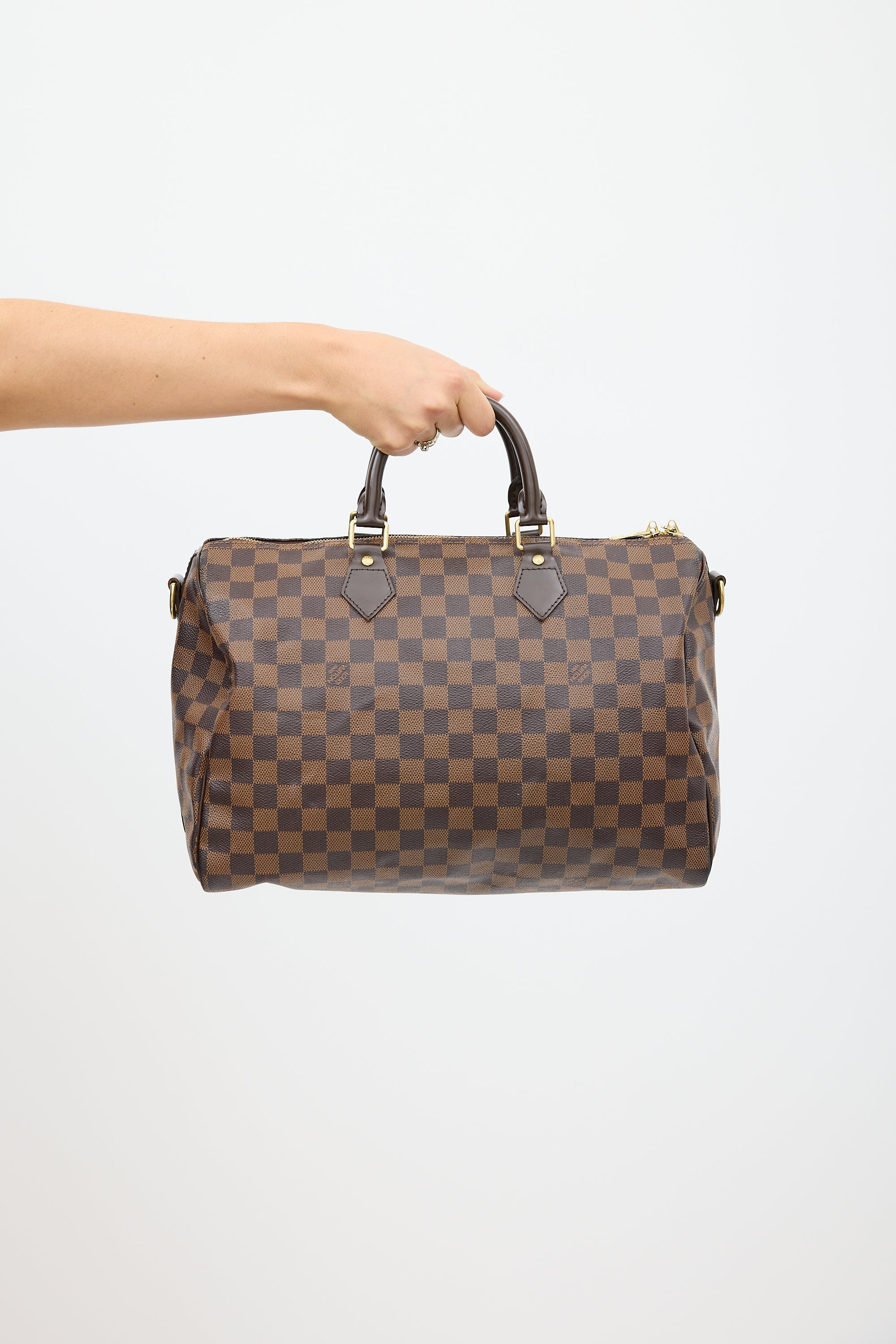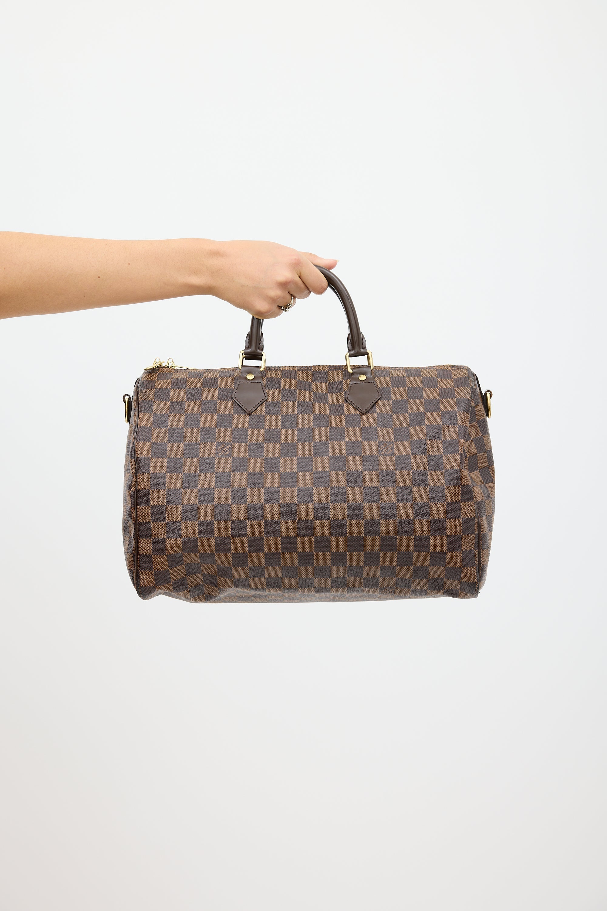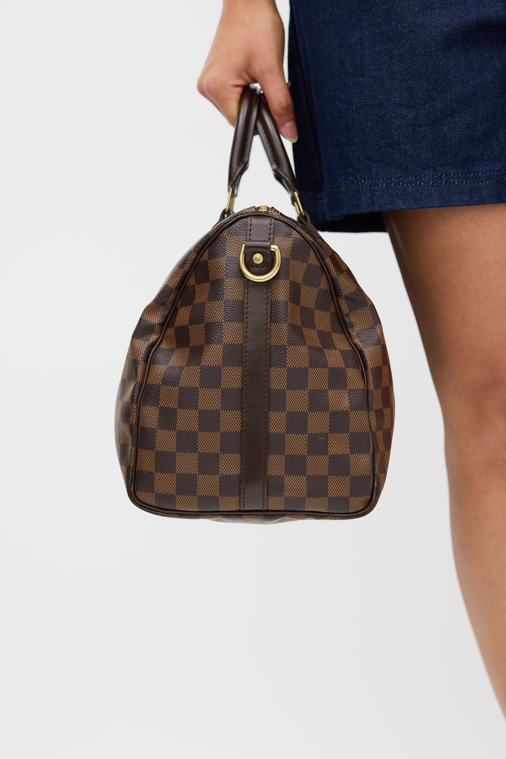 Pre-owned Louis Vuitton brown Speedy 35 bag featuring Damier Ebene coated canvas, leather trim, dual rolled top handles, gold tone hardware, zip closure at top, D-rings at sides with leather trim, red canvas lining, D-ring for key attachment inside, and one slip pocket inside.