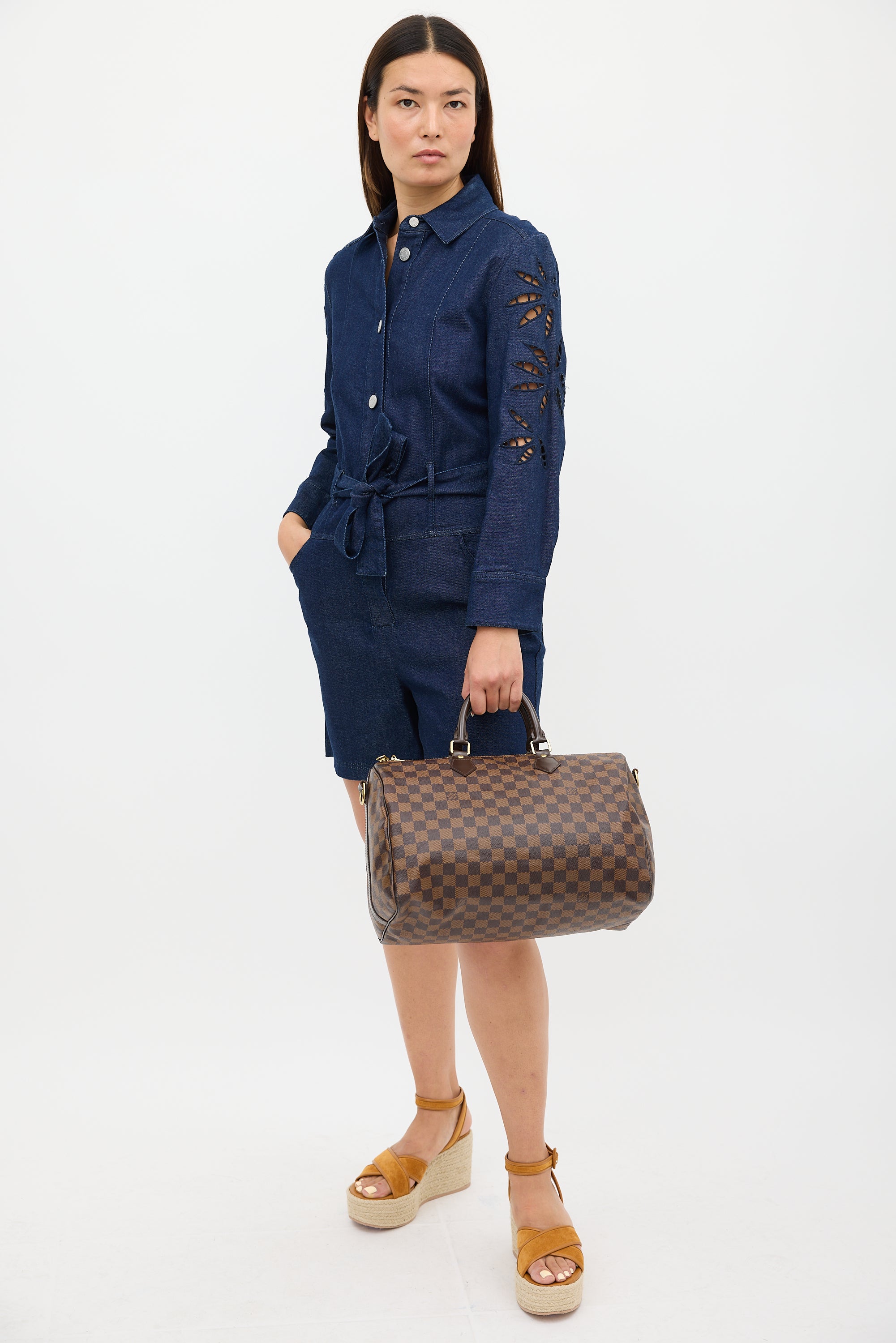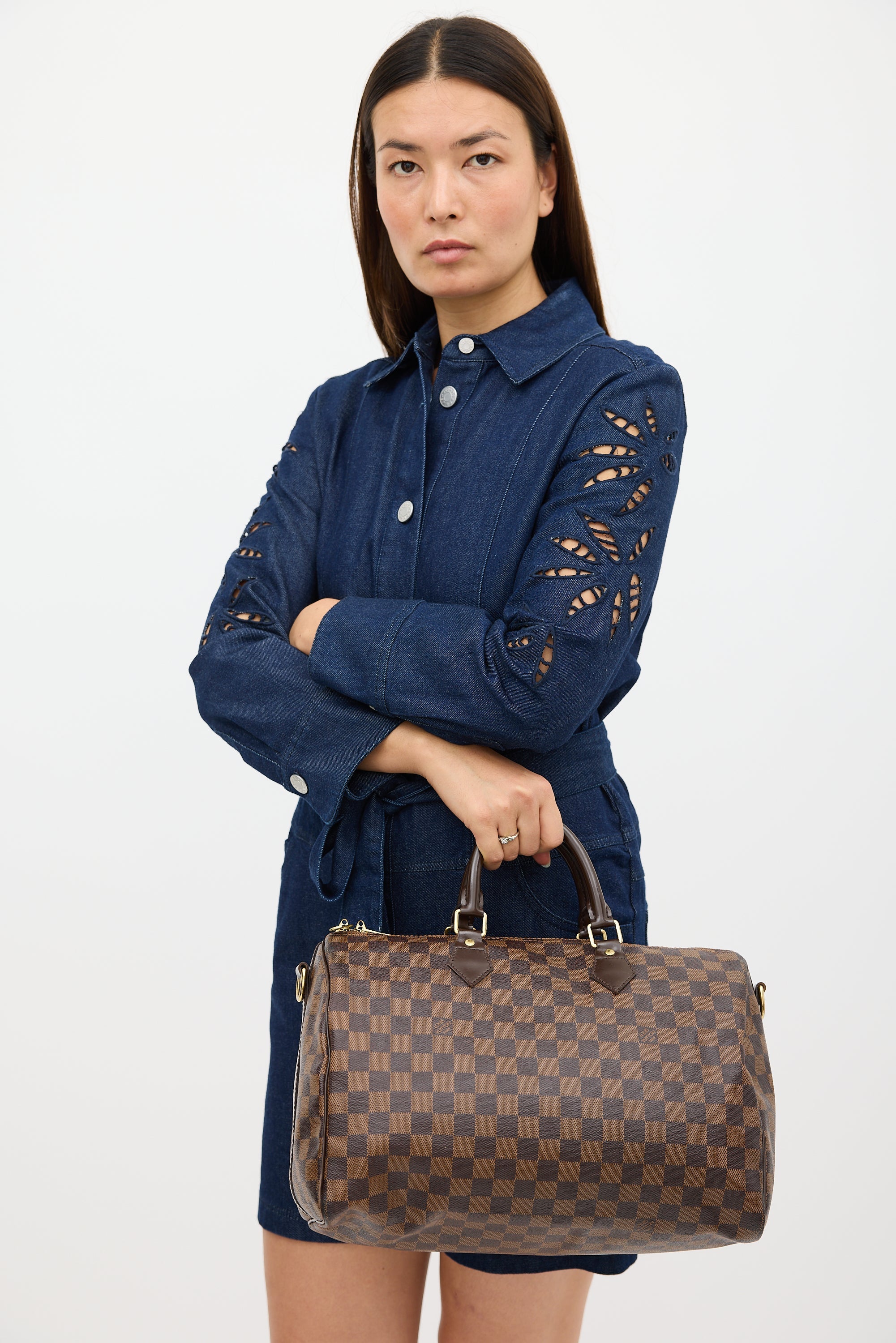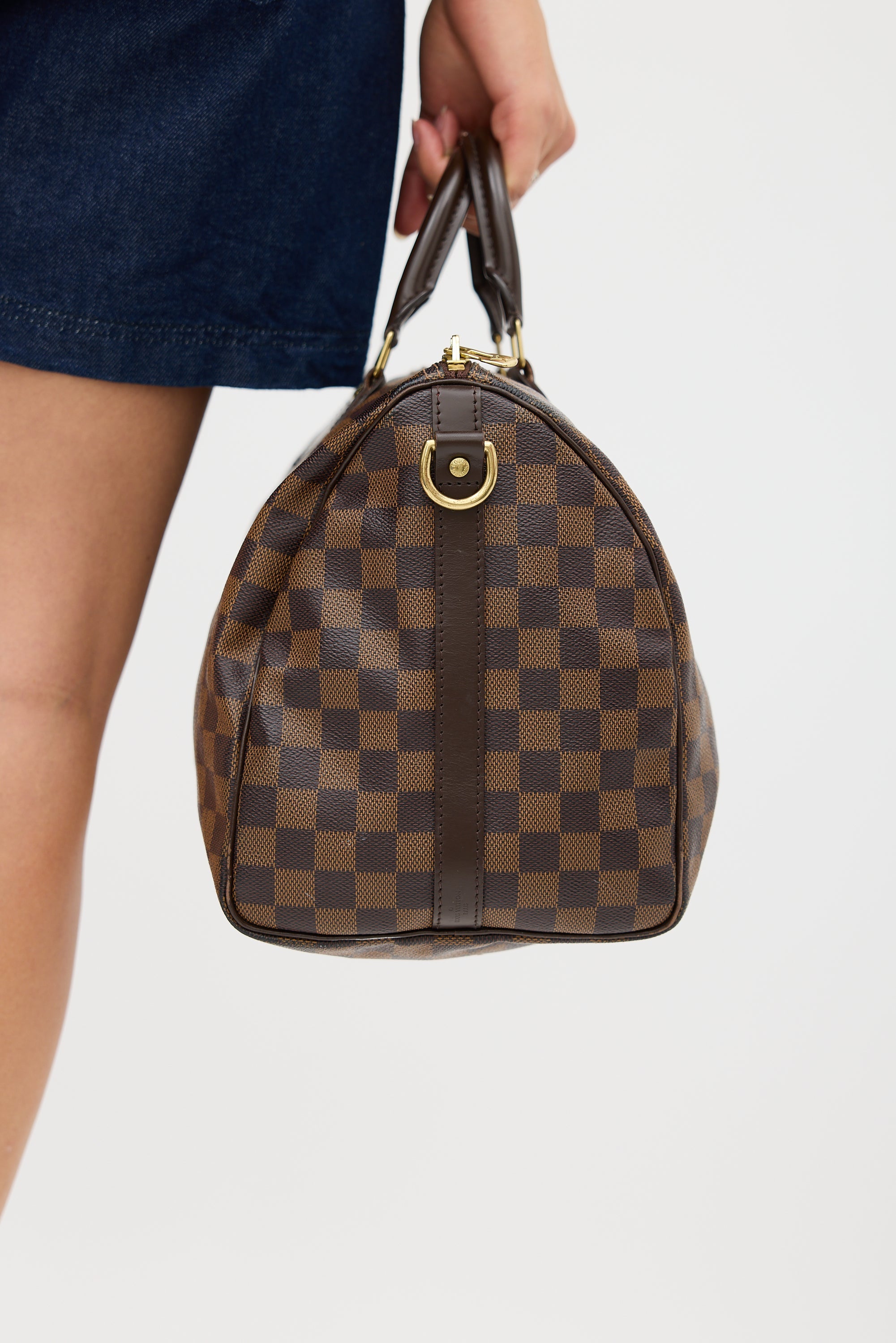 Pre-owned Louis Vuitton brown Speedy 35 bag featuring Damier Ebene coated canvas, leather trim, dual rolled top handles, gold tone hardware, zip closure at top, D-rings at sides with leather trim, red canvas lining, D-ring for key attachment inside, and one slip pocket inside.
