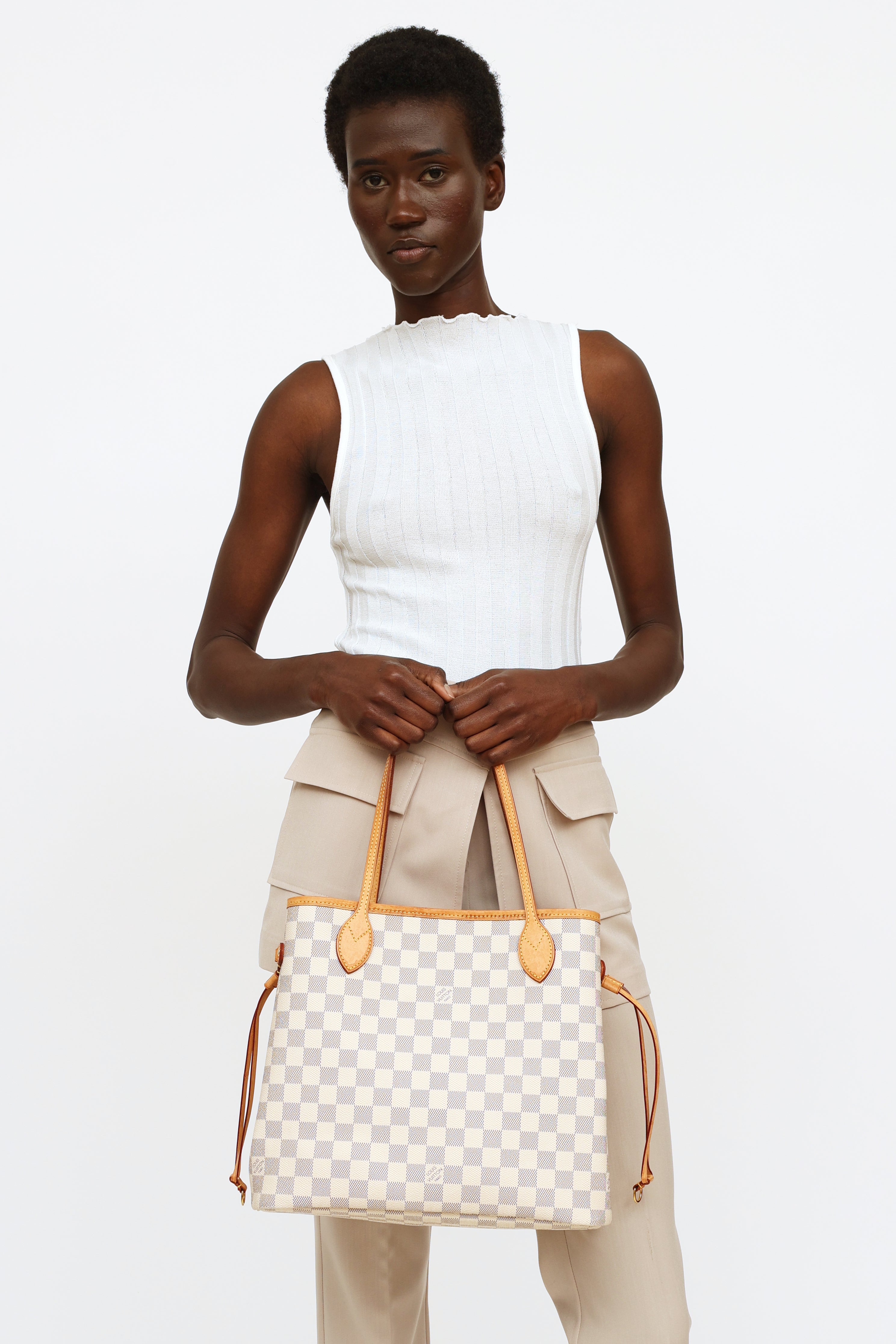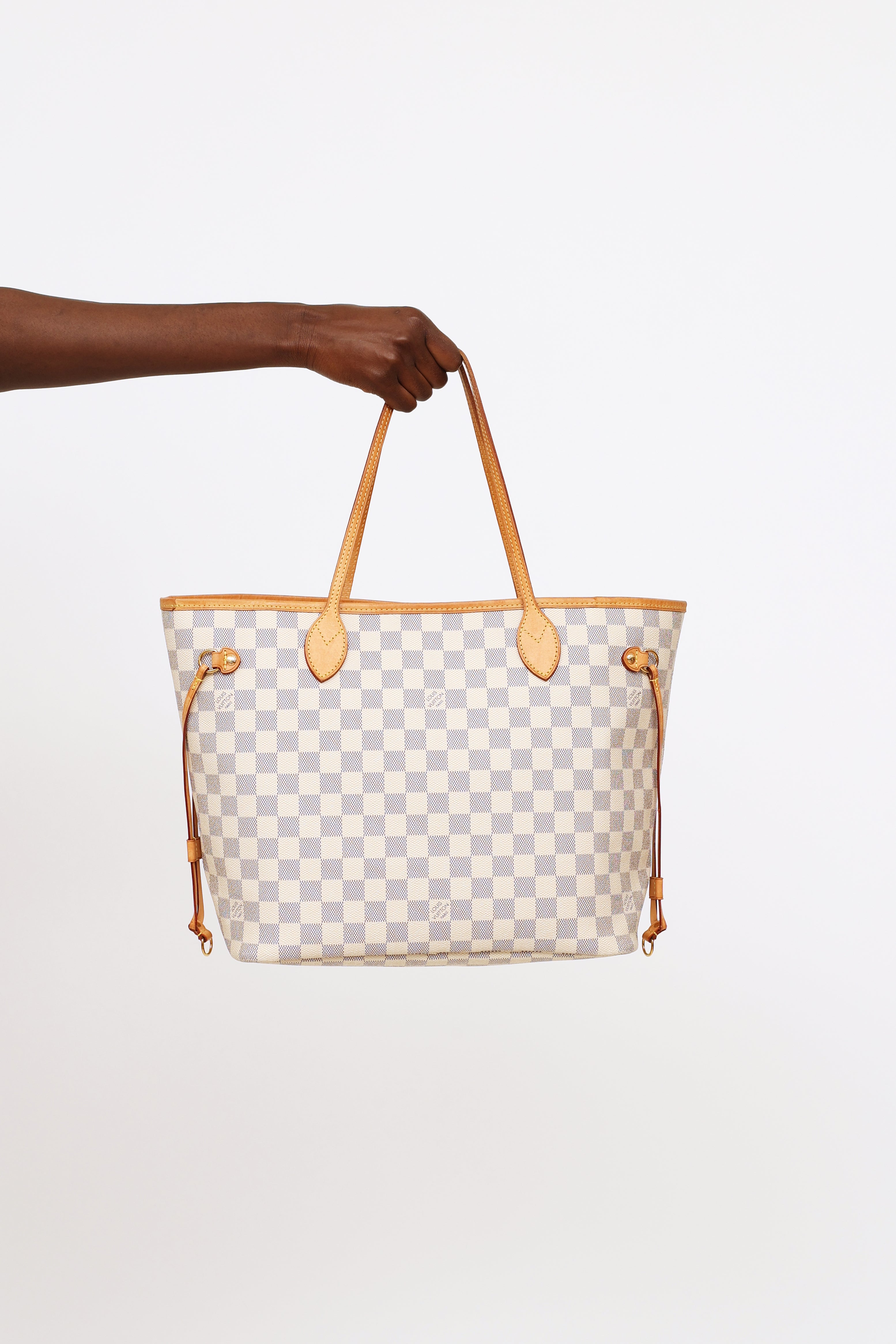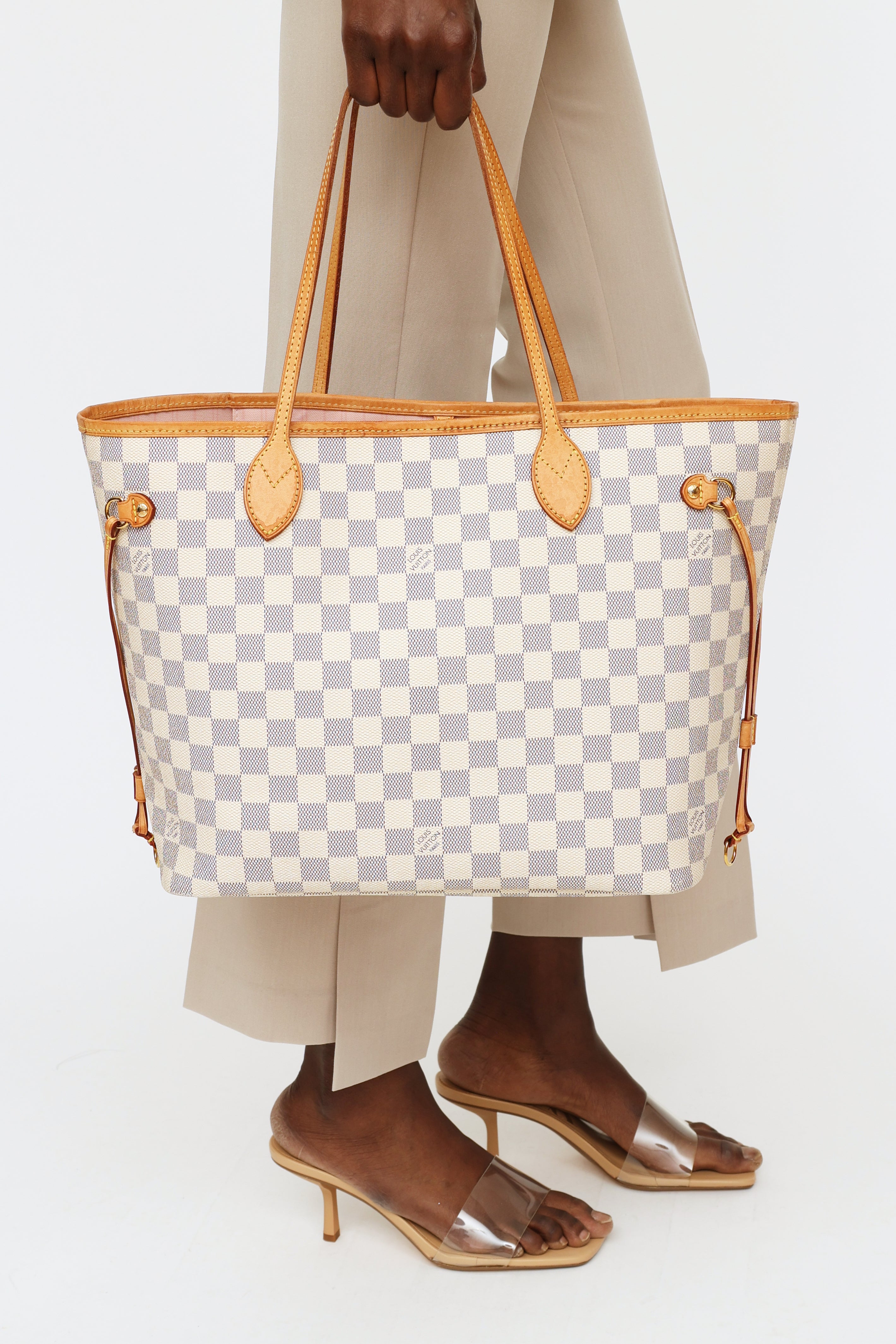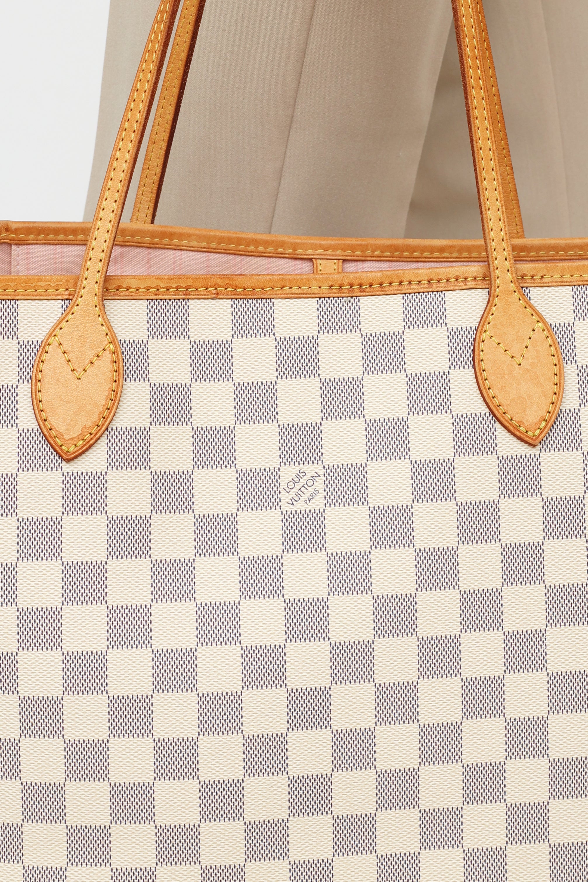 Pre-loved Louis Vuitton Damier Azur Neverfull MM Tote bag featuring signature cream Damier Azur coated leather canvas exterior, beige cowhide trim with yellow stitching, four adjustable leather side laces, open style with hook closure, dual leather handles, detachable matching pouch and gold-tone hardware. Interior features one main compartment with pink striped lining, one side zip pocket, and logo lettering.