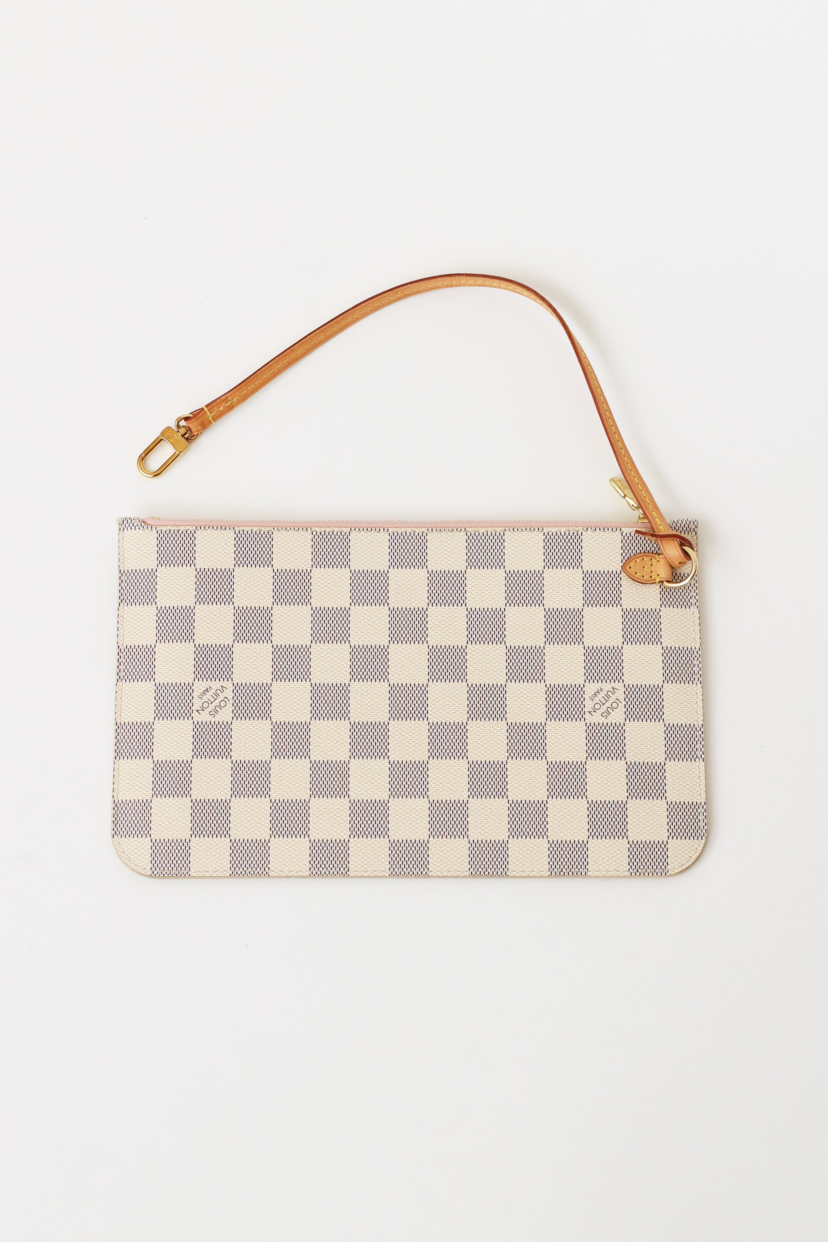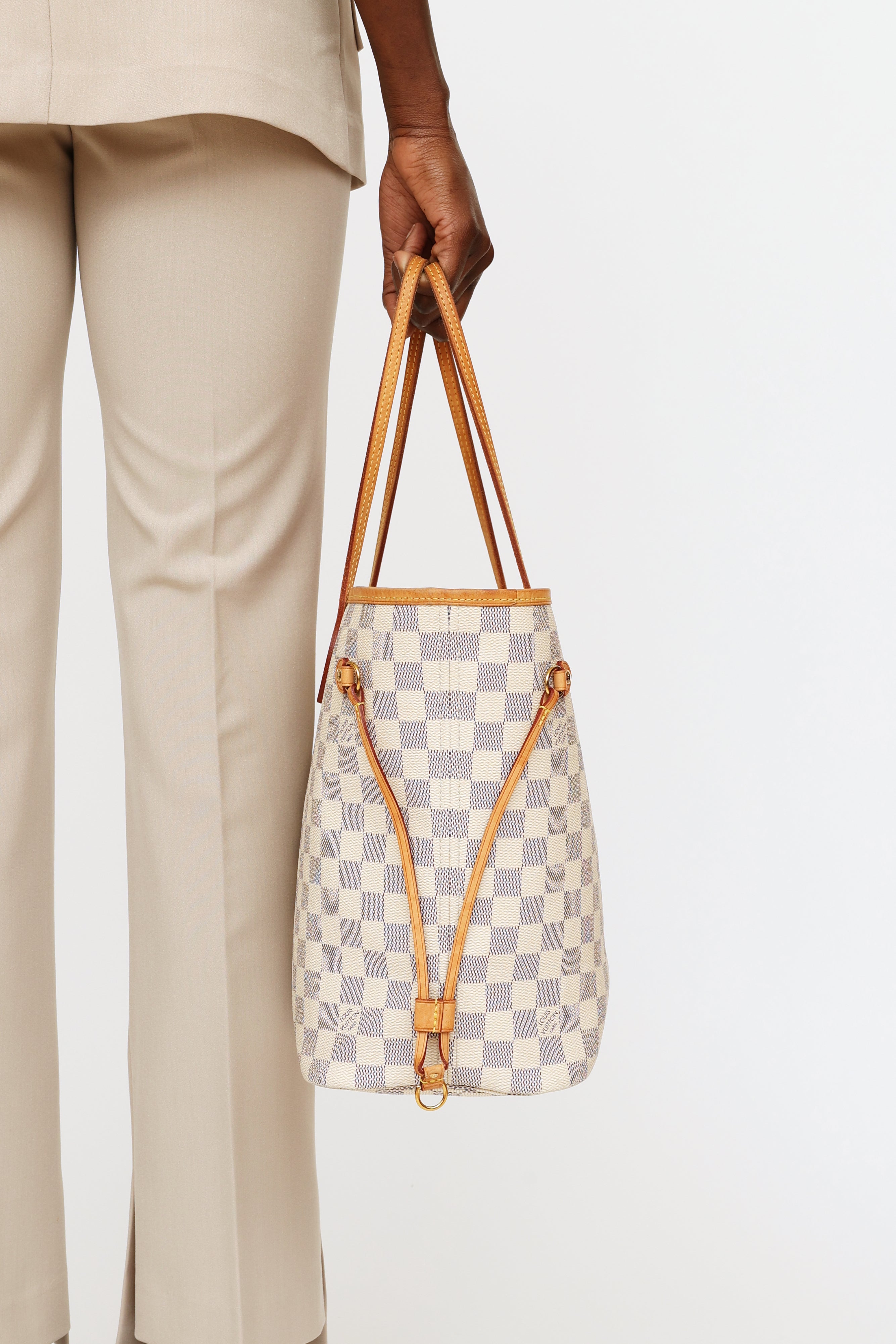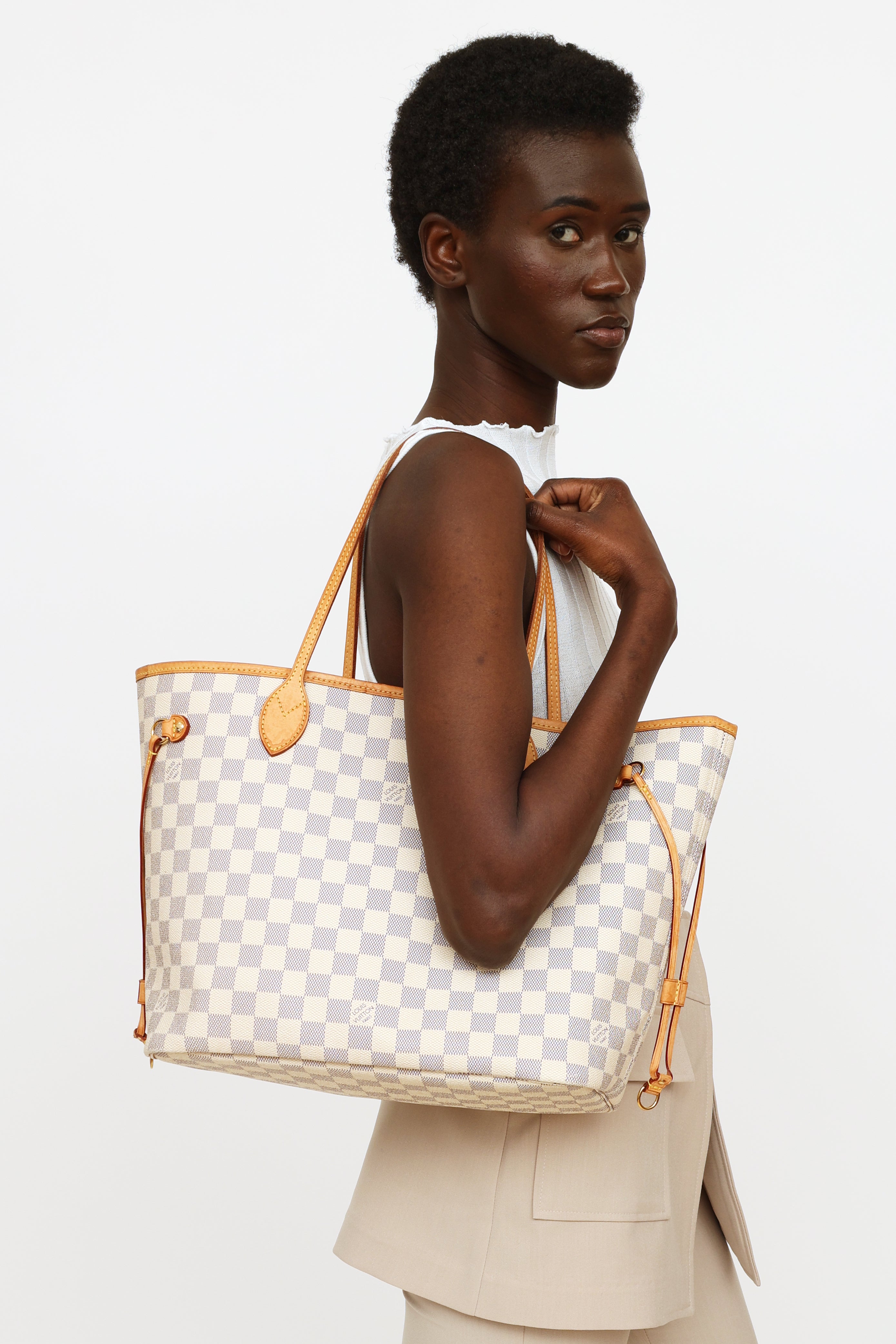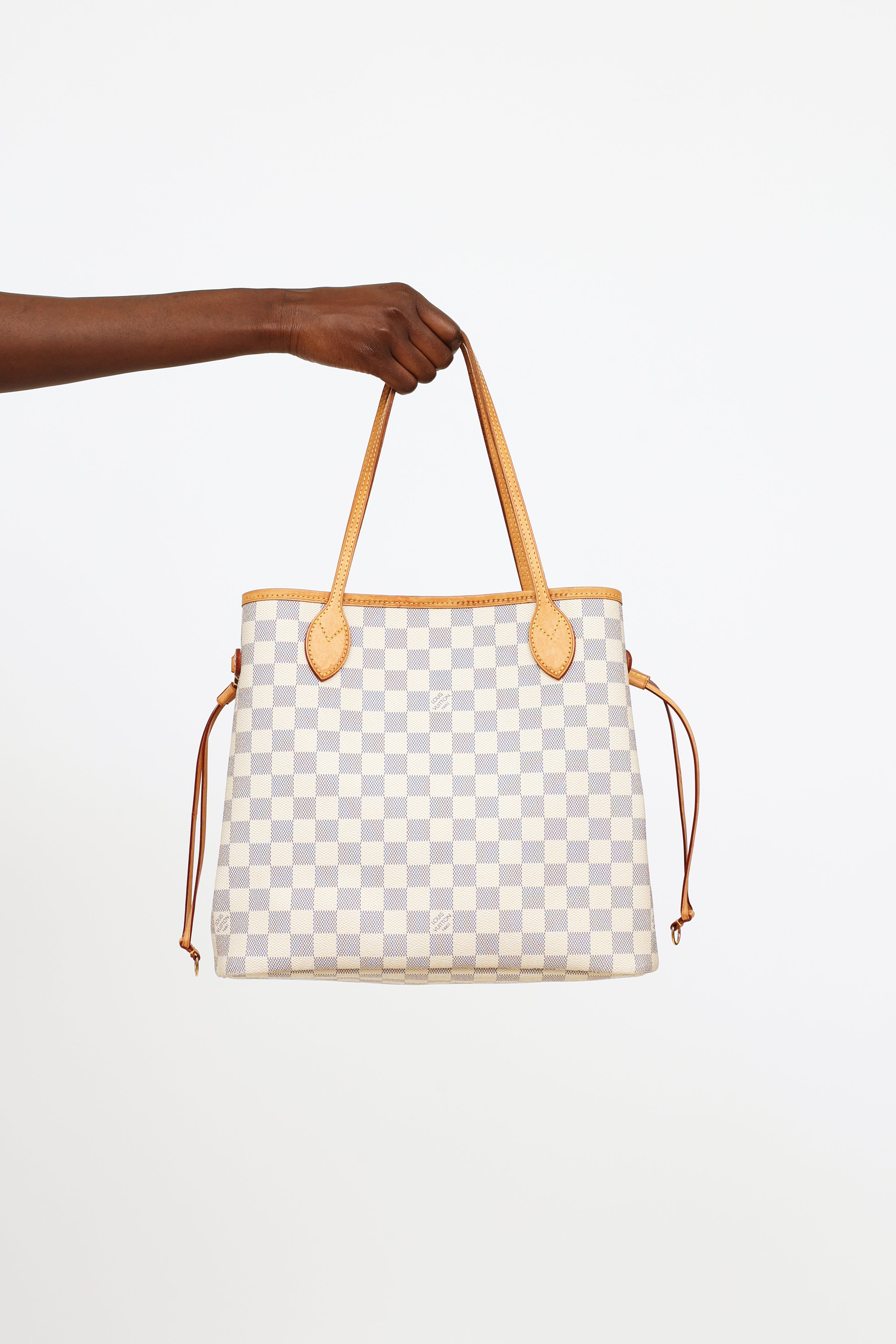 Pre-loved Louis Vuitton Damier Azur Neverfull MM Tote bag featuring signature cream Damier Azur coated leather canvas exterior, beige cowhide trim with yellow stitching, four adjustable leather side laces, open style with hook closure, dual leather handles, detachable matching pouch and gold-tone hardware. Interior features one main compartment with pink striped lining, one side zip pocket, and logo lettering.