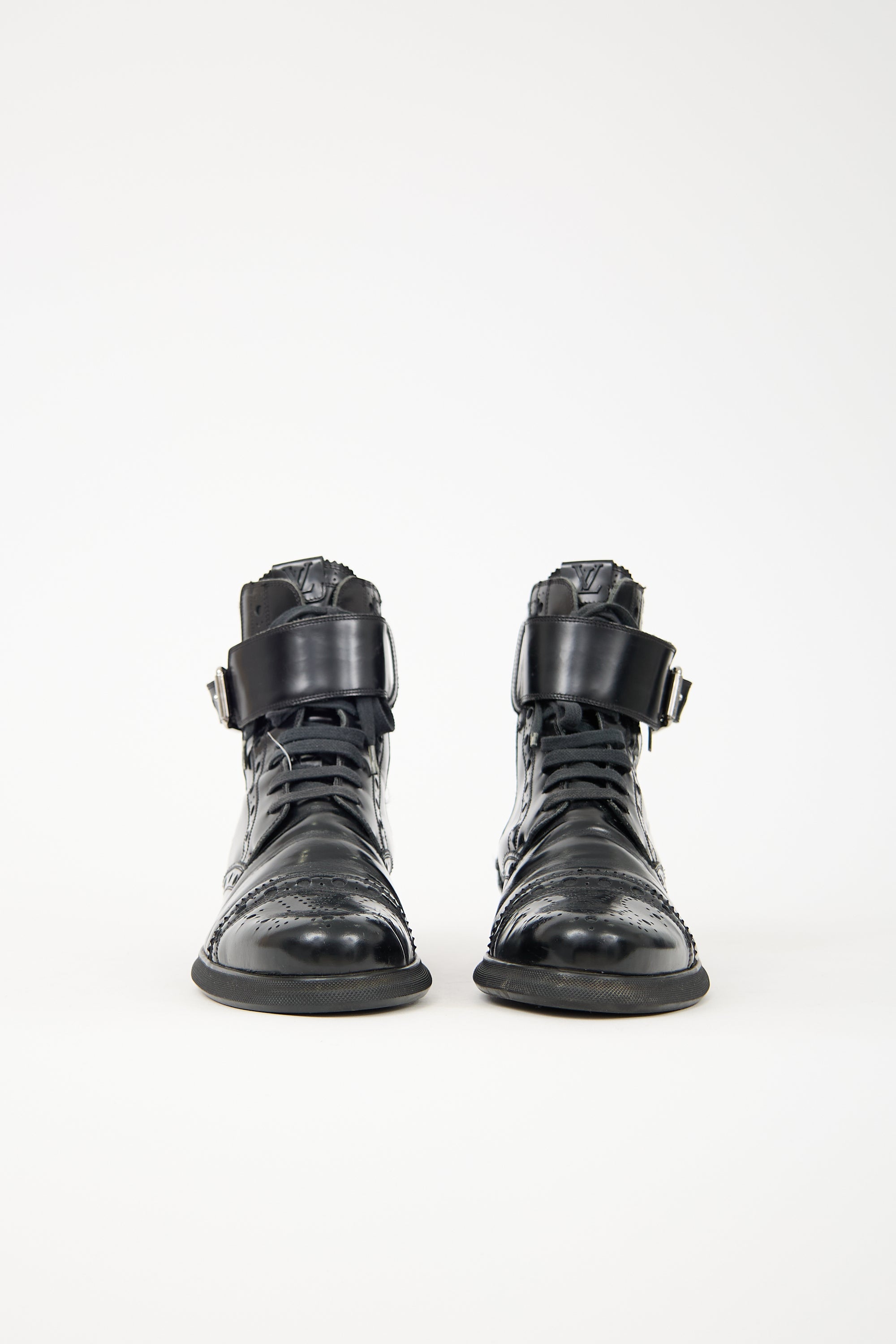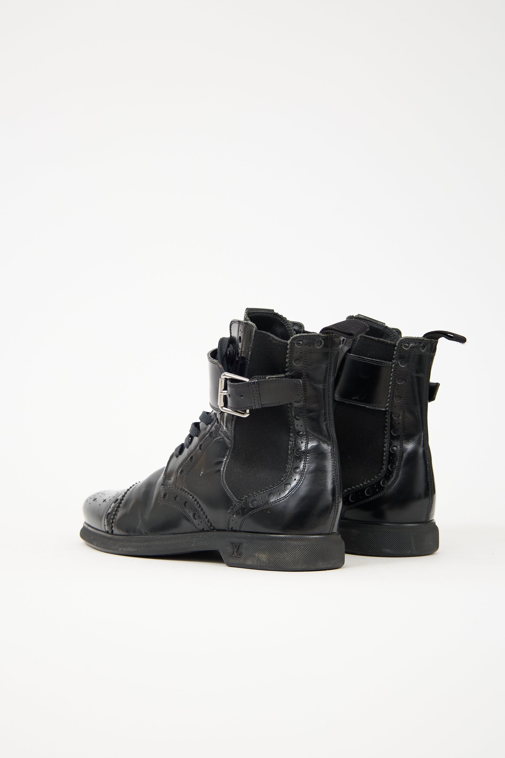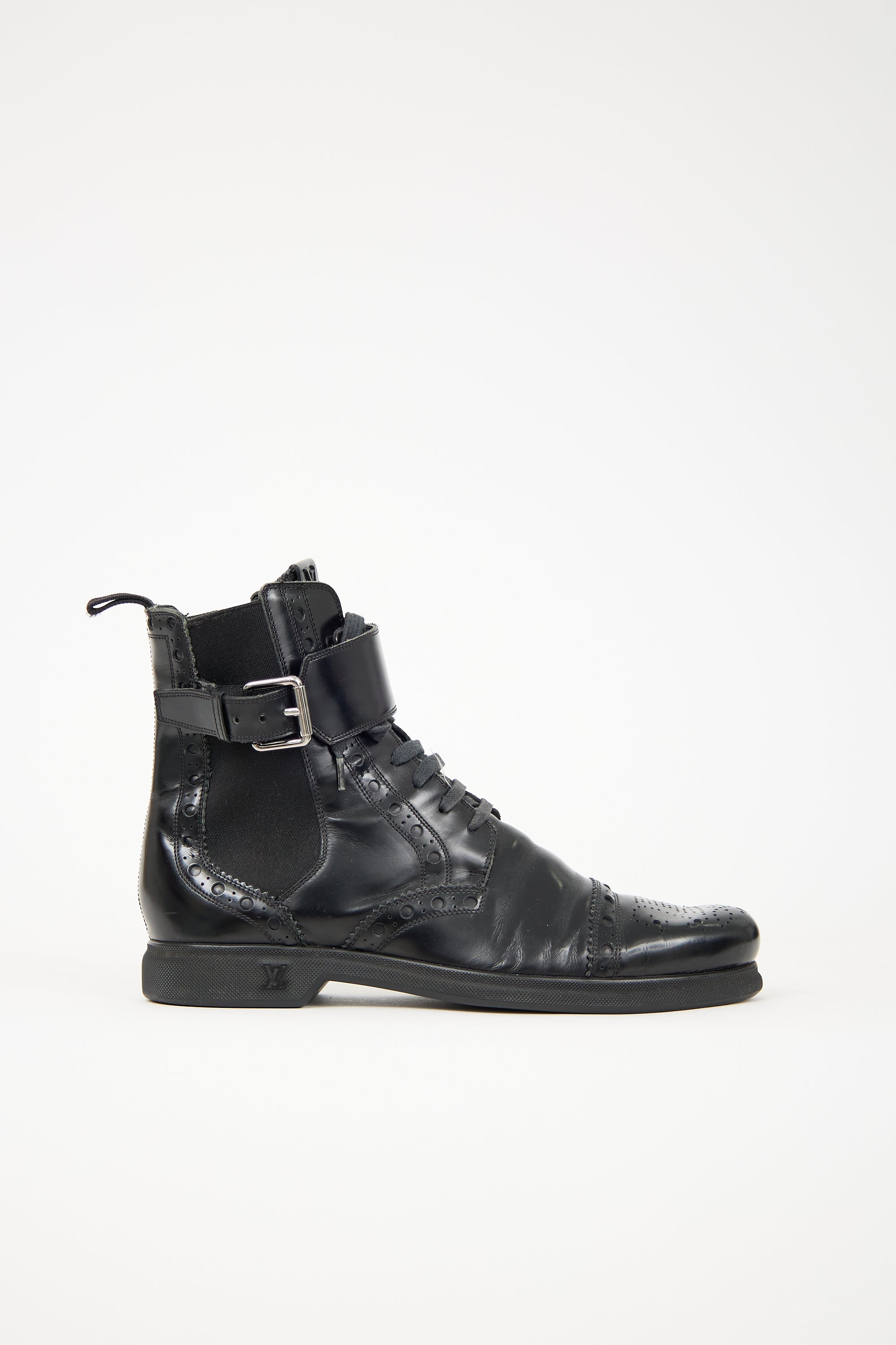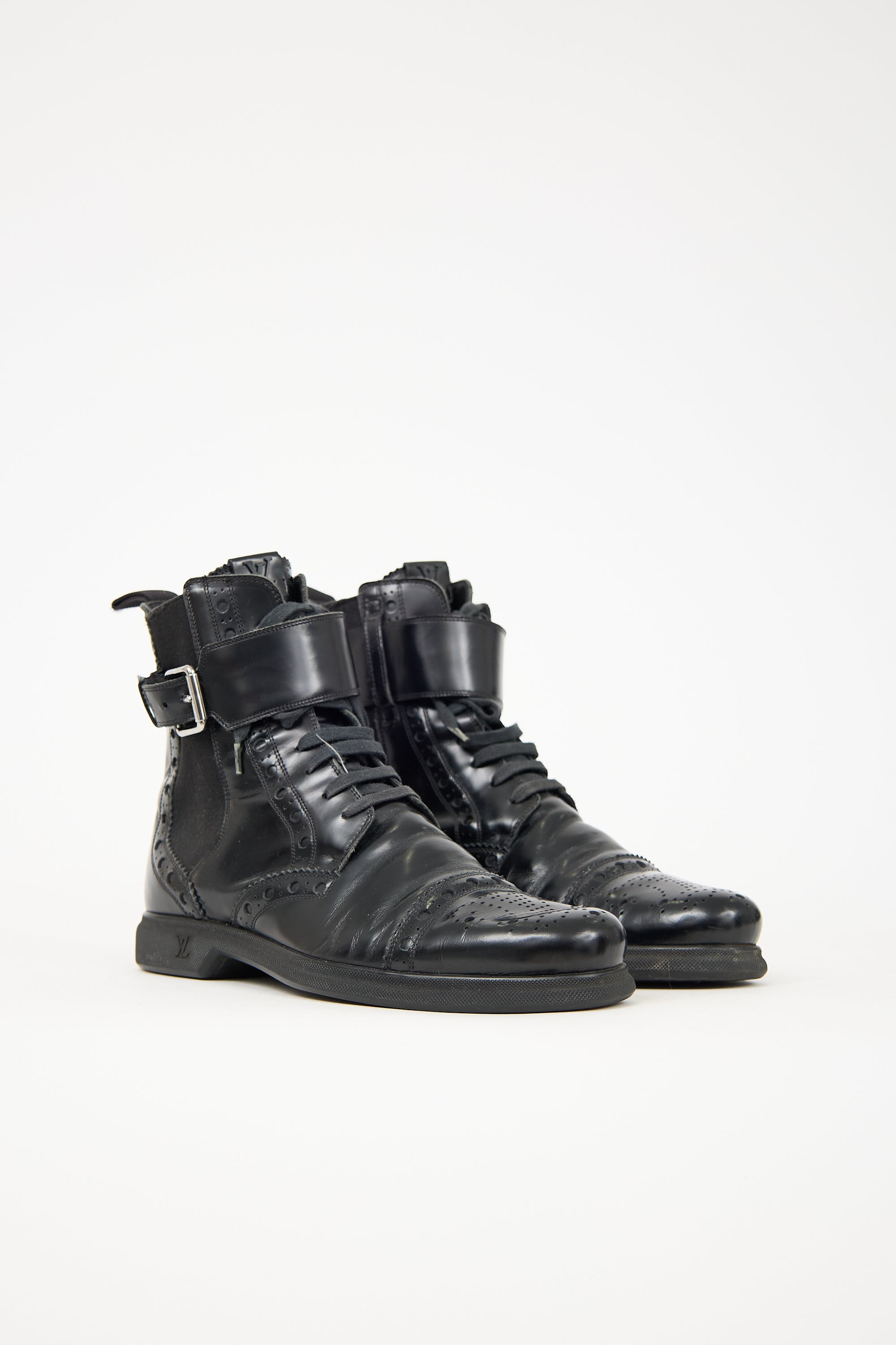 Pre-owned Louis Vuitton black leather brogue boots featuring almond toe, lace up and adjustable strap closures at ankle, elasticized gore at sides, and rubberized sole with embossed logo.
