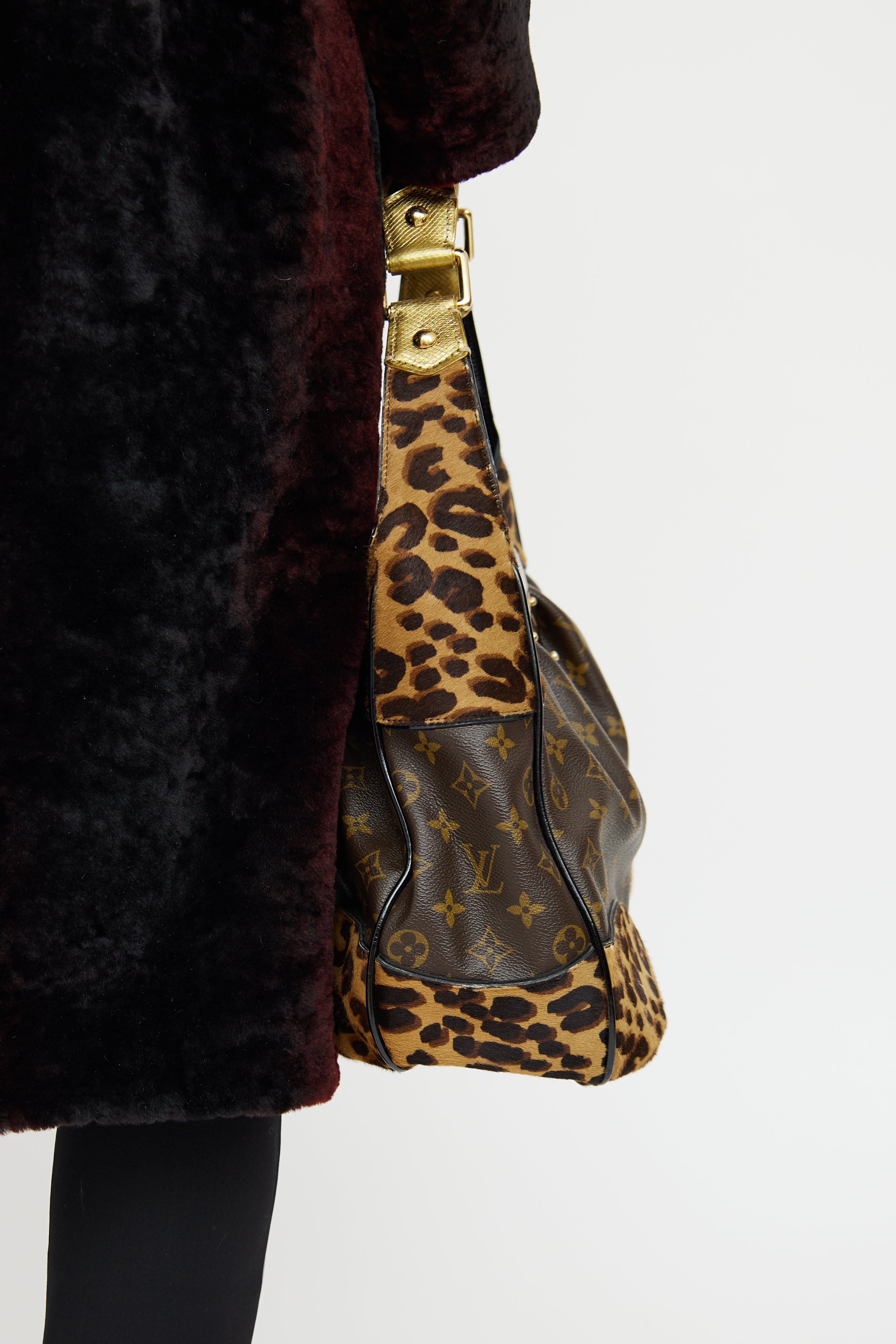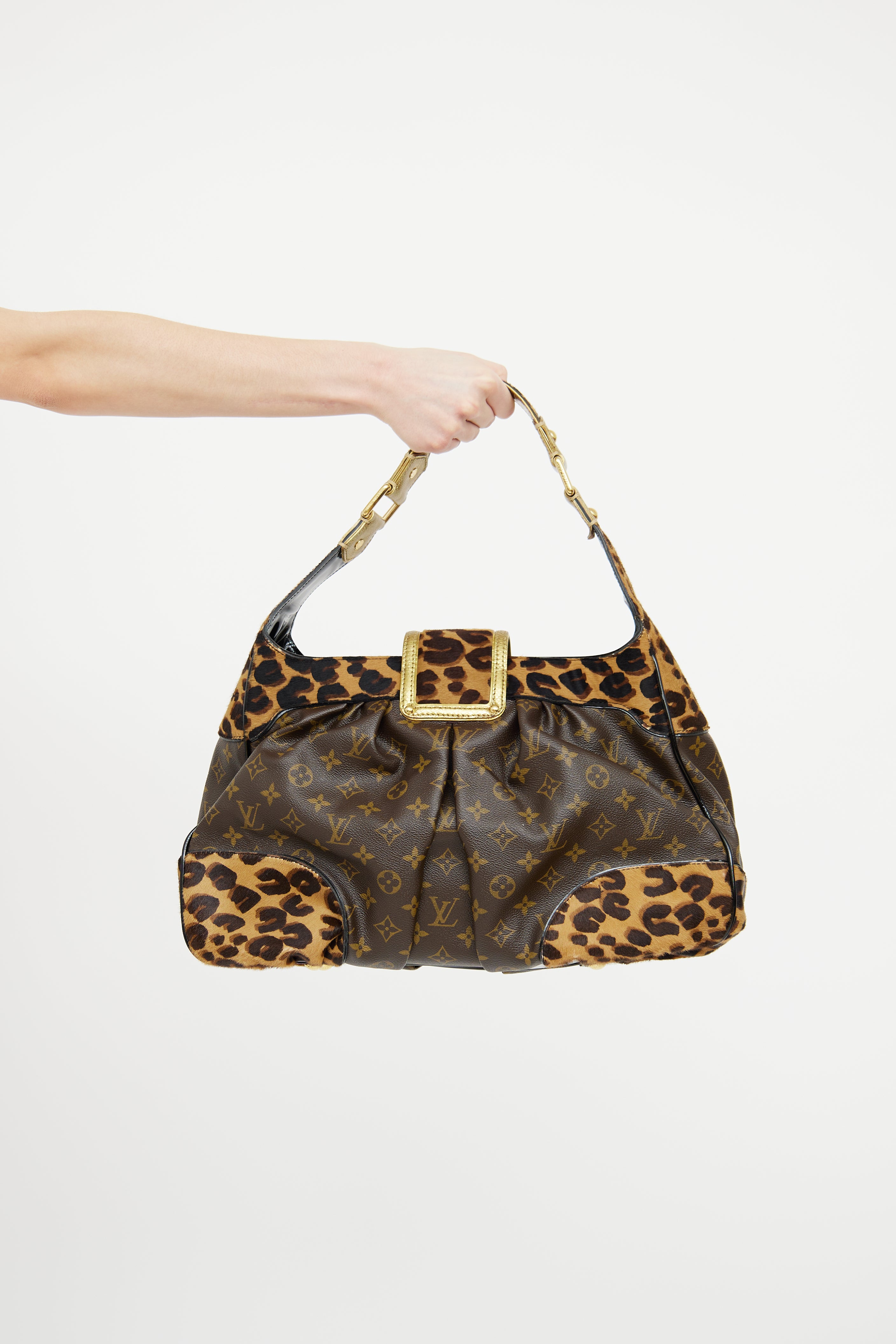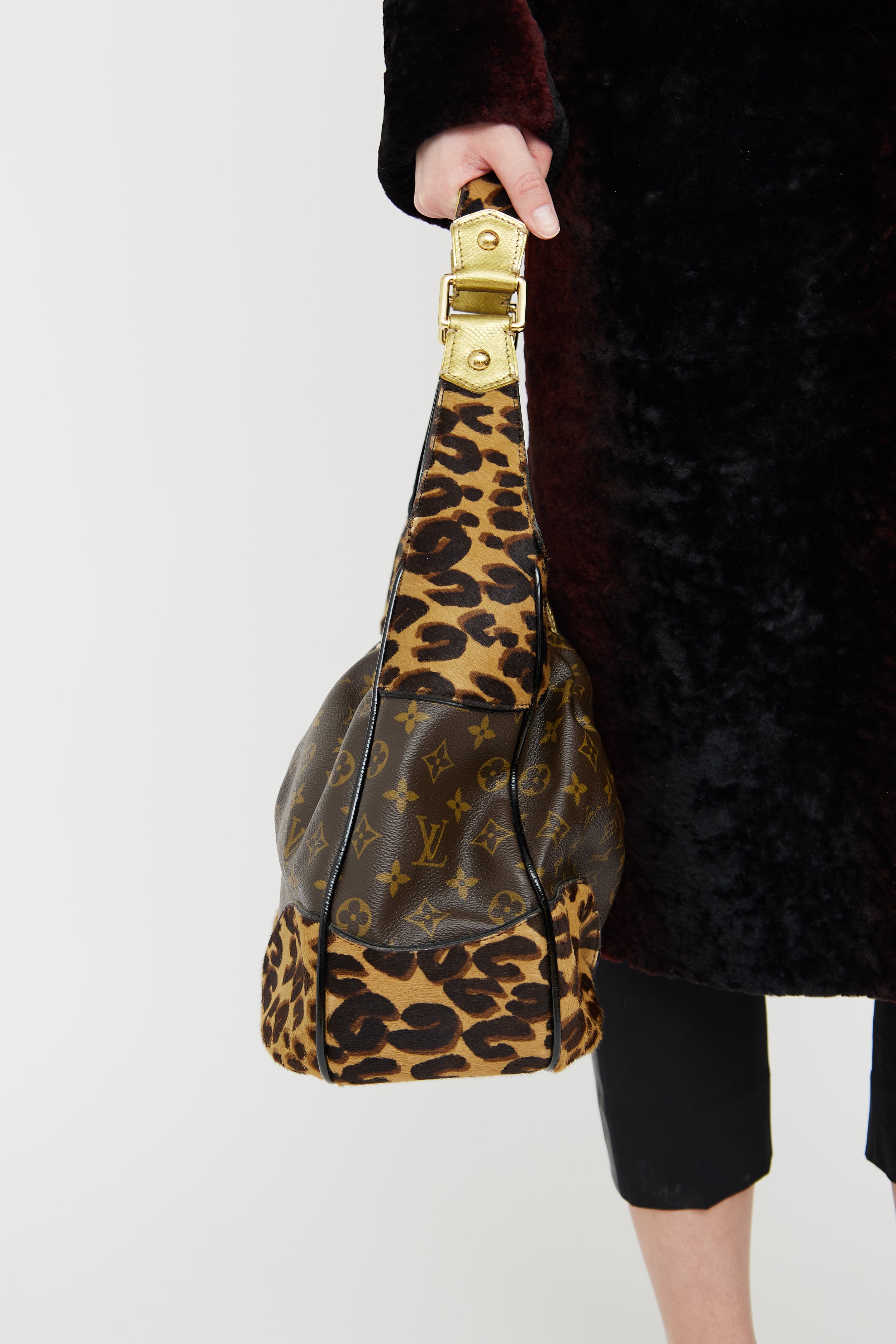 Pre-owned Louis Vuitton monogram leopard Polly bag featuring broad looping shoulder strap, gold tone hardware, oversized belt buckle lock closure, pony hair leopard trim with black piping, signature monogram print throughout, and protective feet at base. One main canvas lined compartment with one zip pocket.